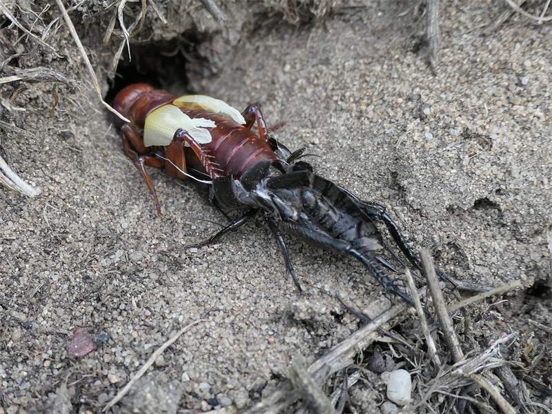 Larve der Feldgrille in der Braunkohletagebaufolgelandschaft.