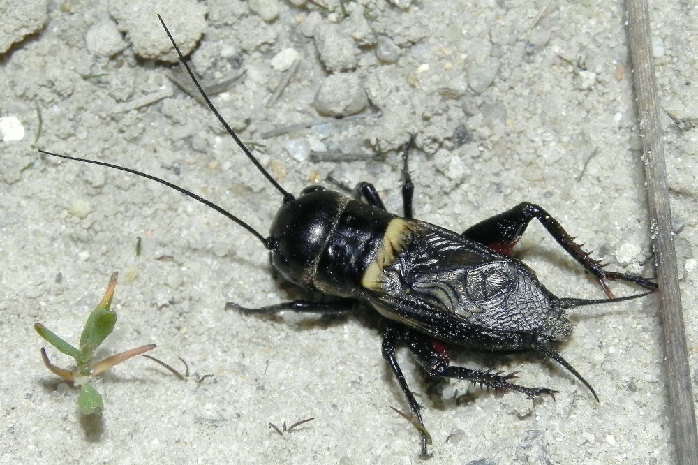 Männliche Feldgrille zu Besuch am Lichtfang in der Tagebaufolgelandschaft bei Bärwalde 11. Mai 2011. Gut zu erkennen sind "Harfe" und "Spiegel" auf den Flügeln, die als Resonanzkörper zur Verstärkung des Gesanges dienen.