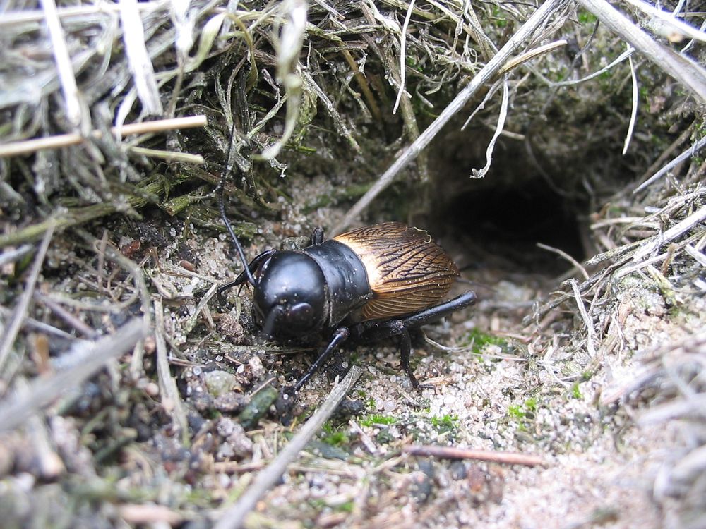 Weibliche Feldgrille in der Tagebaufolgelandschaft bei Nochten am 26.06.2005. Das Geschlecht ist an den Flügelstrukturen gut zu erkennen (regelmäßige Aderung). (© Anne Kästner)( Bild vergrößern)