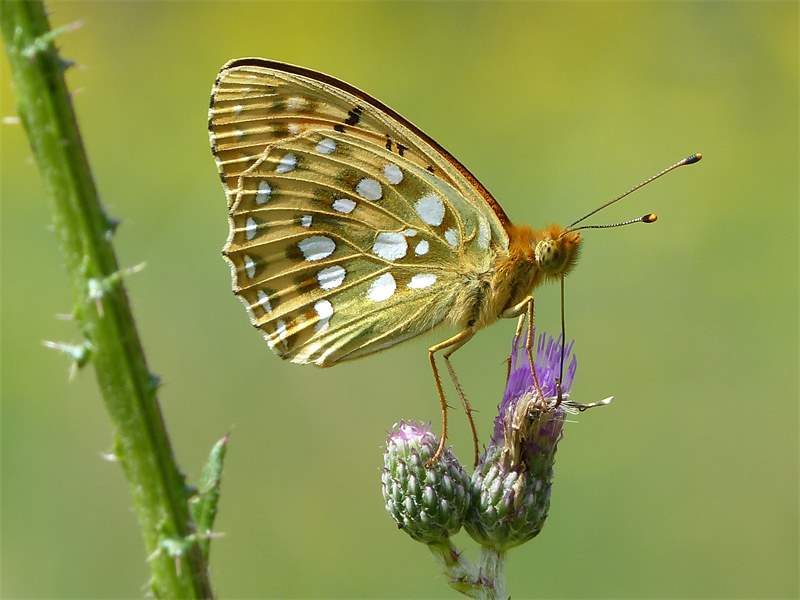 In der Basis der Hinterflügelunterseite weist der Große Perlmuttfalter eine auffällige grünliche Färbung auf, die sich teilweise am äußeren Flügelrand fortsetzt.