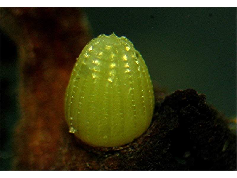 Ei vom Großen Perlmutterfalter am 8.8.2014 bei Jägersgrün an Duftveilchen ( Viola odorata)abgelegt. (© Matthias Hartung)( Bild vergrößern)