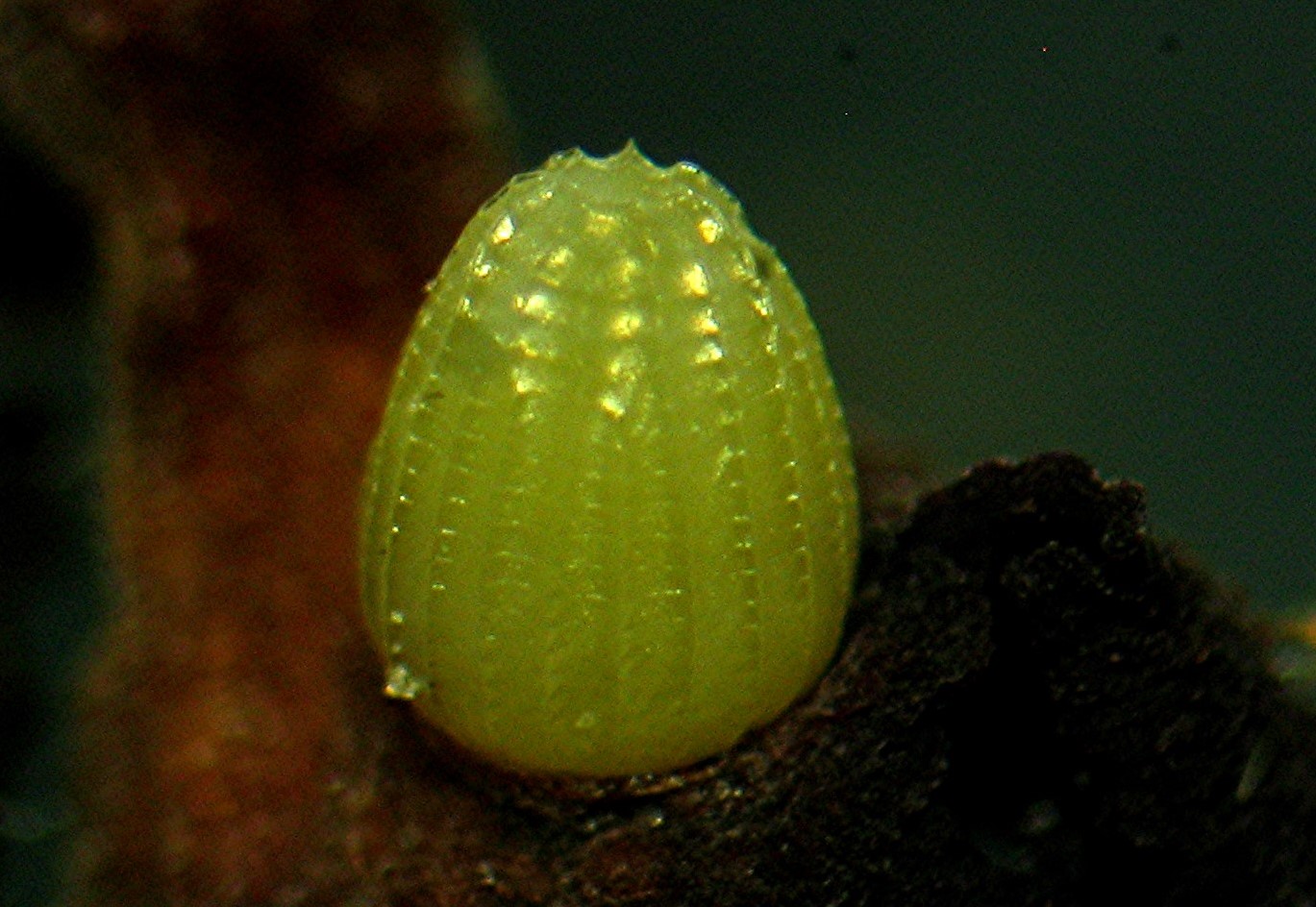 Ei vom Großen Perlmutterfalter am 8.8.2014 bei Jägersgrün an Duftveilchen ( Viola odorata)abgelegt.