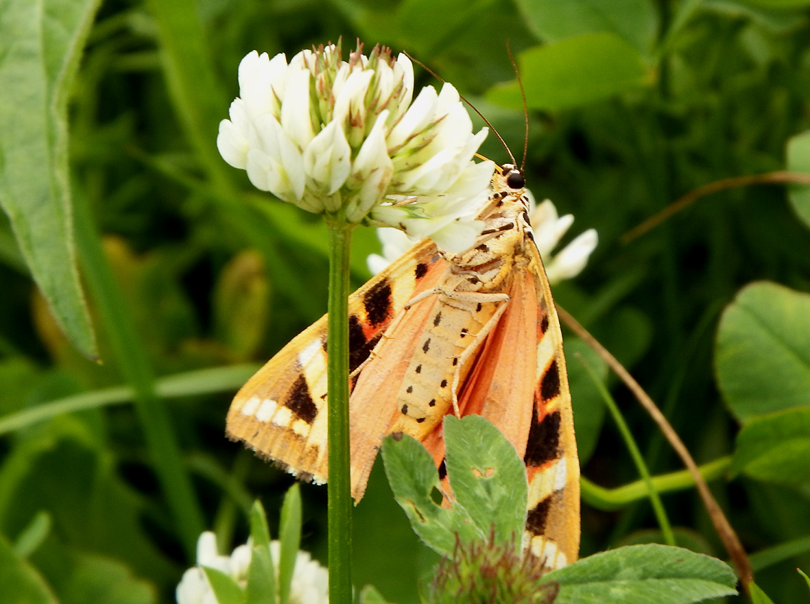 Hinterflügel orange mit schwarzen Flecken.