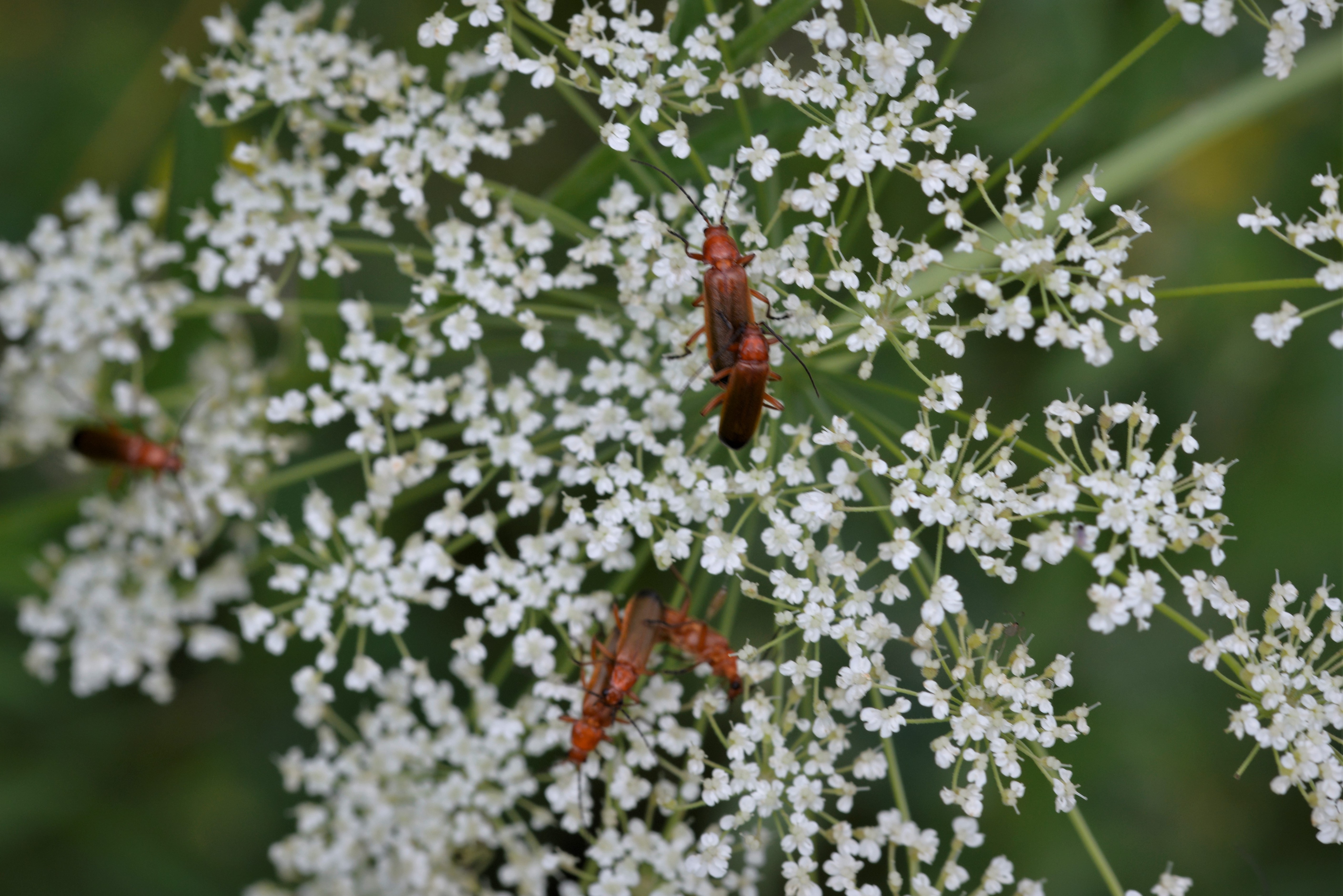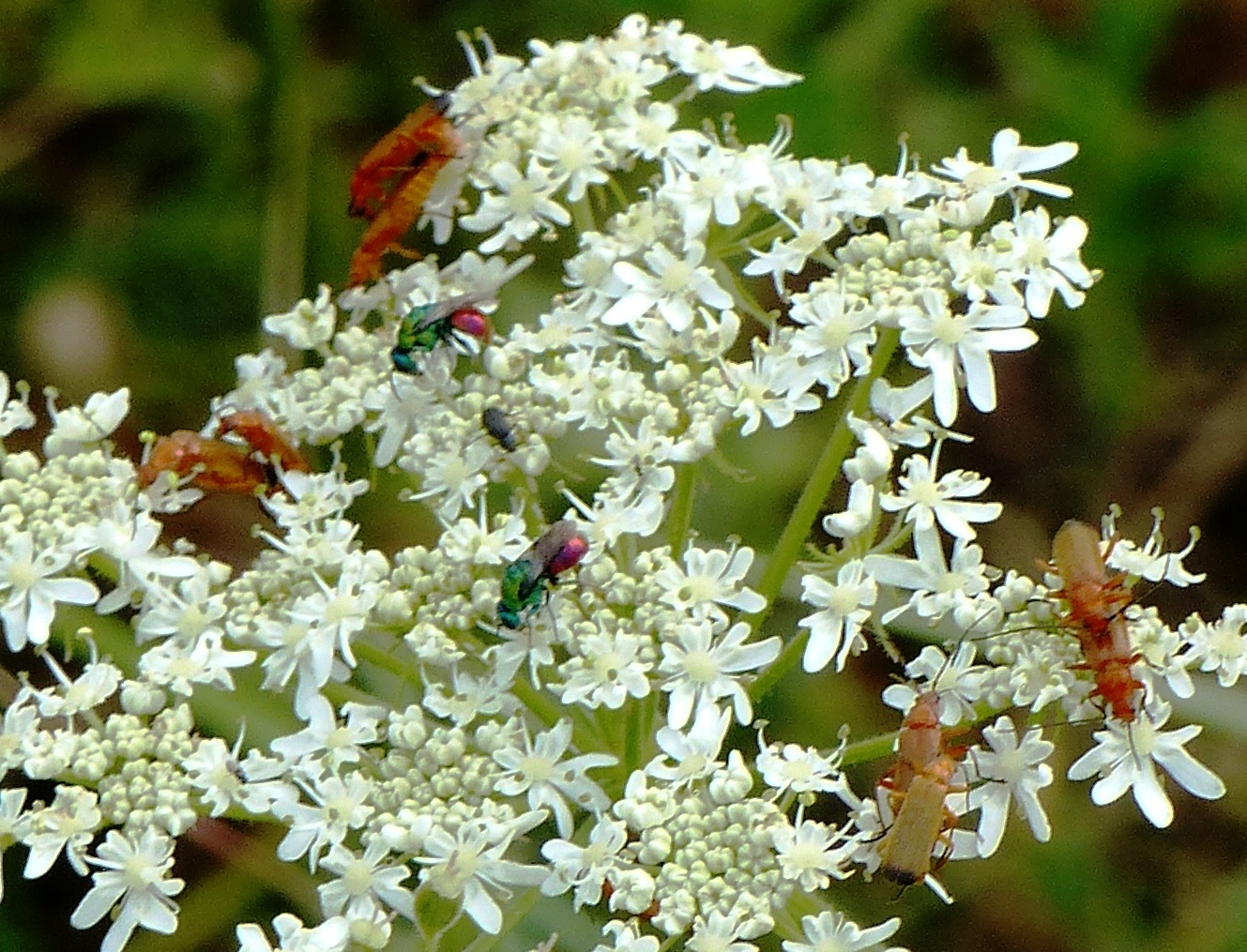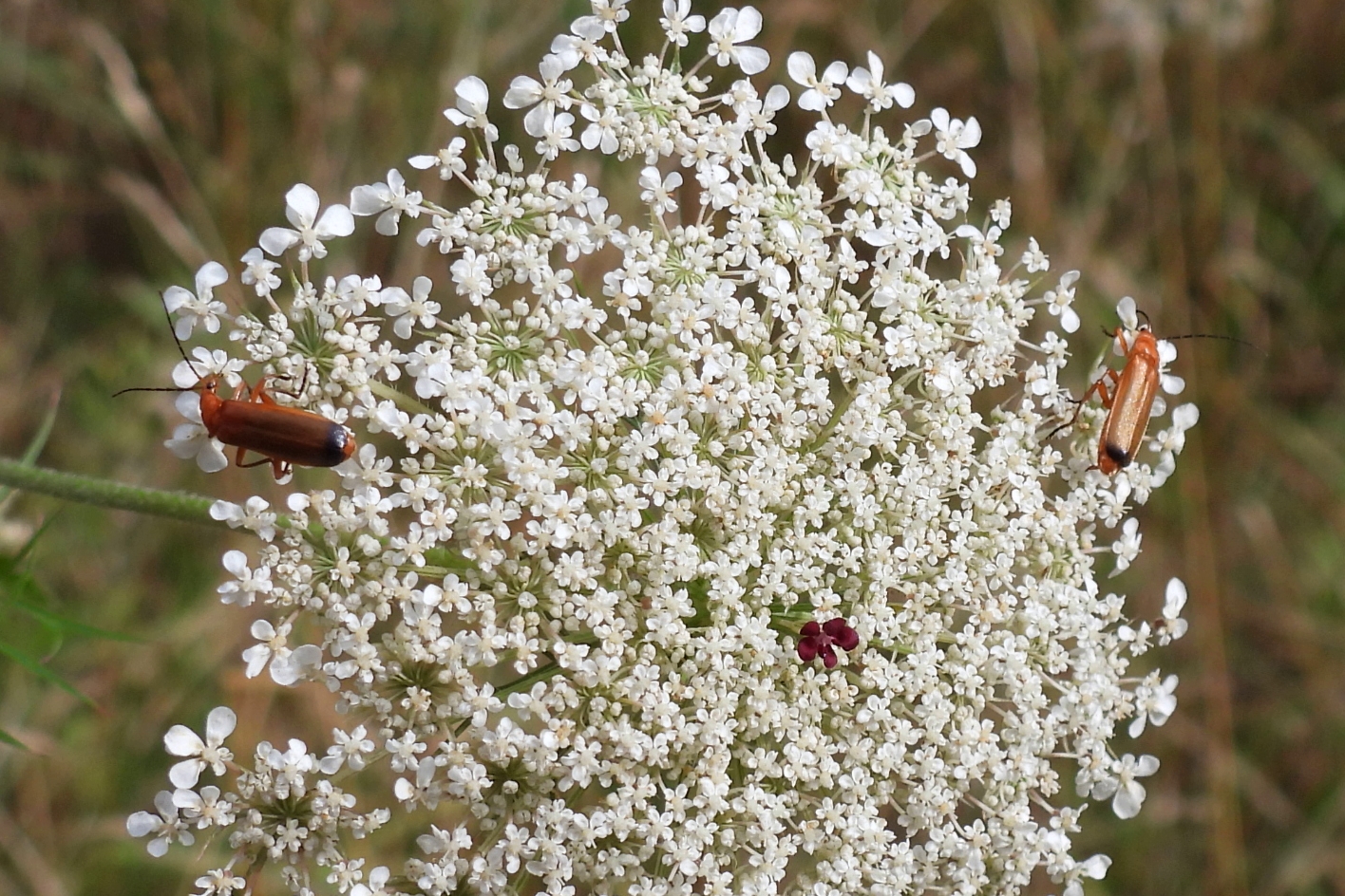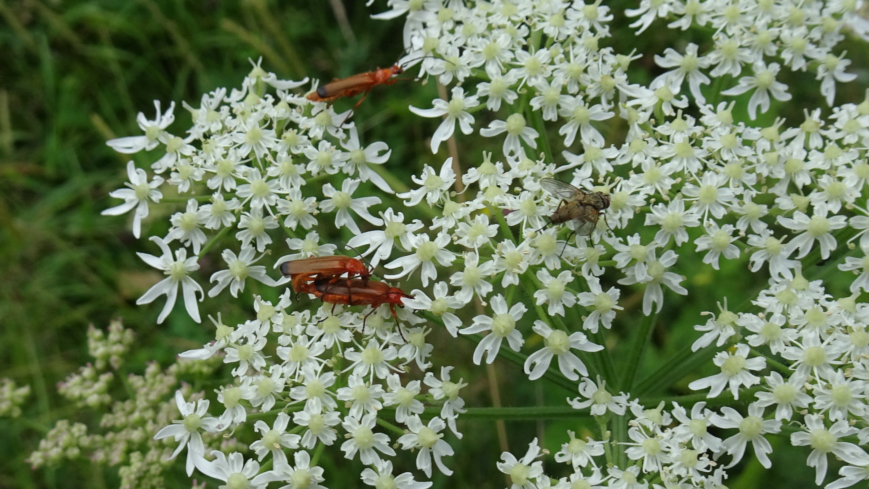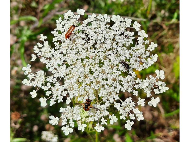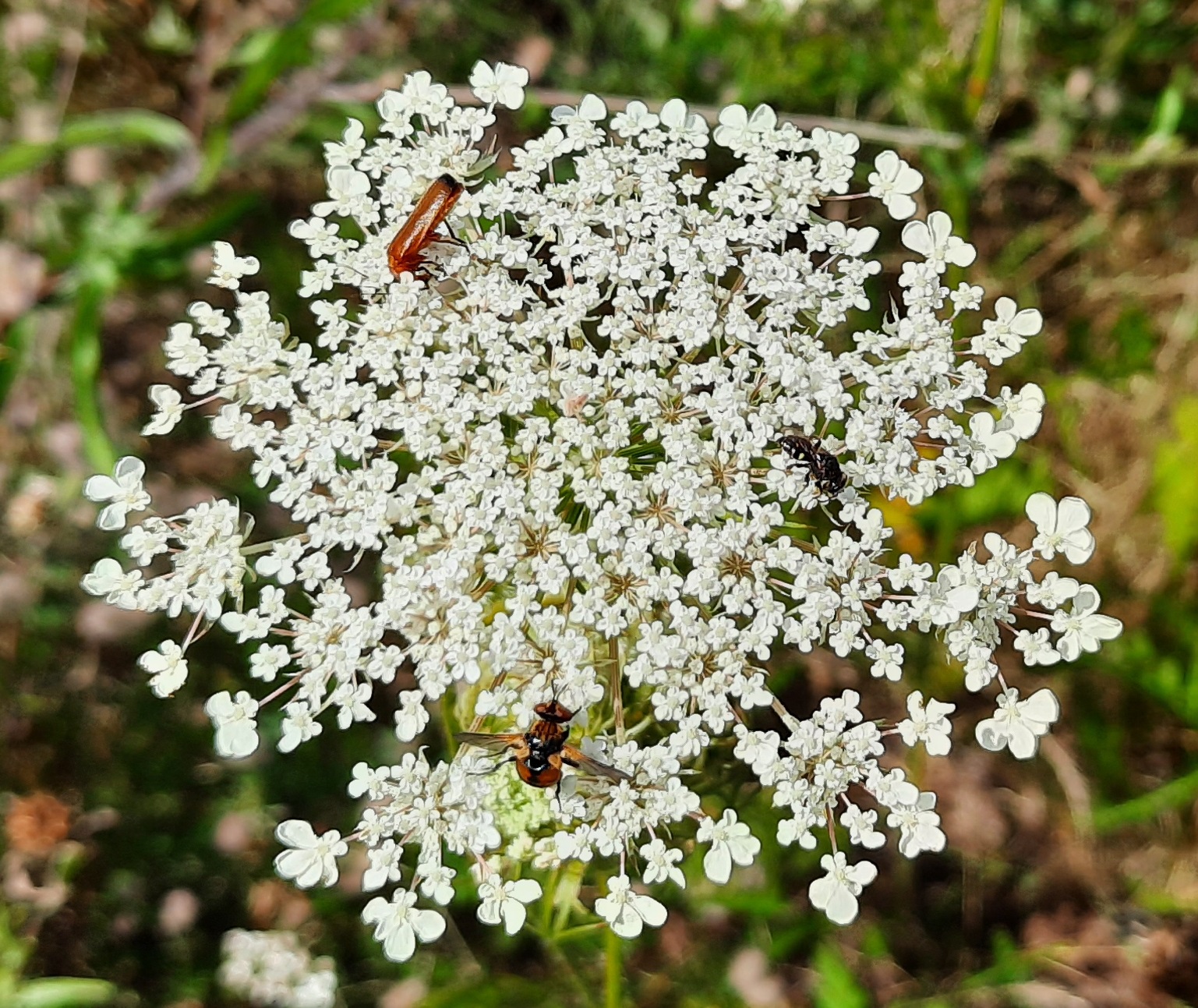 vier Exemplare mit Oxythyrea funesta (Poda, 1761) - Trauer-Rosenkäfer auf Wilder Möhre, Westlausitz, Nordhang Hutberg, Kamenz, 19.07.2020