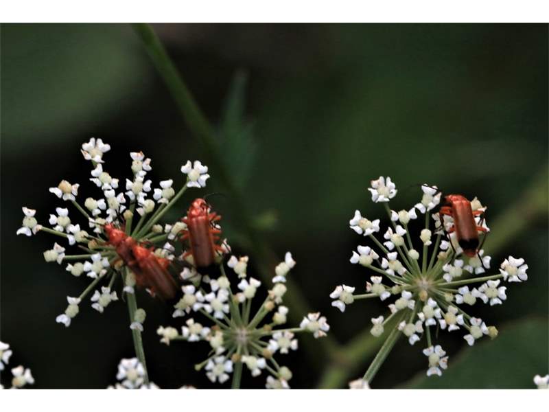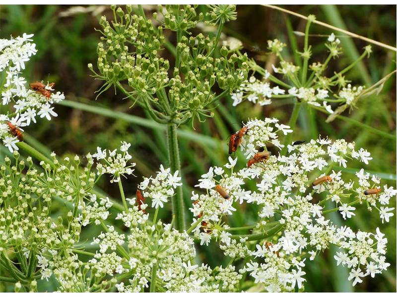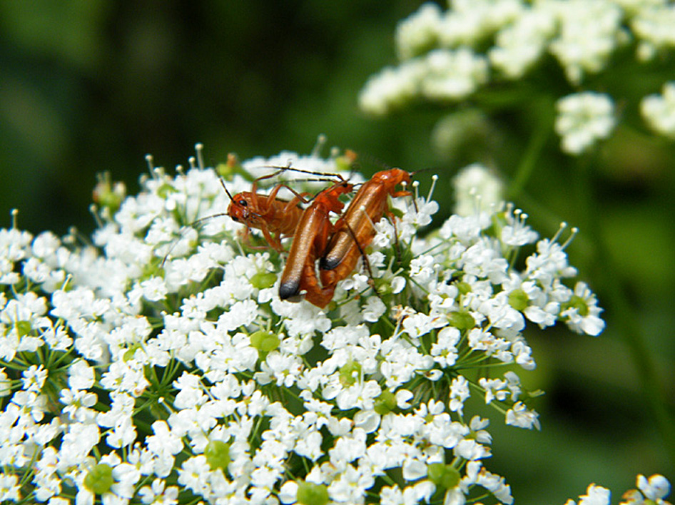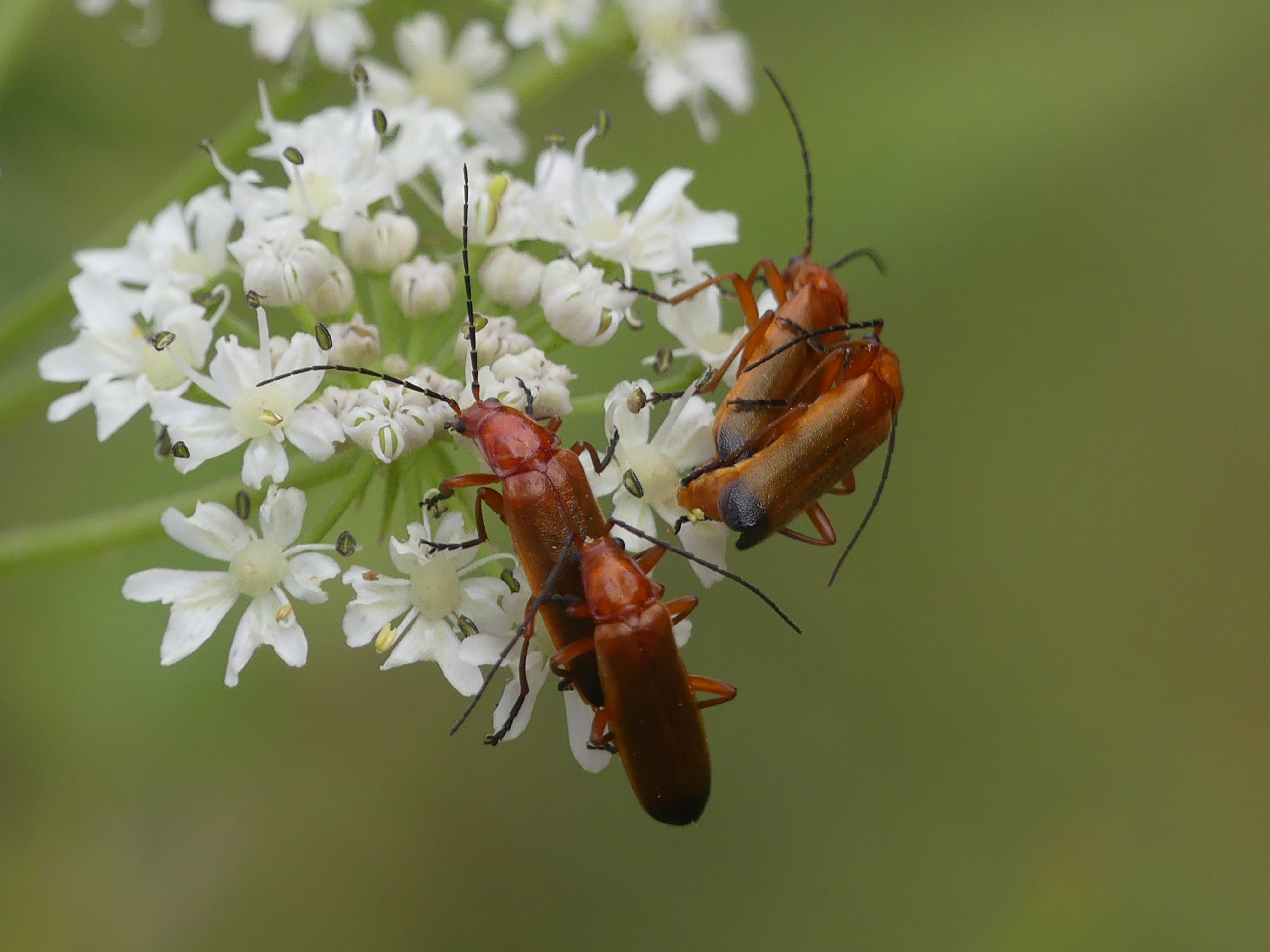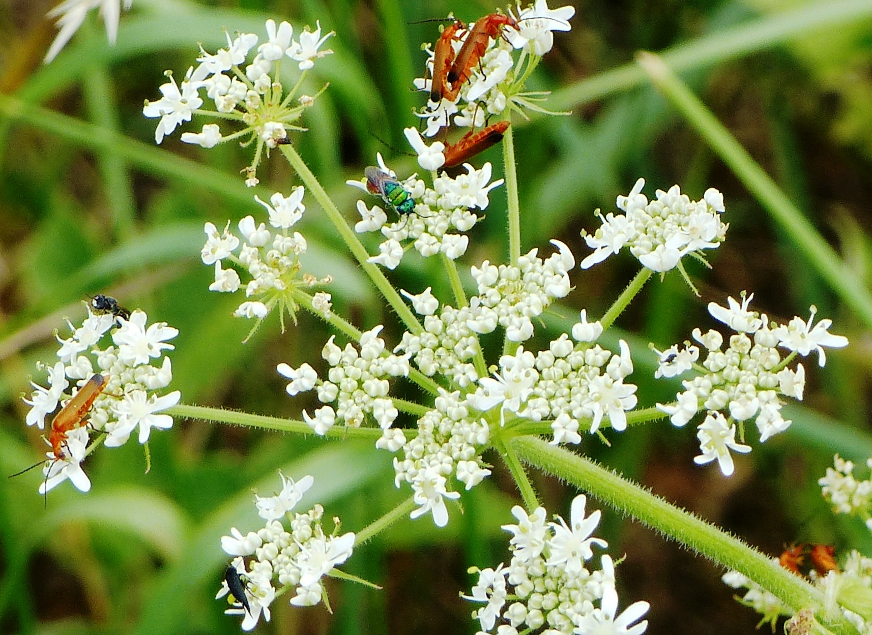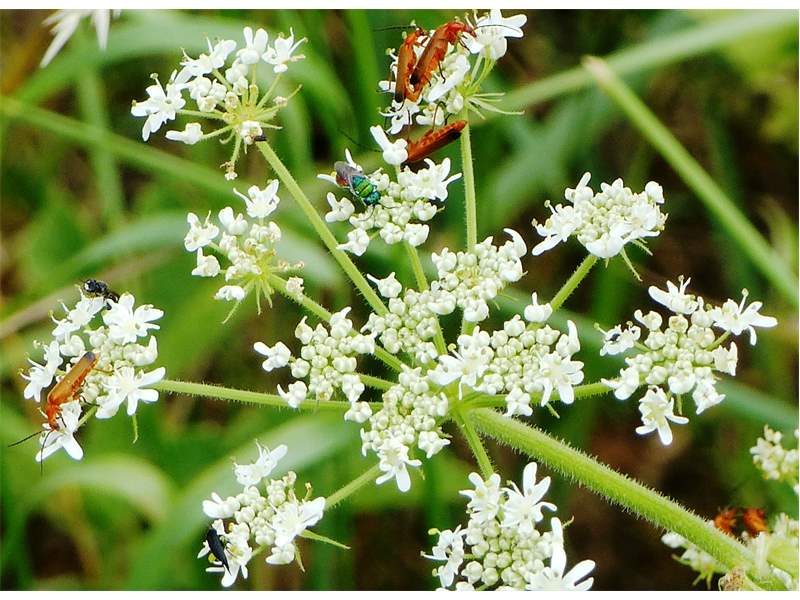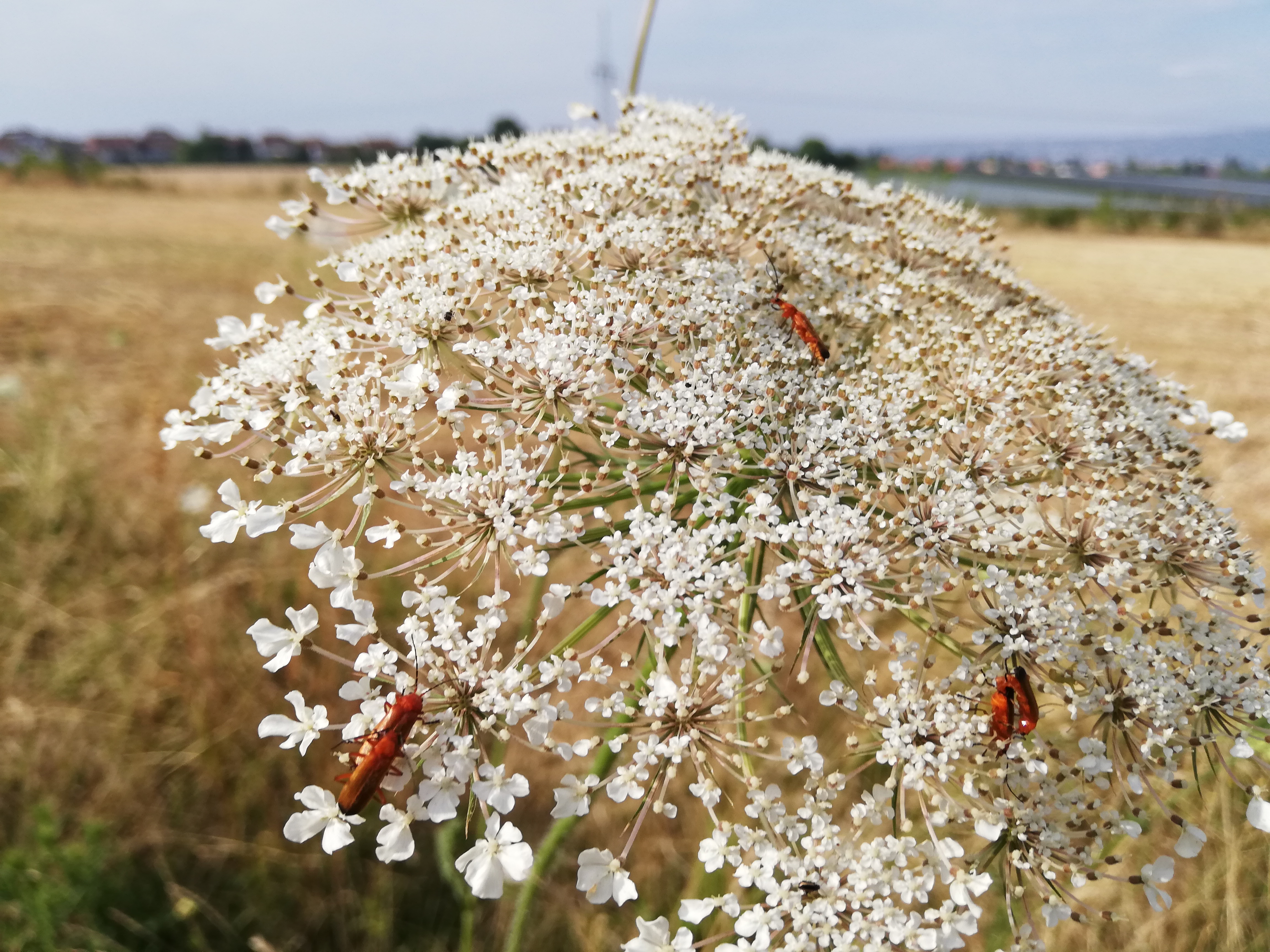 vier Exemplare mit Oxythyrea funesta (Poda, 1761) - Trauer-Rosenkäfer auf Wilder Möhre, Westlausitz, Nordhang Hutberg, Kamenz, 19.07.2020