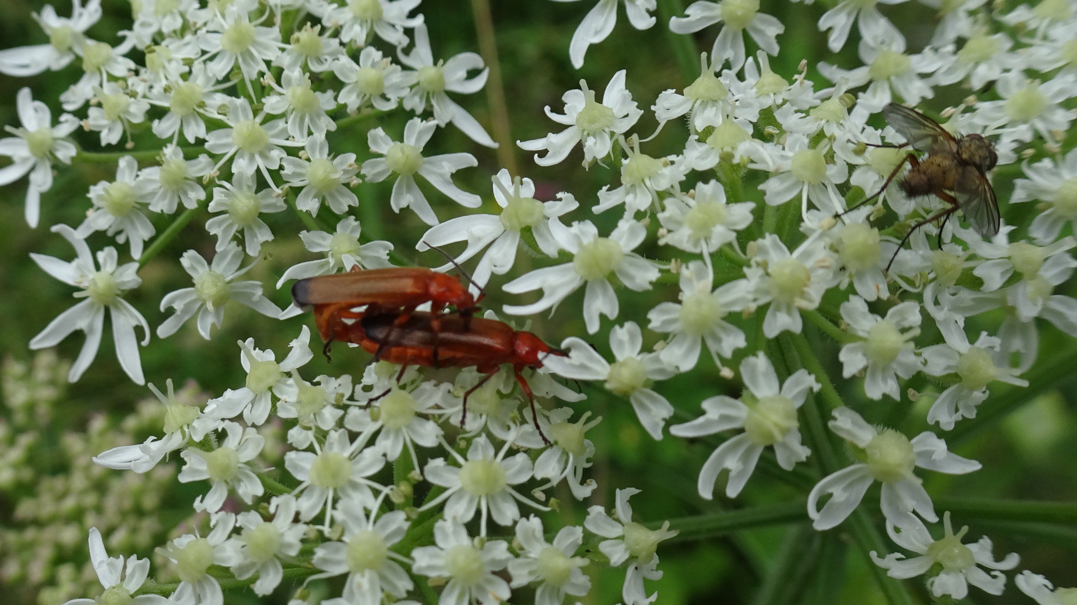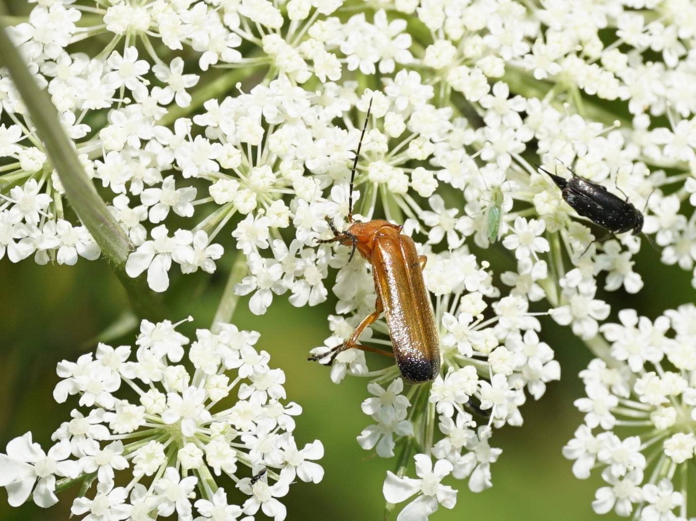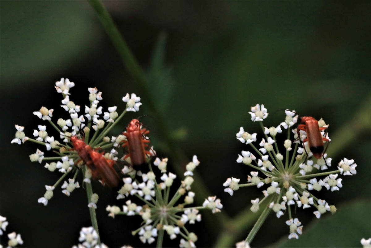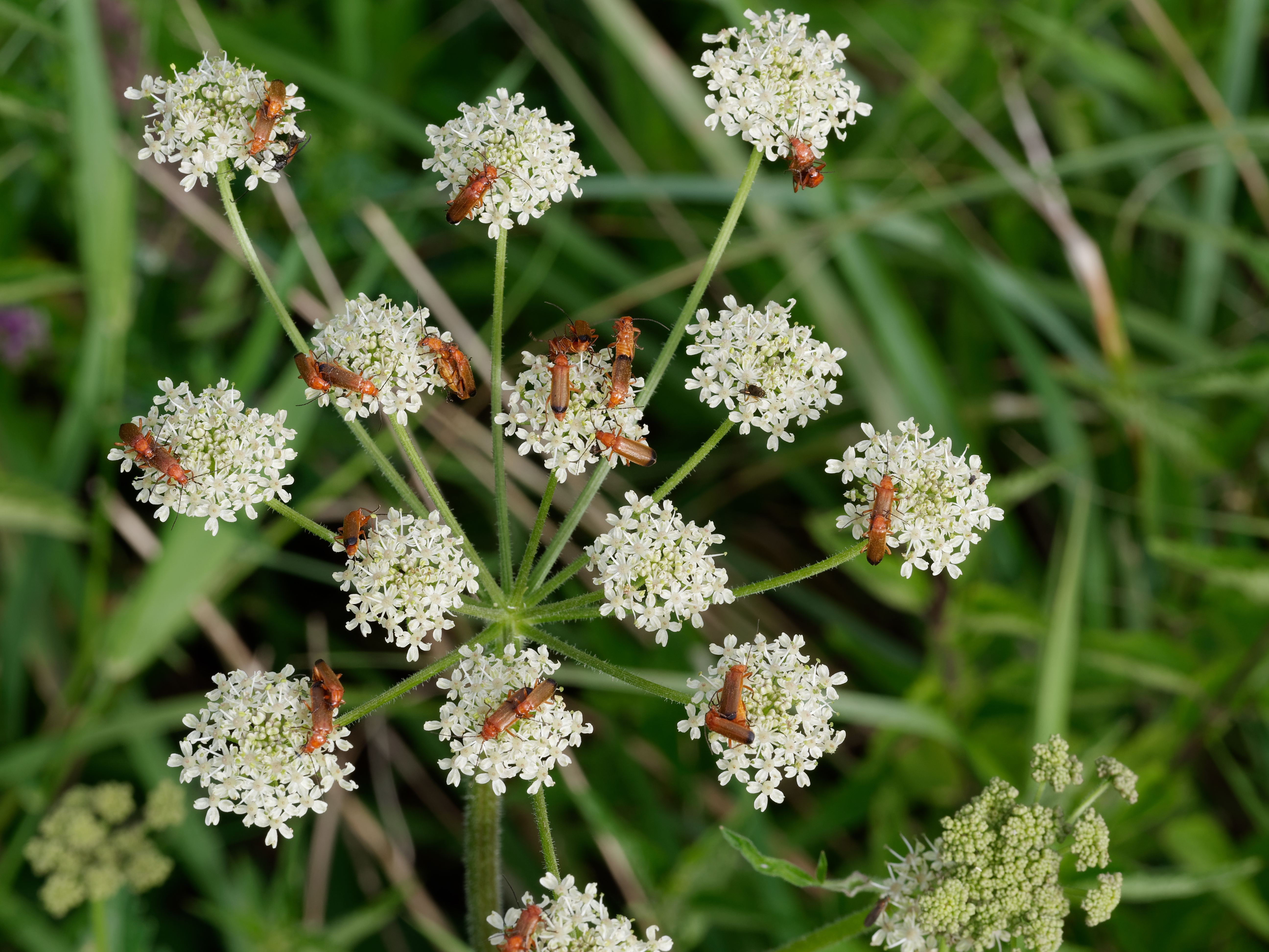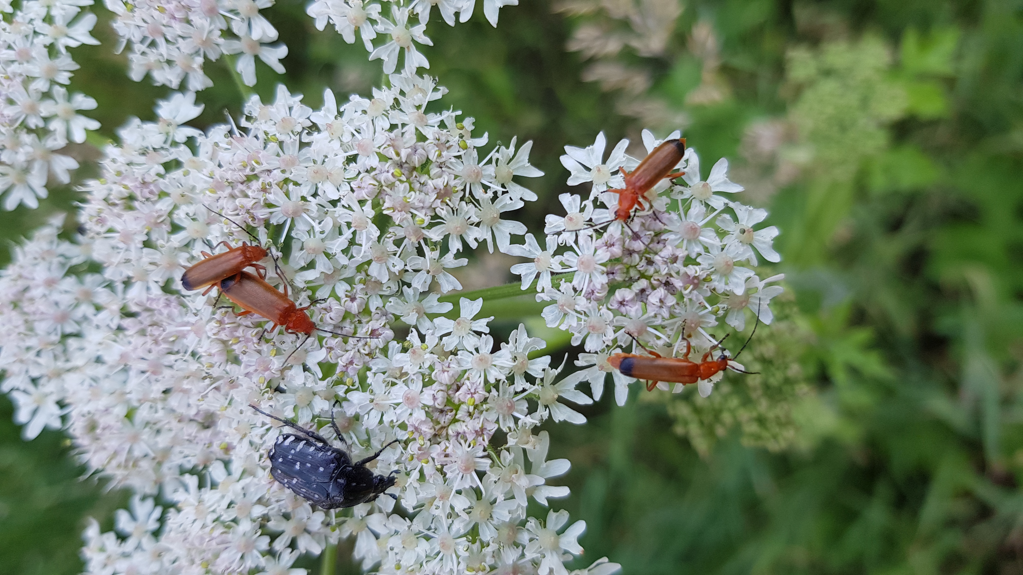 vier Exemplare mit Oxythyrea funesta (Poda, 1761) - Trauer-Rosenkäfer auf Wilder Möhre, Westlausitz, Nordhang Hutberg, Kamenz, 19.07.2020
