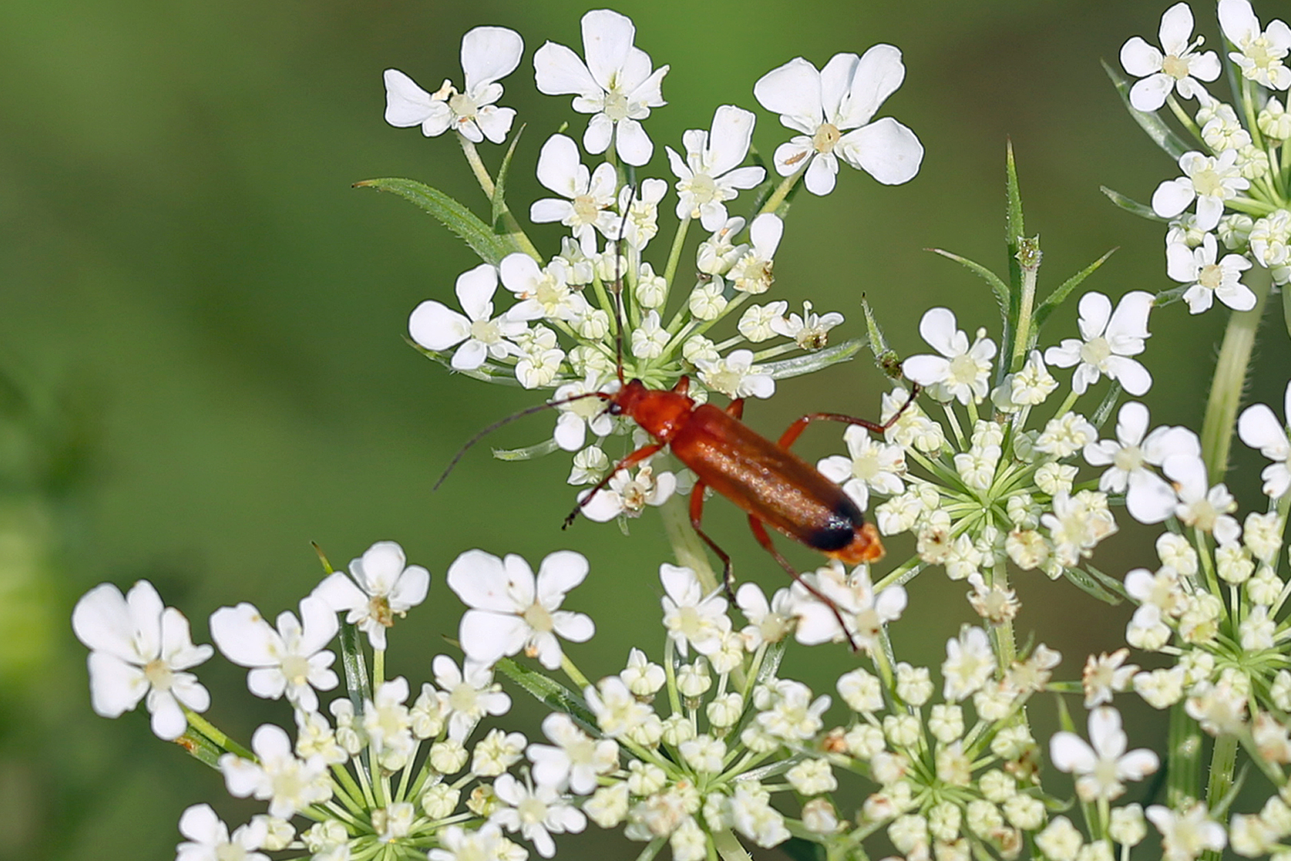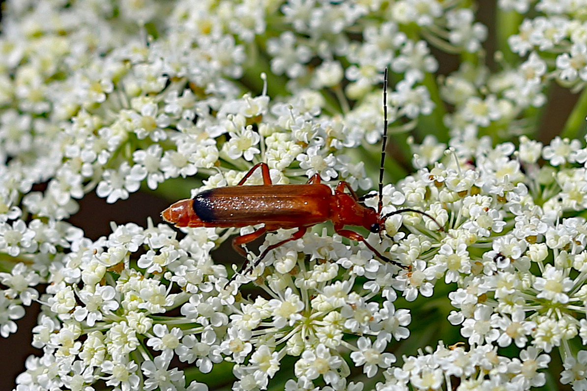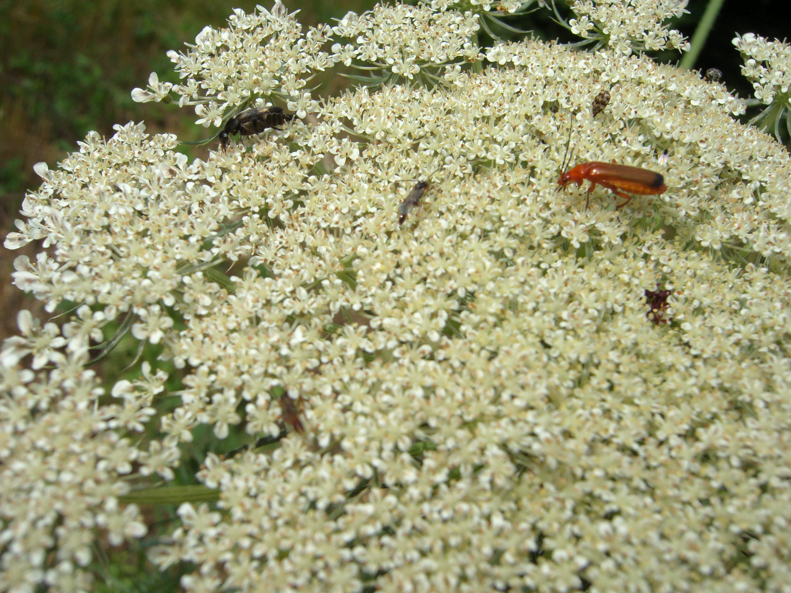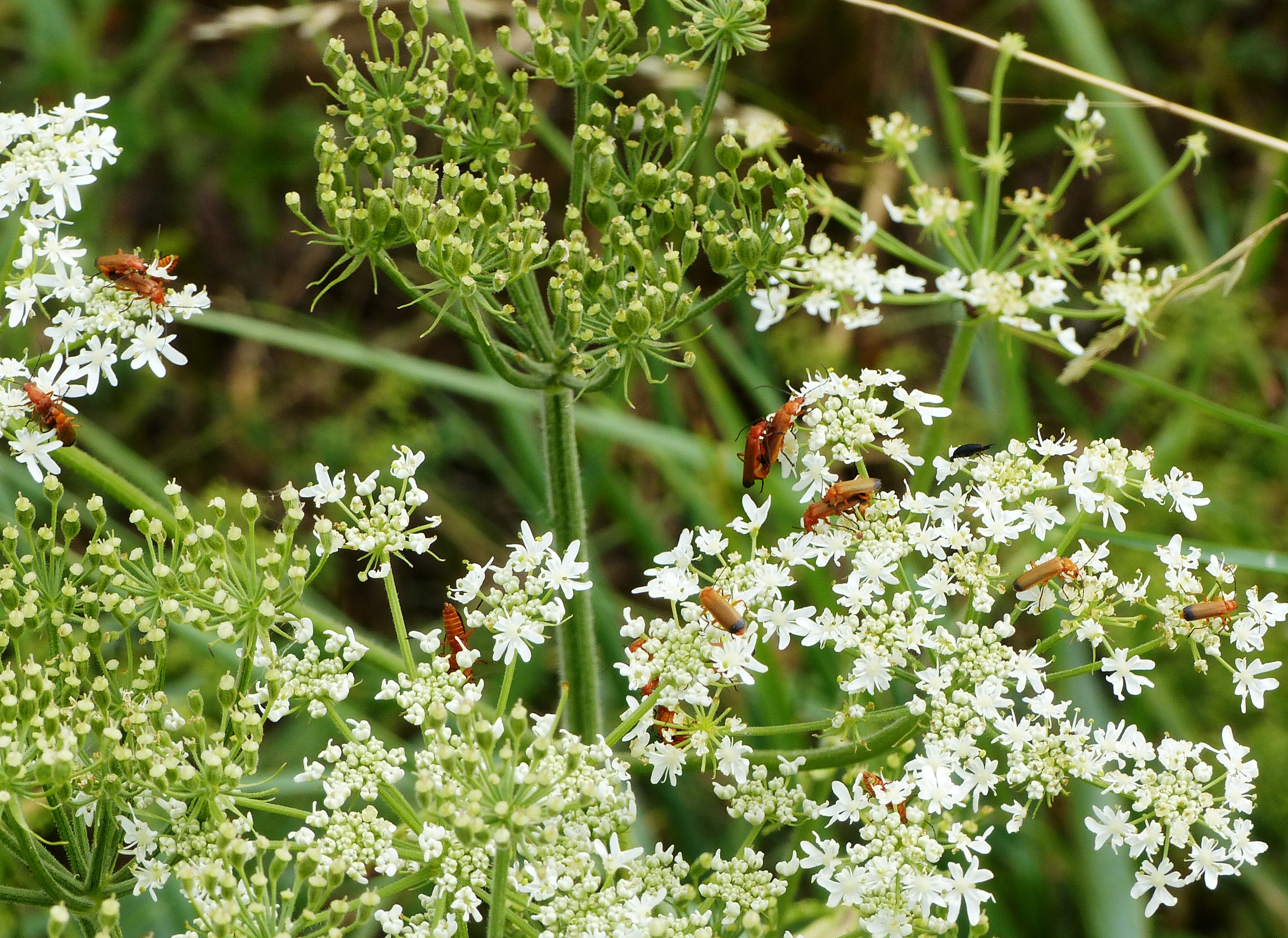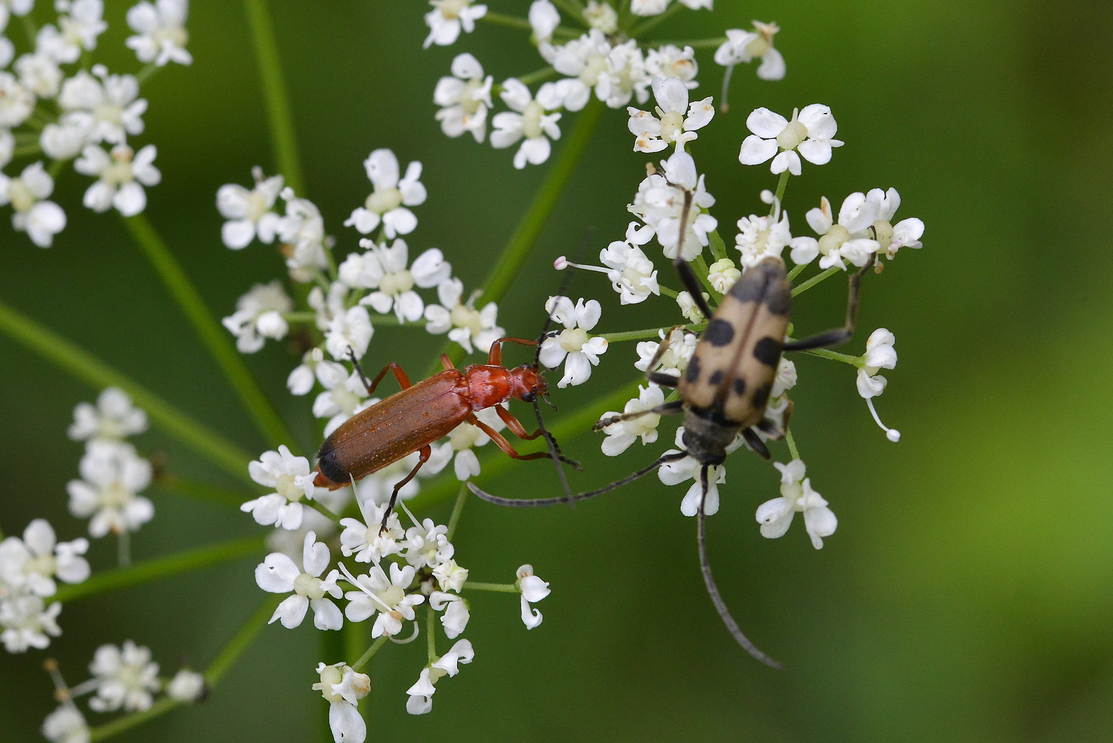 vier Exemplare mit Oxythyrea funesta (Poda, 1761) - Trauer-Rosenkäfer auf Wilder Möhre, Westlausitz, Nordhang Hutberg, Kamenz, 19.07.2020