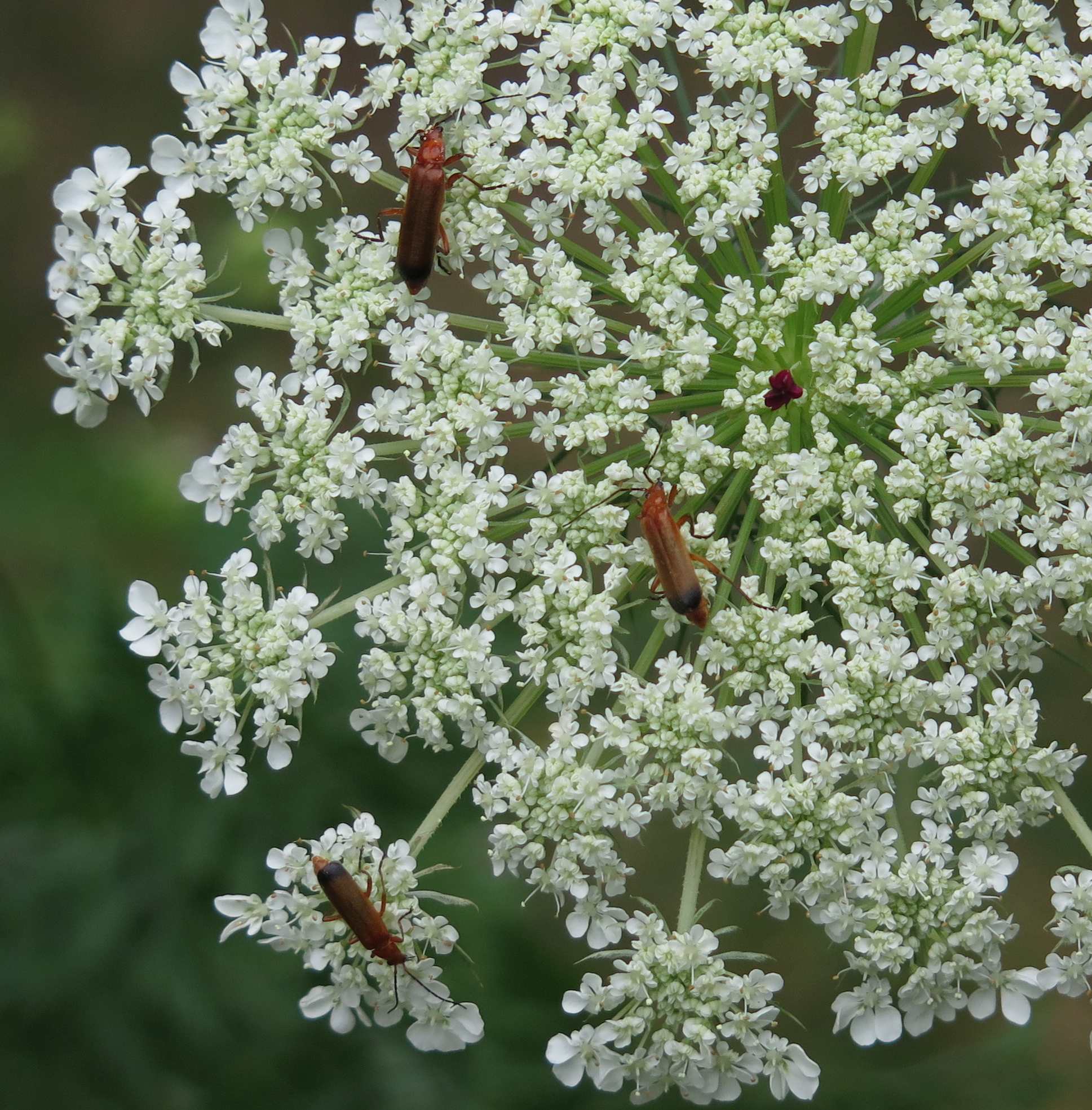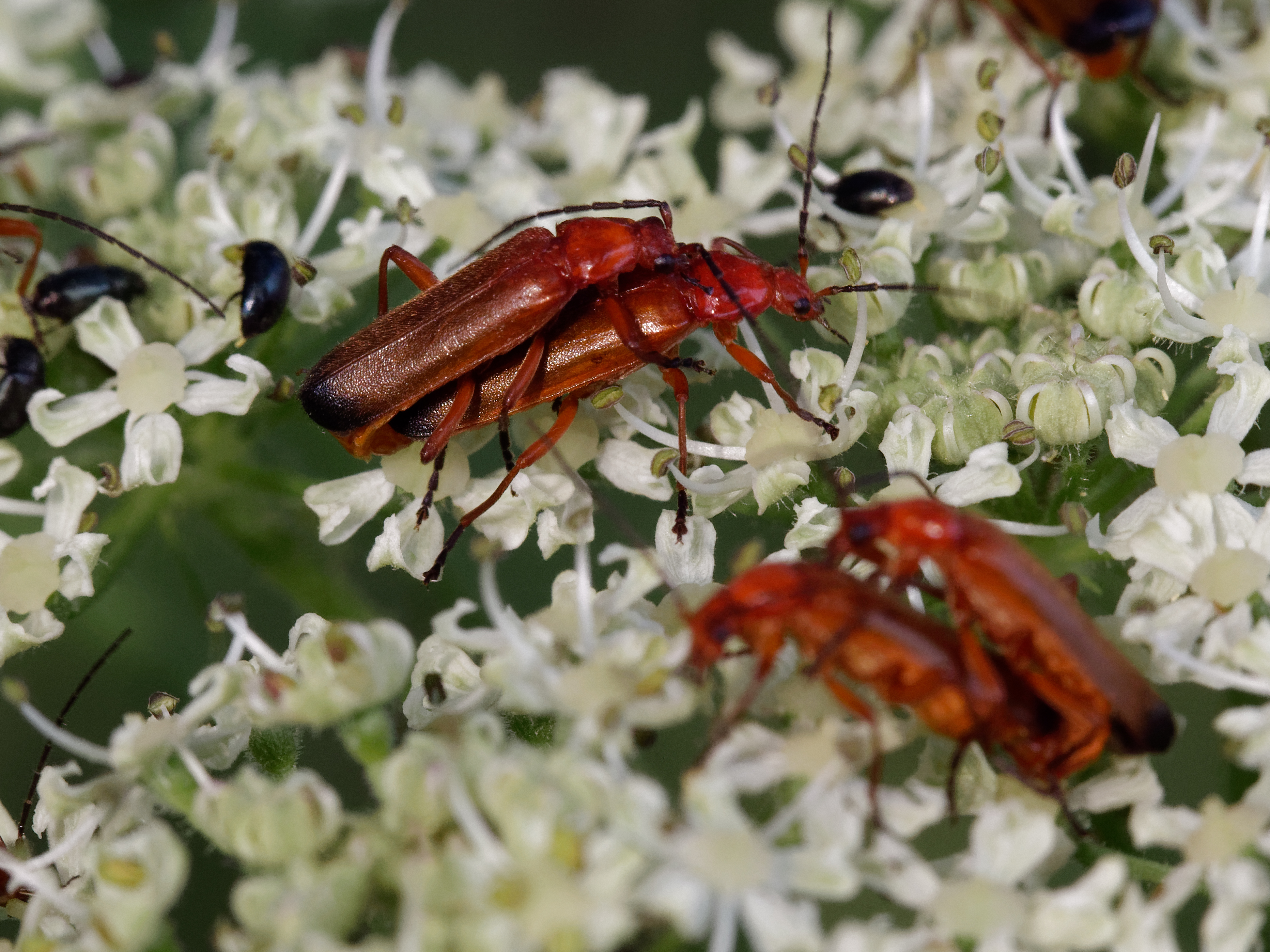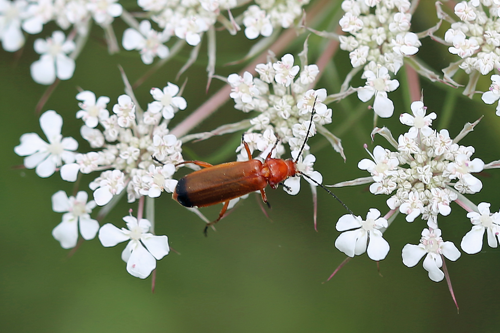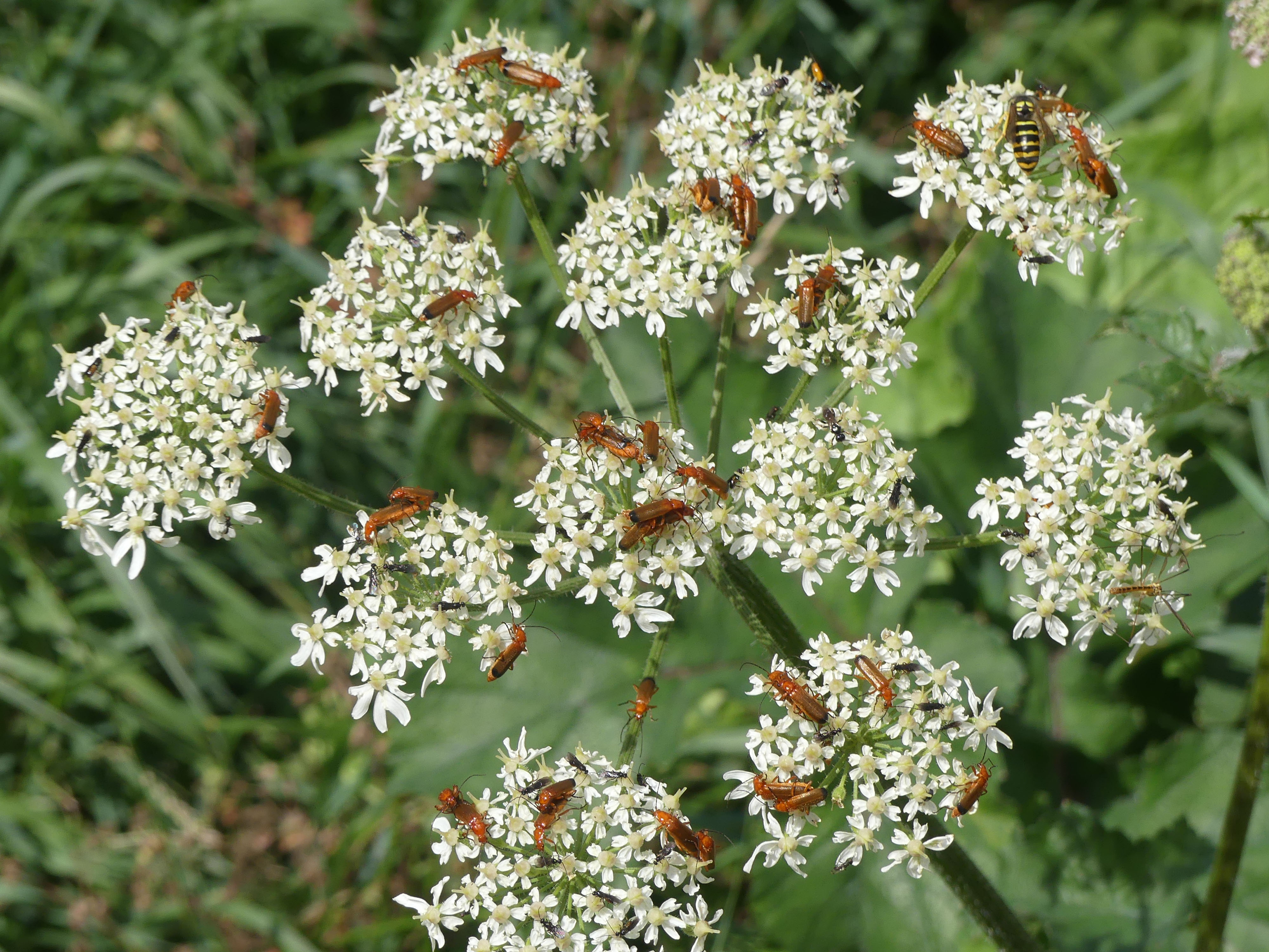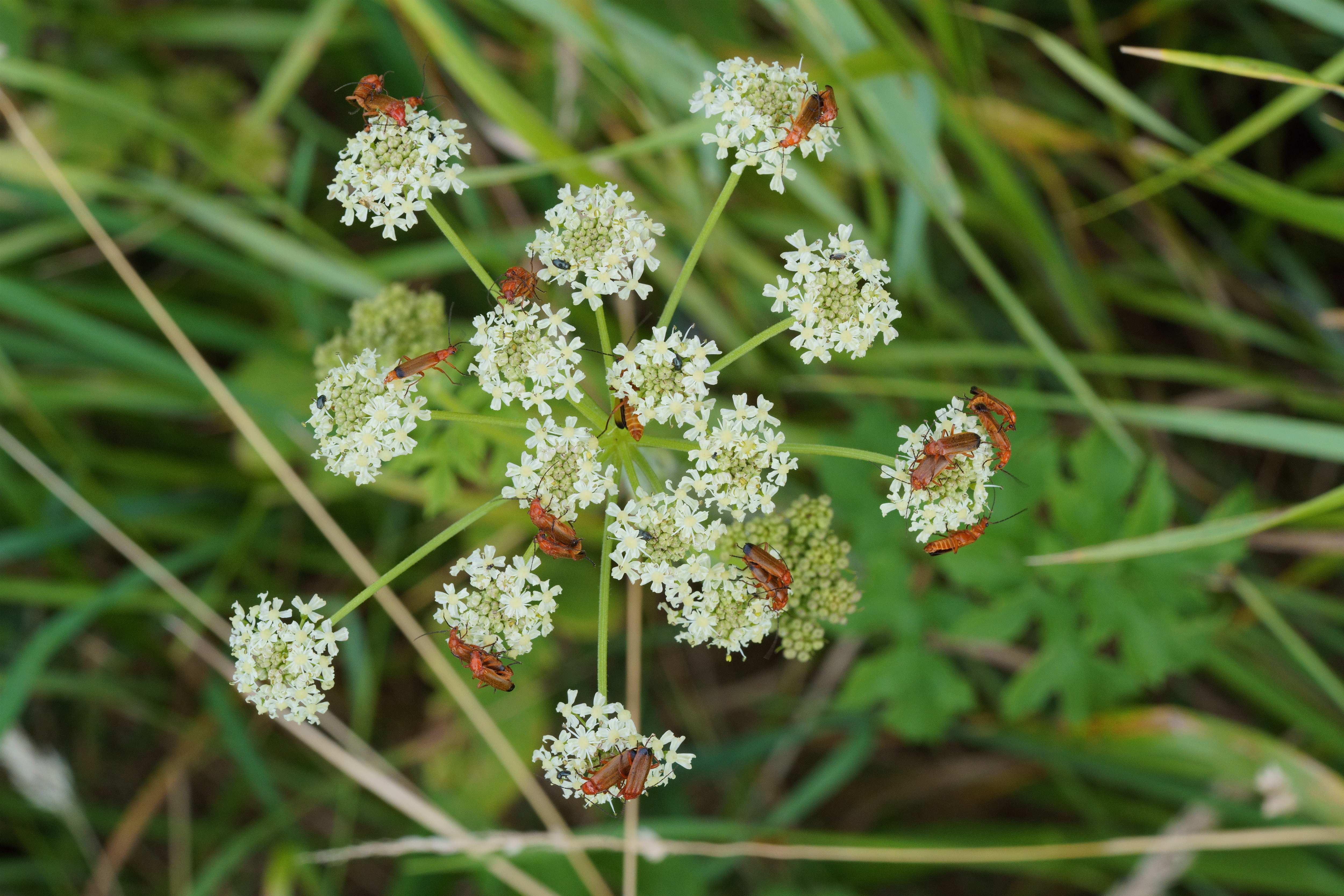 vier Exemplare mit Oxythyrea funesta (Poda, 1761) - Trauer-Rosenkäfer auf Wilder Möhre, Westlausitz, Nordhang Hutberg, Kamenz, 19.07.2020
