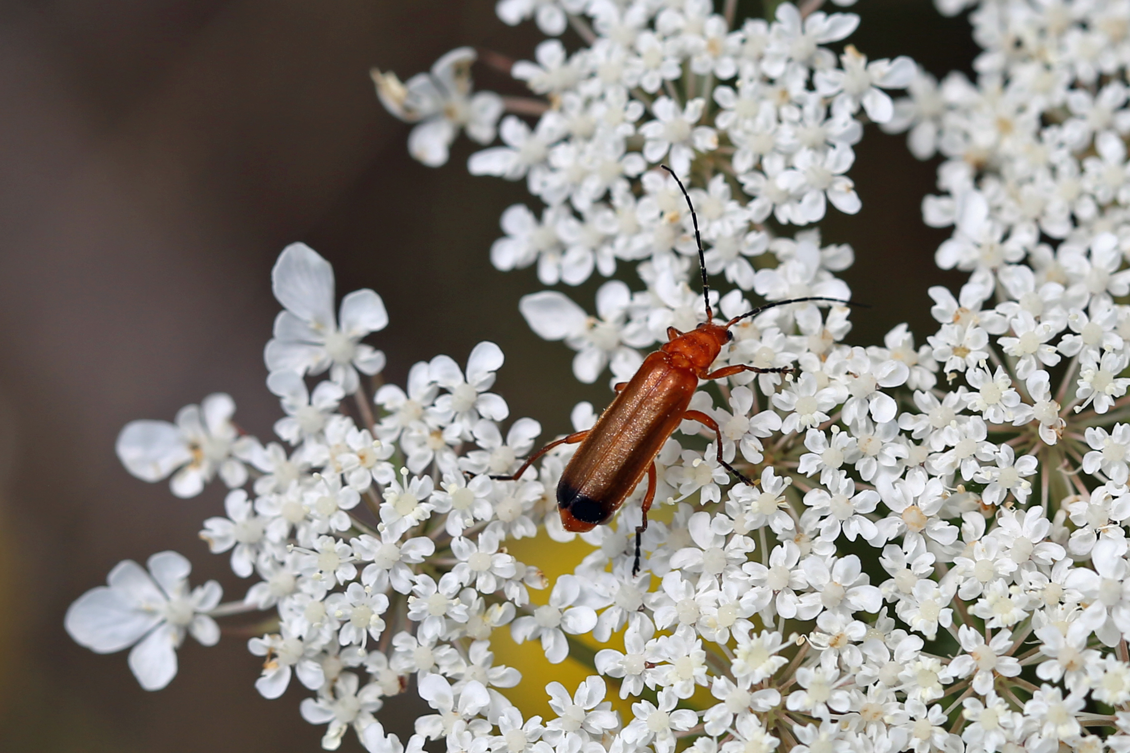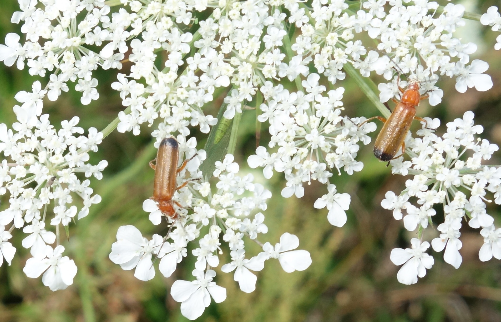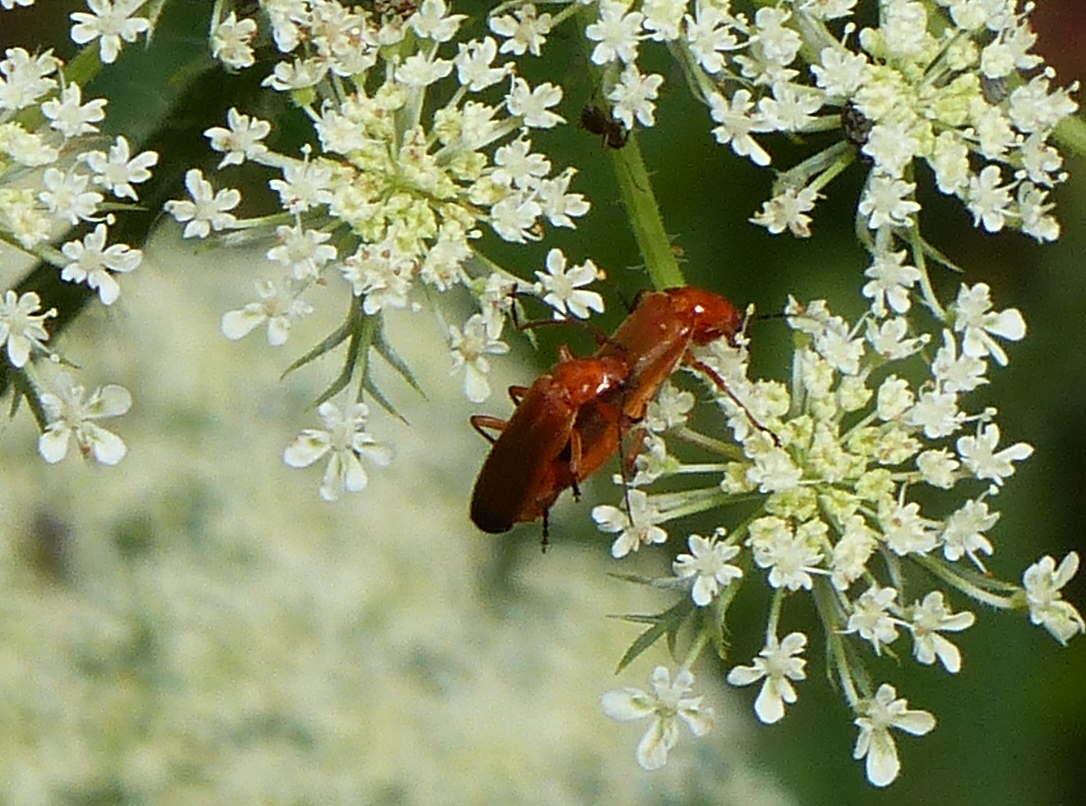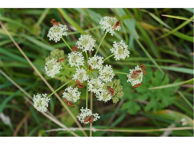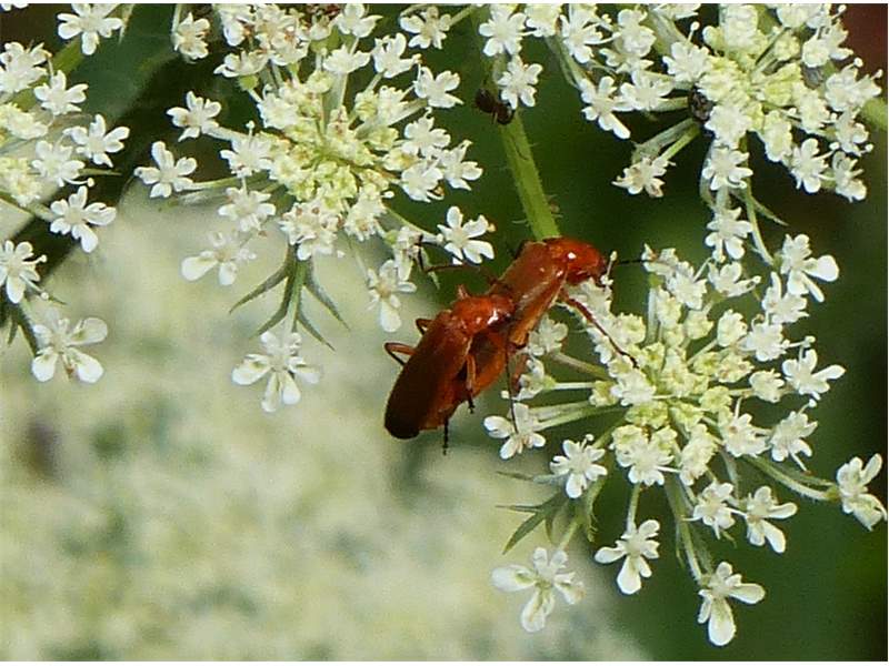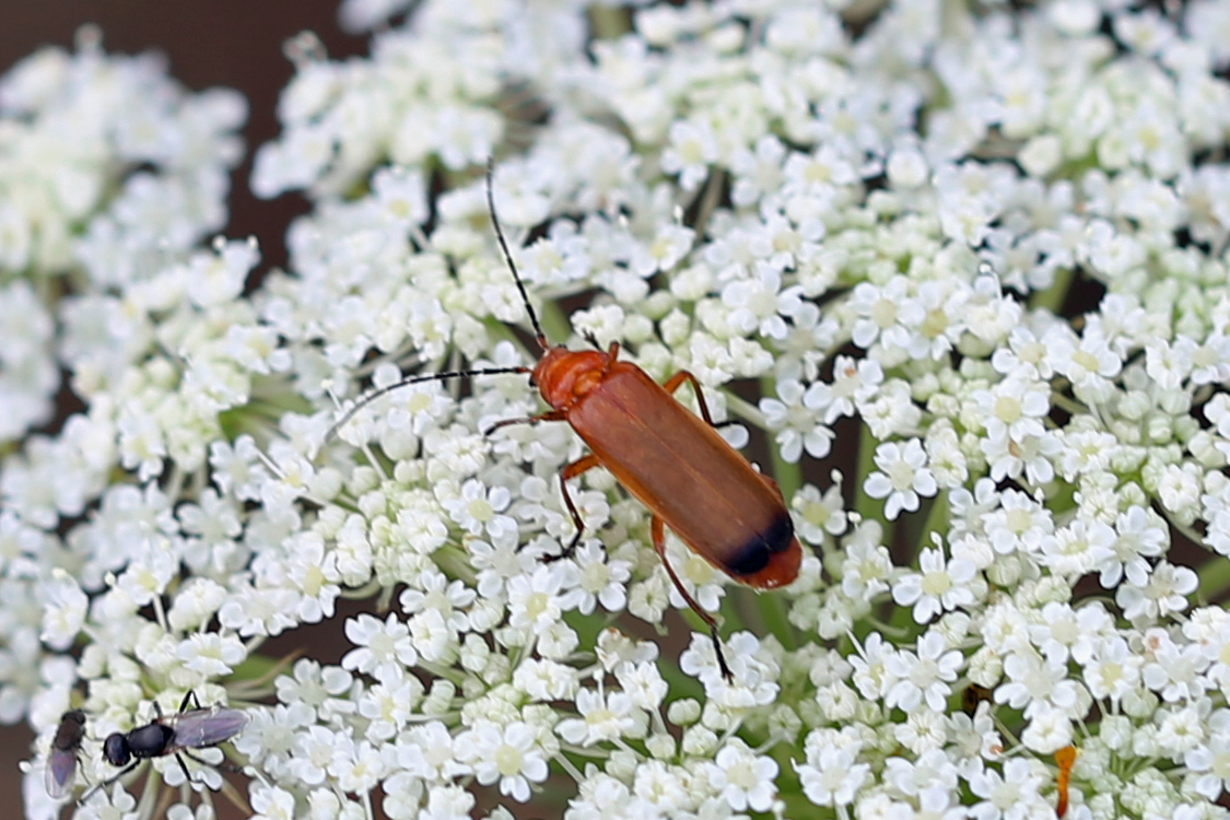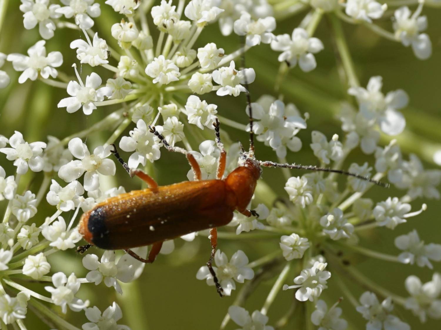 vier Exemplare mit Oxythyrea funesta (Poda, 1761) - Trauer-Rosenkäfer auf Wilder Möhre, Westlausitz, Nordhang Hutberg, Kamenz, 19.07.2020