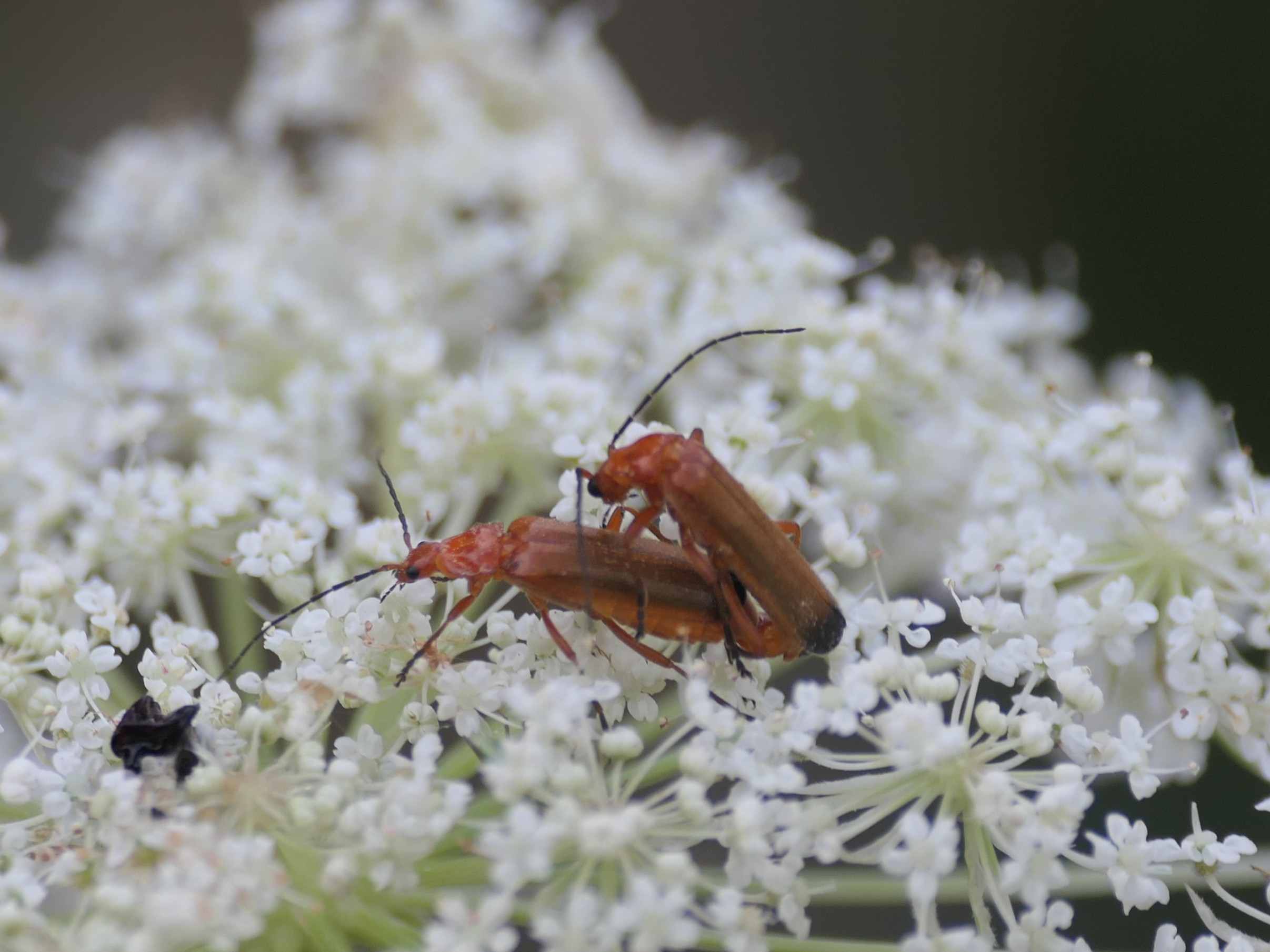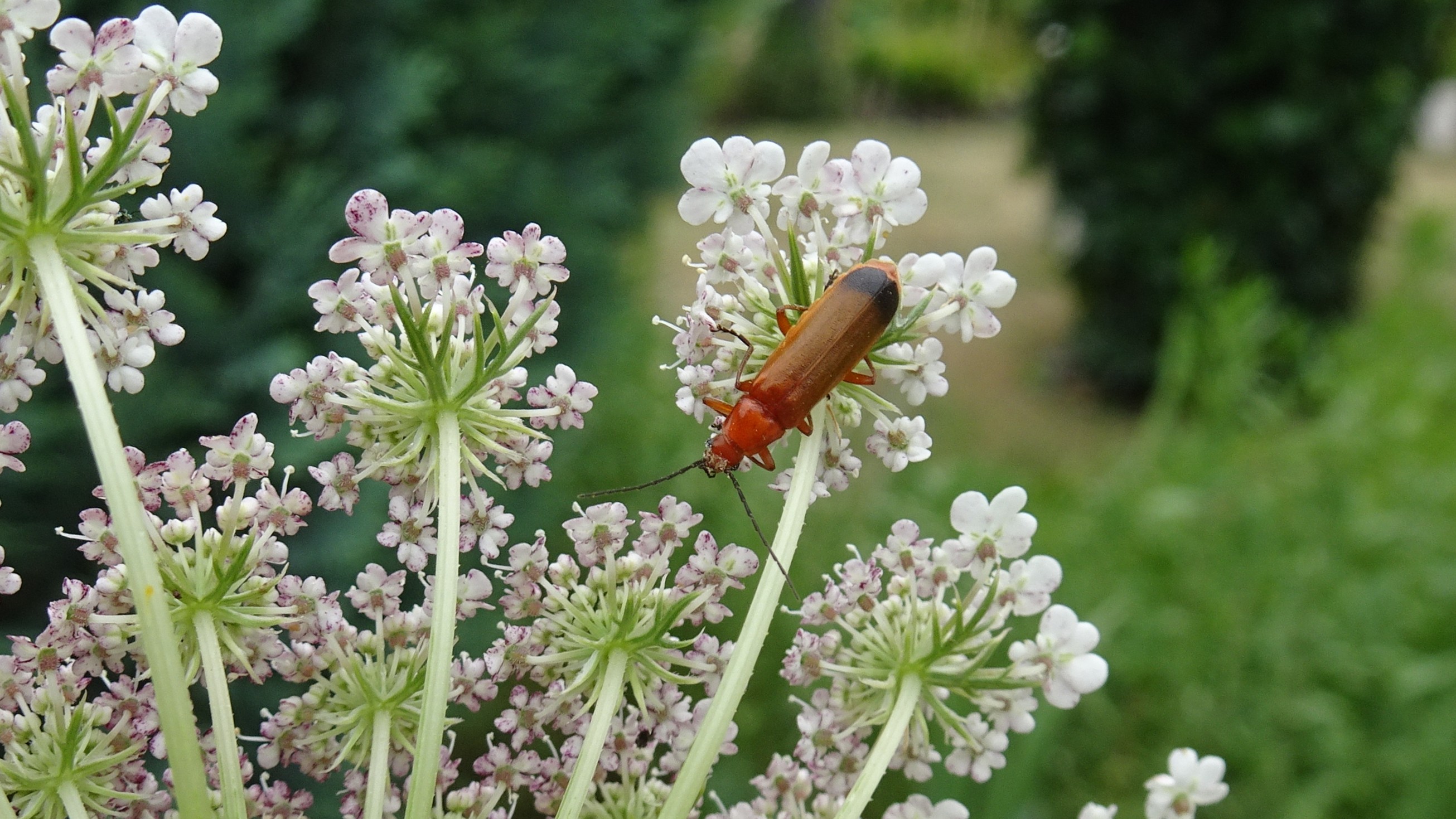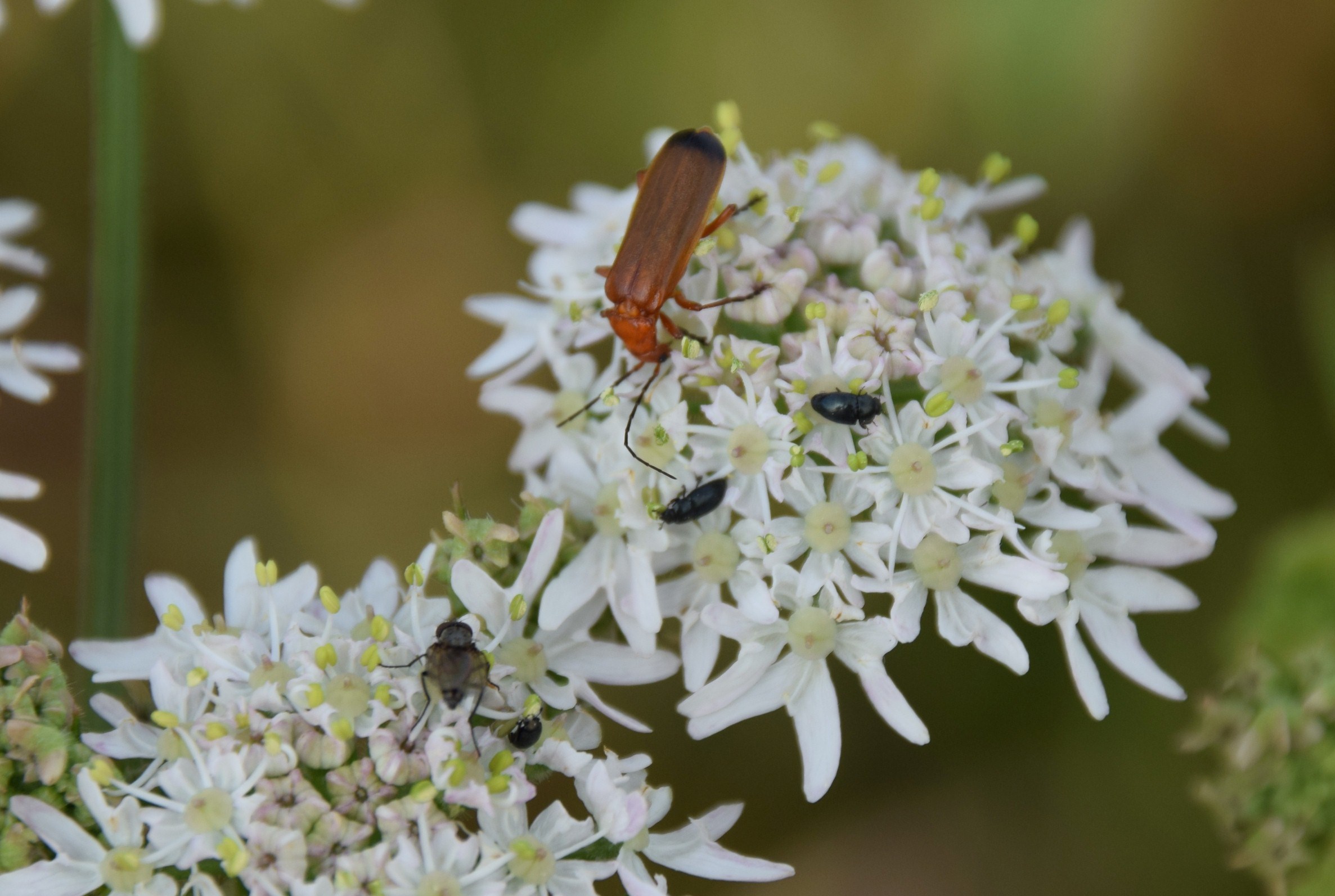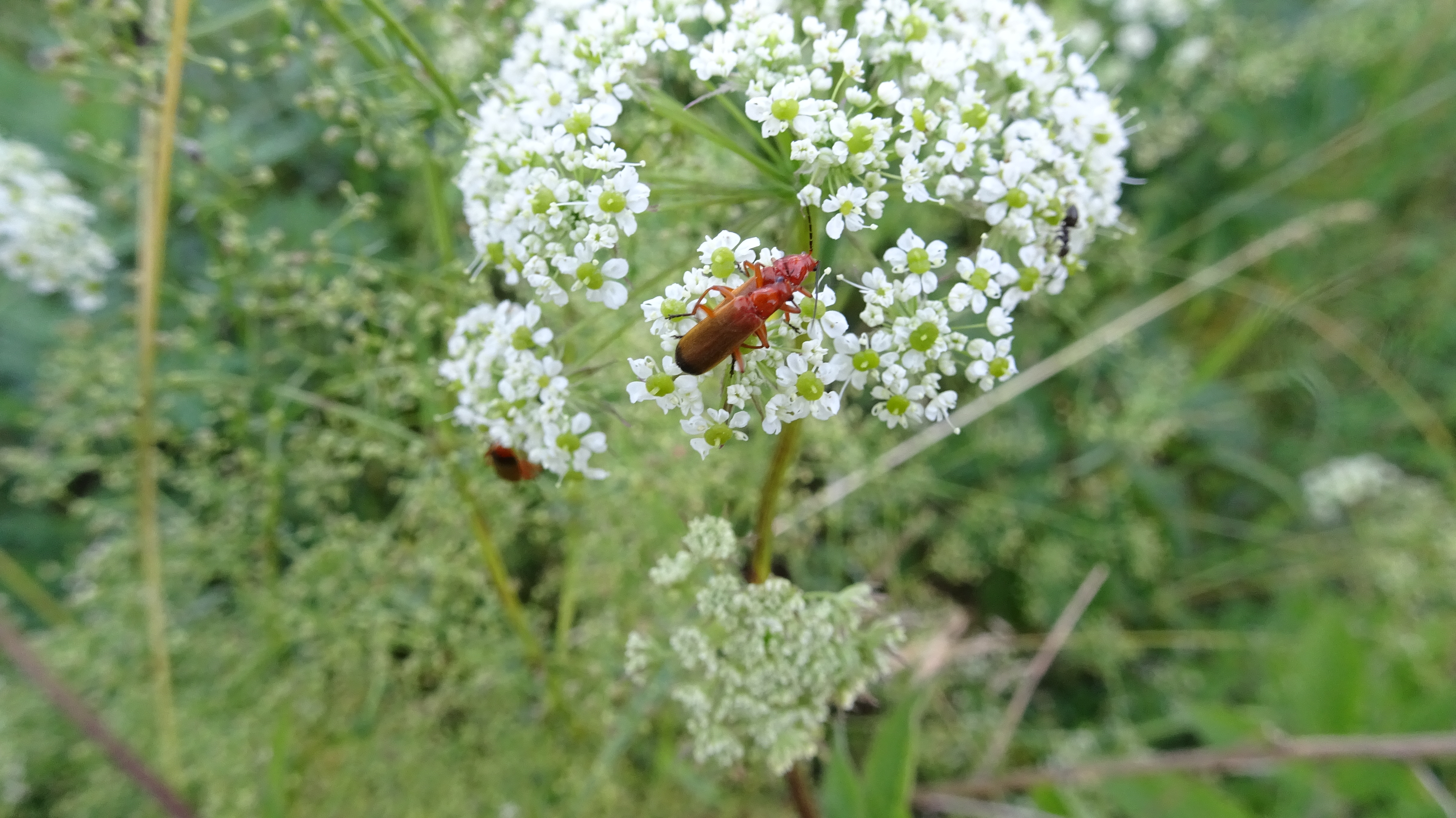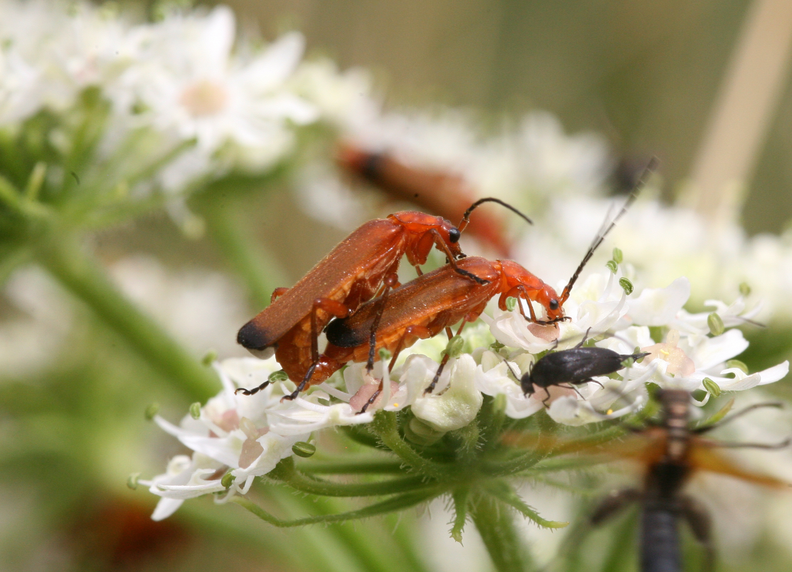 vier Exemplare mit Oxythyrea funesta (Poda, 1761) - Trauer-Rosenkäfer auf Wilder Möhre, Westlausitz, Nordhang Hutberg, Kamenz, 19.07.2020