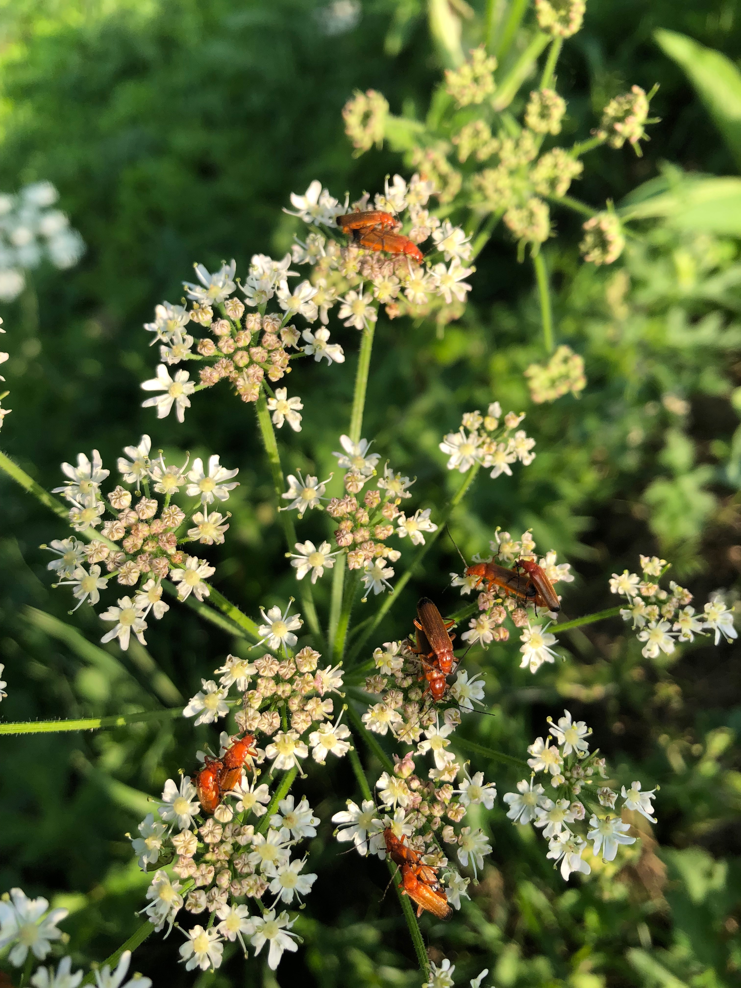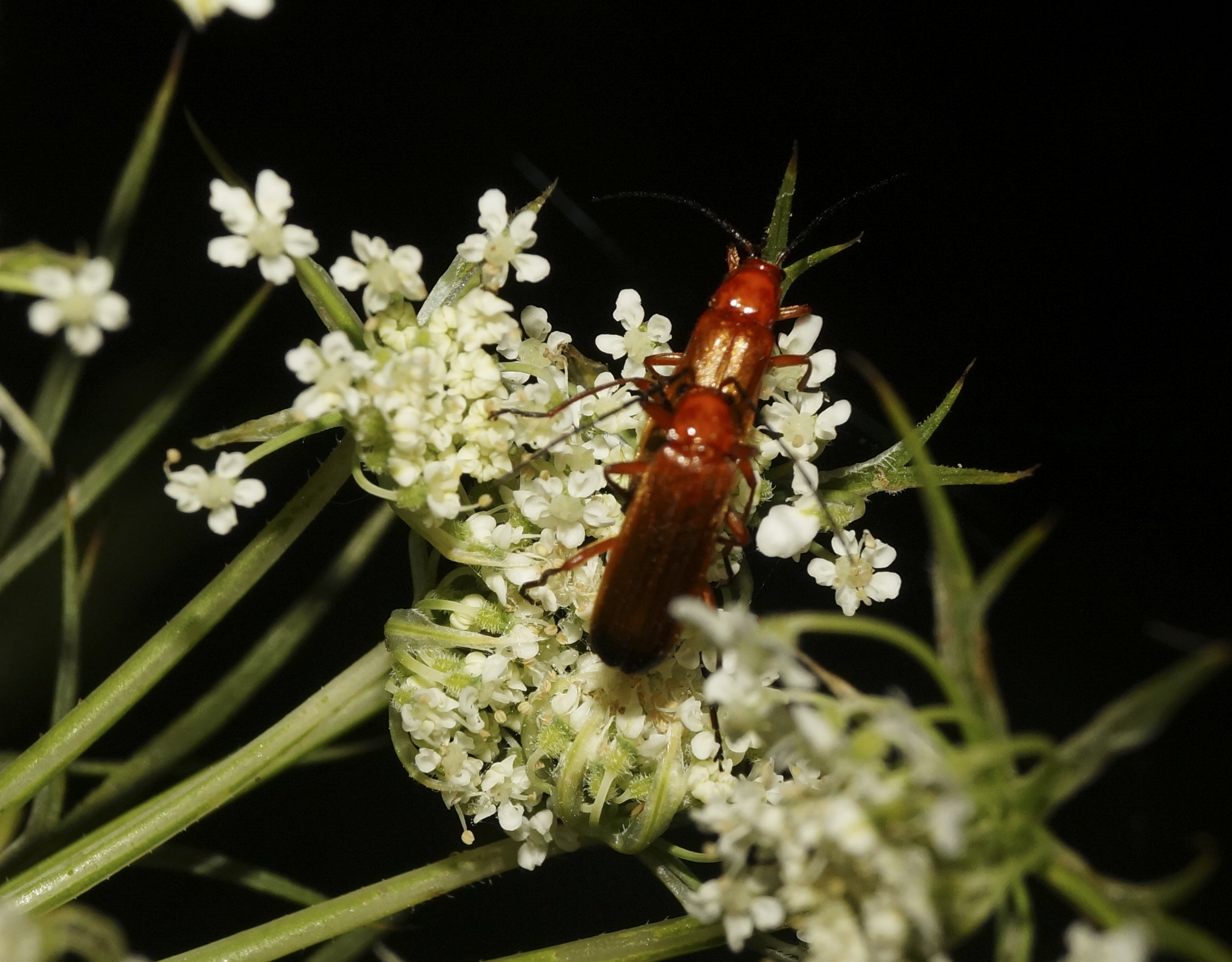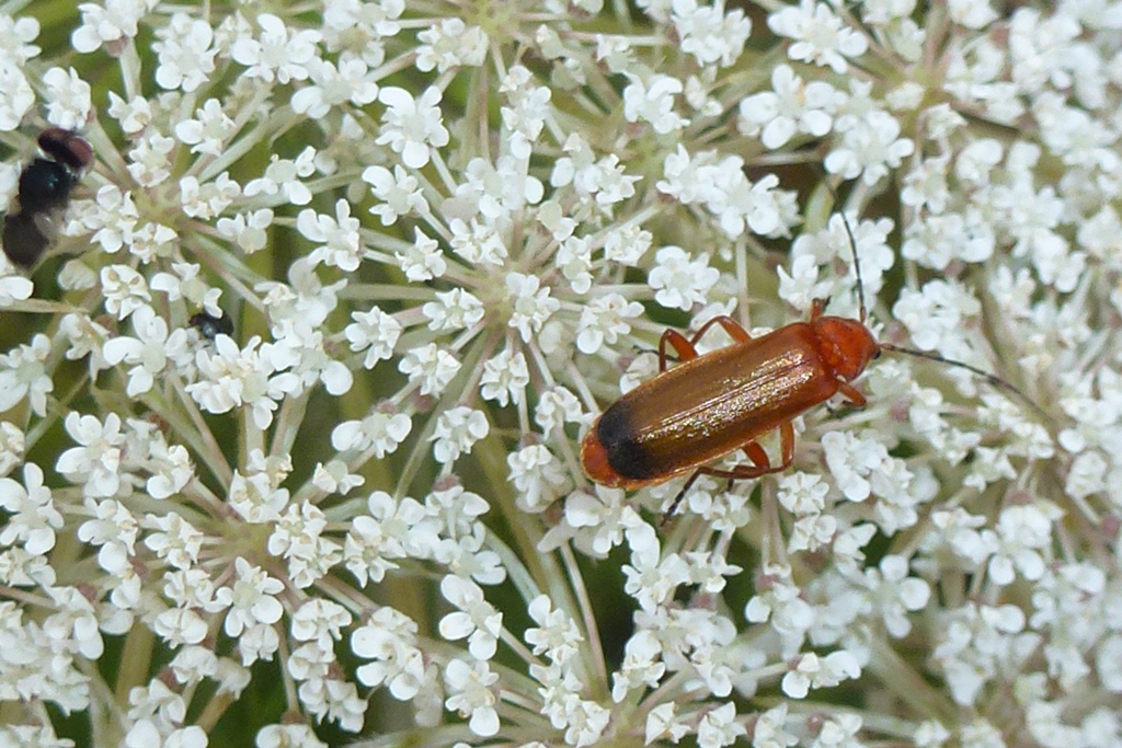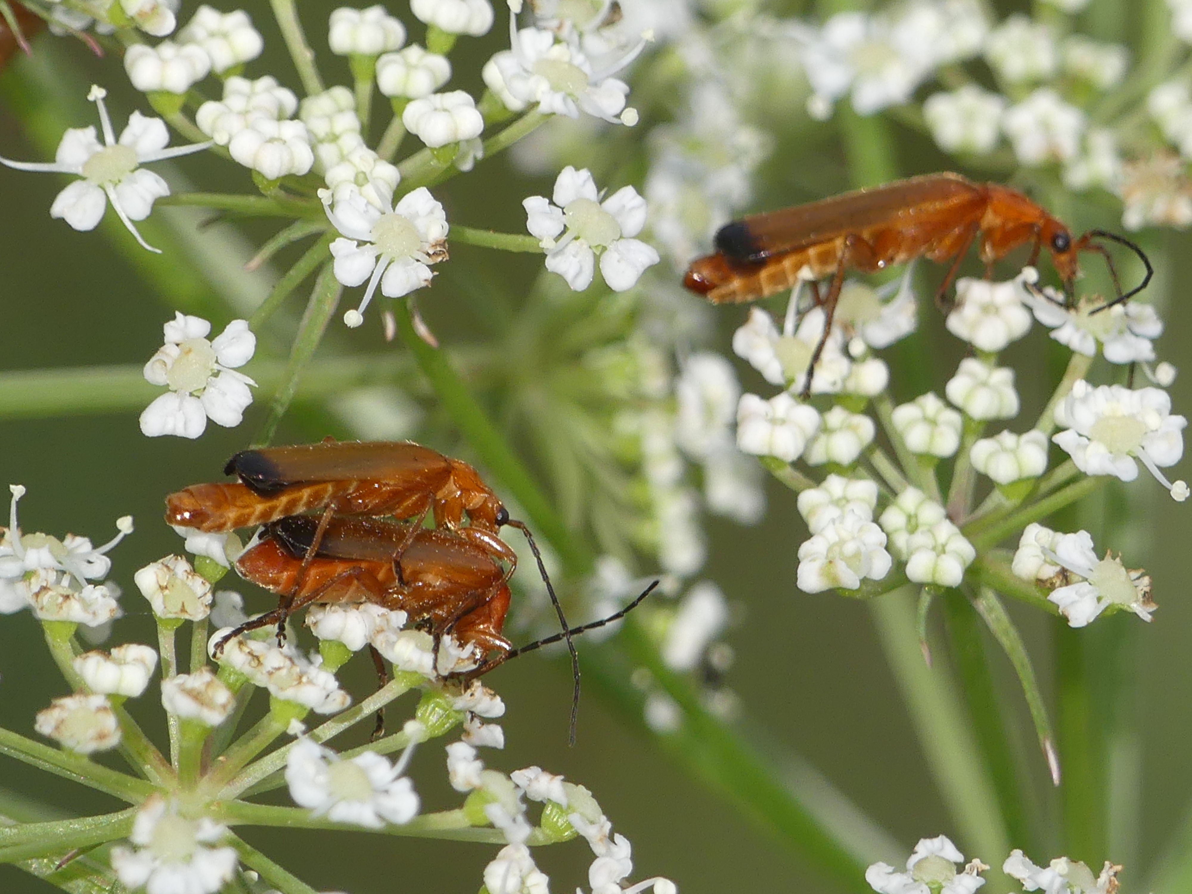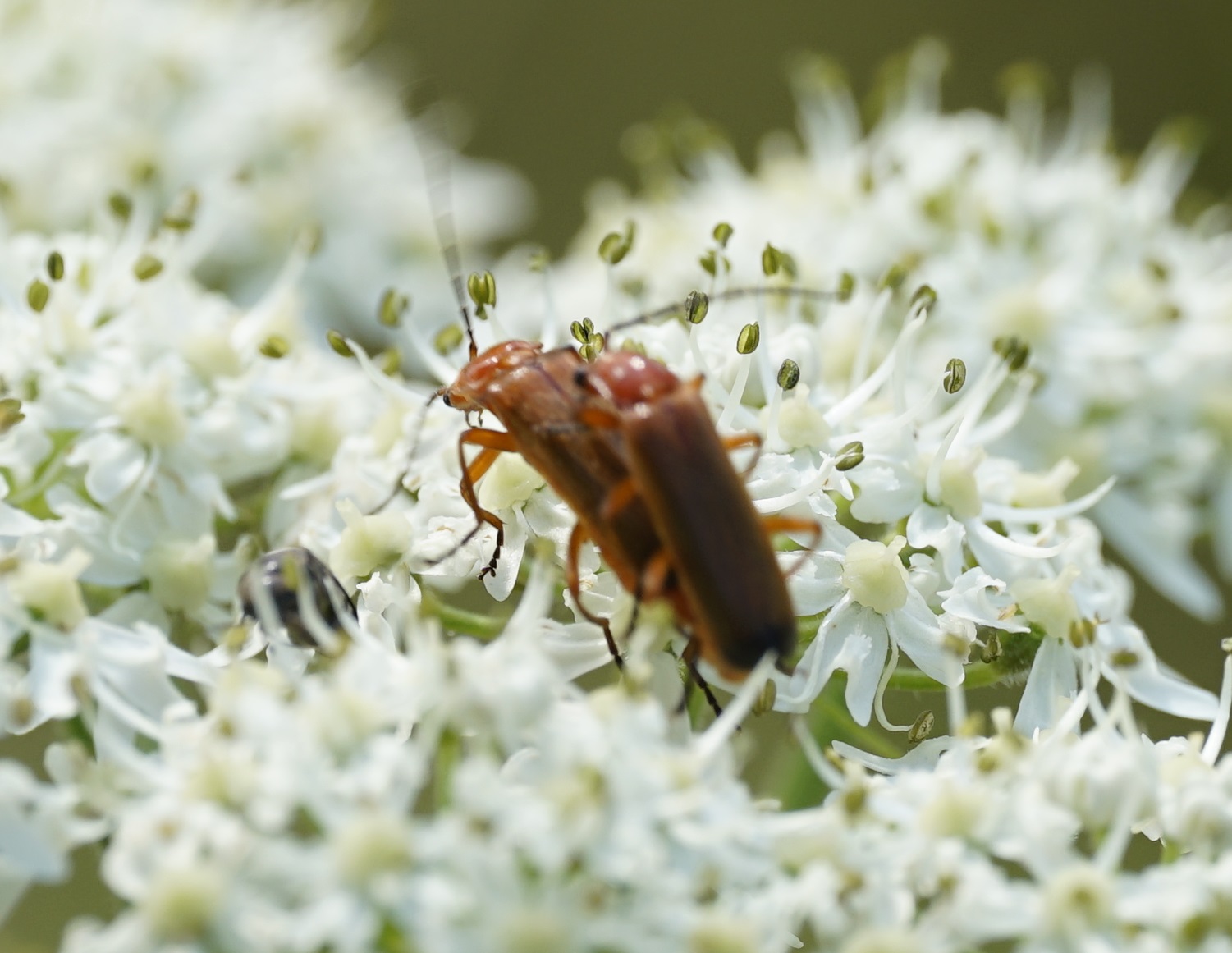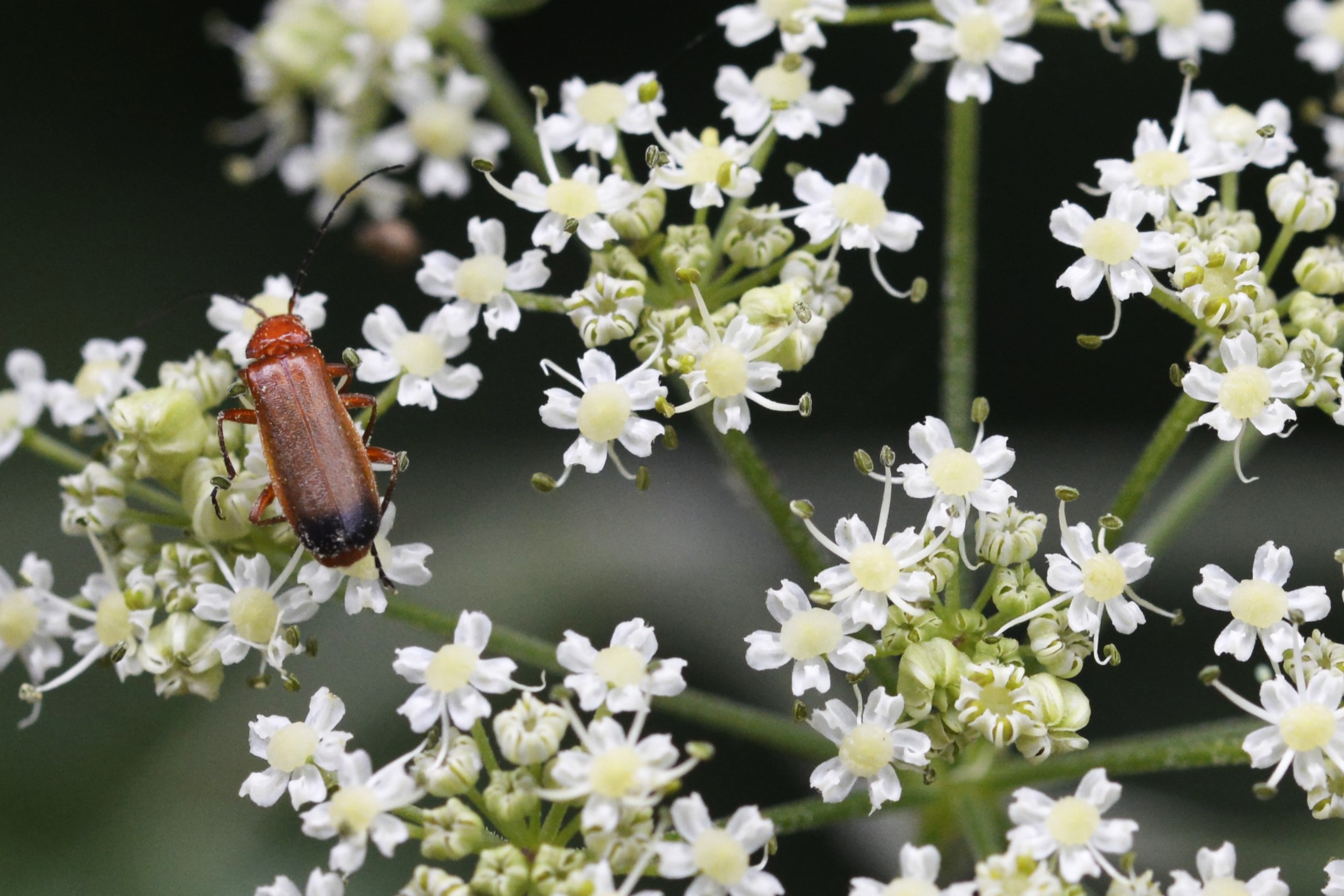 vier Exemplare mit Oxythyrea funesta (Poda, 1761) - Trauer-Rosenkäfer auf Wilder Möhre, Westlausitz, Nordhang Hutberg, Kamenz, 19.07.2020