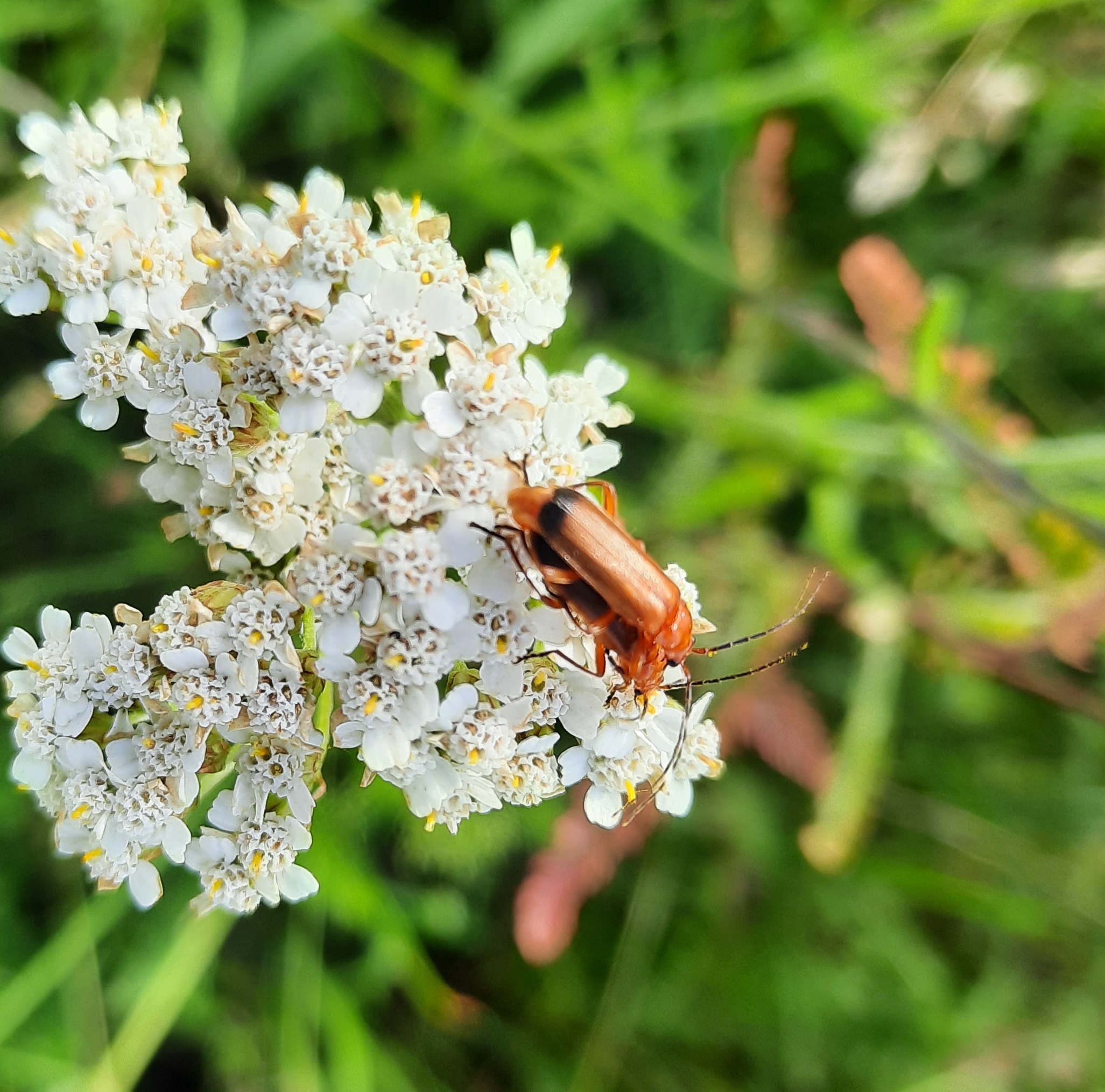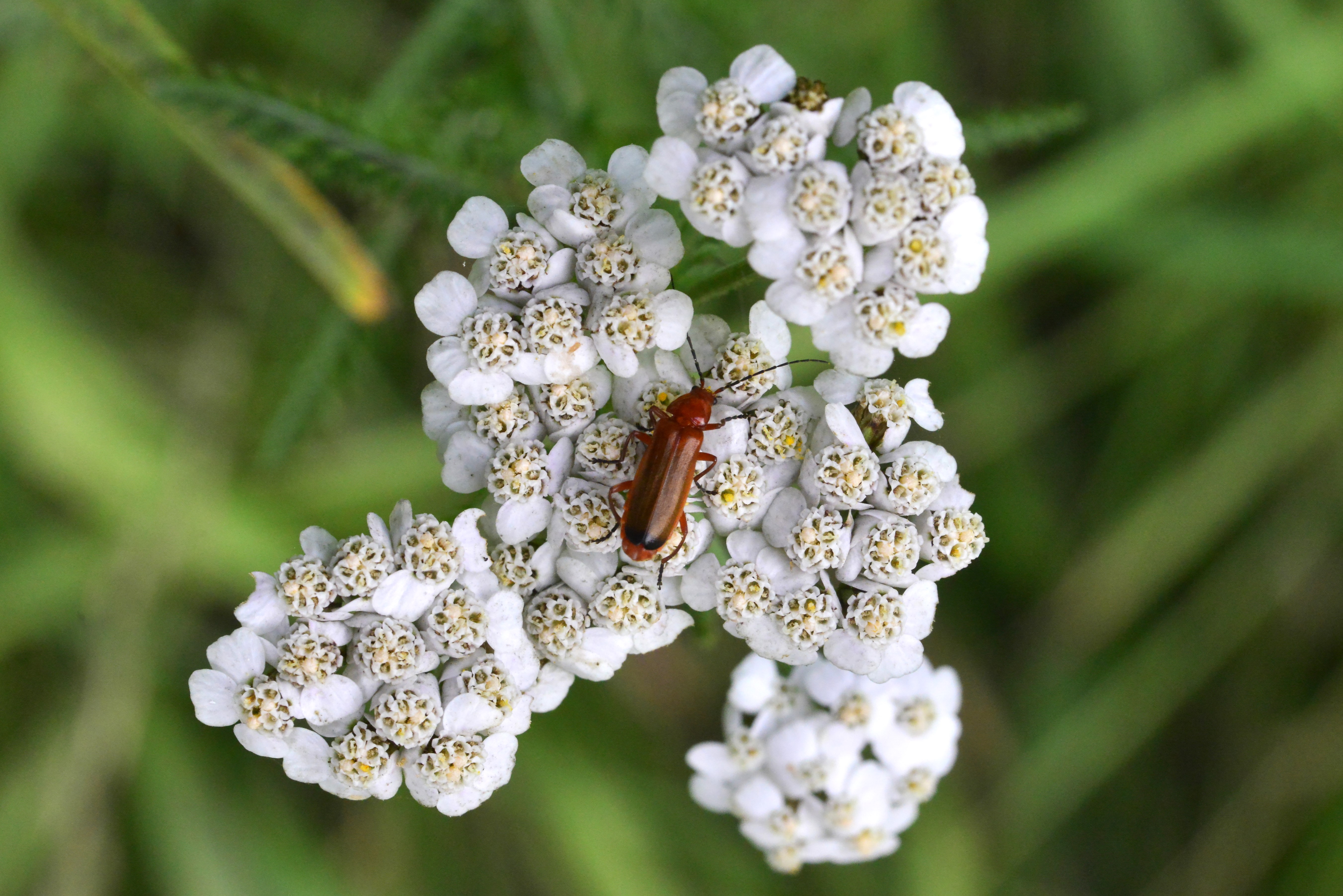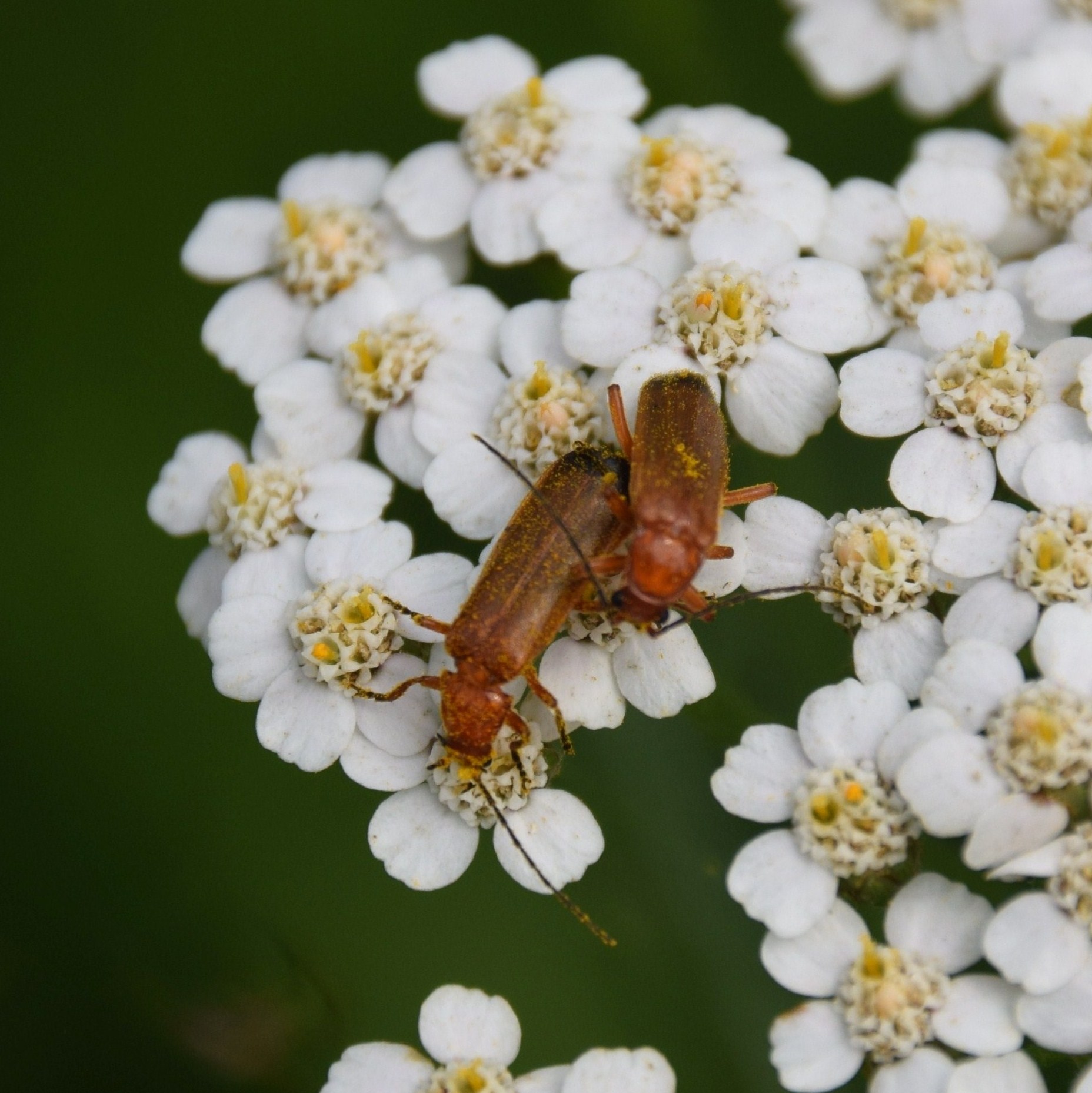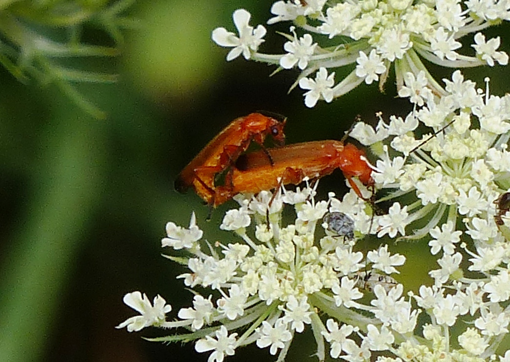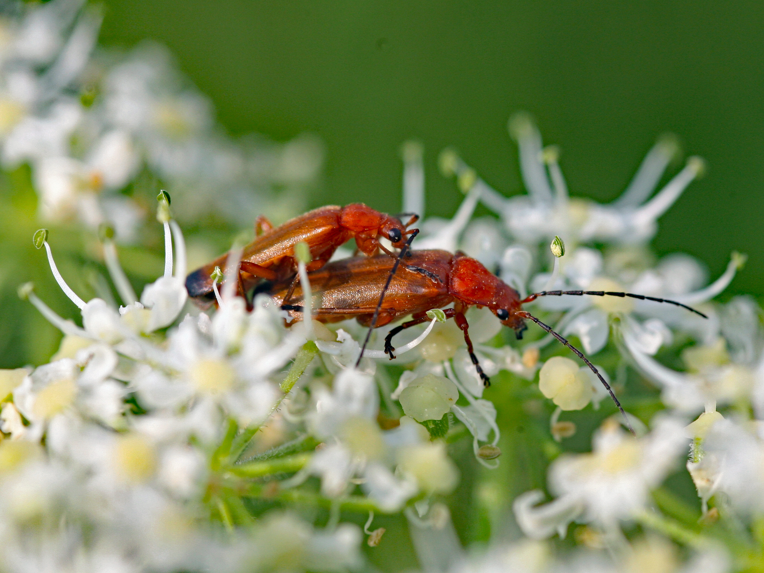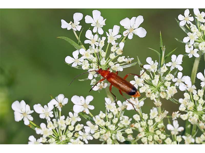 vier Exemplare mit Oxythyrea funesta (Poda, 1761) - Trauer-Rosenkäfer auf Wilder Möhre, Westlausitz, Nordhang Hutberg, Kamenz, 19.07.2020