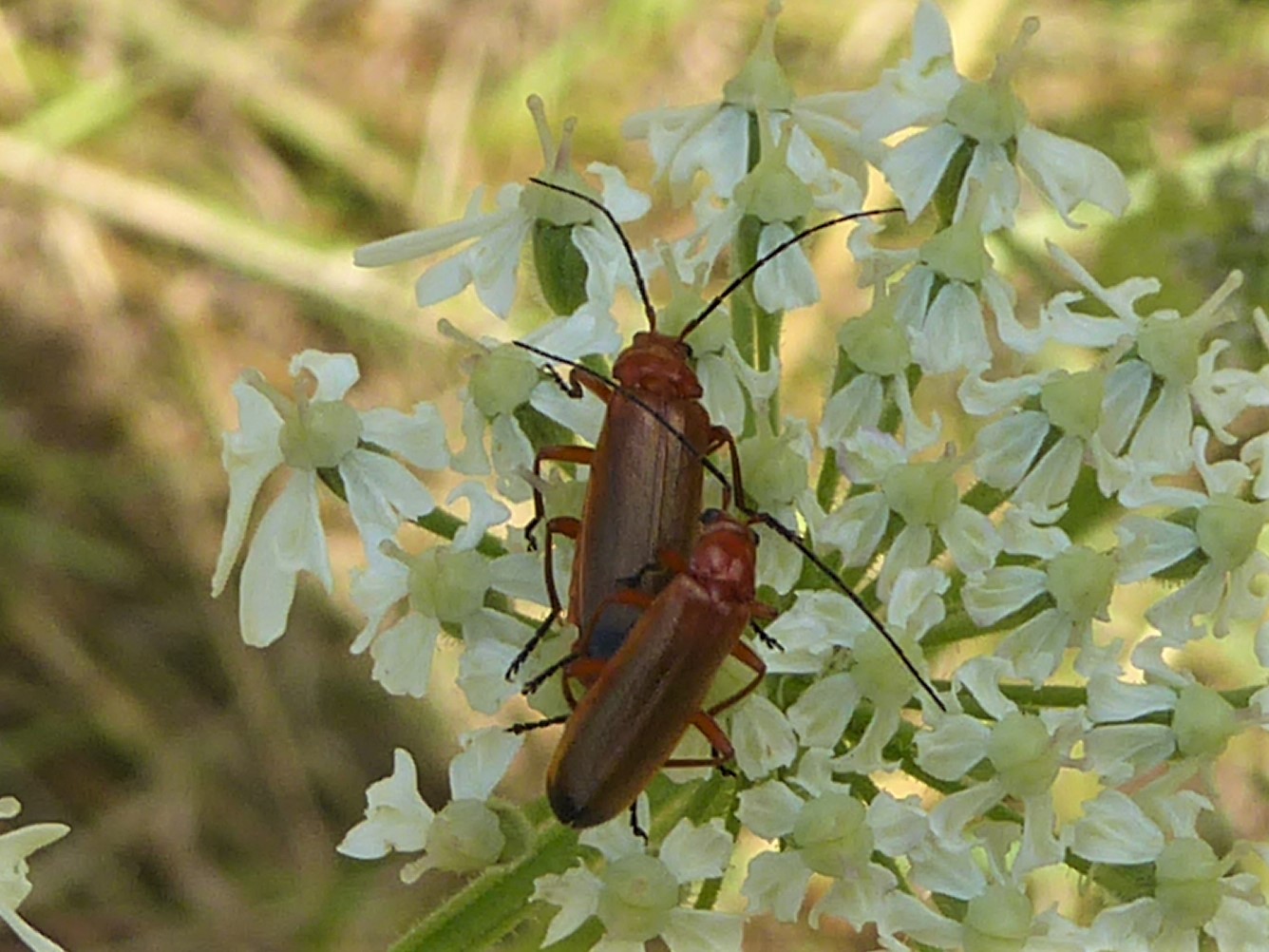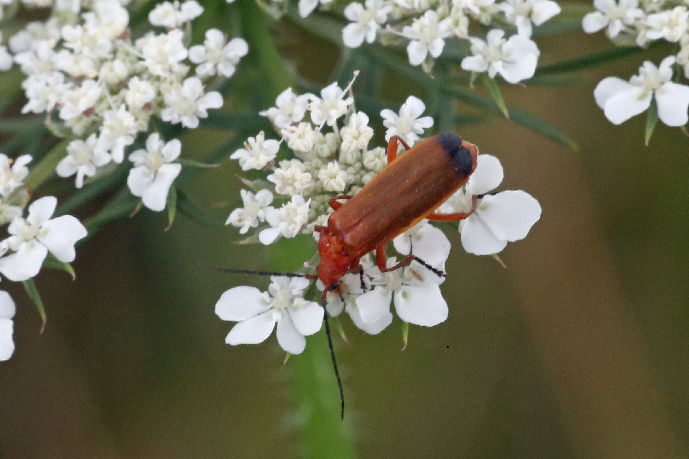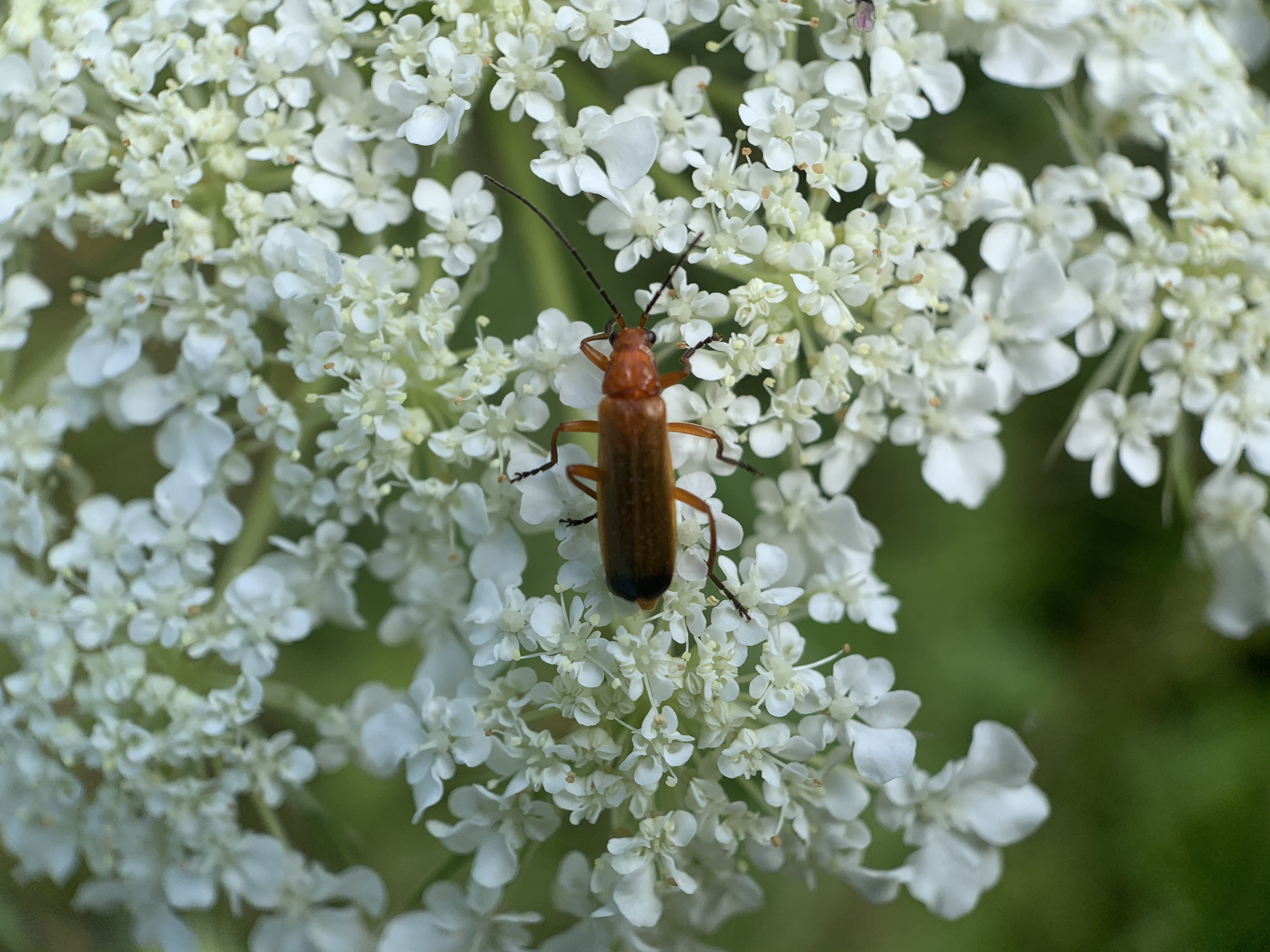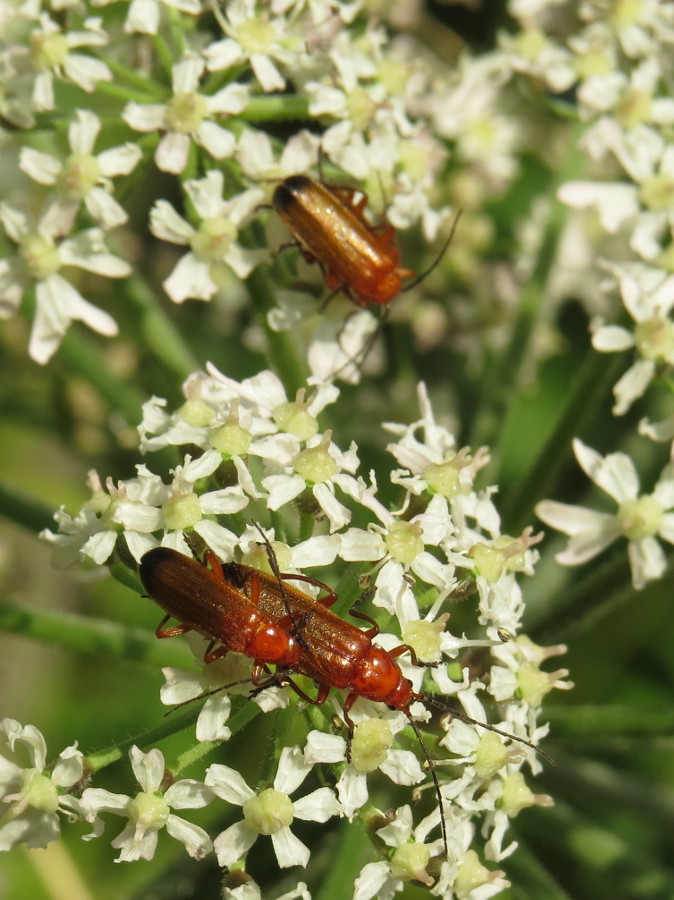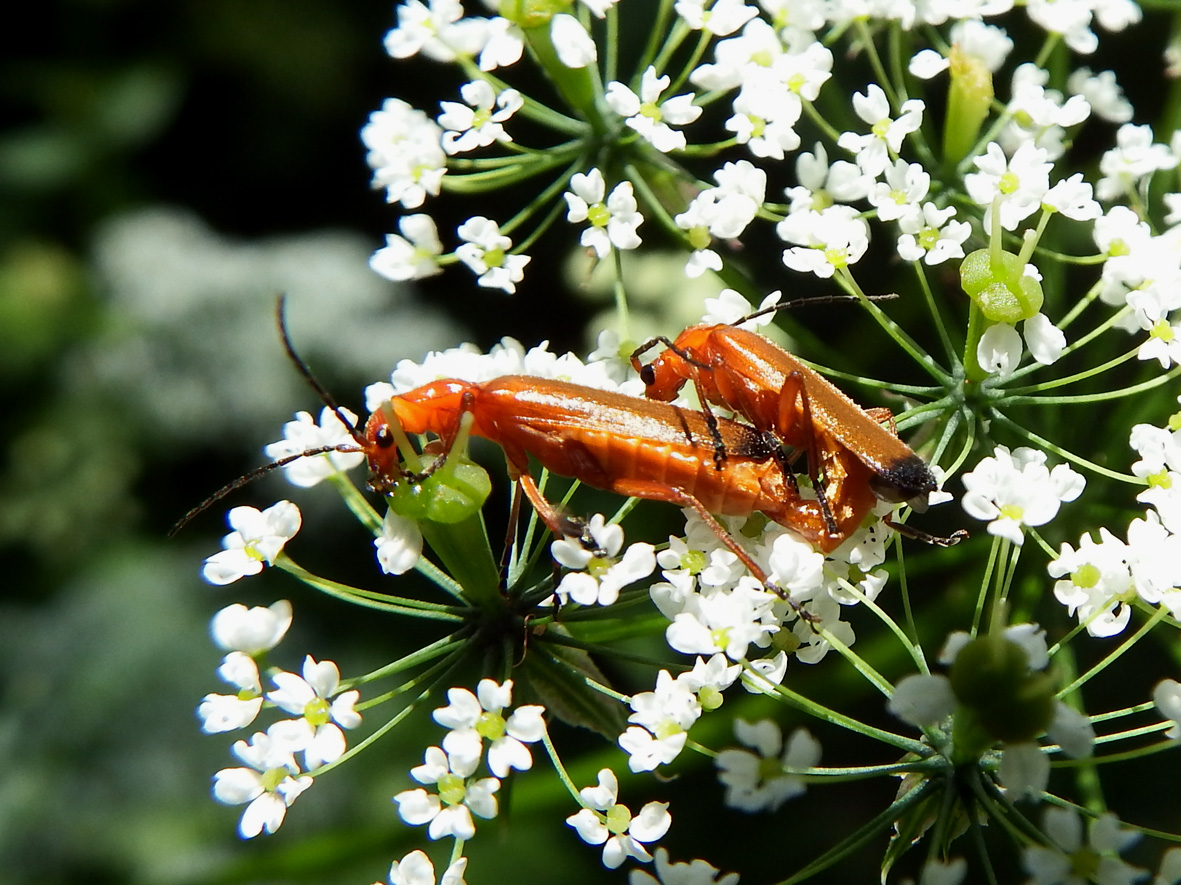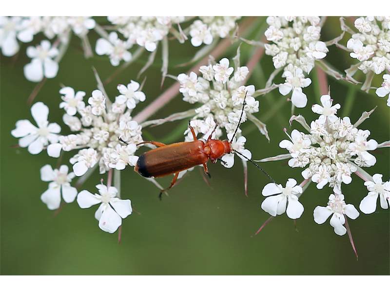 vier Exemplare mit Oxythyrea funesta (Poda, 1761) - Trauer-Rosenkäfer auf Wilder Möhre, Westlausitz, Nordhang Hutberg, Kamenz, 19.07.2020