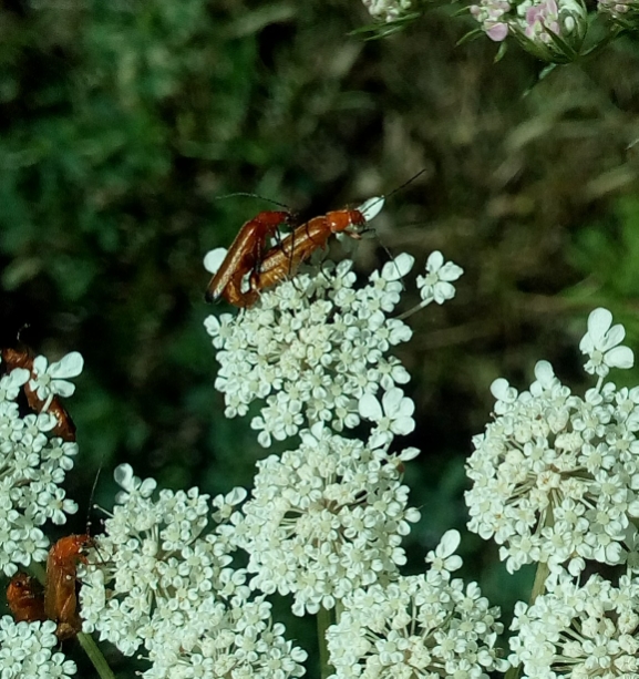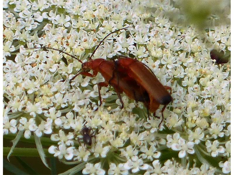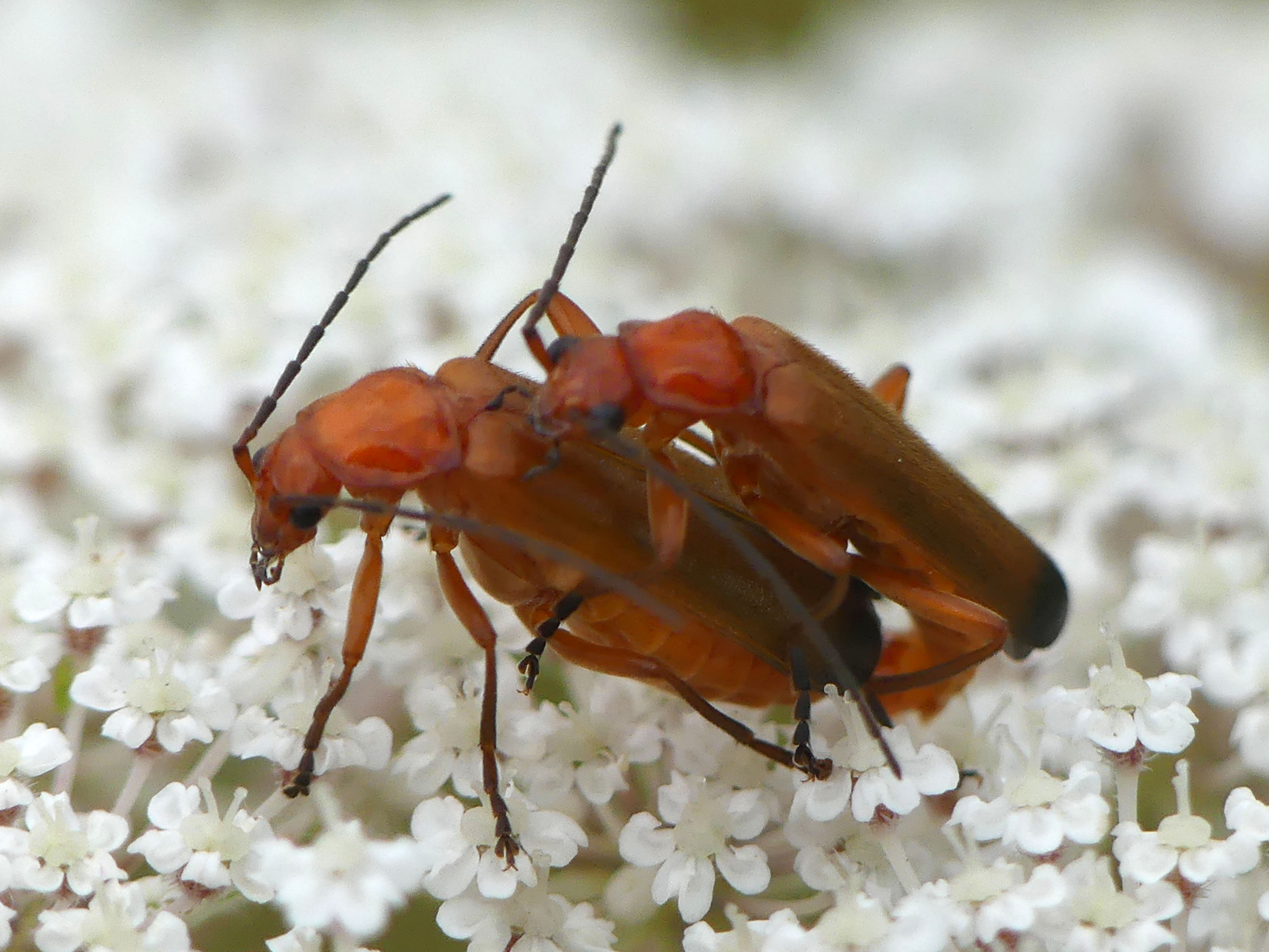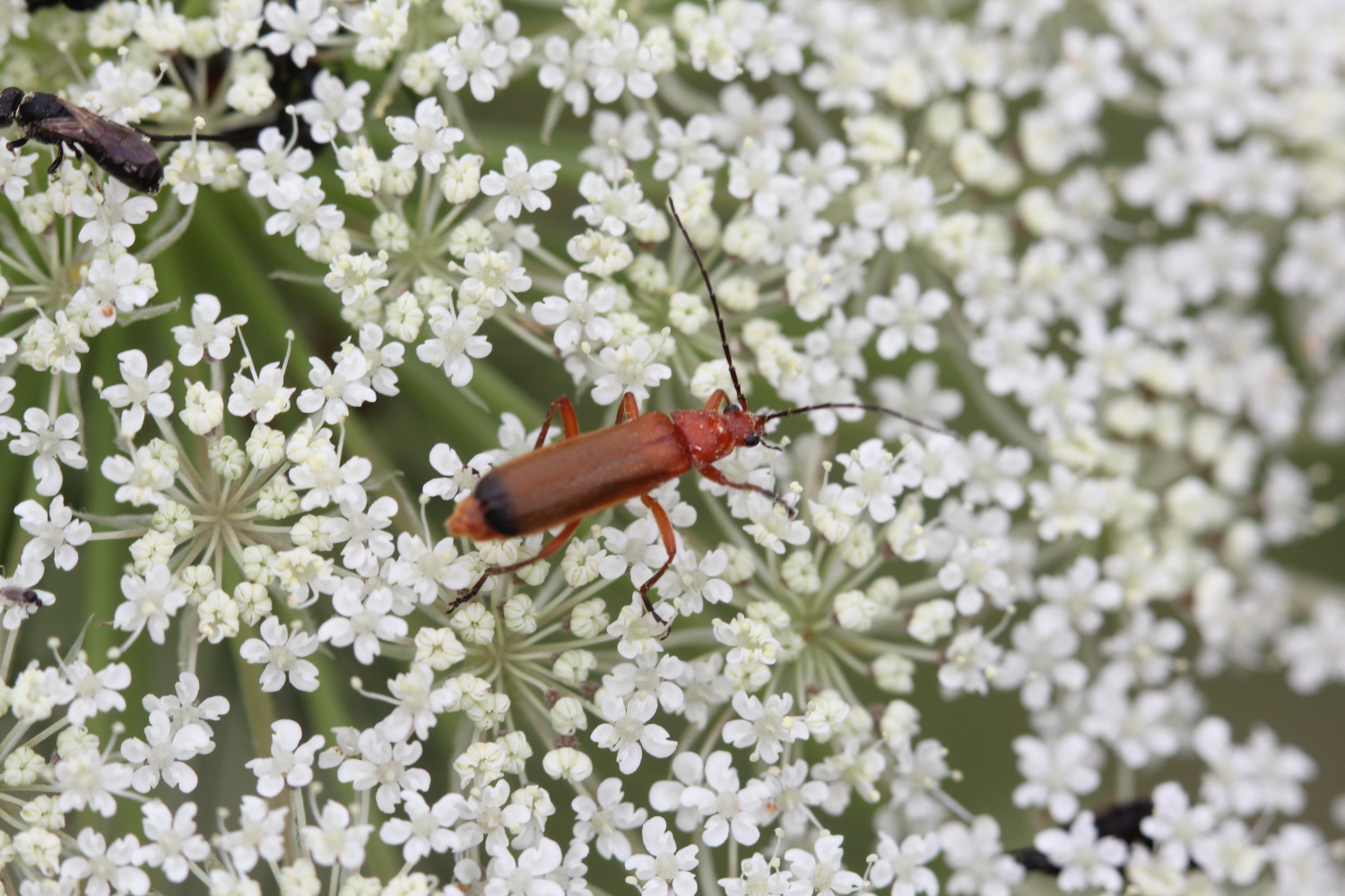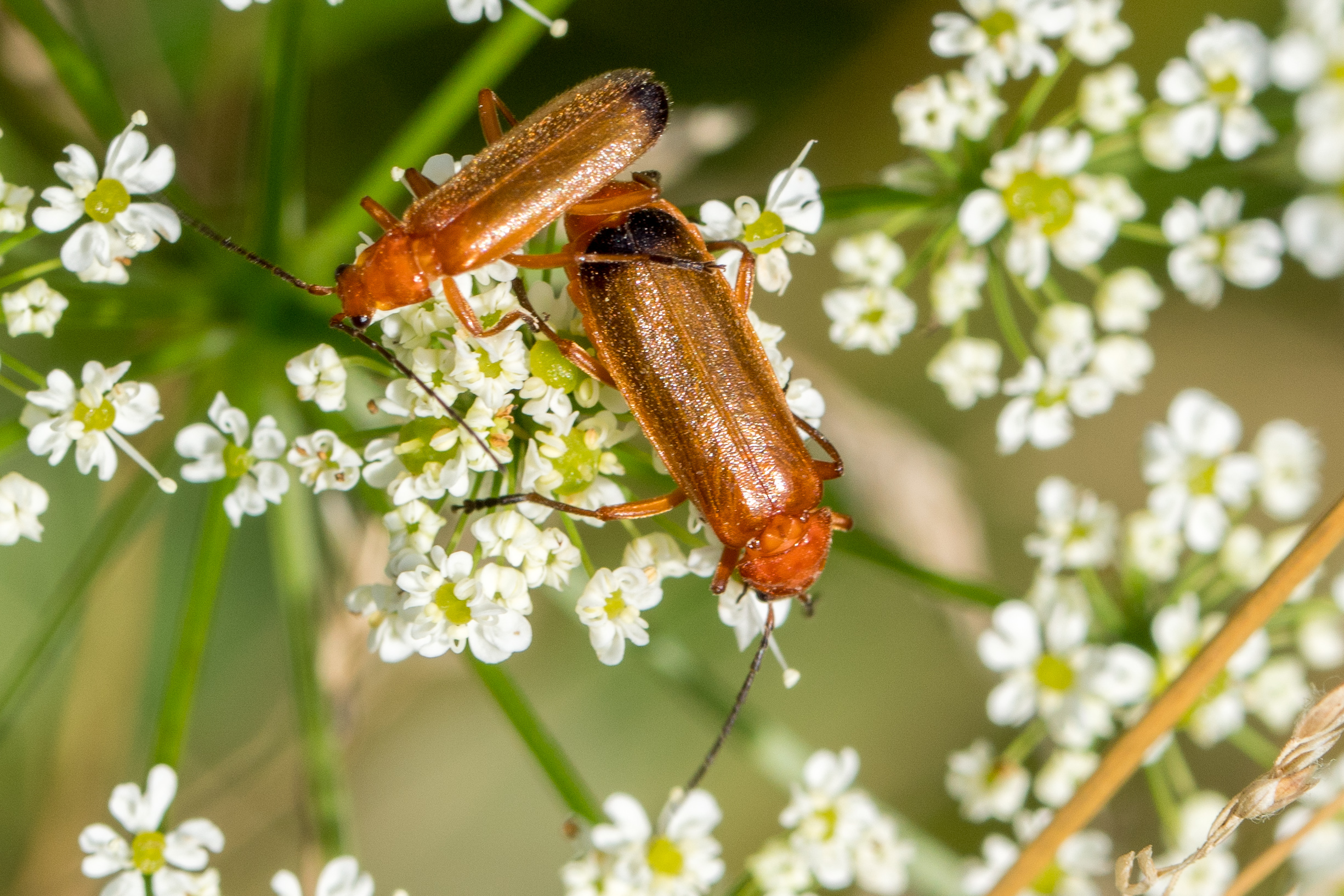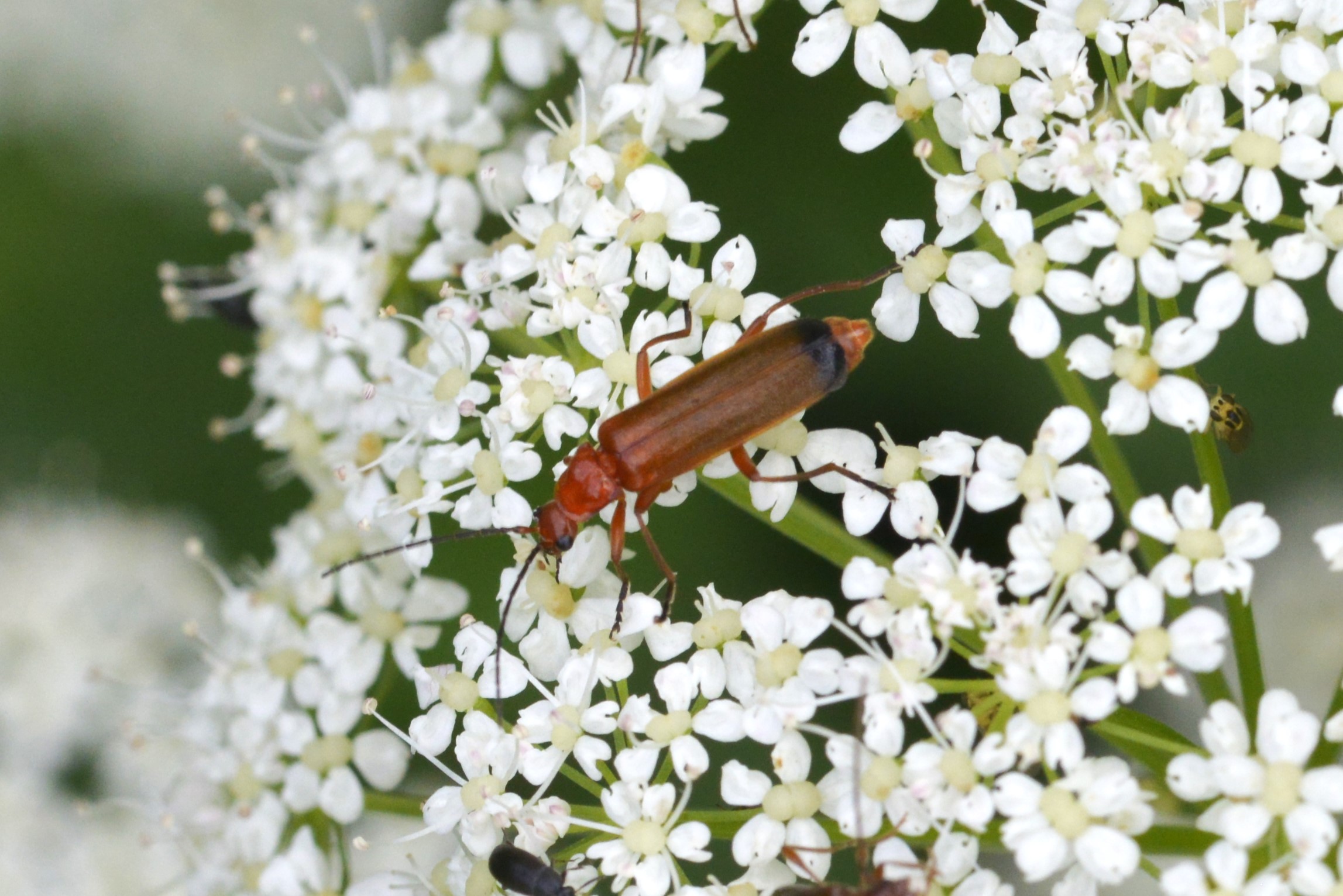 vier Exemplare mit Oxythyrea funesta (Poda, 1761) - Trauer-Rosenkäfer auf Wilder Möhre, Westlausitz, Nordhang Hutberg, Kamenz, 19.07.2020