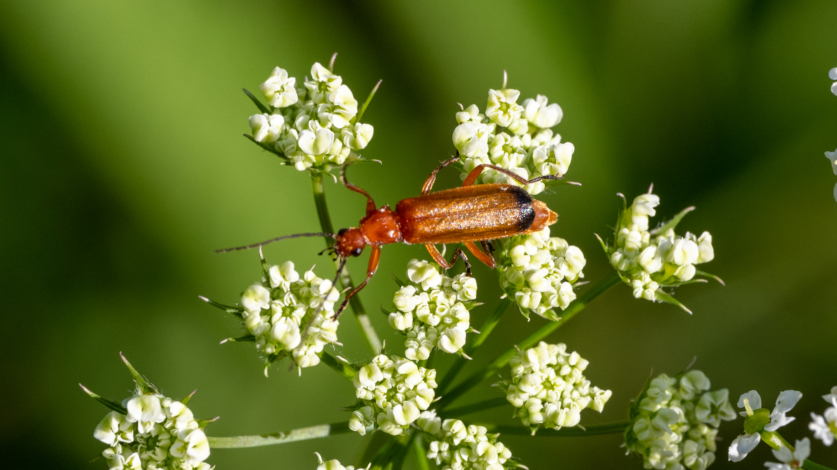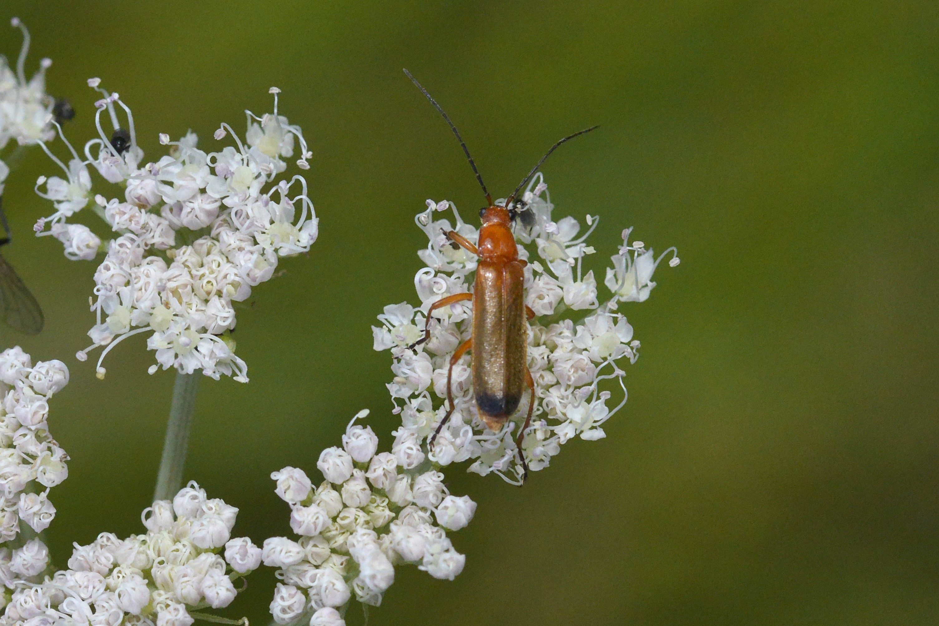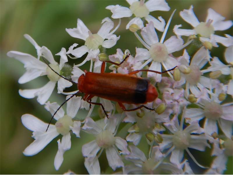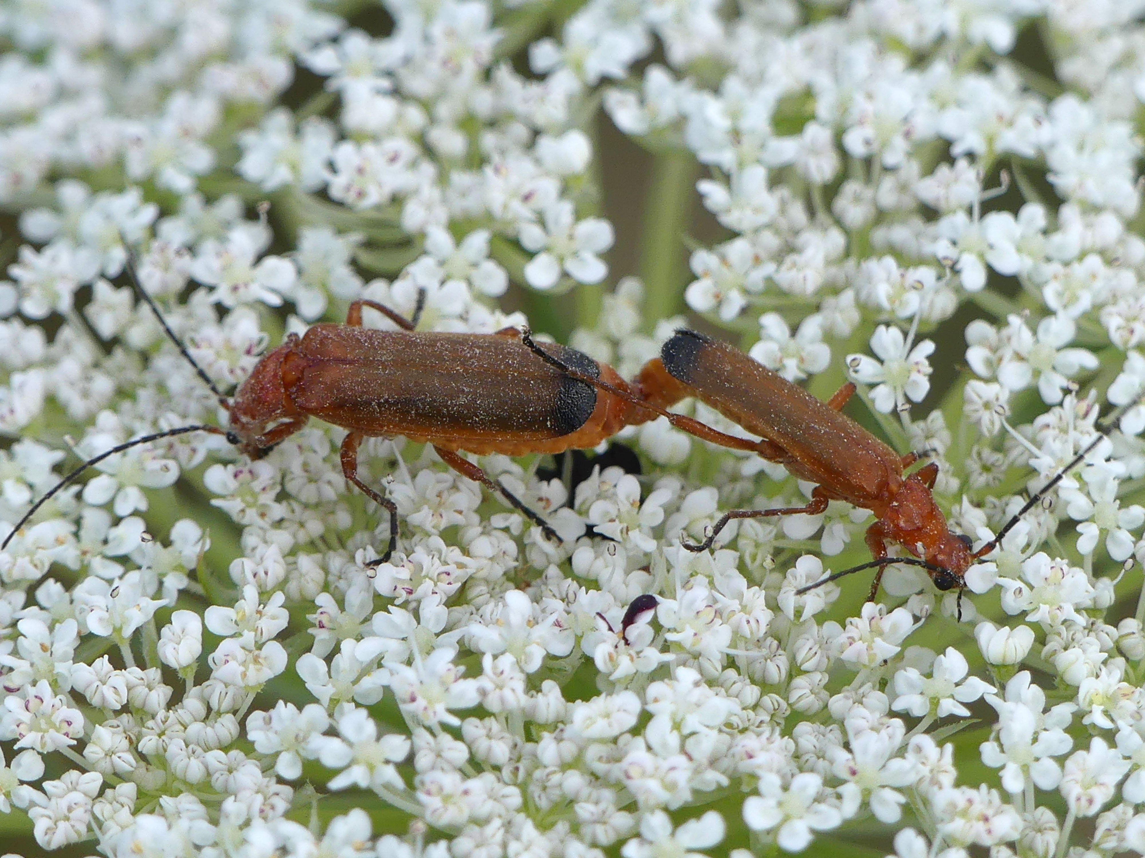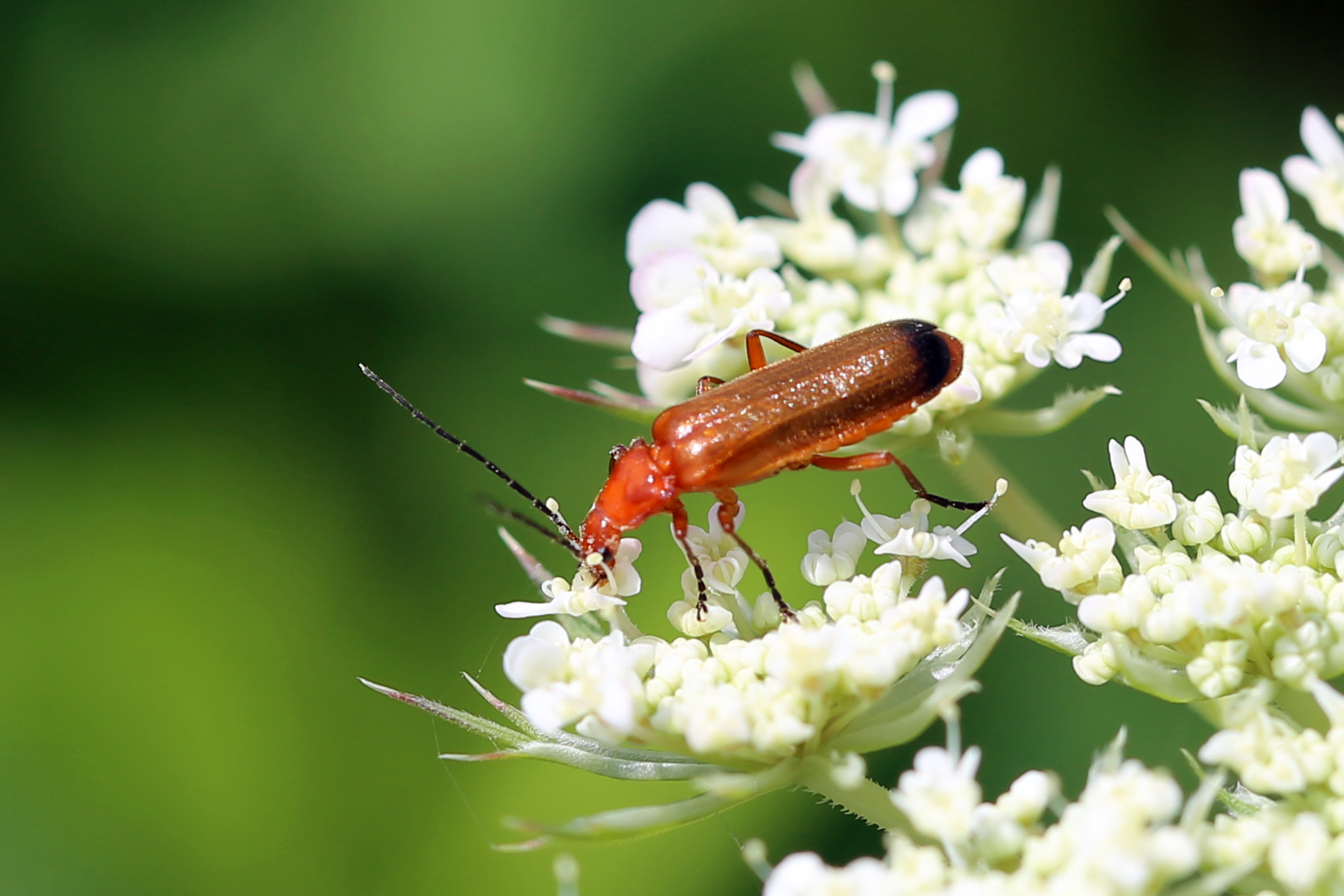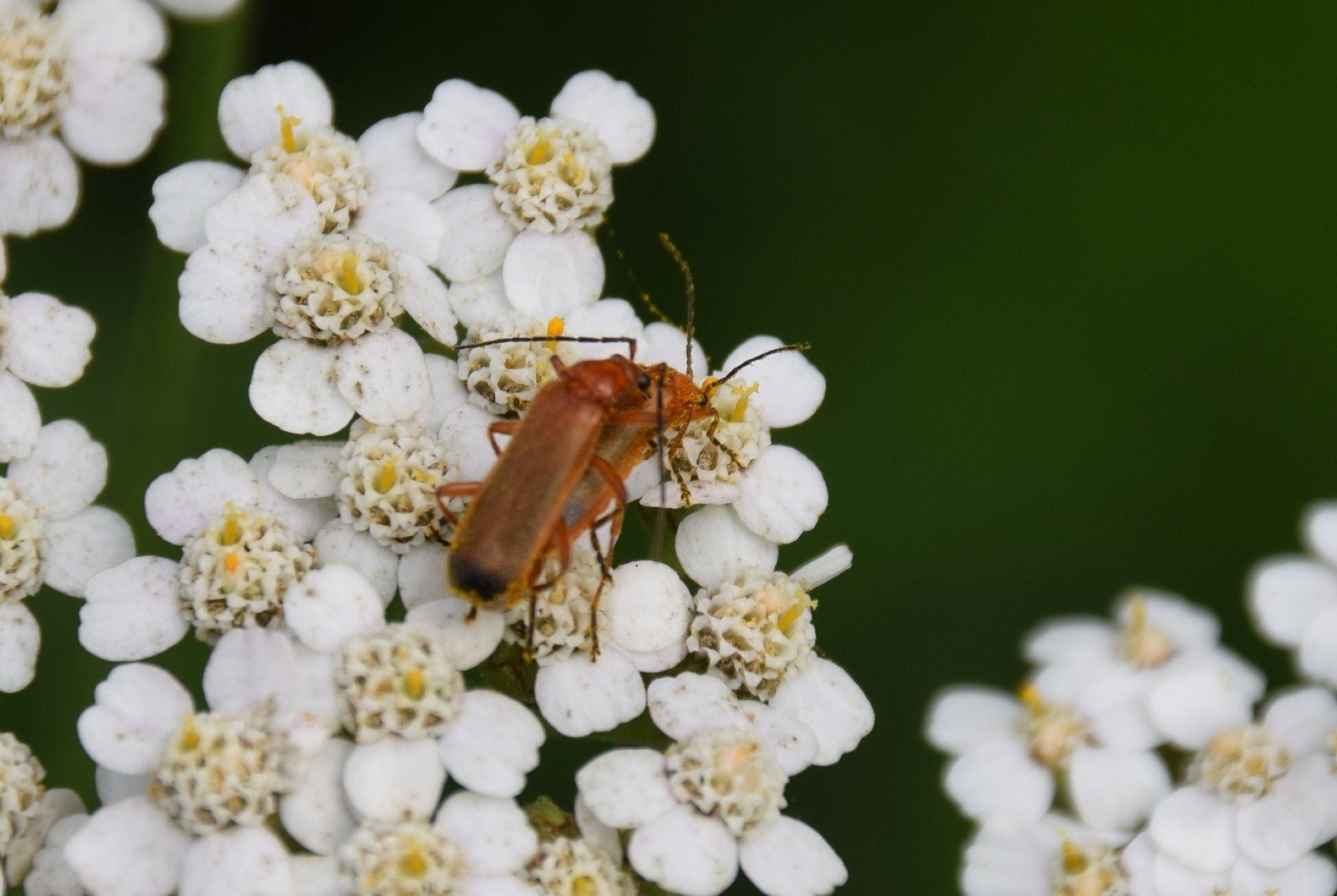 vier Exemplare mit Oxythyrea funesta (Poda, 1761) - Trauer-Rosenkäfer auf Wilder Möhre, Westlausitz, Nordhang Hutberg, Kamenz, 19.07.2020