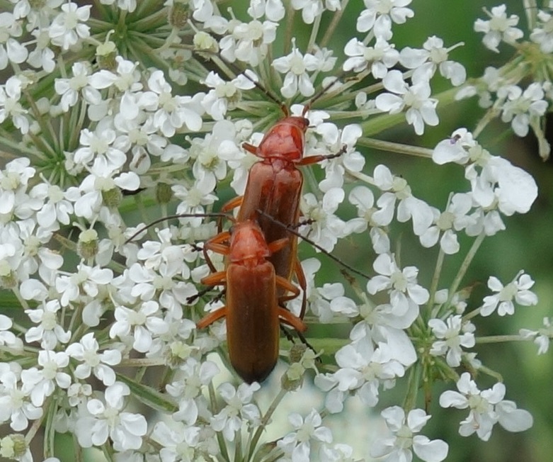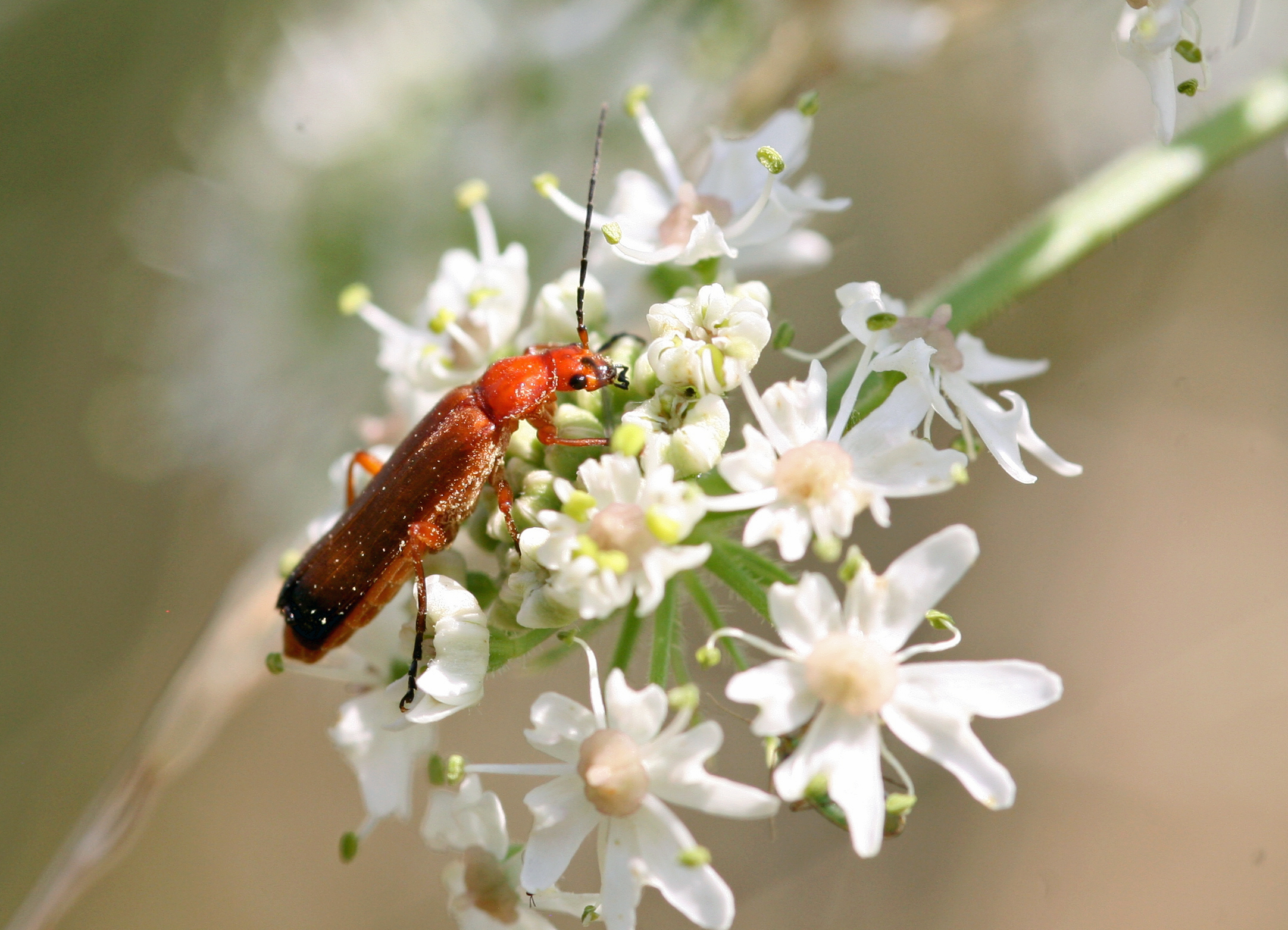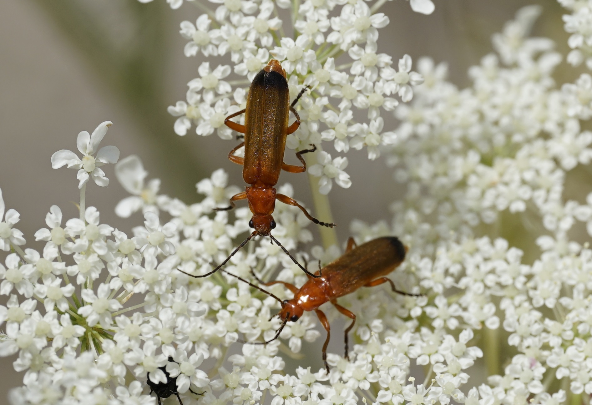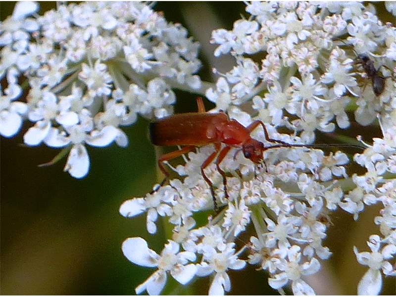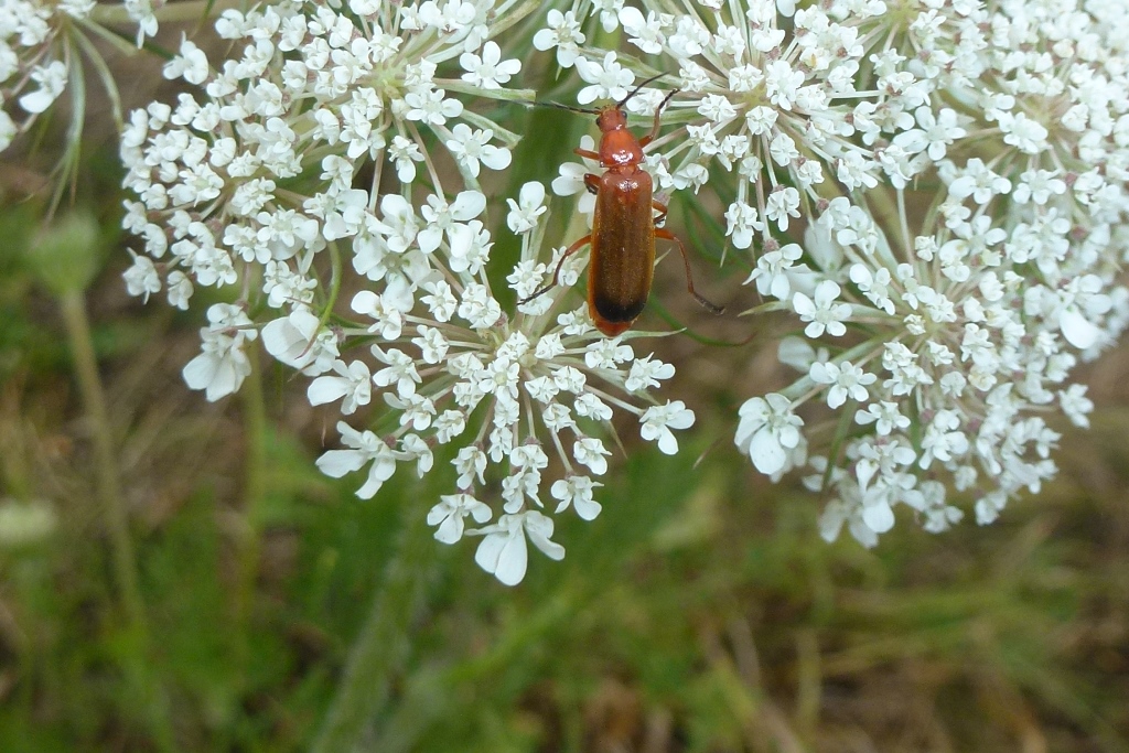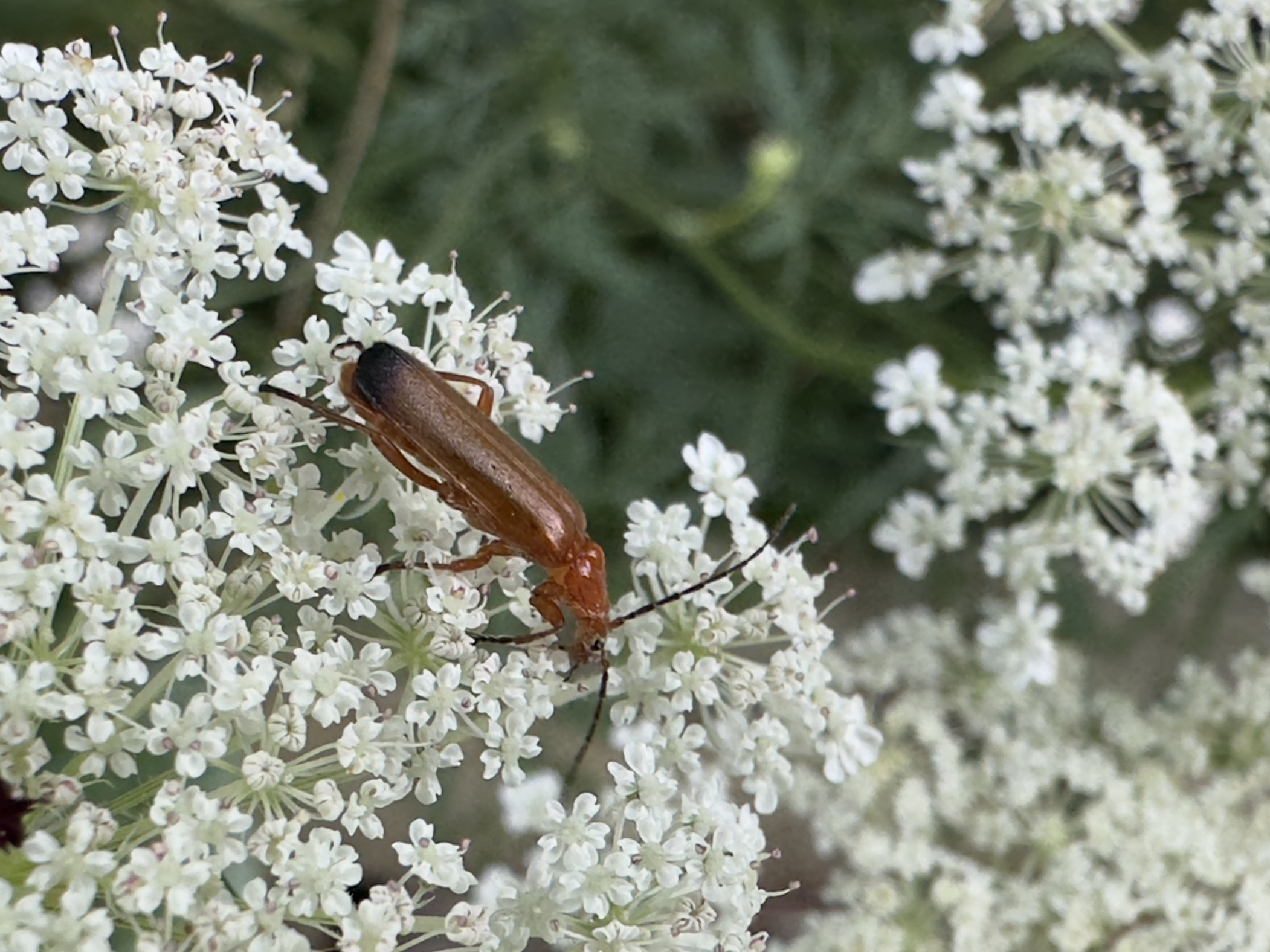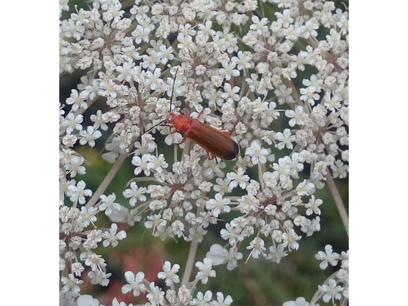 vier Exemplare mit Oxythyrea funesta (Poda, 1761) - Trauer-Rosenkäfer auf Wilder Möhre, Westlausitz, Nordhang Hutberg, Kamenz, 19.07.2020