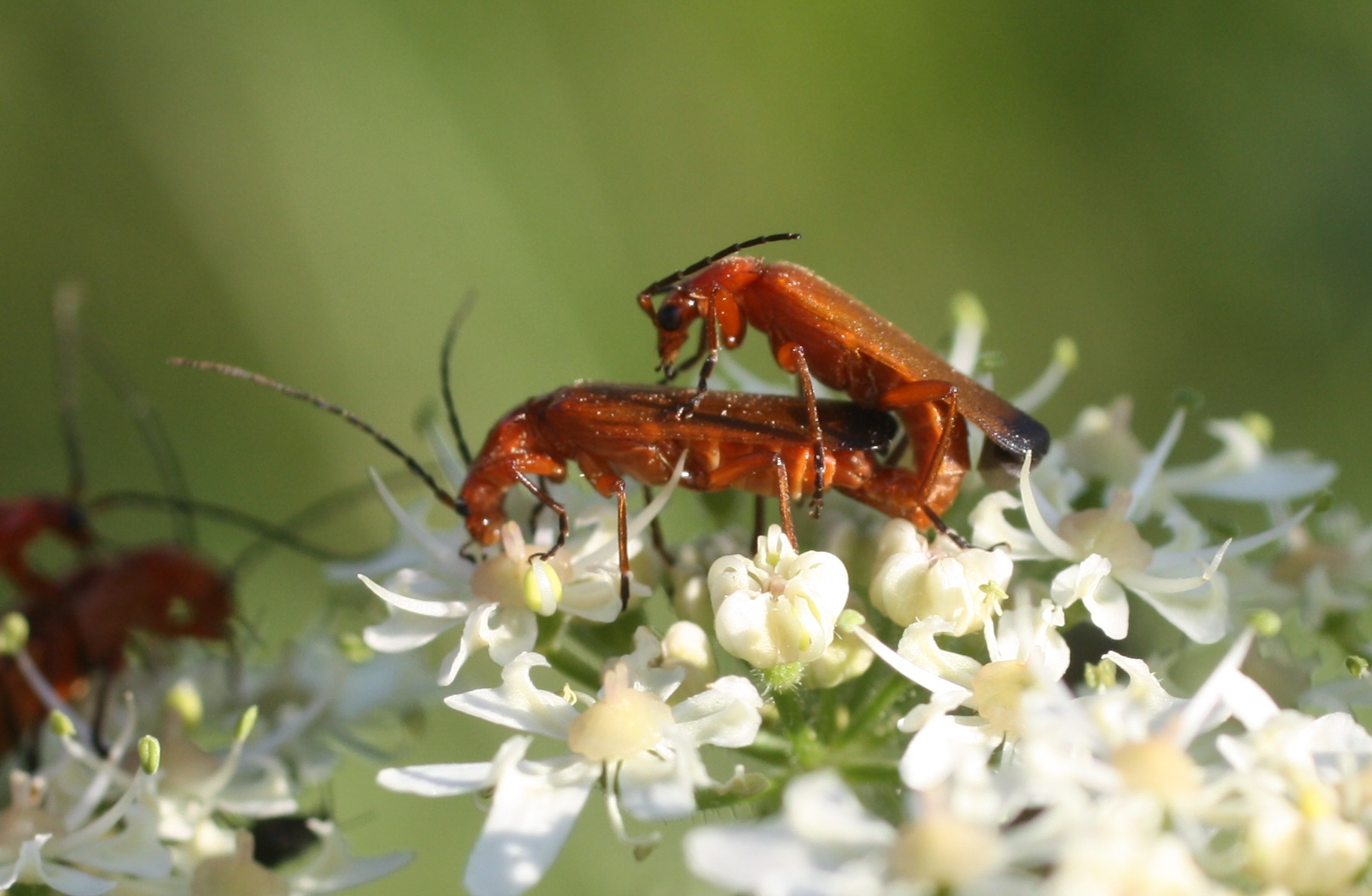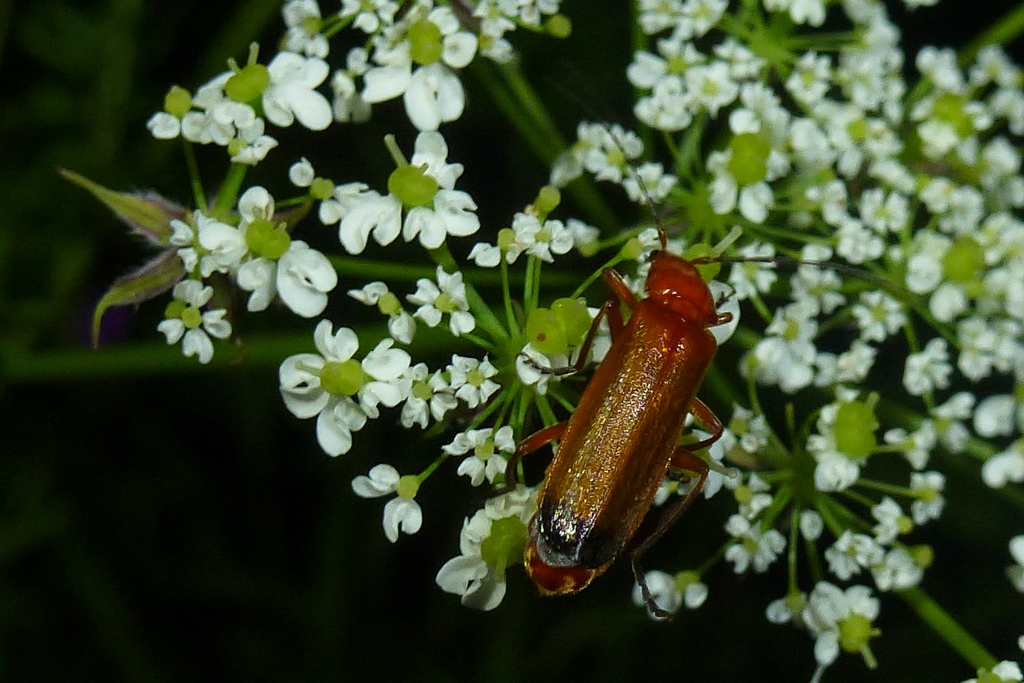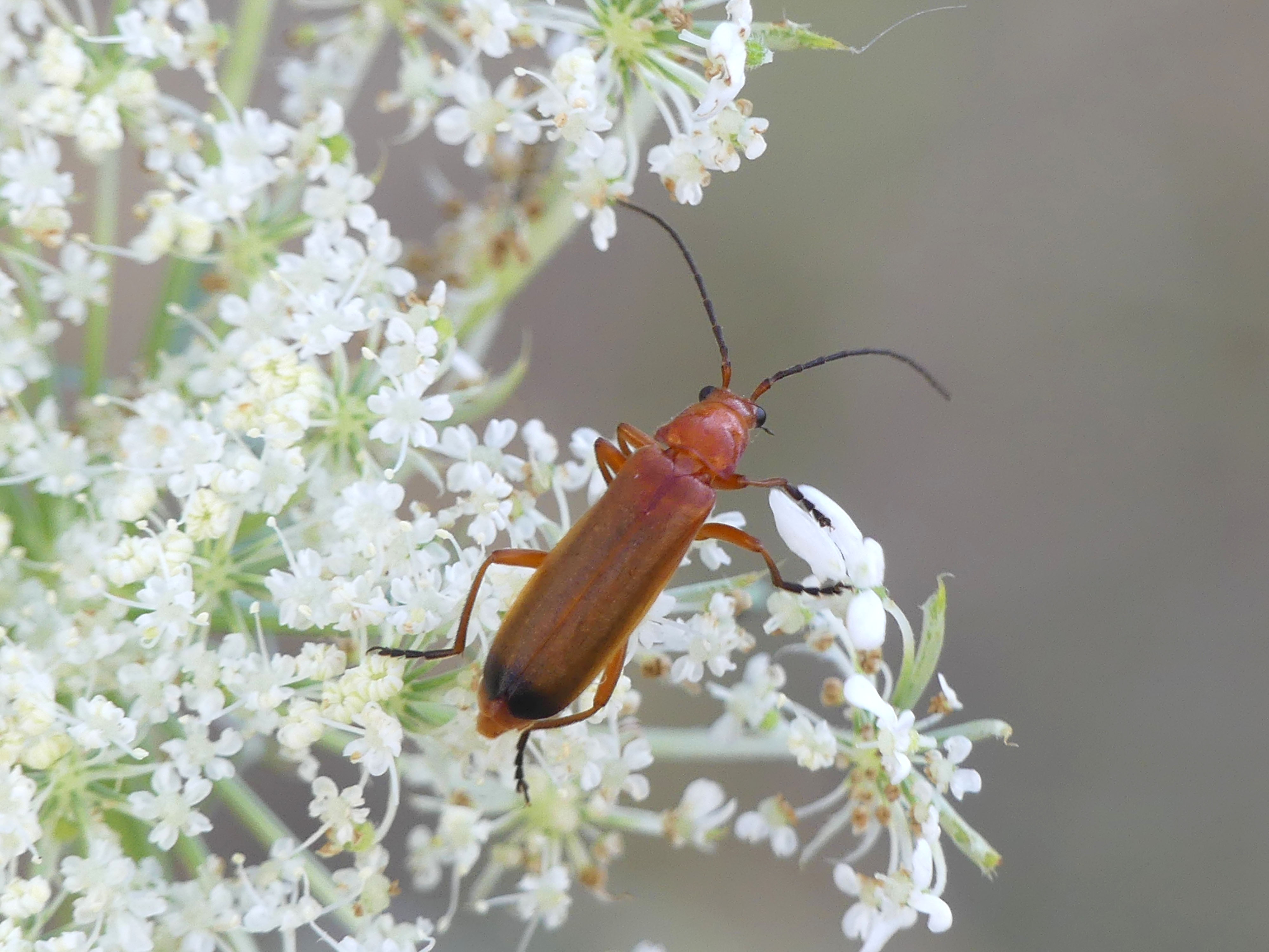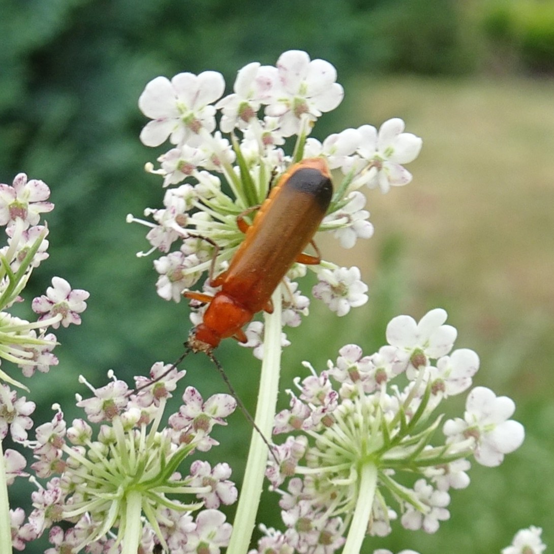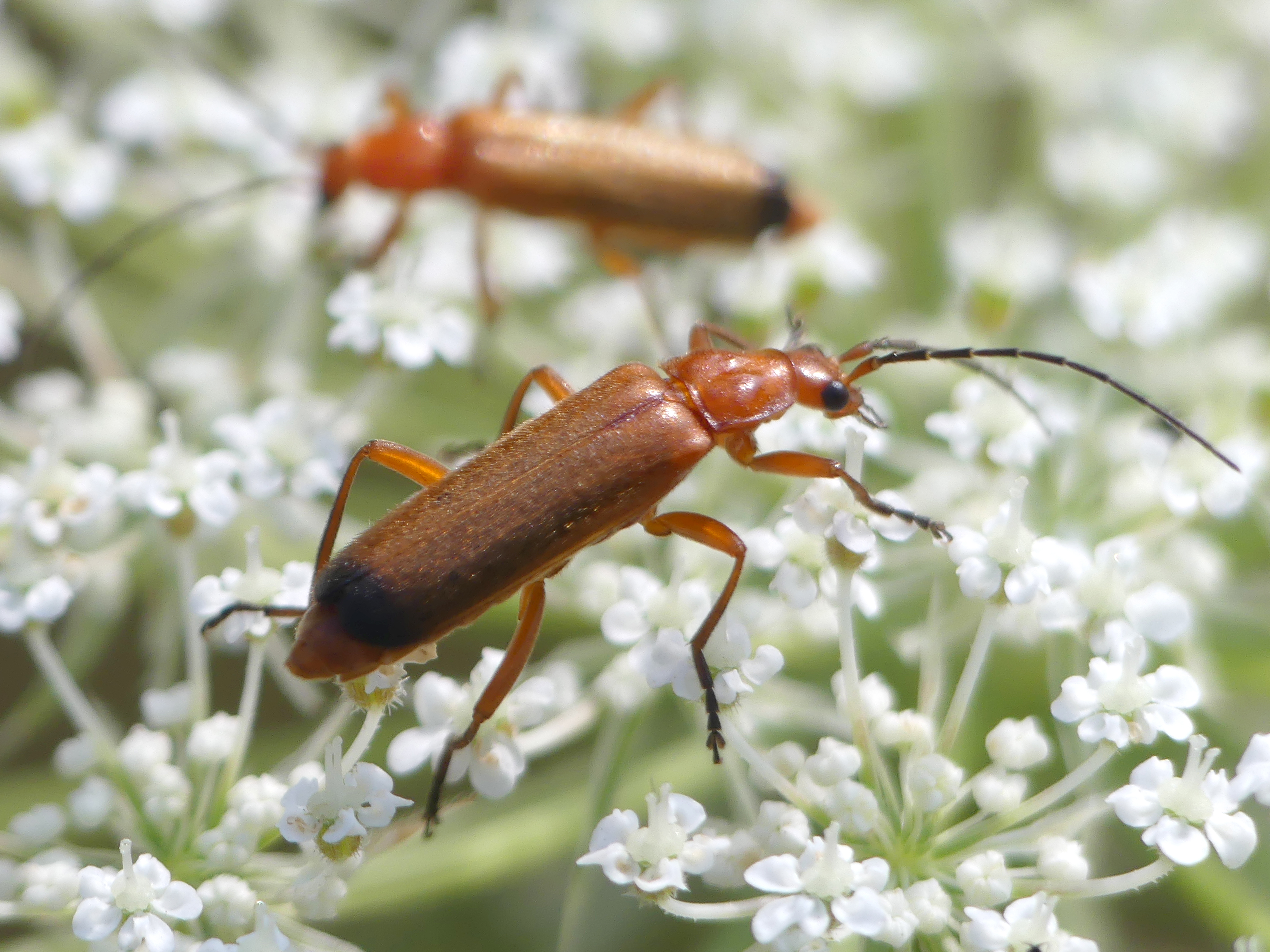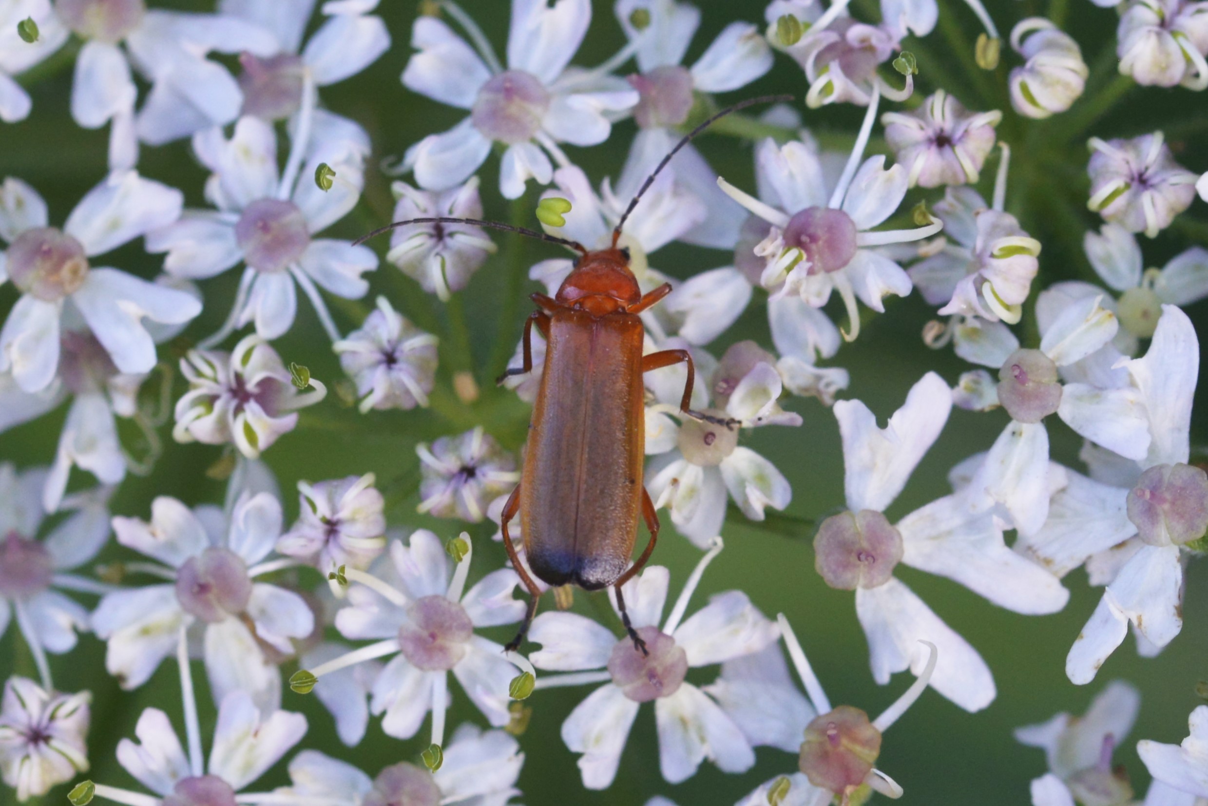 vier Exemplare mit Oxythyrea funesta (Poda, 1761) - Trauer-Rosenkäfer auf Wilder Möhre, Westlausitz, Nordhang Hutberg, Kamenz, 19.07.2020