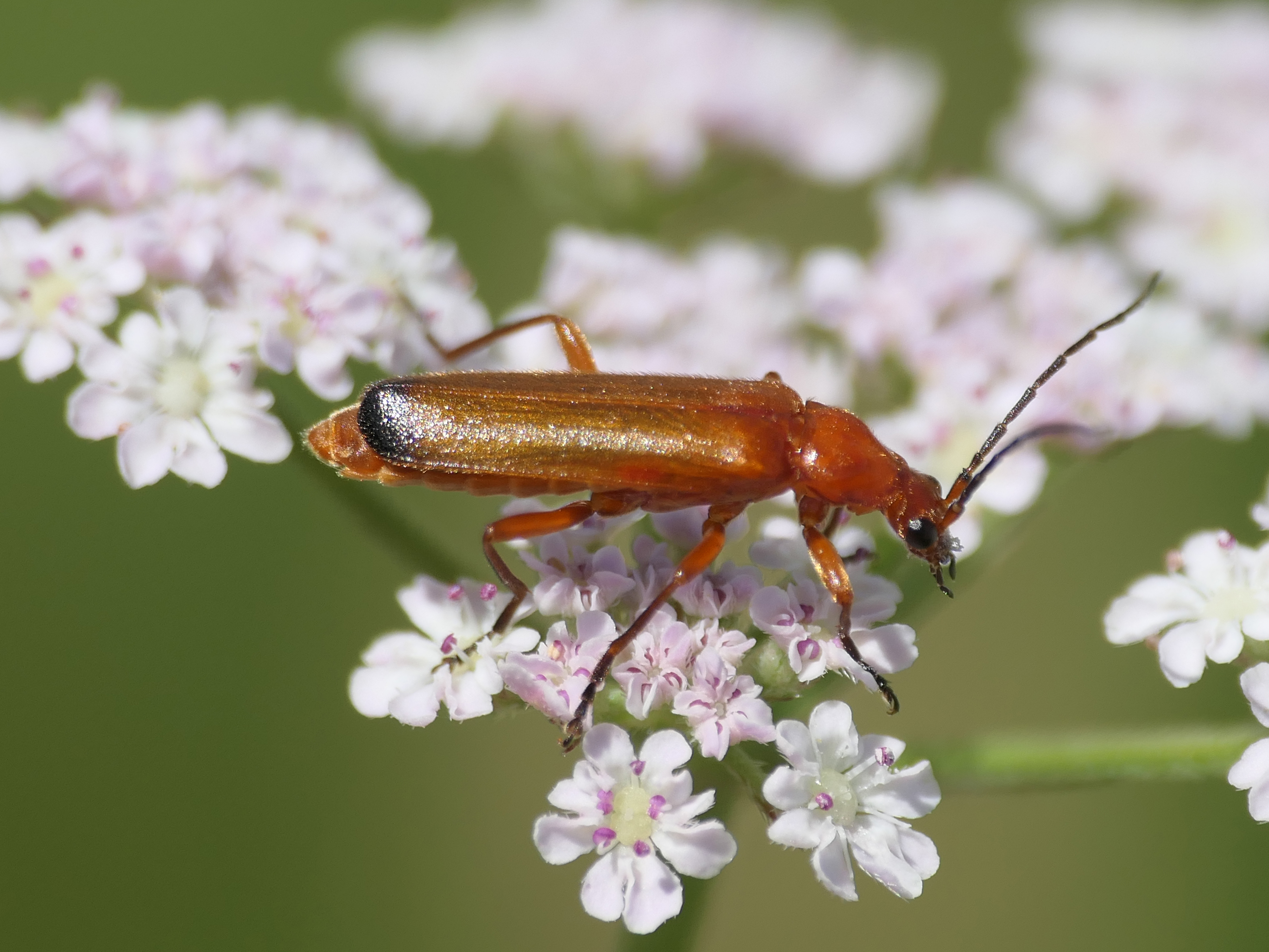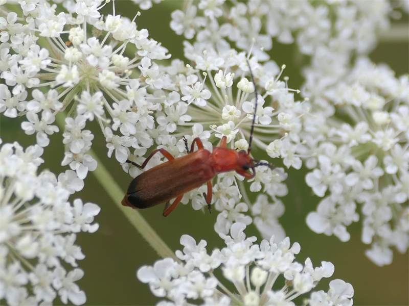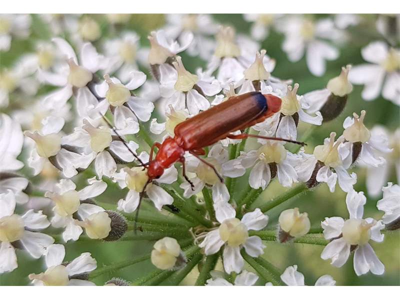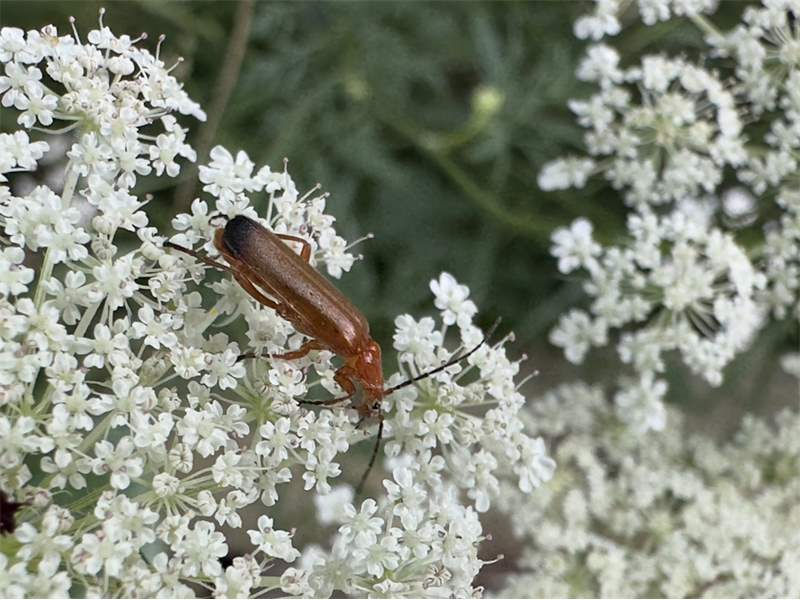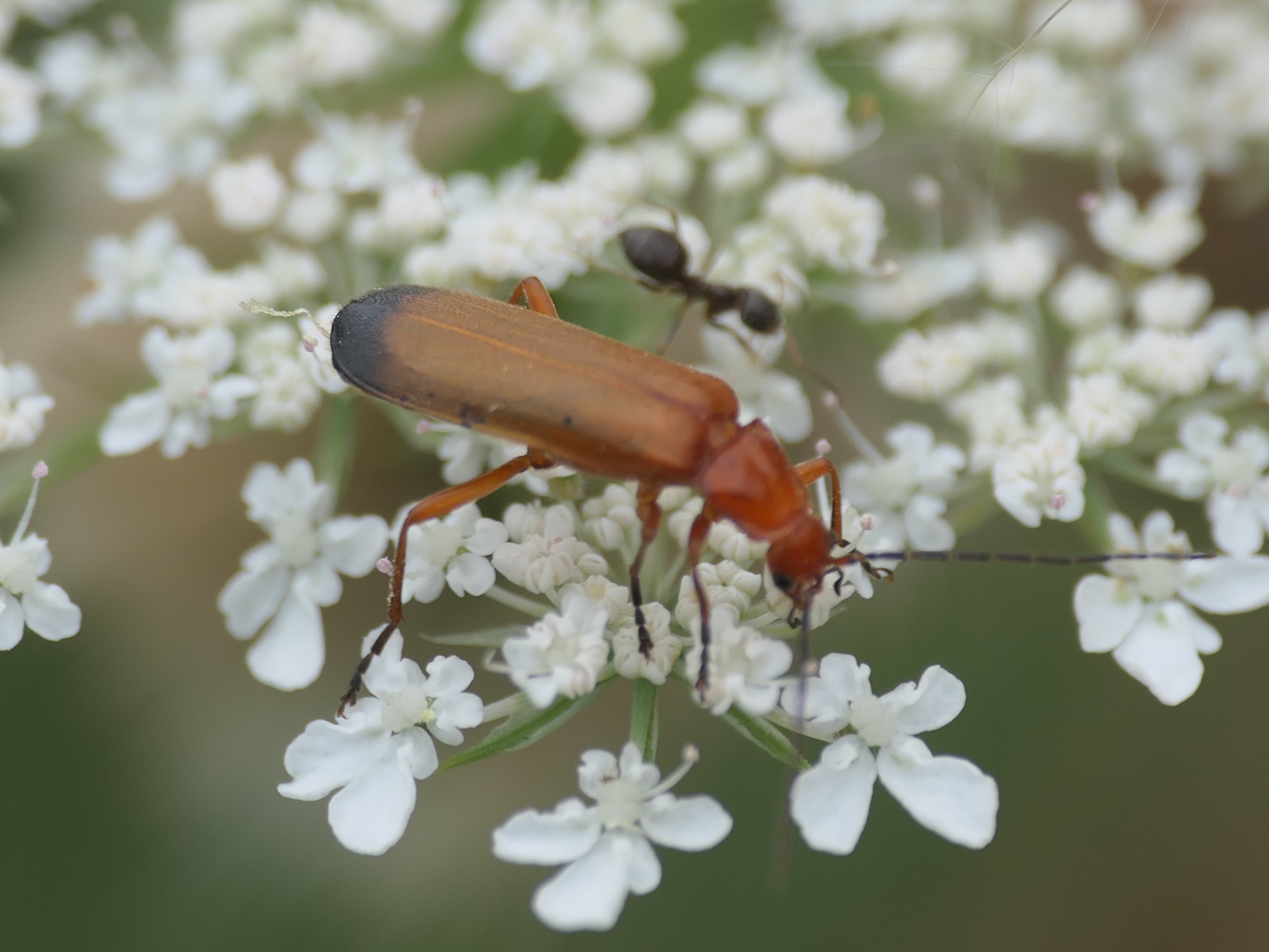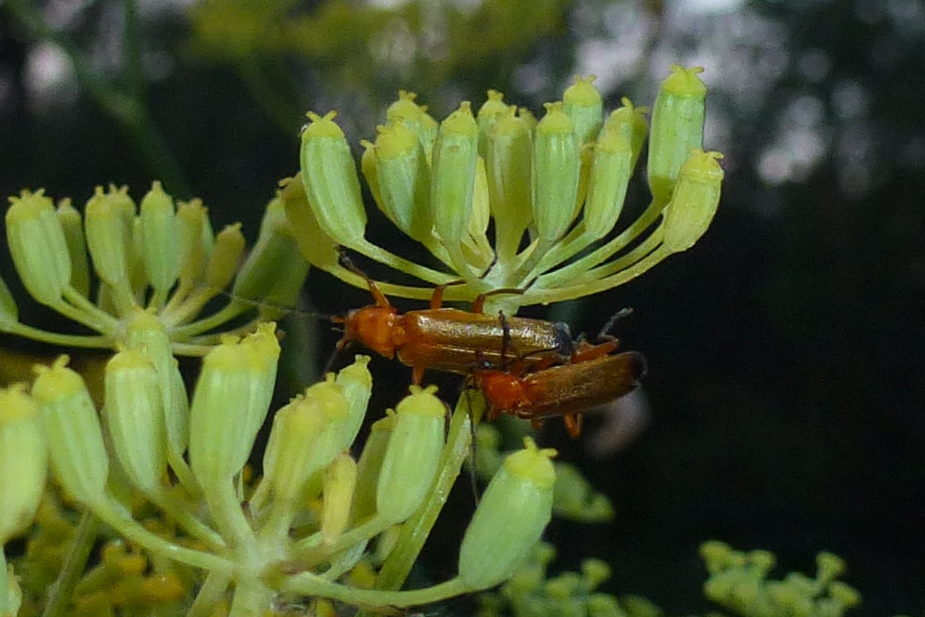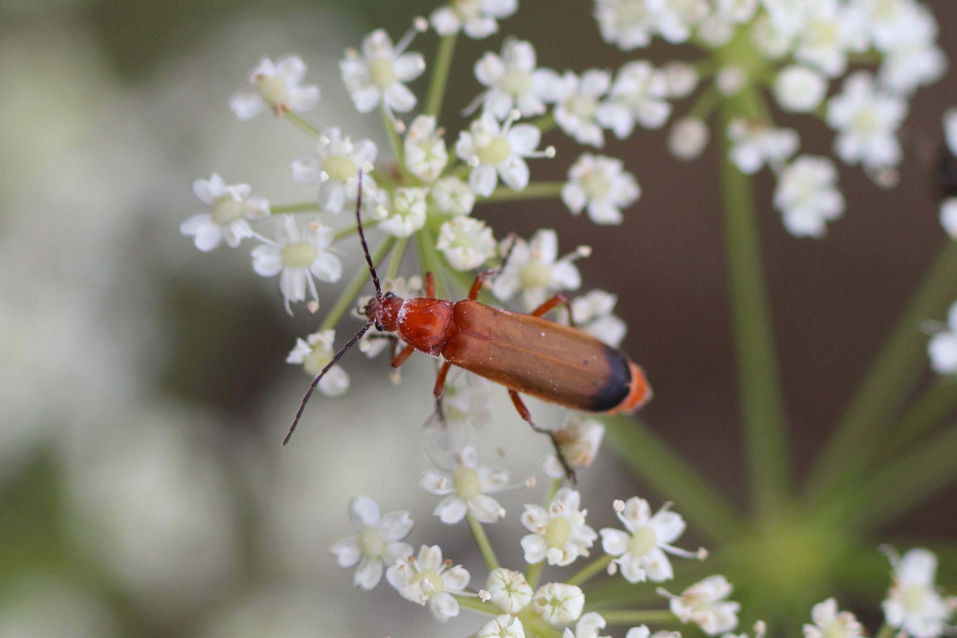 vier Exemplare mit Oxythyrea funesta (Poda, 1761) - Trauer-Rosenkäfer auf Wilder Möhre, Westlausitz, Nordhang Hutberg, Kamenz, 19.07.2020