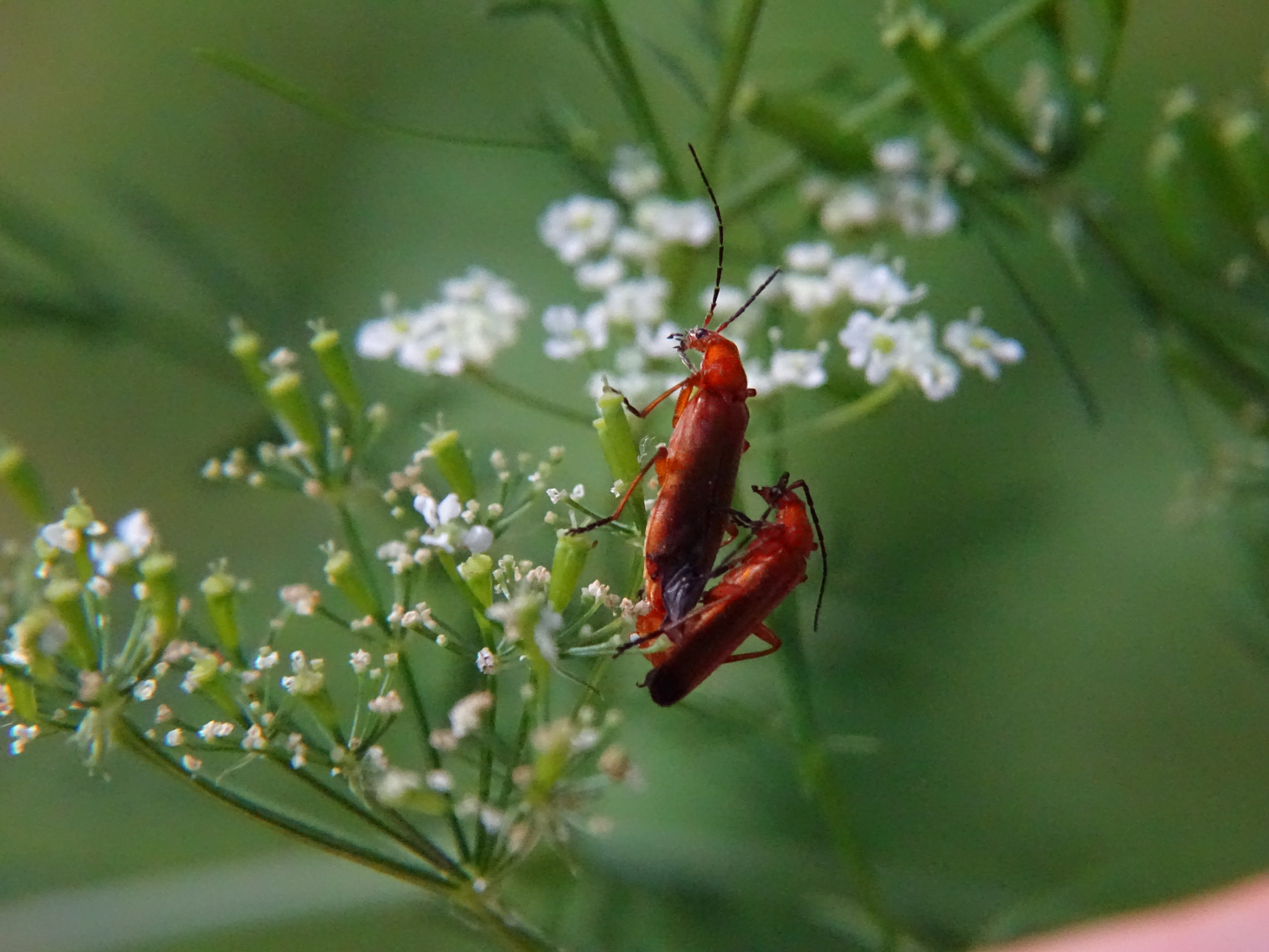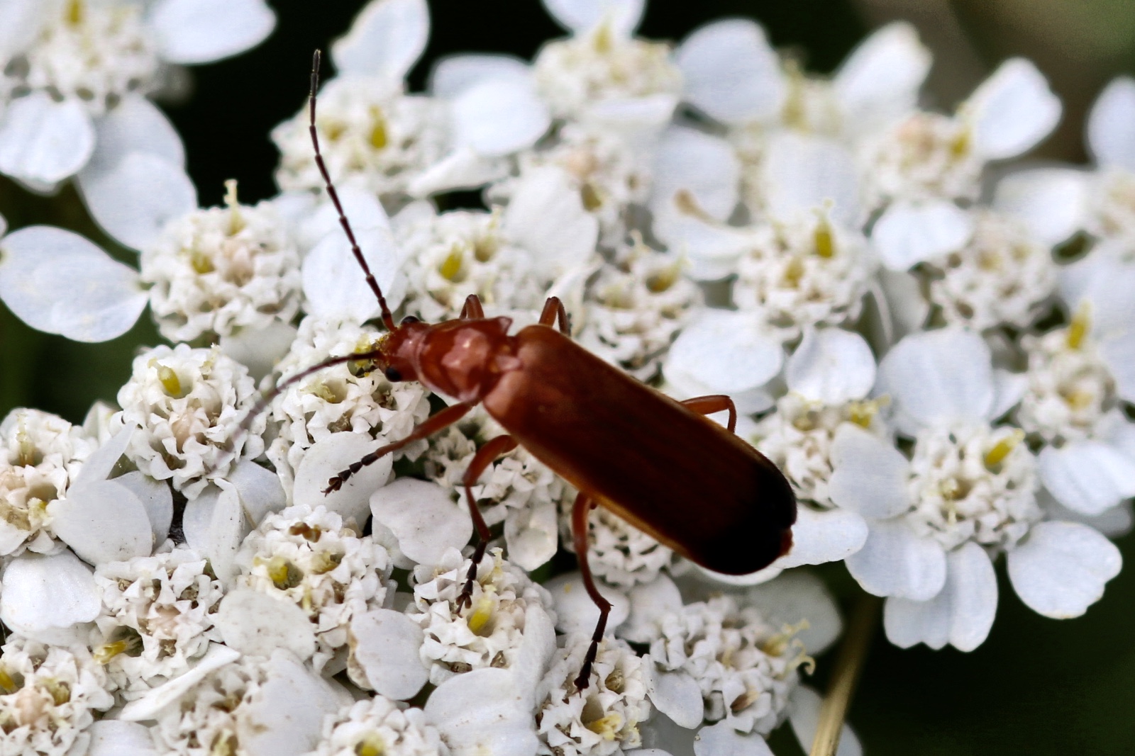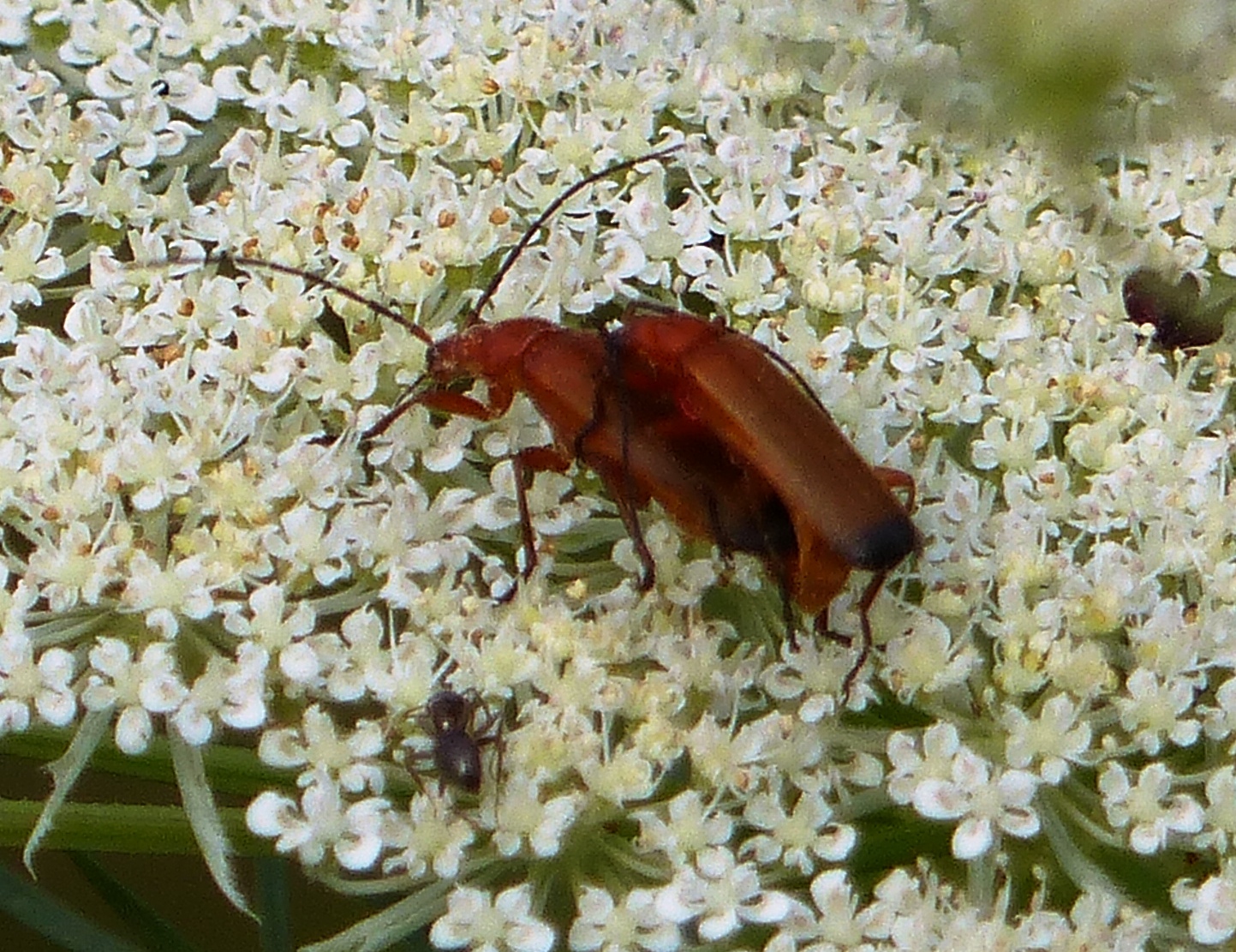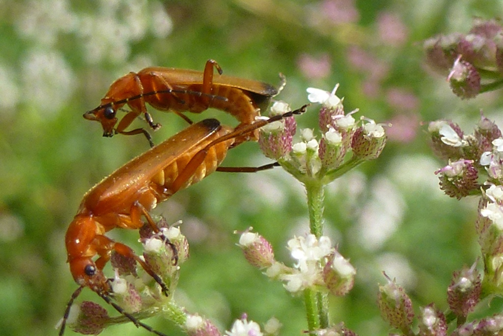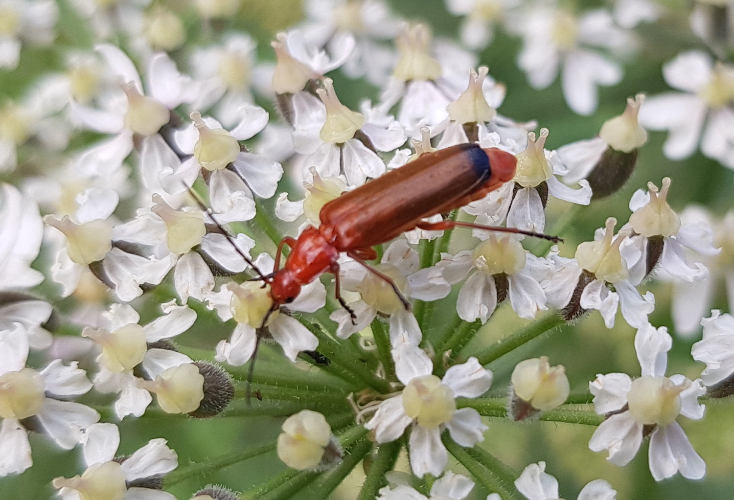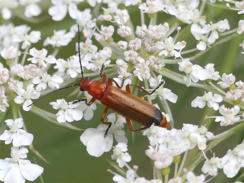 vier Exemplare mit Oxythyrea funesta (Poda, 1761) - Trauer-Rosenkäfer auf Wilder Möhre, Westlausitz, Nordhang Hutberg, Kamenz, 19.07.2020