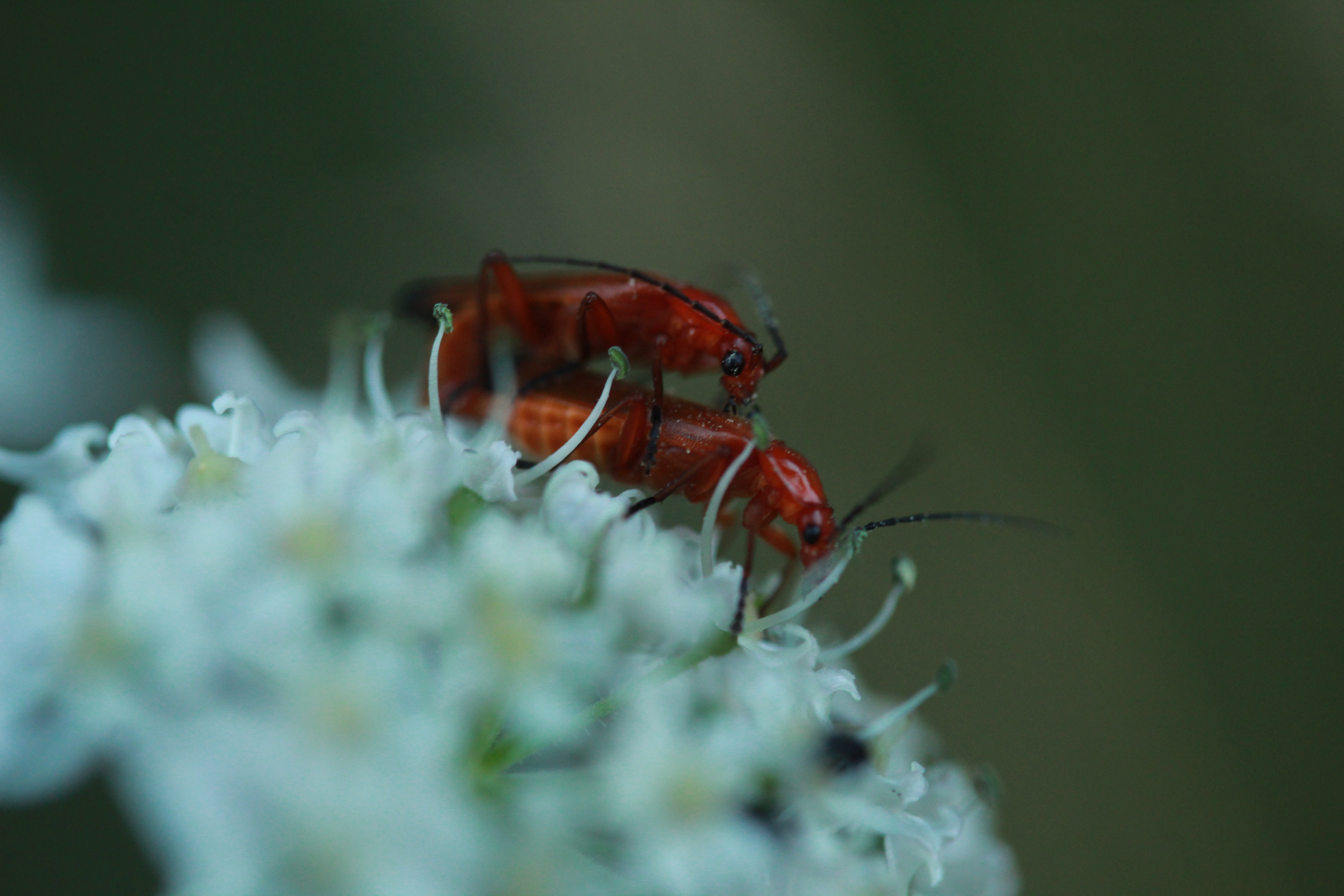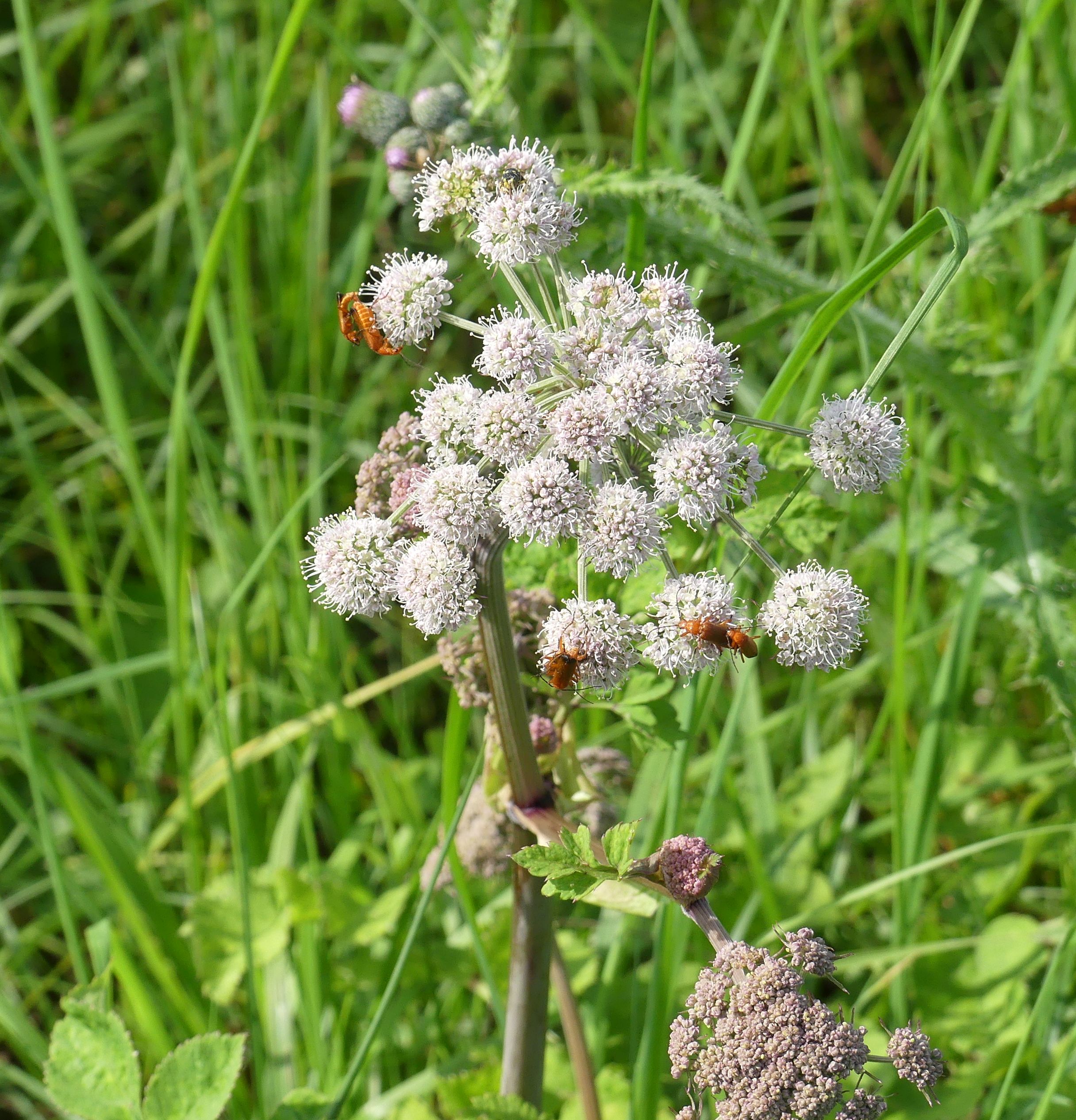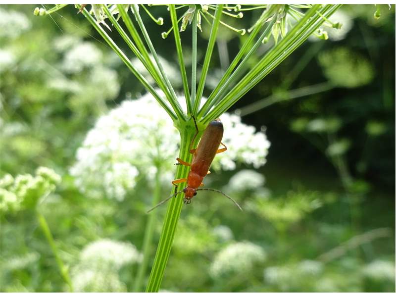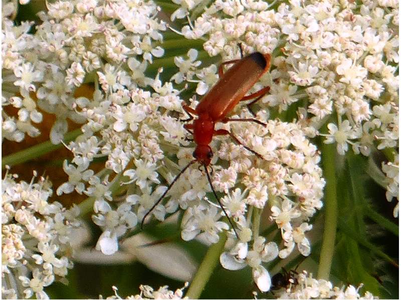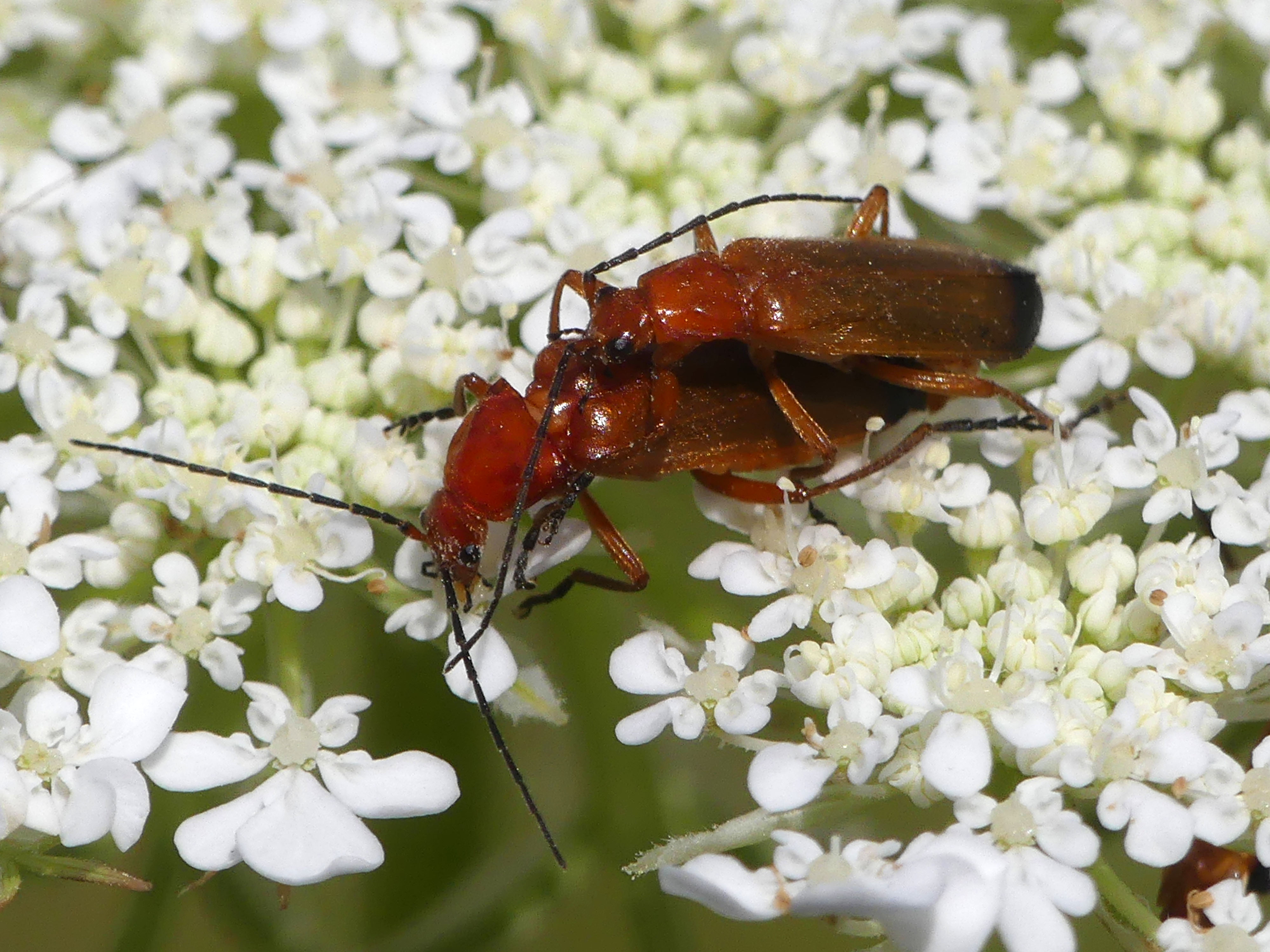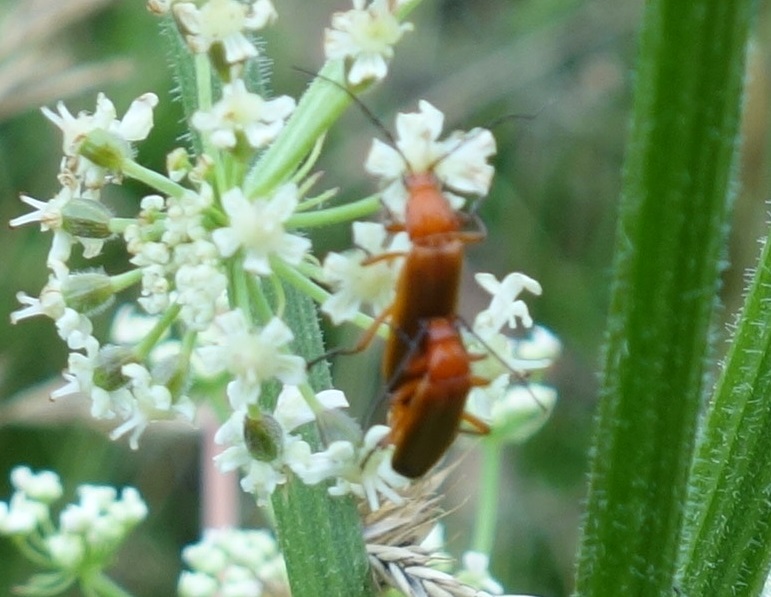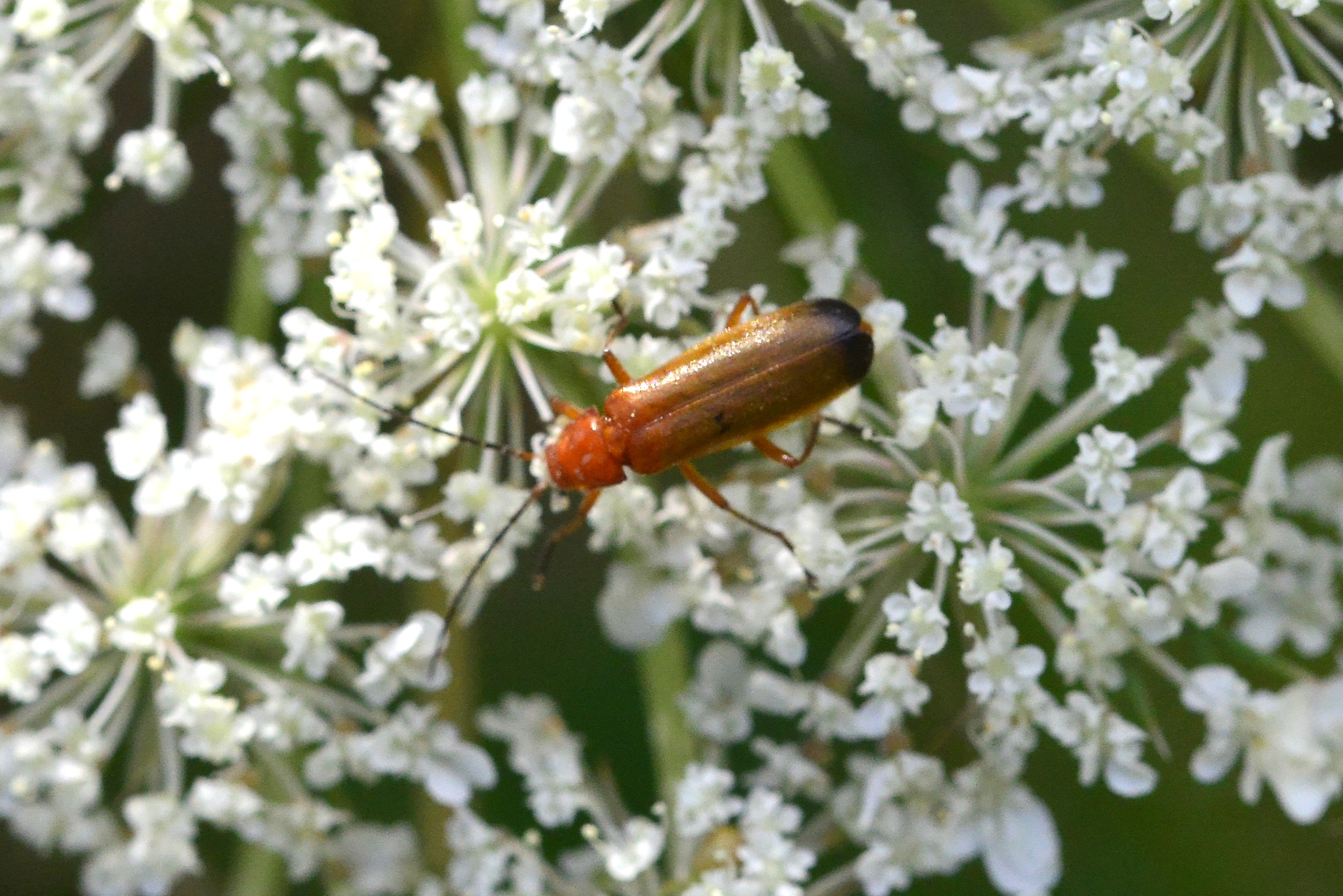 vier Exemplare mit Oxythyrea funesta (Poda, 1761) - Trauer-Rosenkäfer auf Wilder Möhre, Westlausitz, Nordhang Hutberg, Kamenz, 19.07.2020