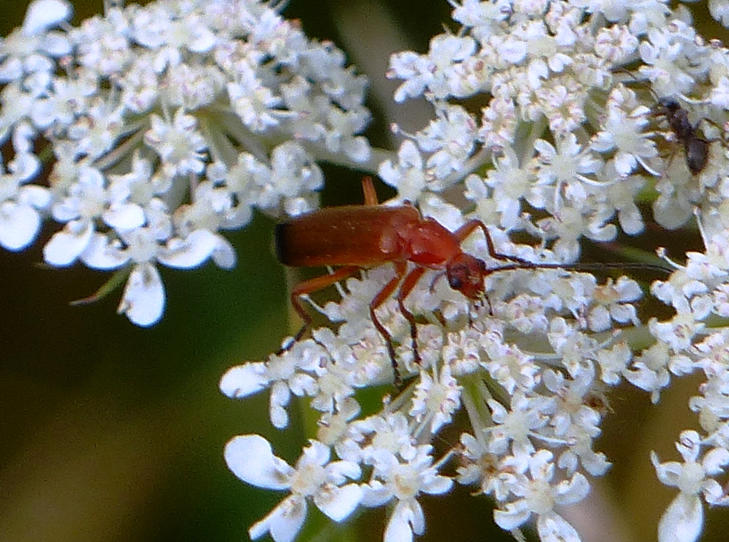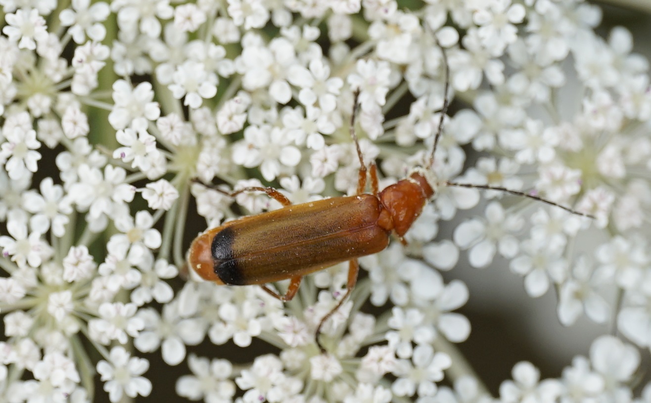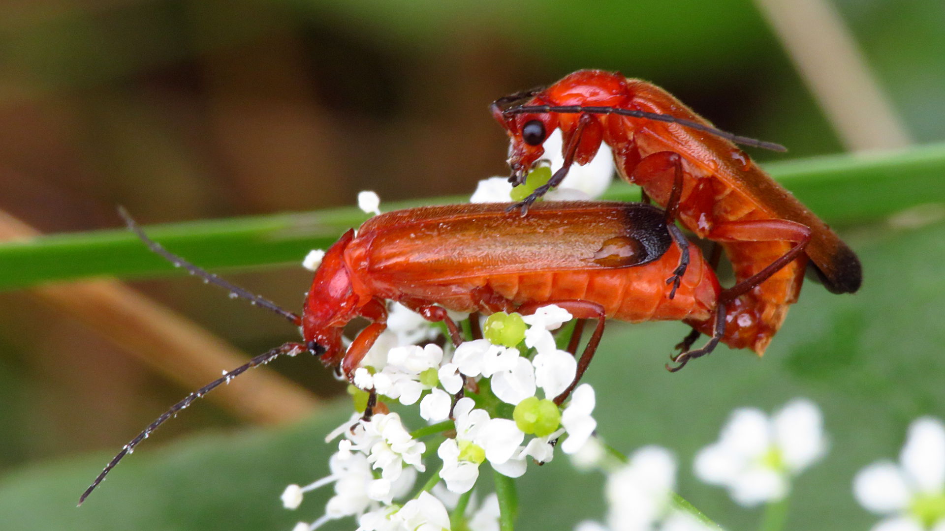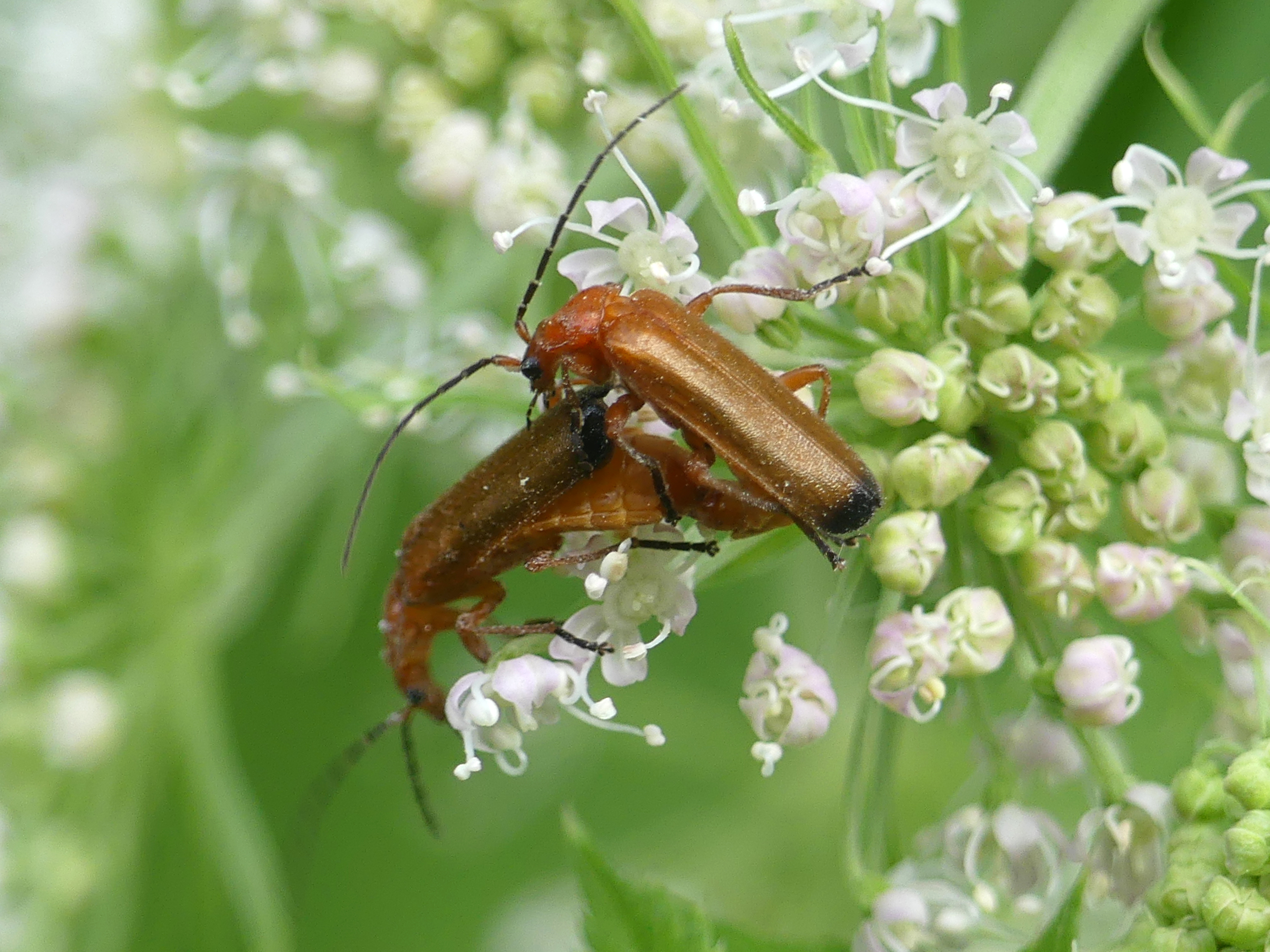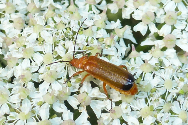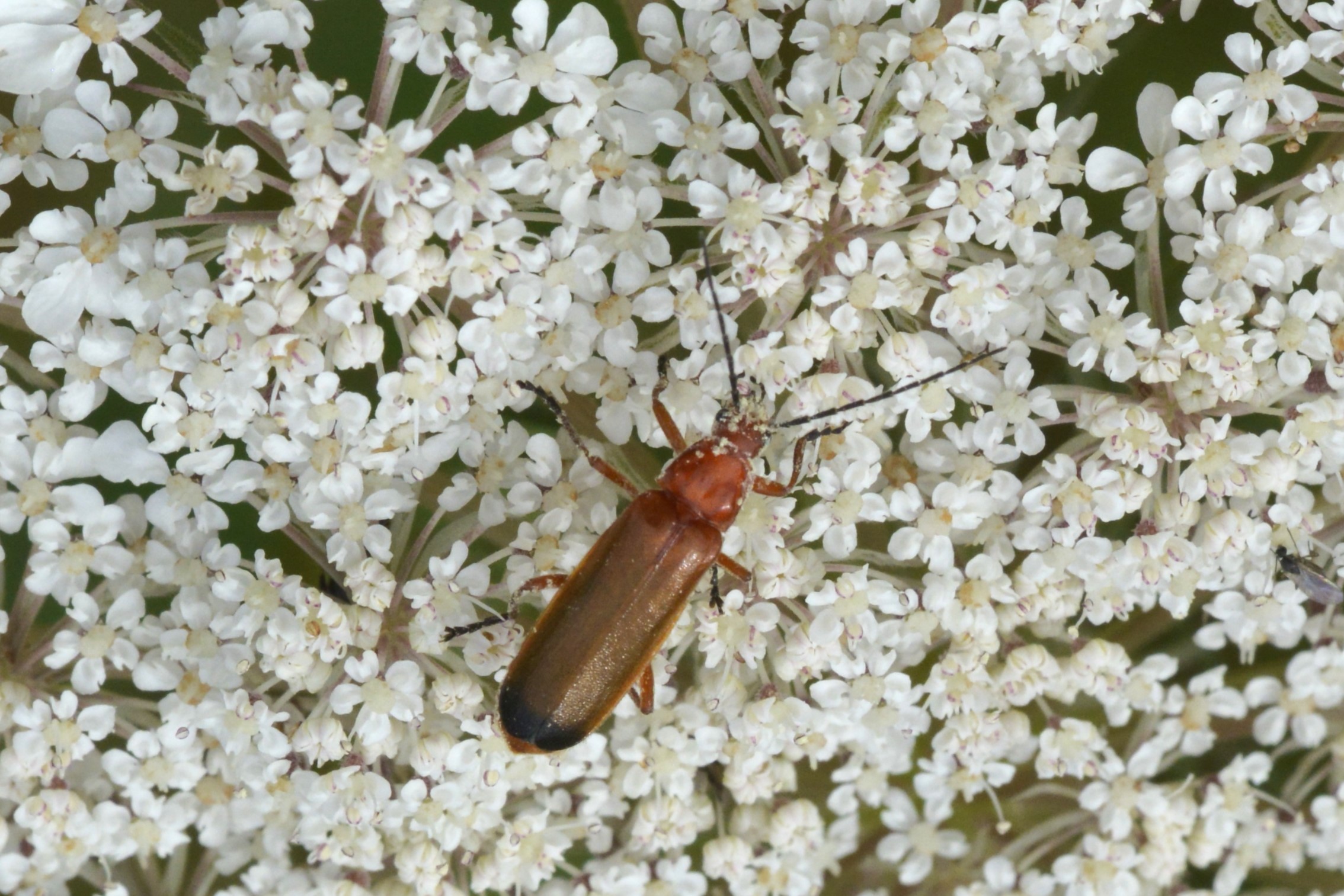 vier Exemplare mit Oxythyrea funesta (Poda, 1761) - Trauer-Rosenkäfer auf Wilder Möhre, Westlausitz, Nordhang Hutberg, Kamenz, 19.07.2020