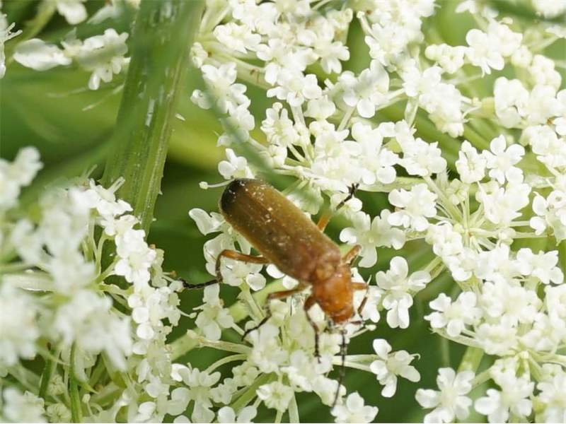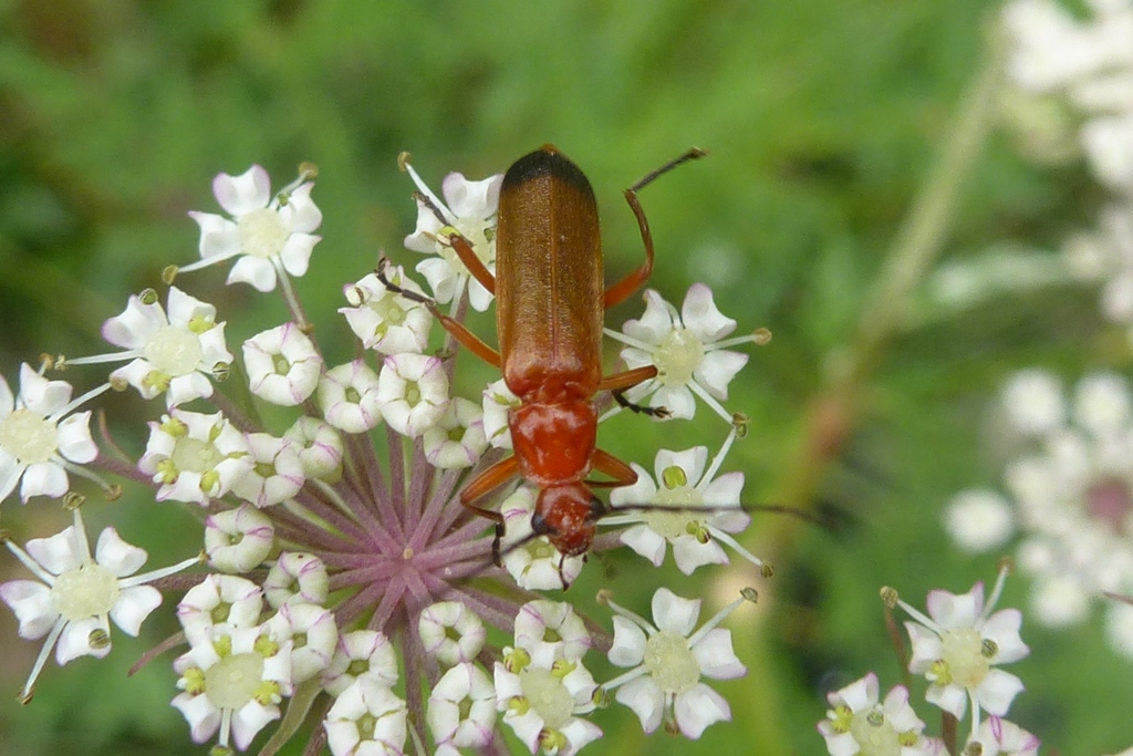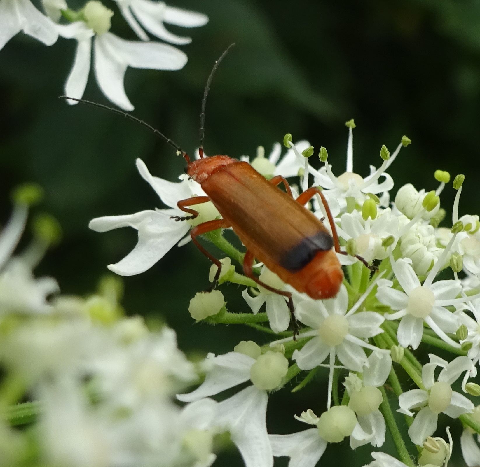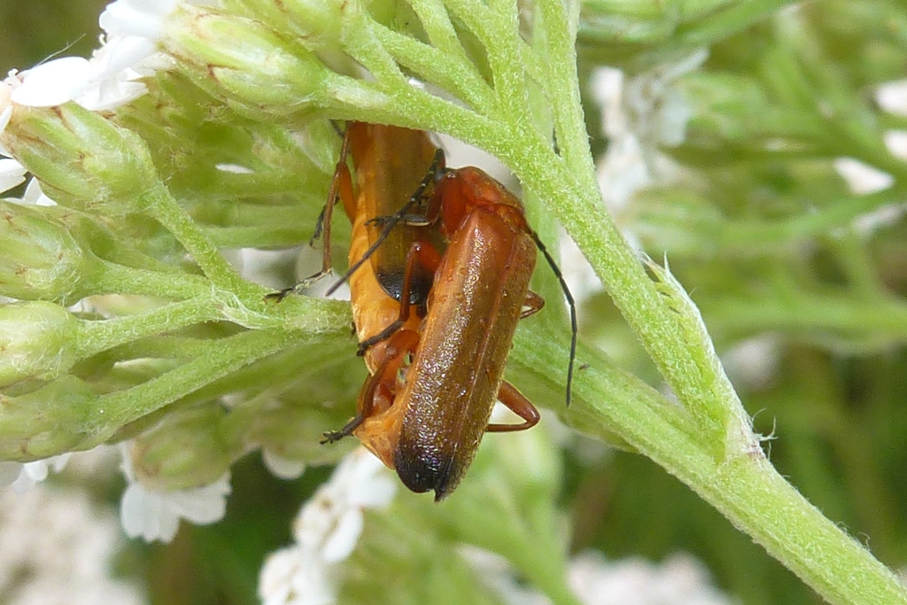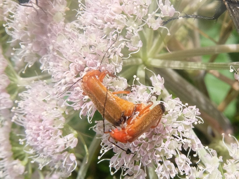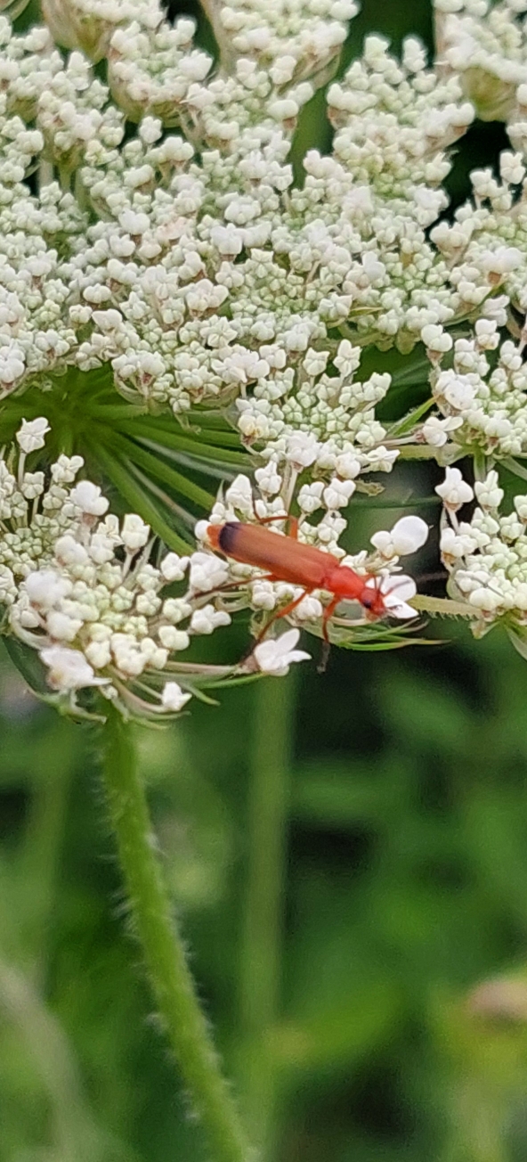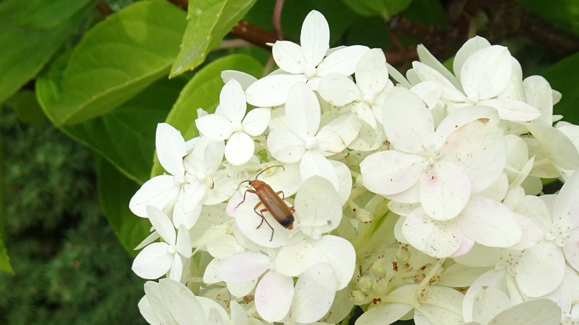 vier Exemplare mit Oxythyrea funesta (Poda, 1761) - Trauer-Rosenkäfer auf Wilder Möhre, Westlausitz, Nordhang Hutberg, Kamenz, 19.07.2020