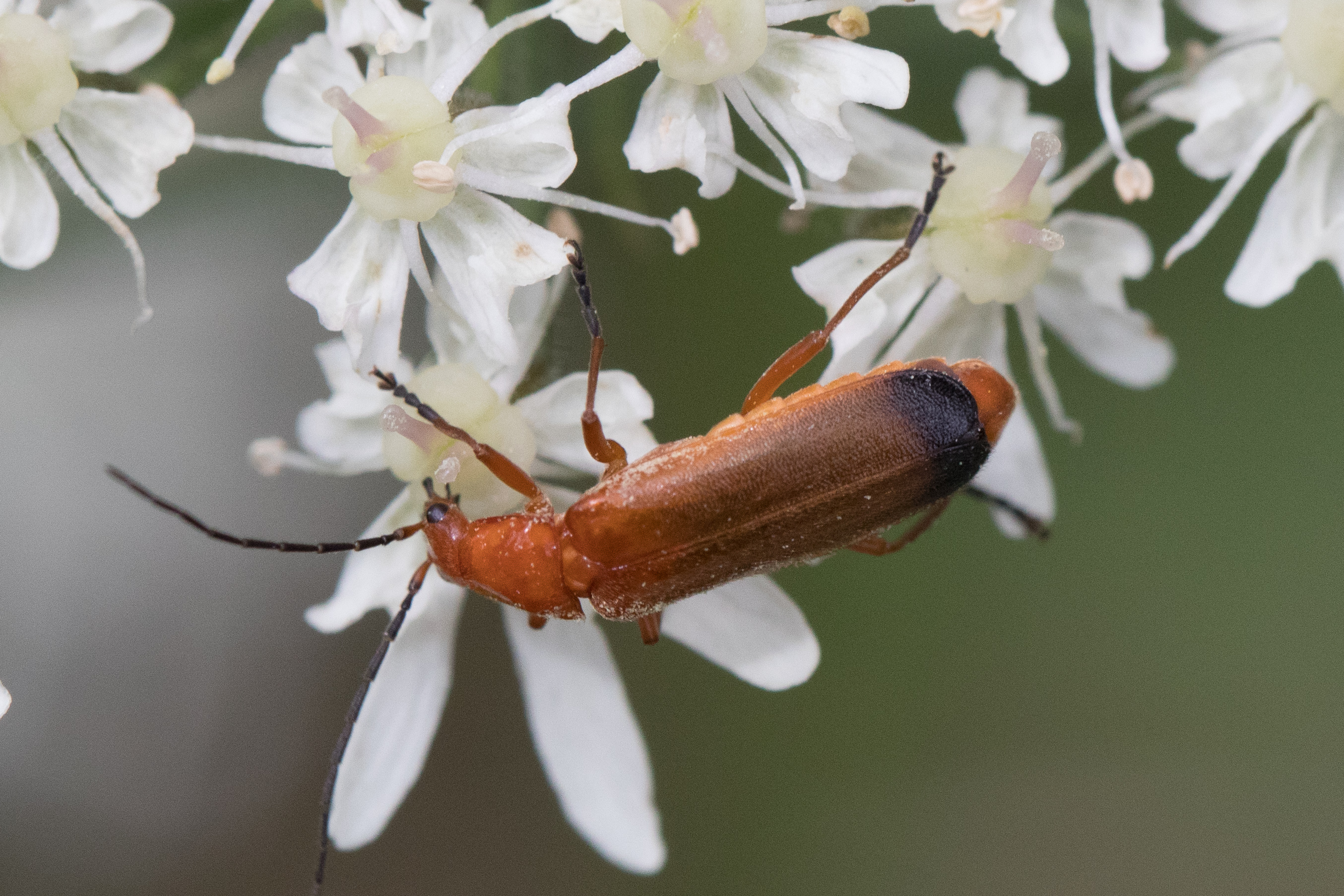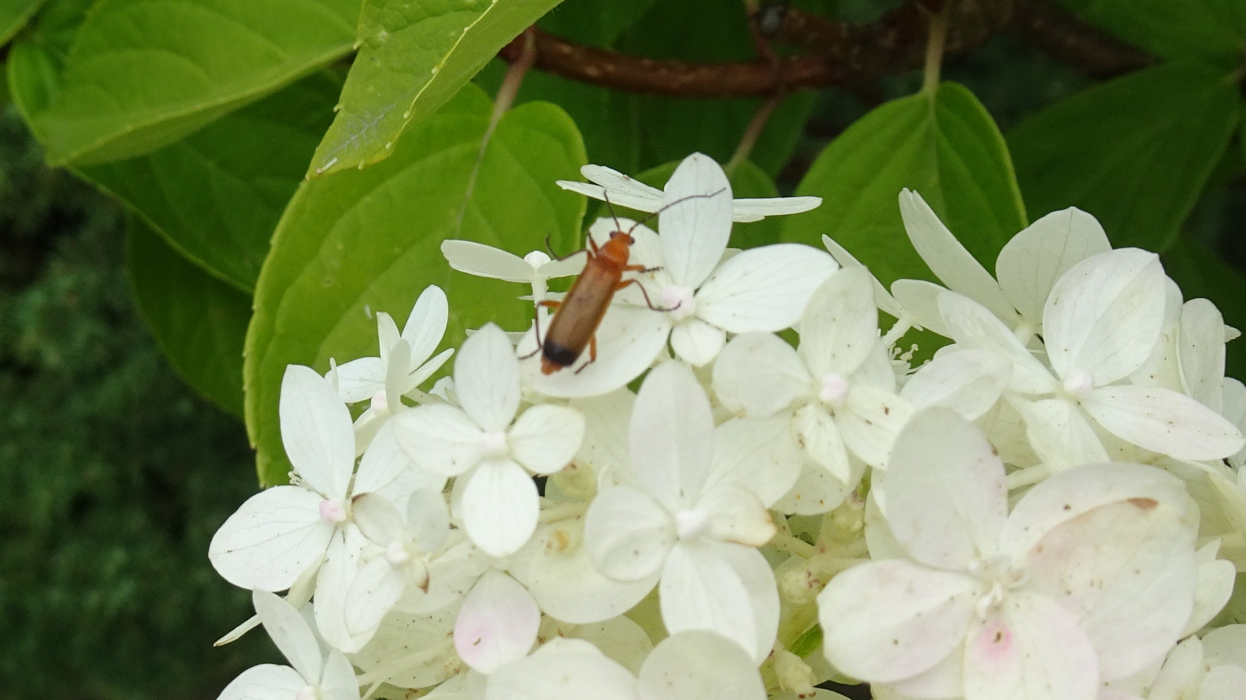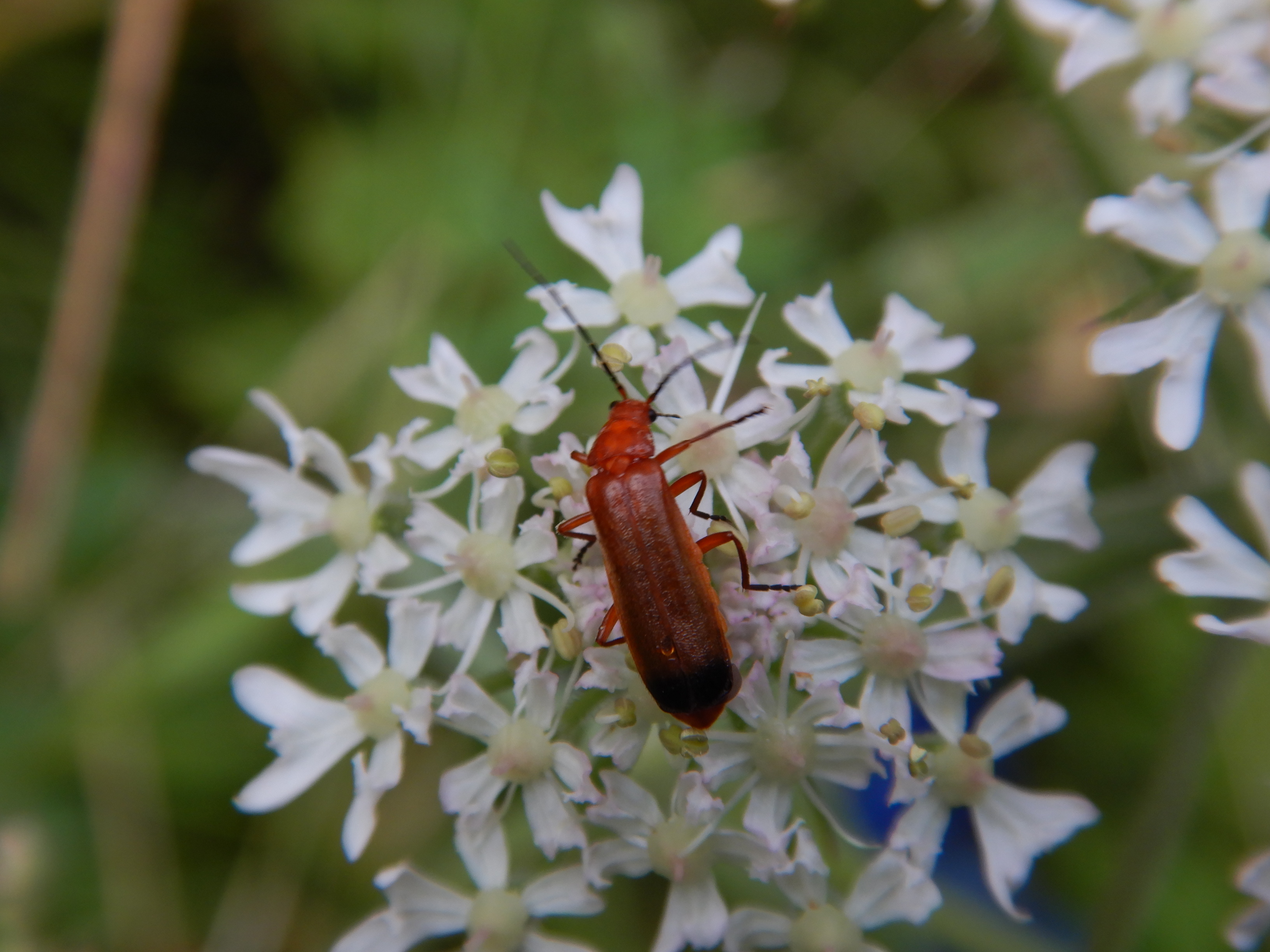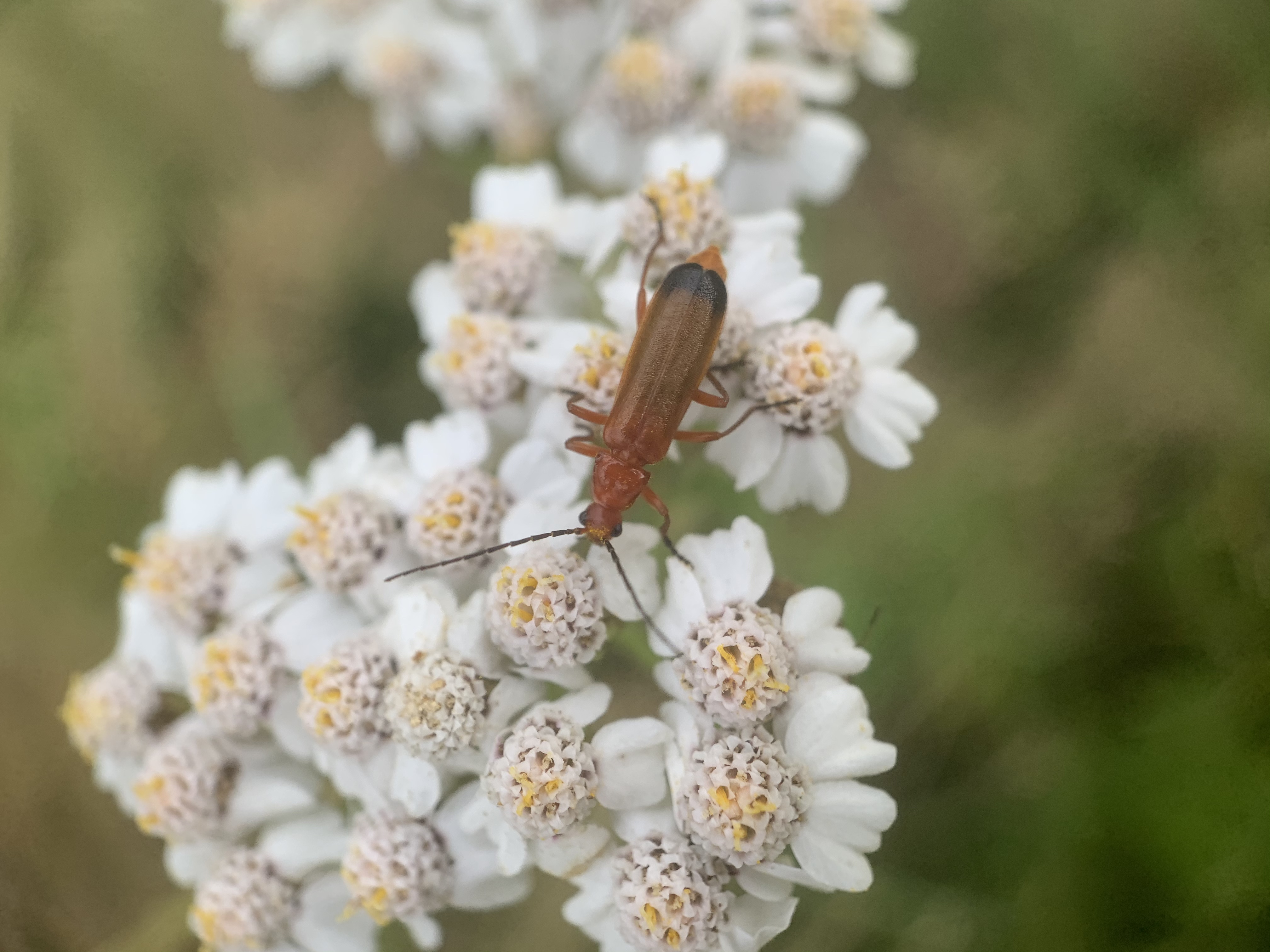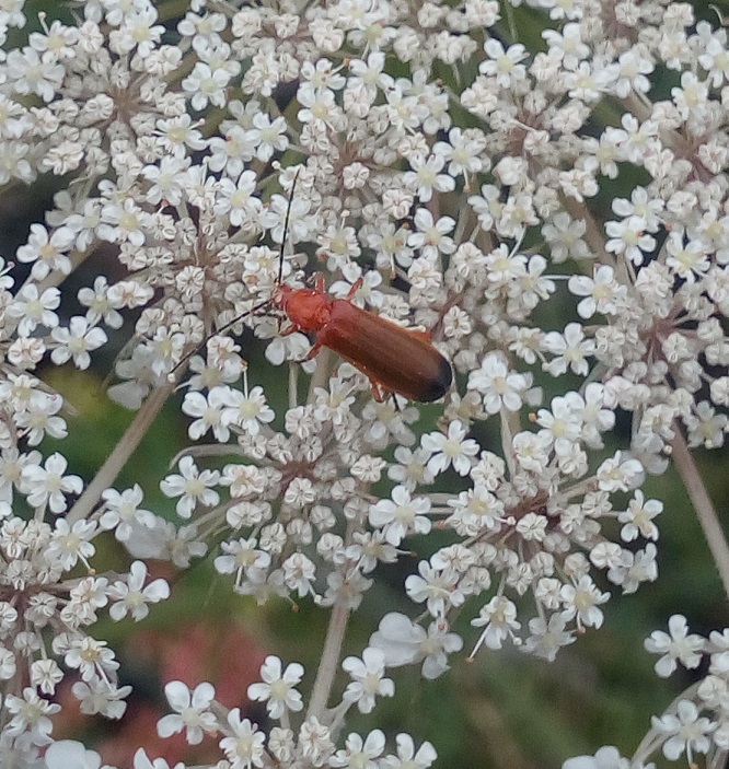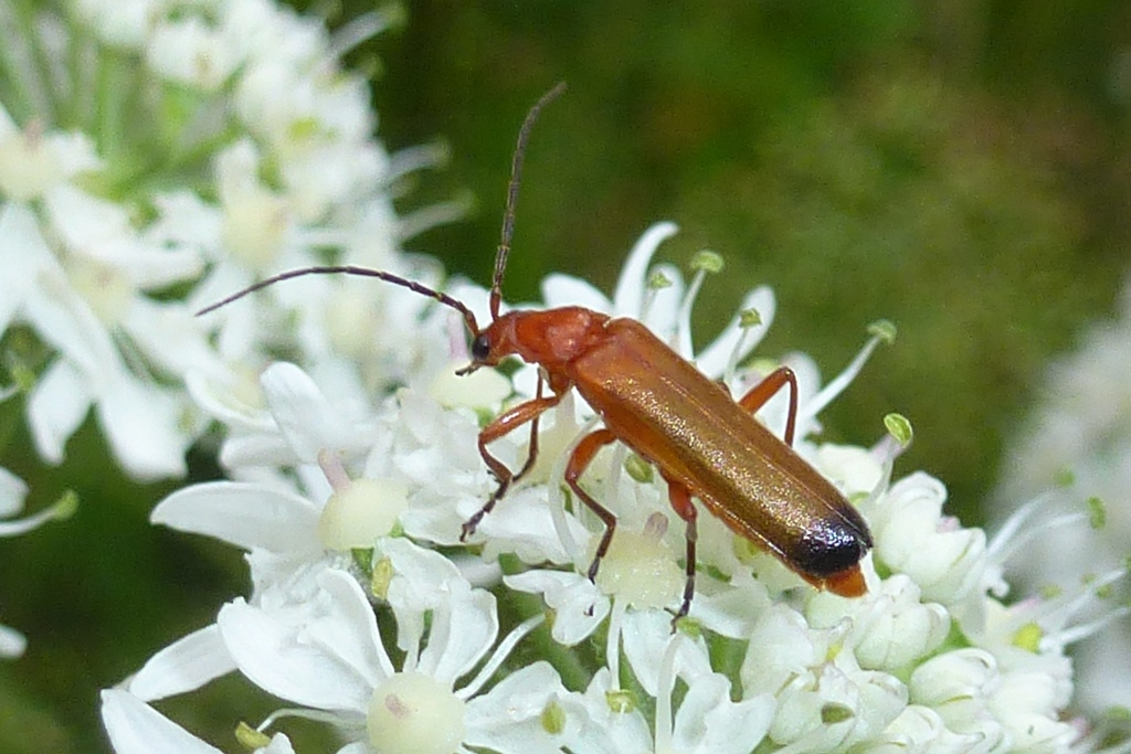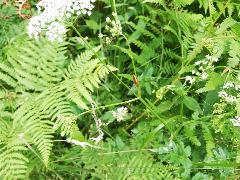 vier Exemplare mit Oxythyrea funesta (Poda, 1761) - Trauer-Rosenkäfer auf Wilder Möhre, Westlausitz, Nordhang Hutberg, Kamenz, 19.07.2020