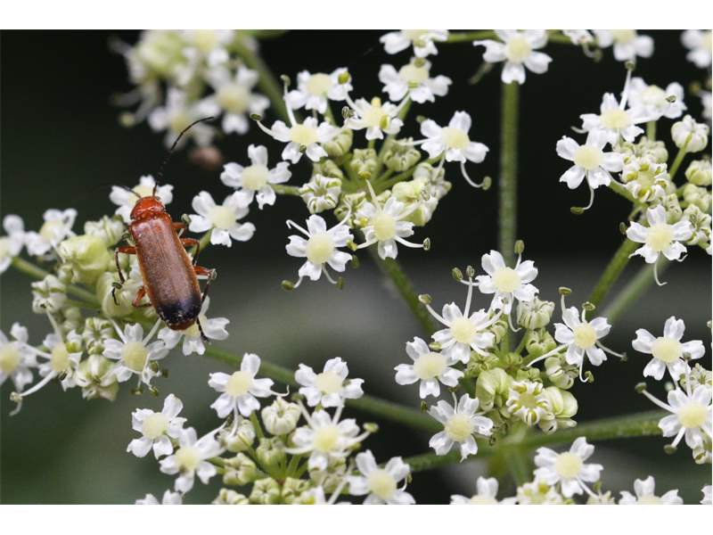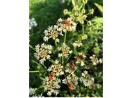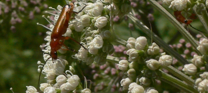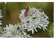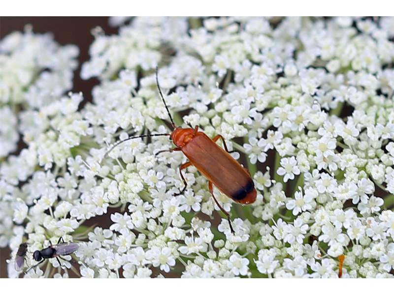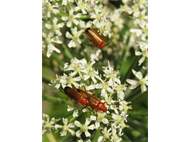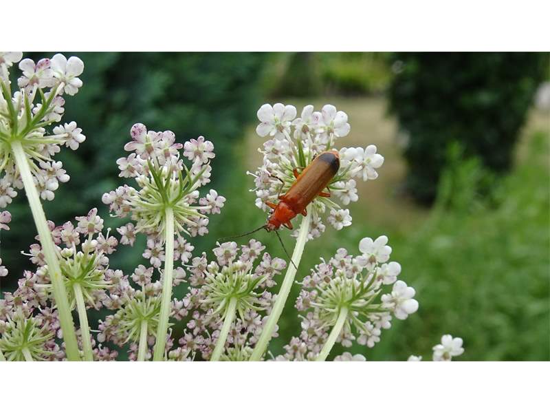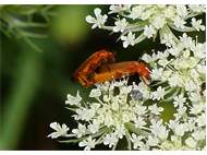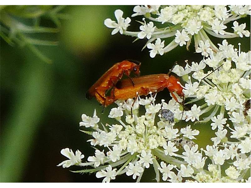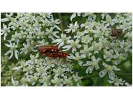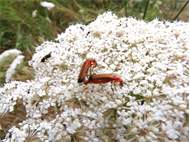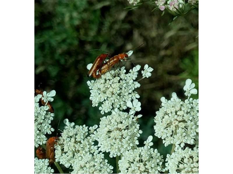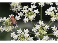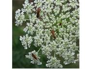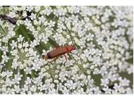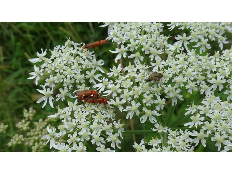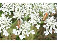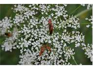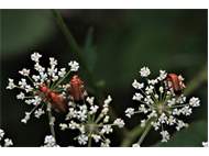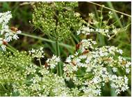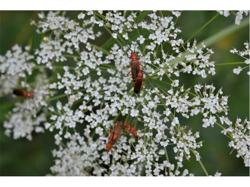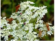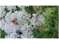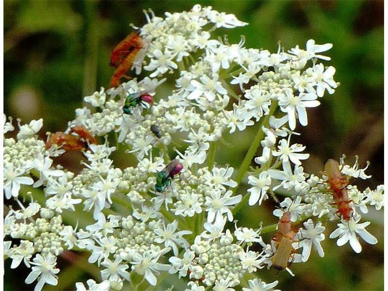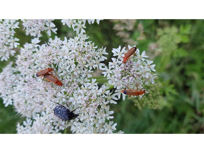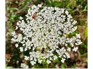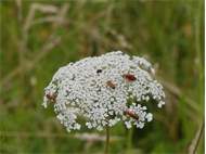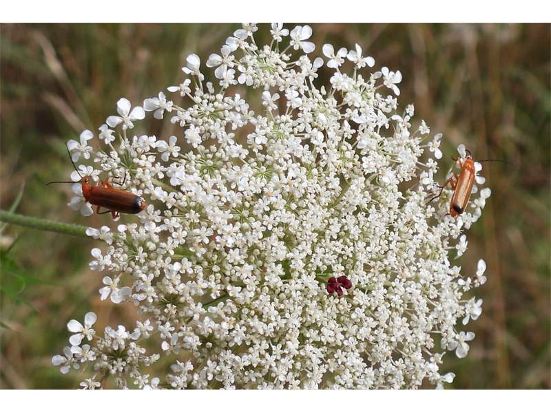 vier Exemplare mit Oxythyrea funesta (Poda, 1761) - Trauer-Rosenkäfer auf Wilder Möhre, Westlausitz, Nordhang Hutberg, Kamenz, 19.07.2020 (© Gert Schulze)( Bild vergrößern)