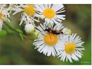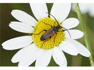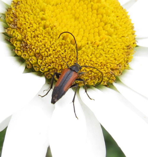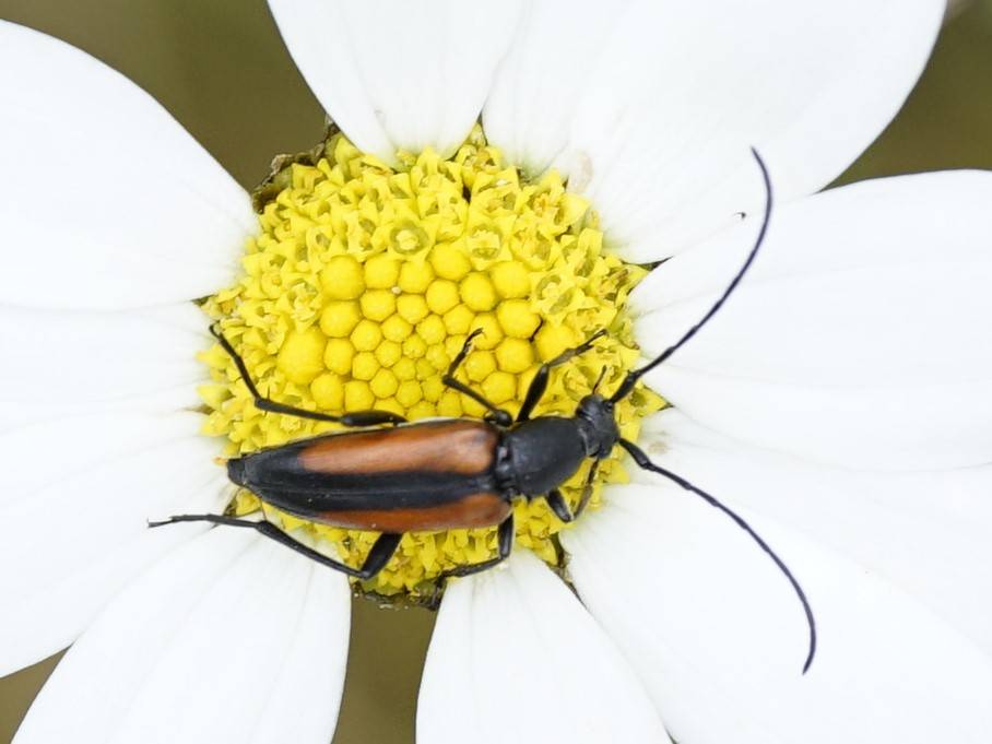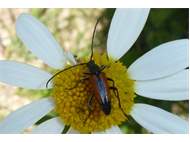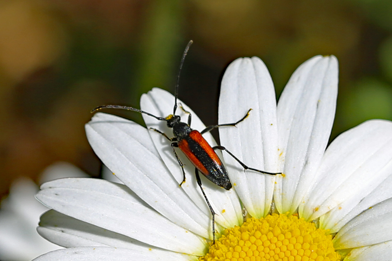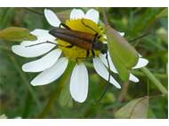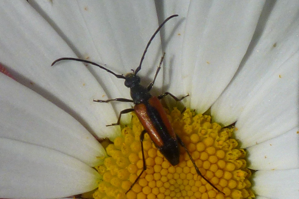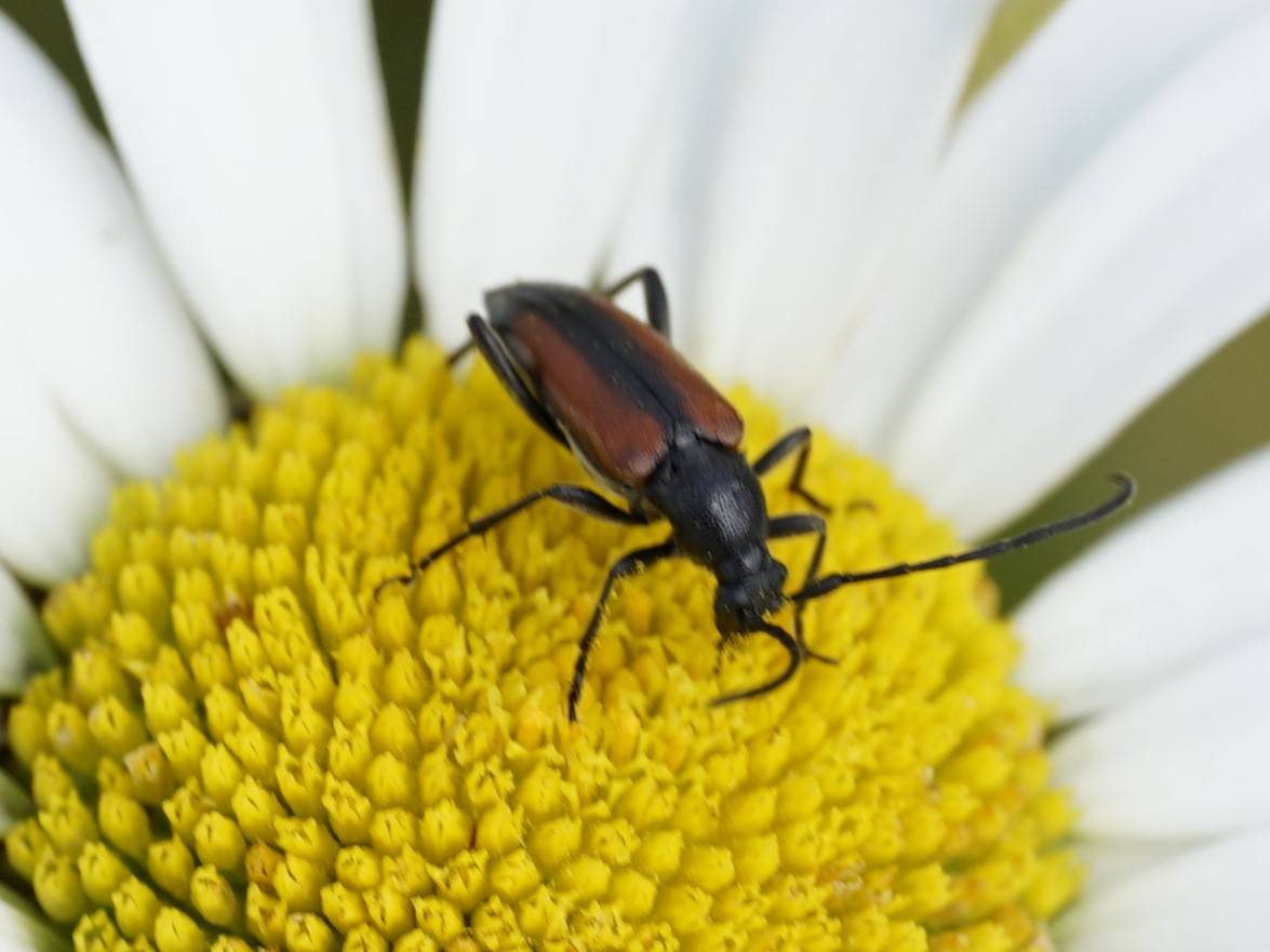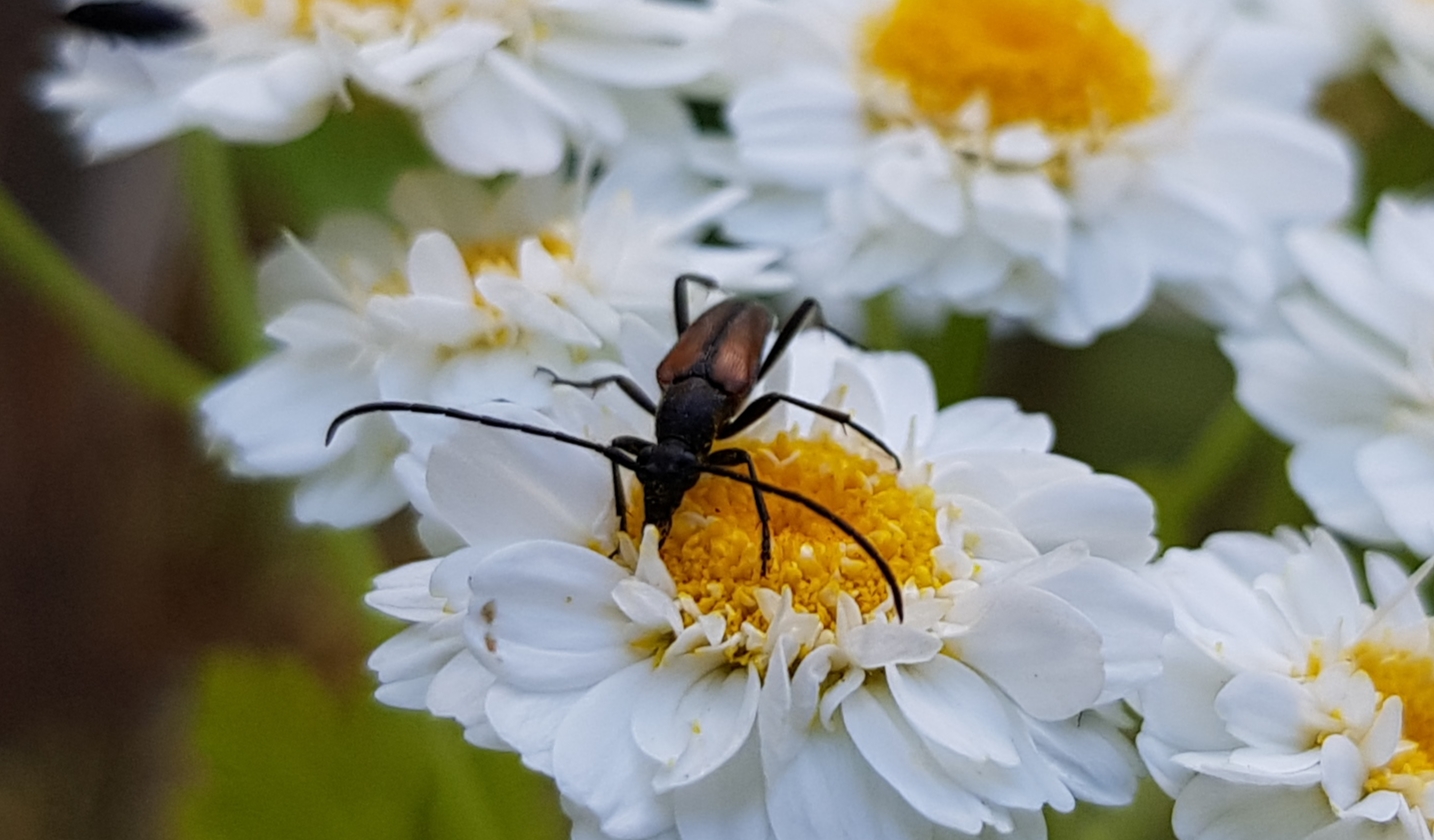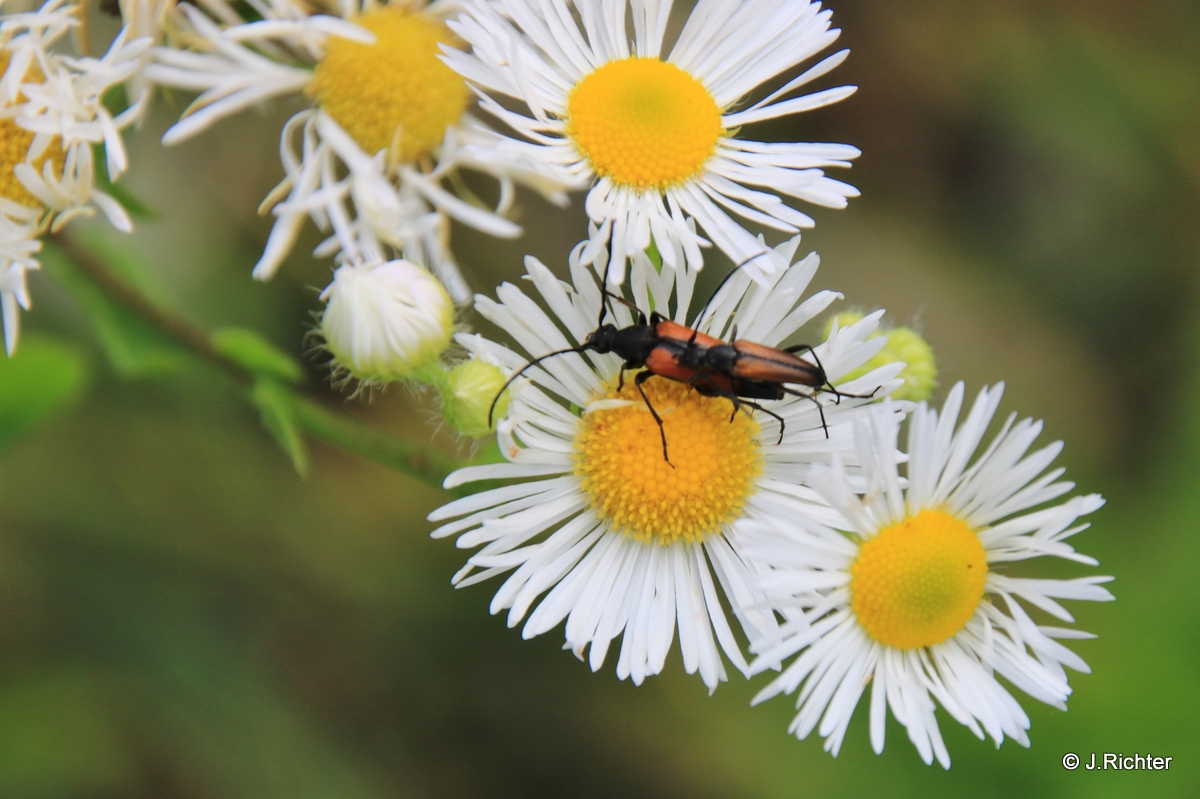 Kleiner Schmalbock (Stenurella melanura (Linnaeus, 1758)) am 14.06.2018 im Tharandter Wald am Triebischsee. auf einer kleinen mit Margeriten und Einjährigem Feinstrahl bewachsenen Fläche von nur 1 qm zählten wir 15 Exemplare