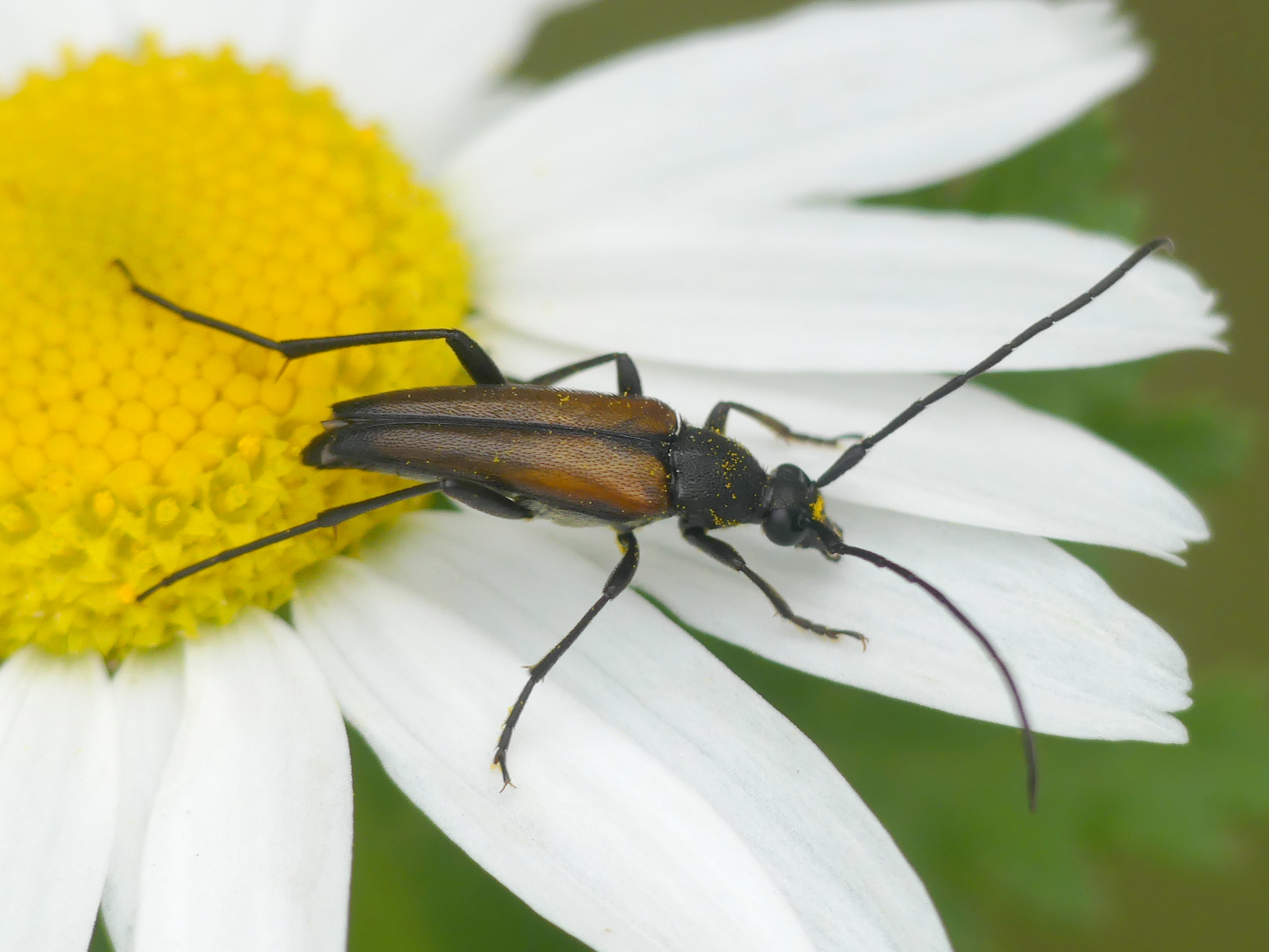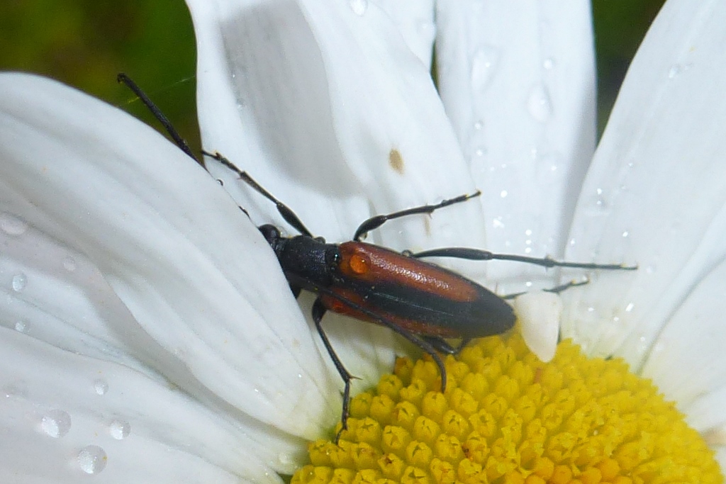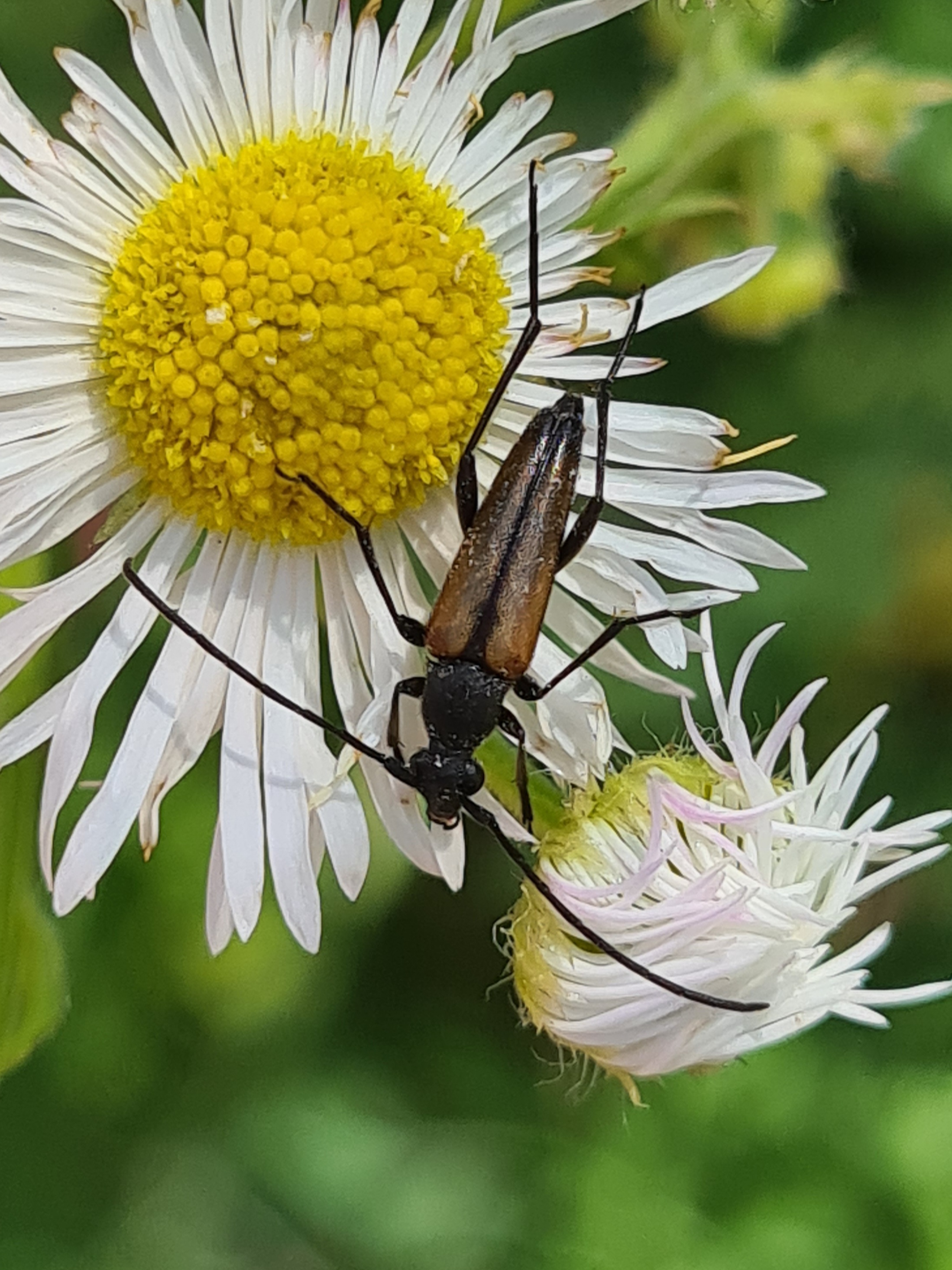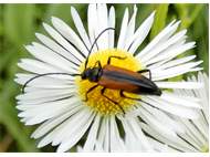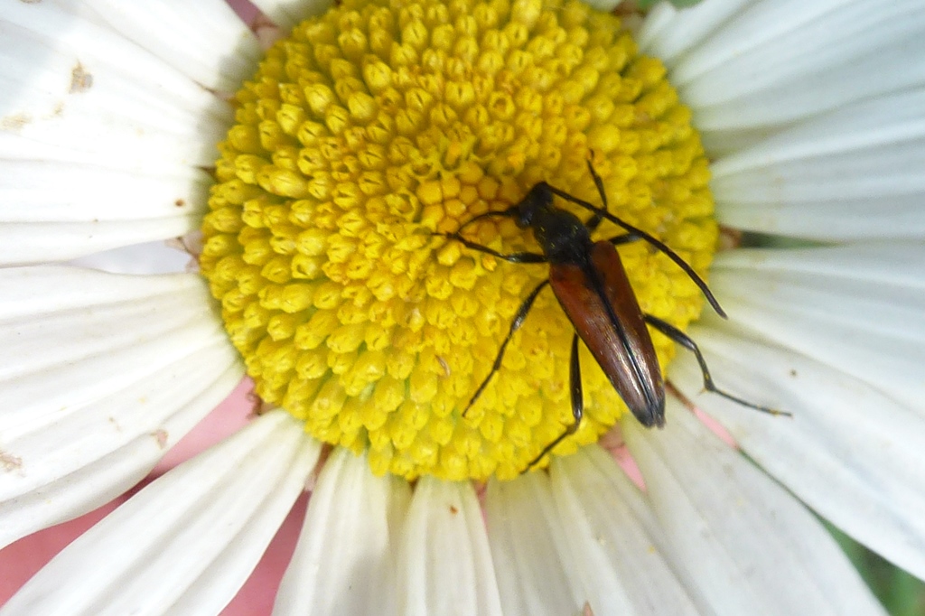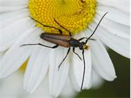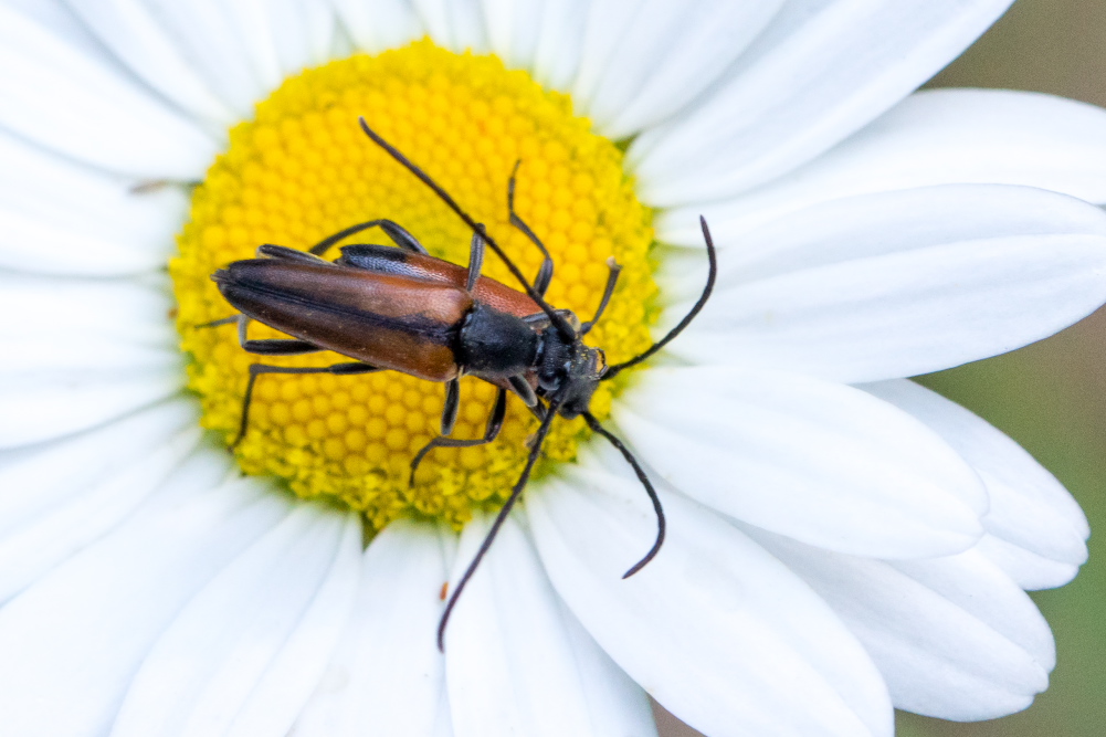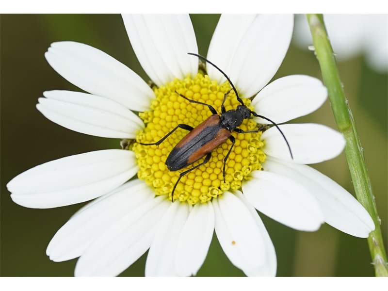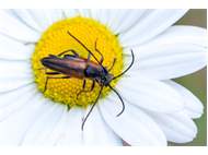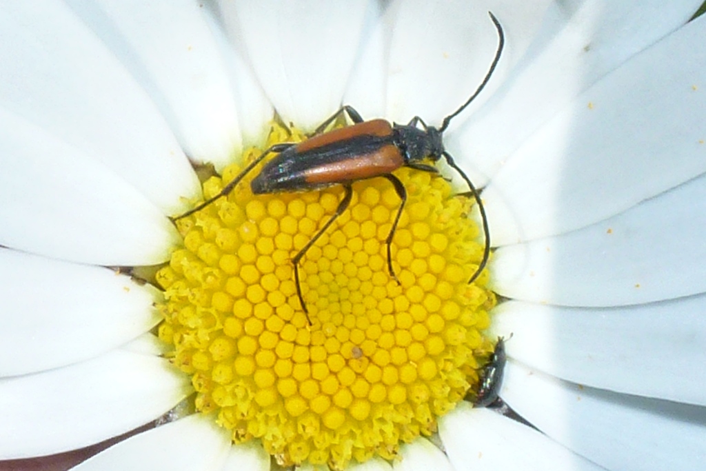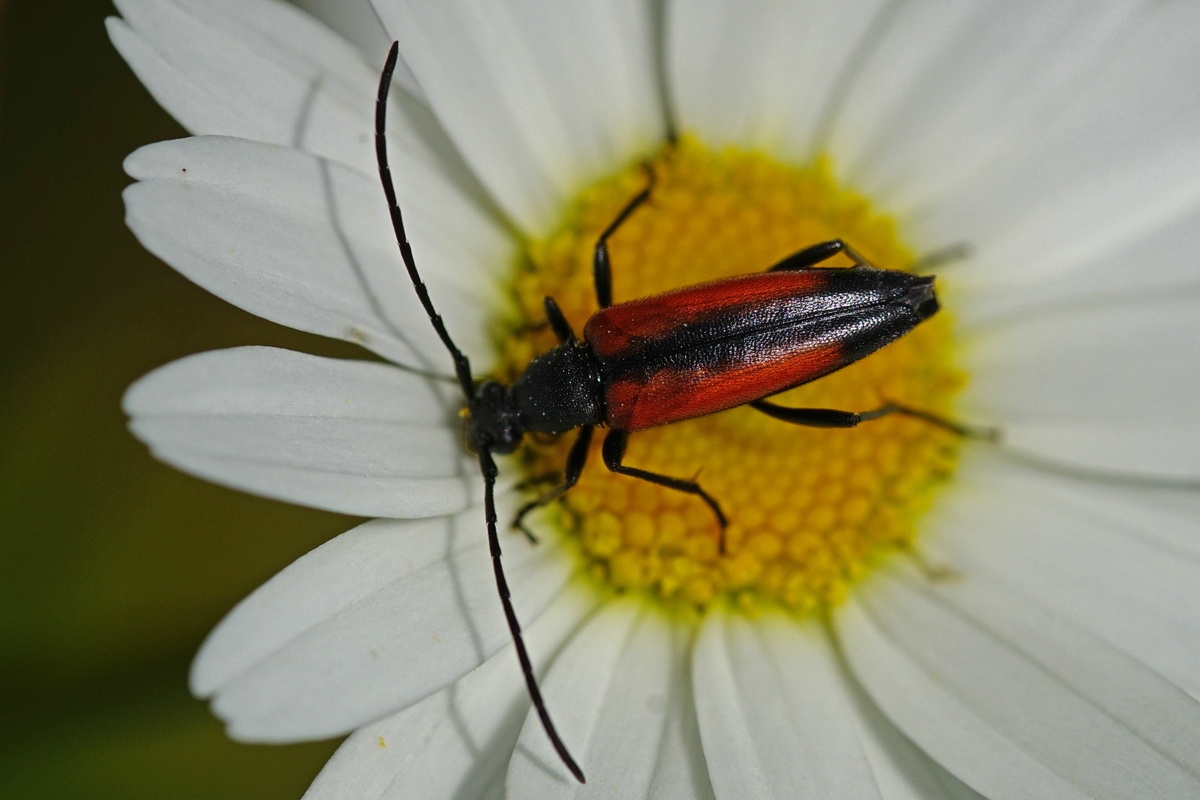 Kleiner Schmalbock (Stenurella melanura (Linnaeus, 1758)) am 14.06.2018 im Tharandter Wald am Triebischsee. auf einer kleinen mit Margeriten und Einjährigem Feinstrahl bewachsenen Fläche von nur 1 qm zählten wir 15 Exemplare