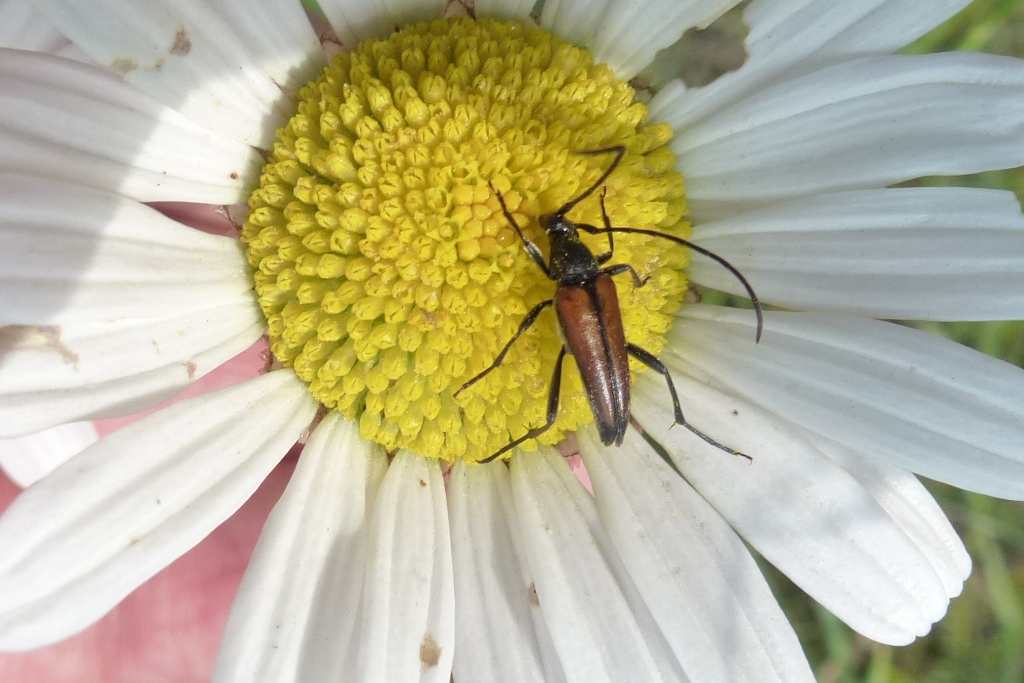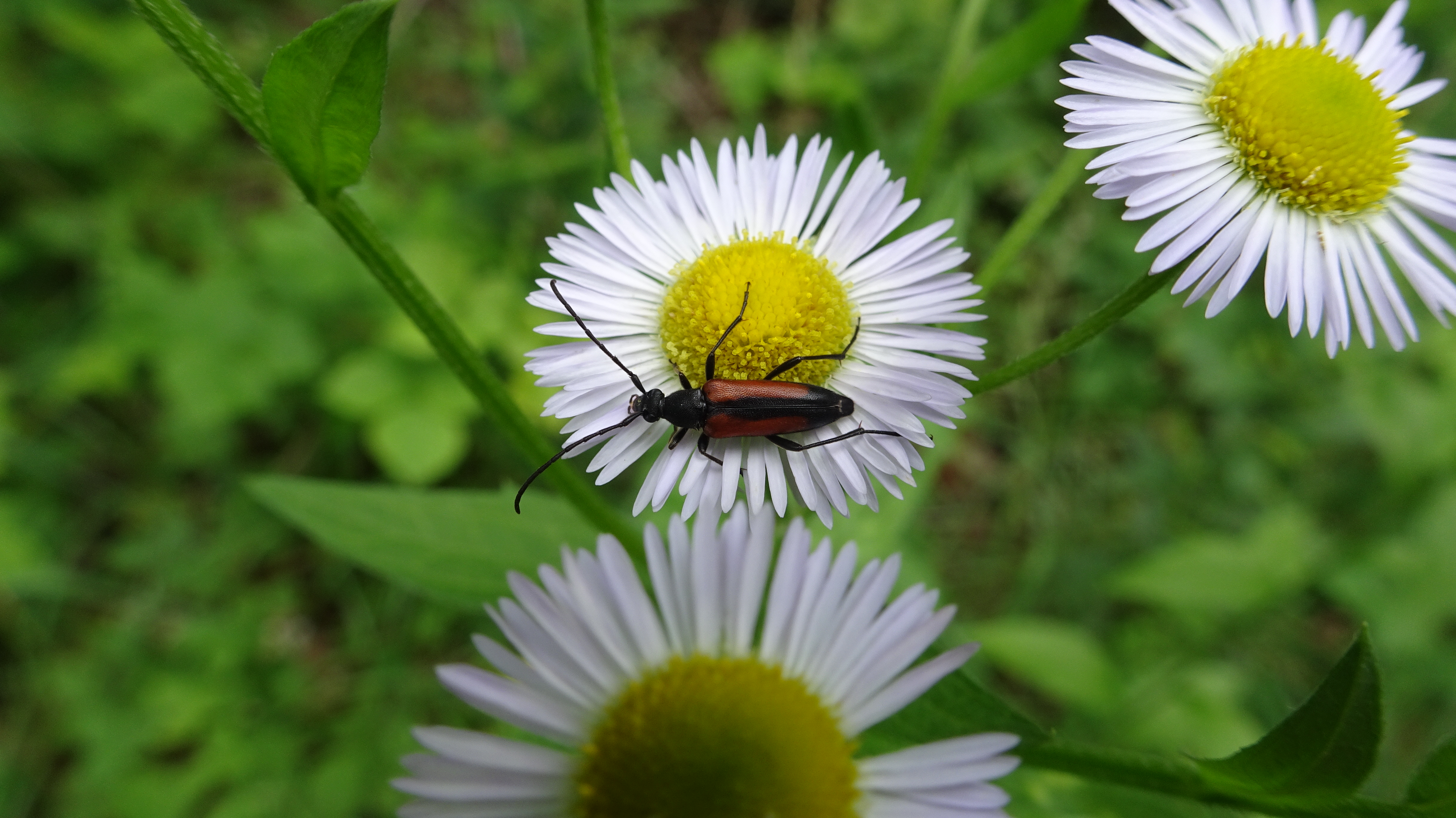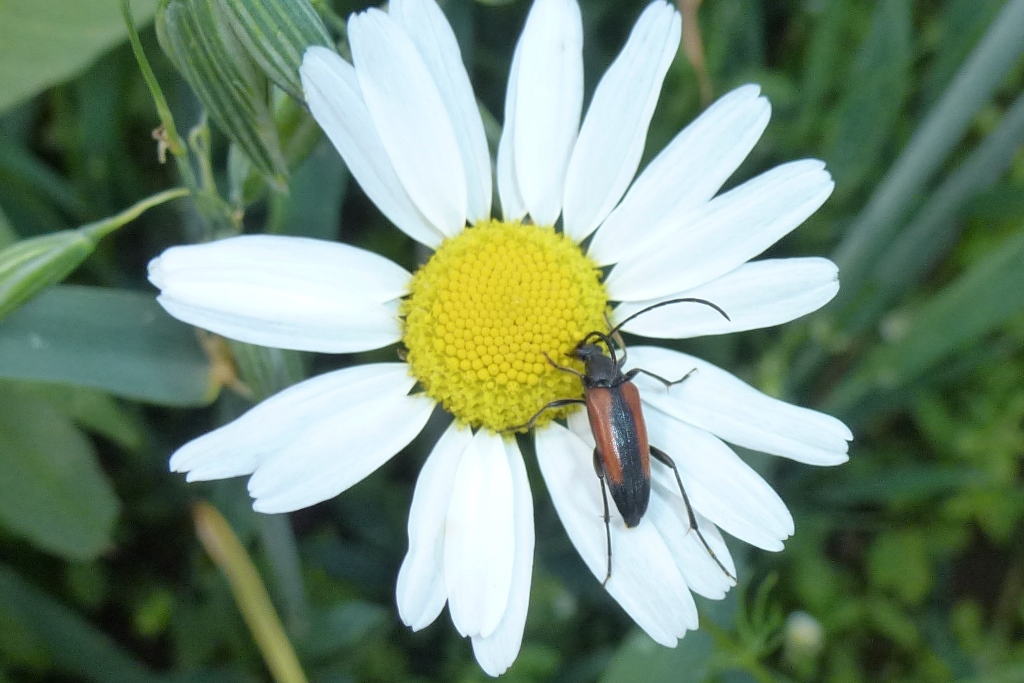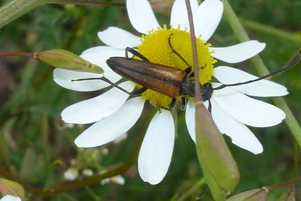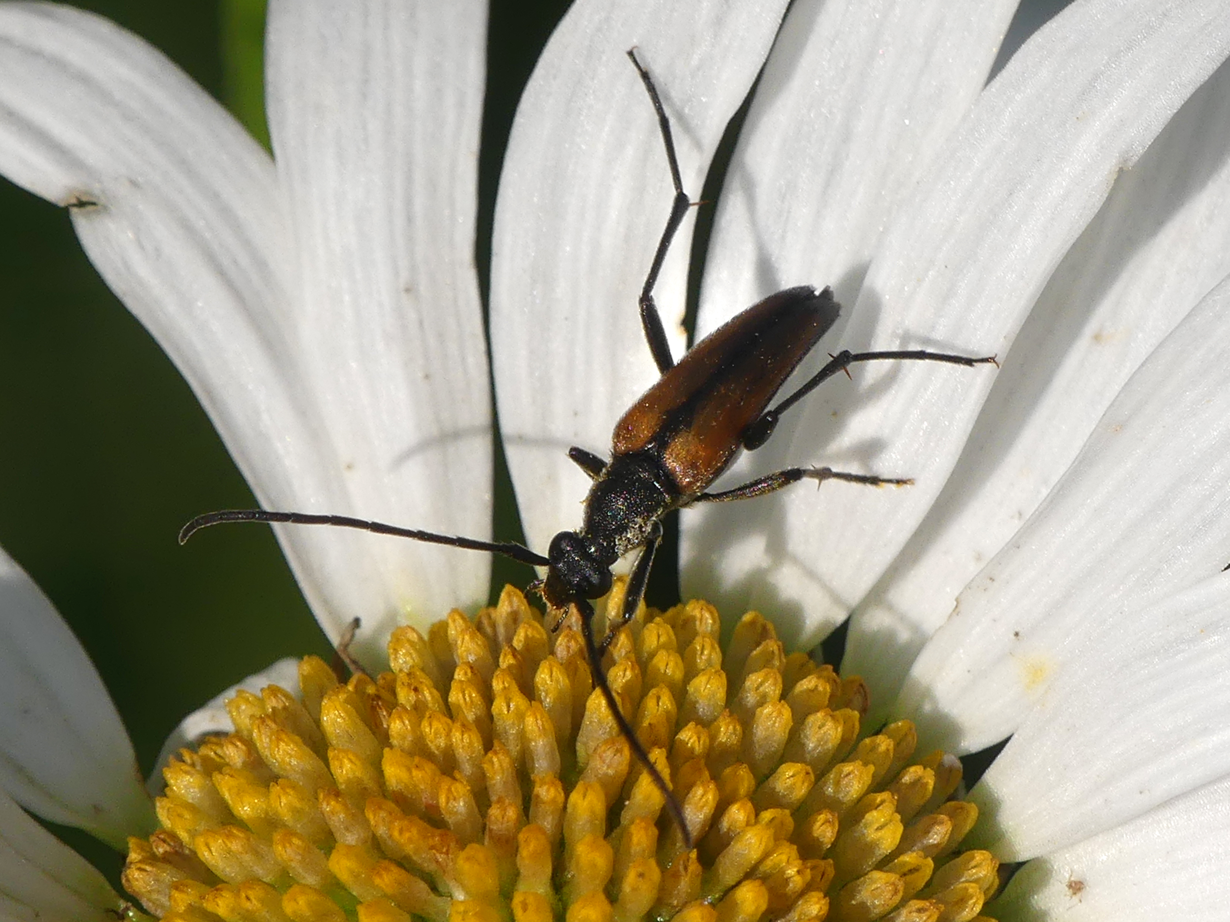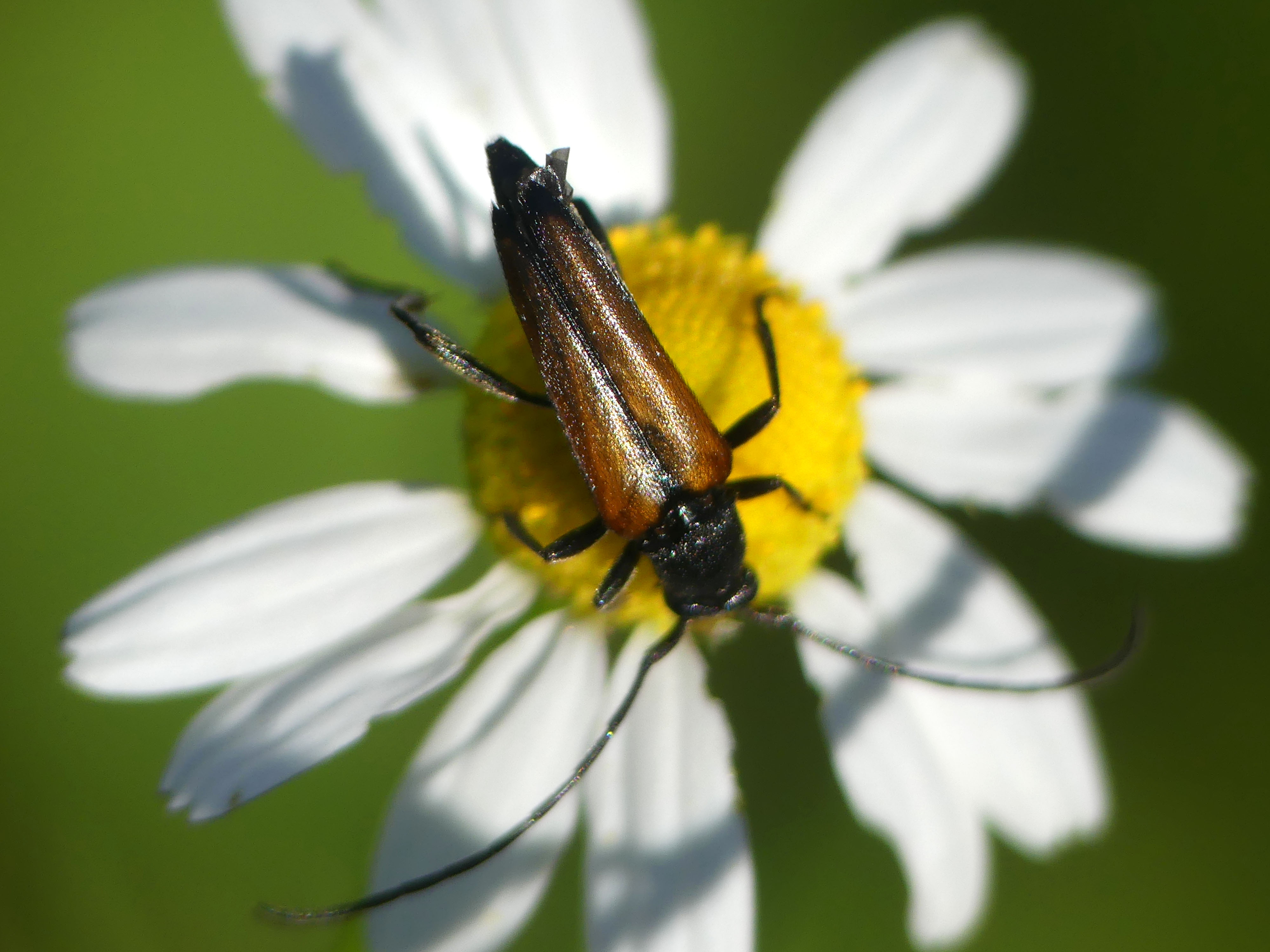 Kleiner Schmalbock (Stenurella melanura (Linnaeus, 1758)) am 14.06.2018 im Tharandter Wald am Triebischsee. auf einer kleinen mit Margeriten und Einjährigem Feinstrahl bewachsenen Fläche von nur 1 qm zählten wir 15 Exemplare