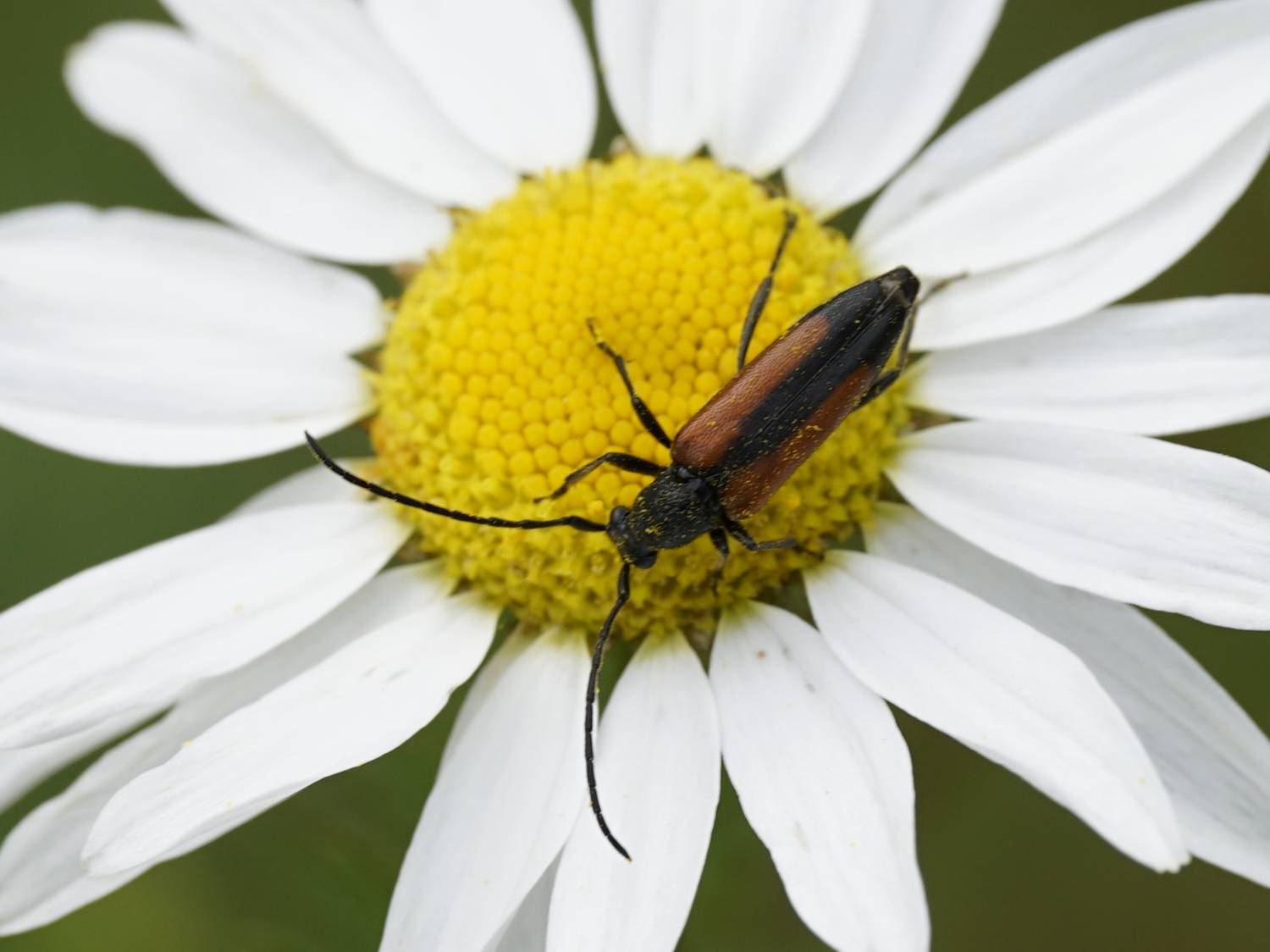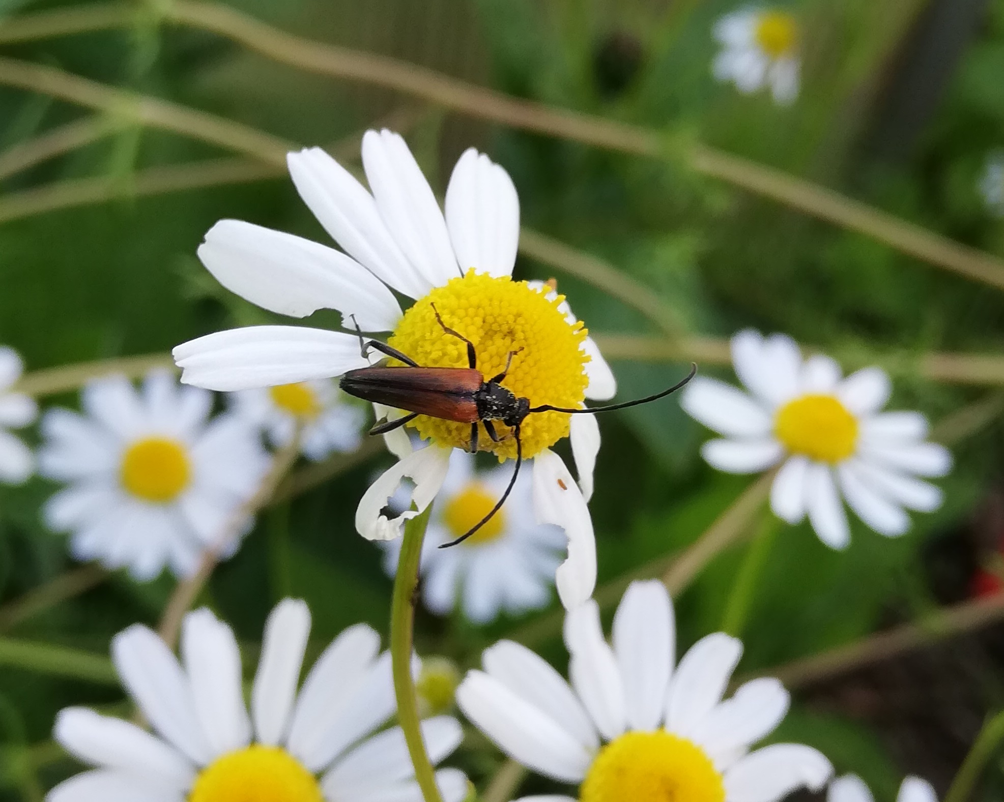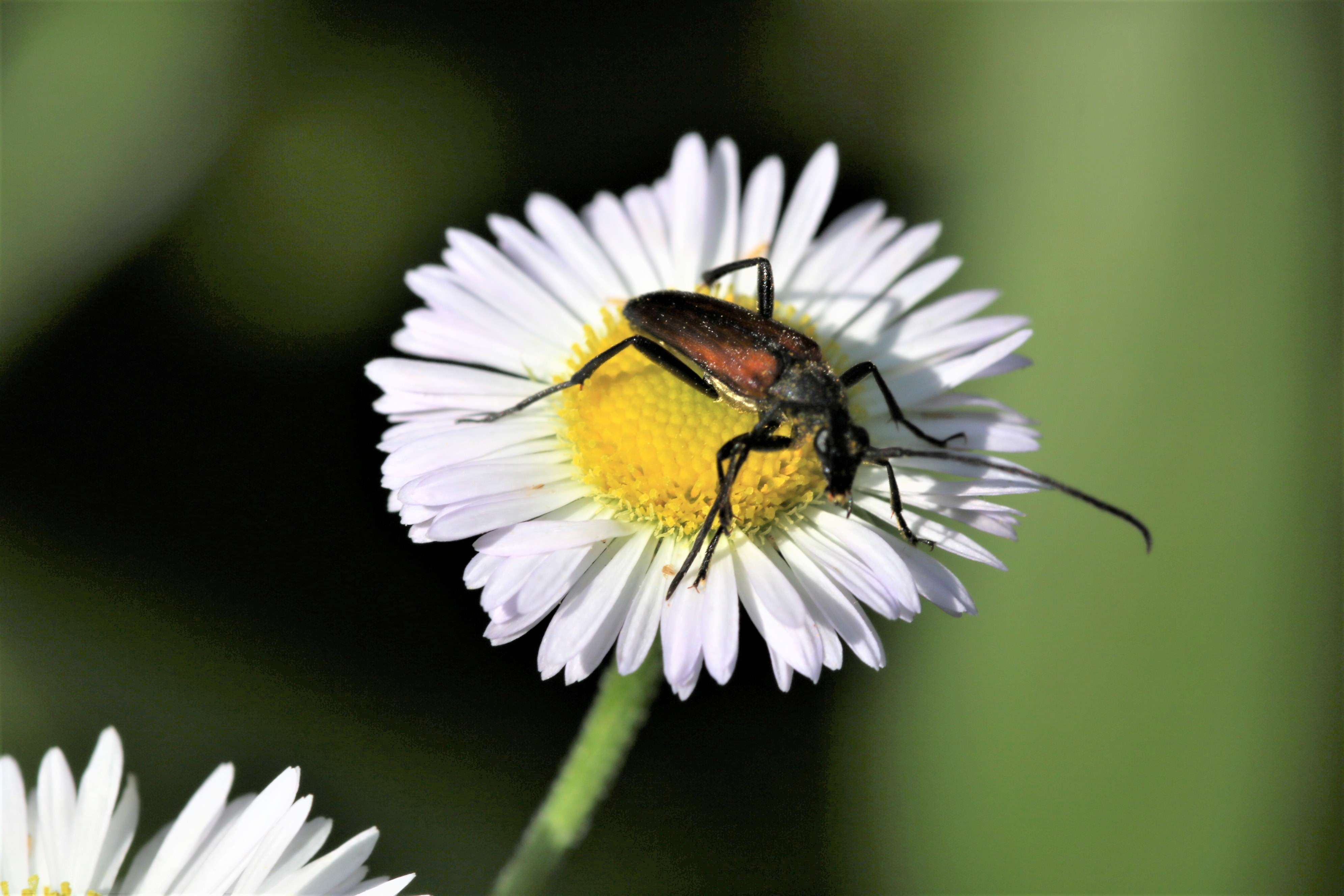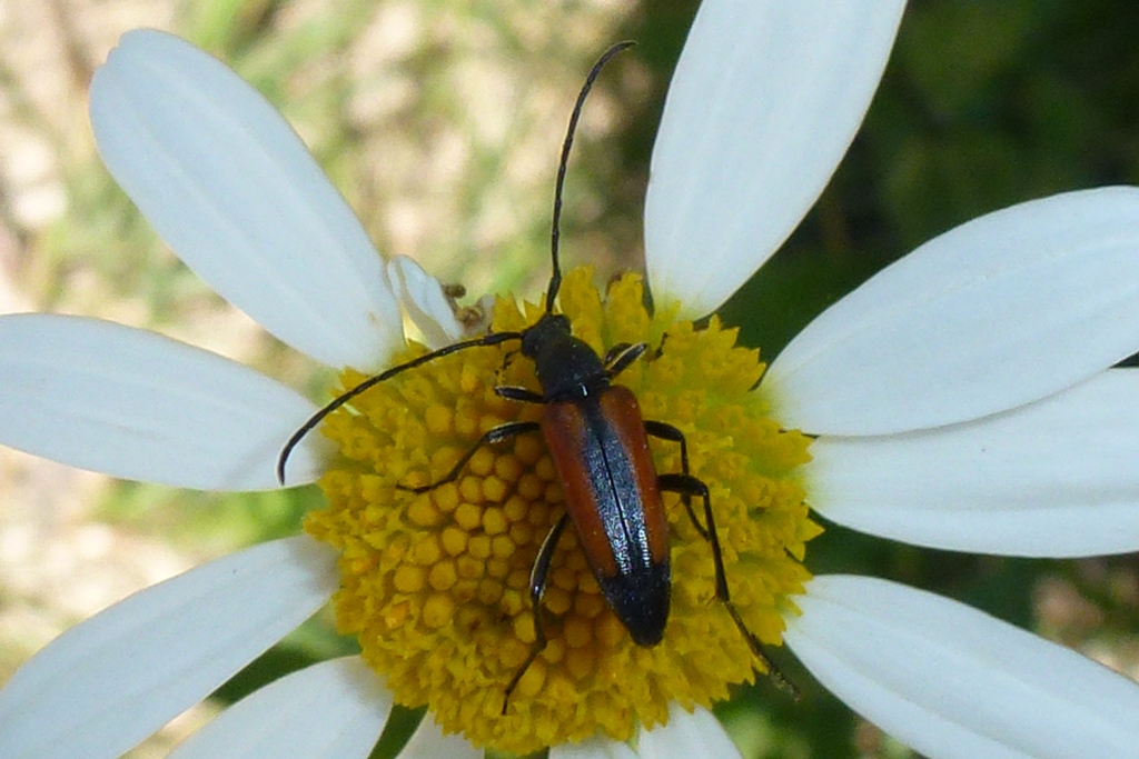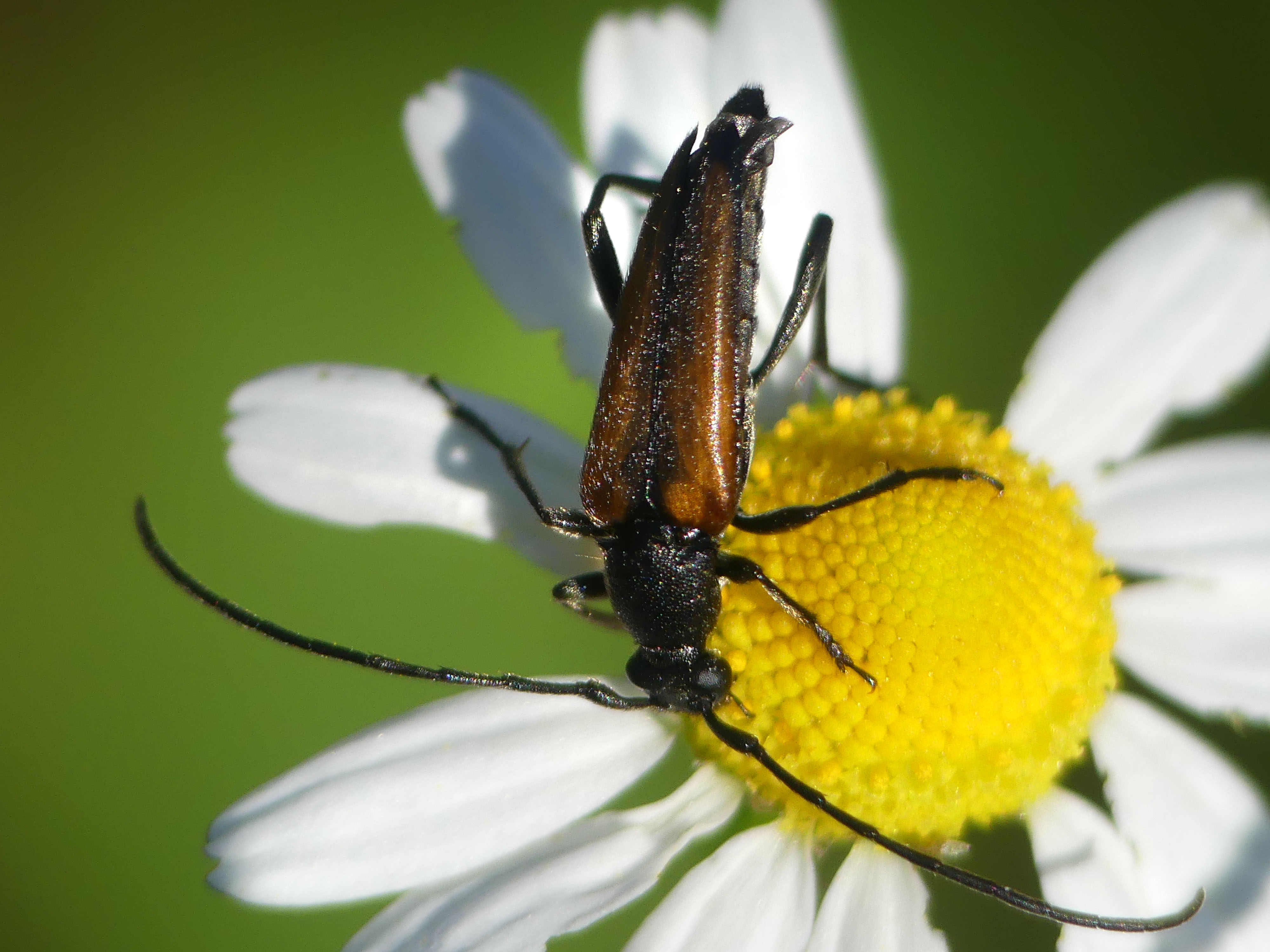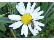 Kleiner Schmalbock (Stenurella melanura (Linnaeus, 1758)) am 14.06.2018 im Tharandter Wald am Triebischsee. auf einer kleinen mit Margeriten und Einjährigem Feinstrahl bewachsenen Fläche von nur 1 qm zählten wir 15 Exemplare