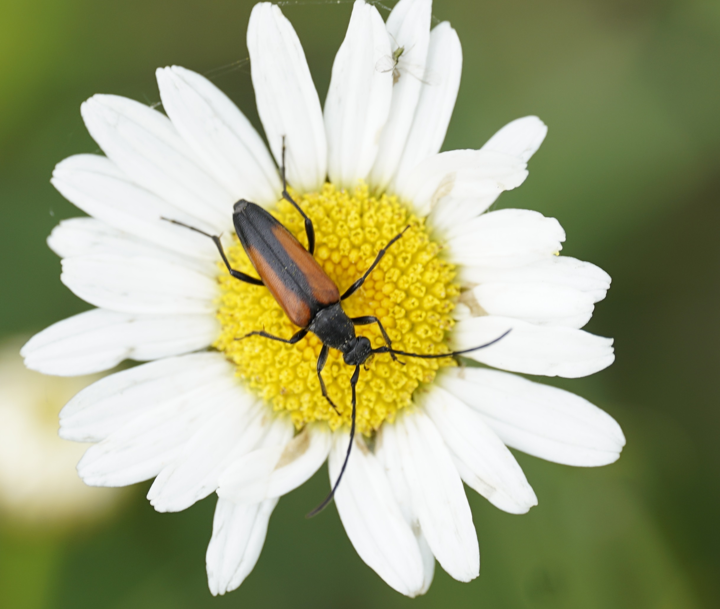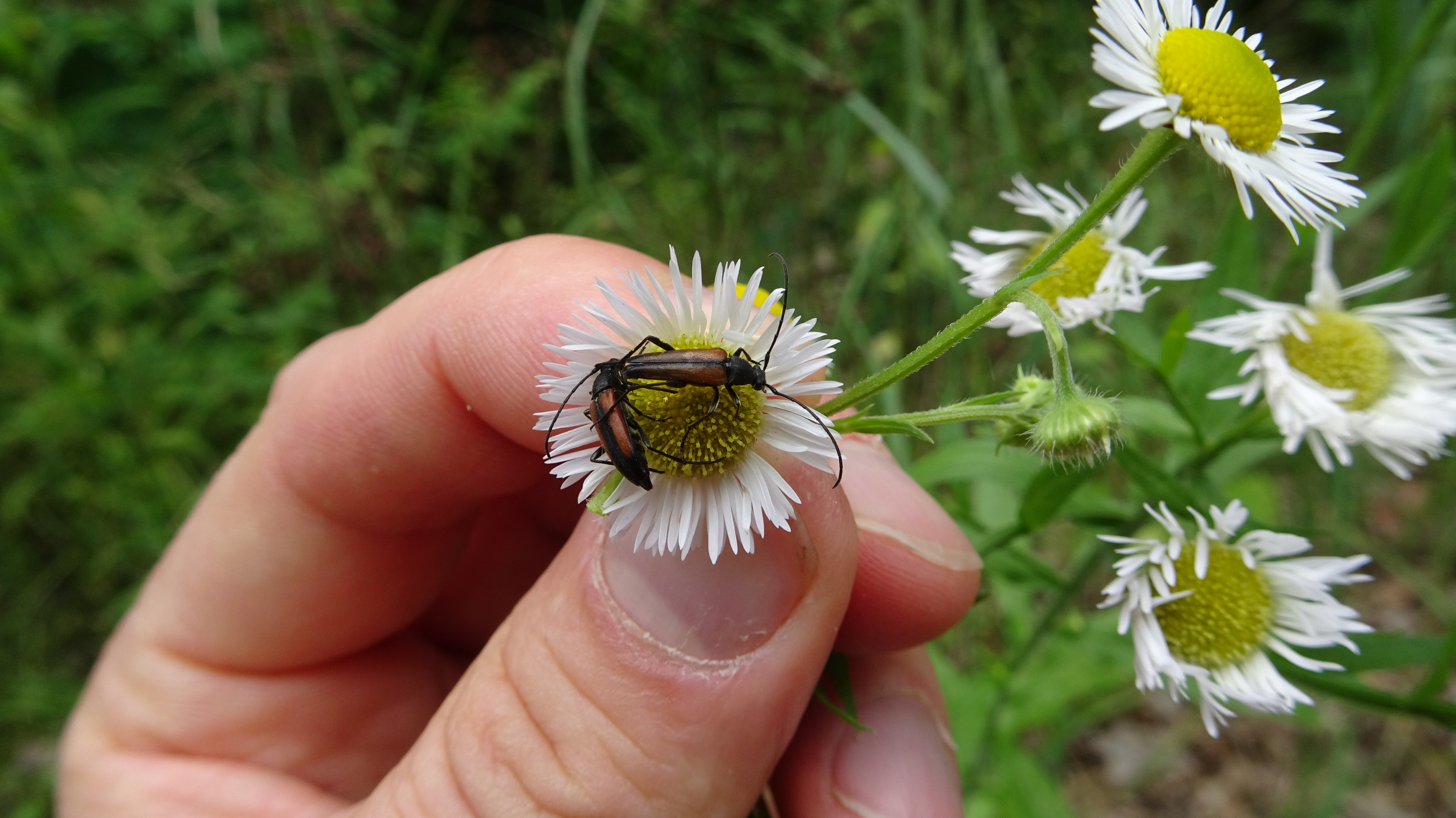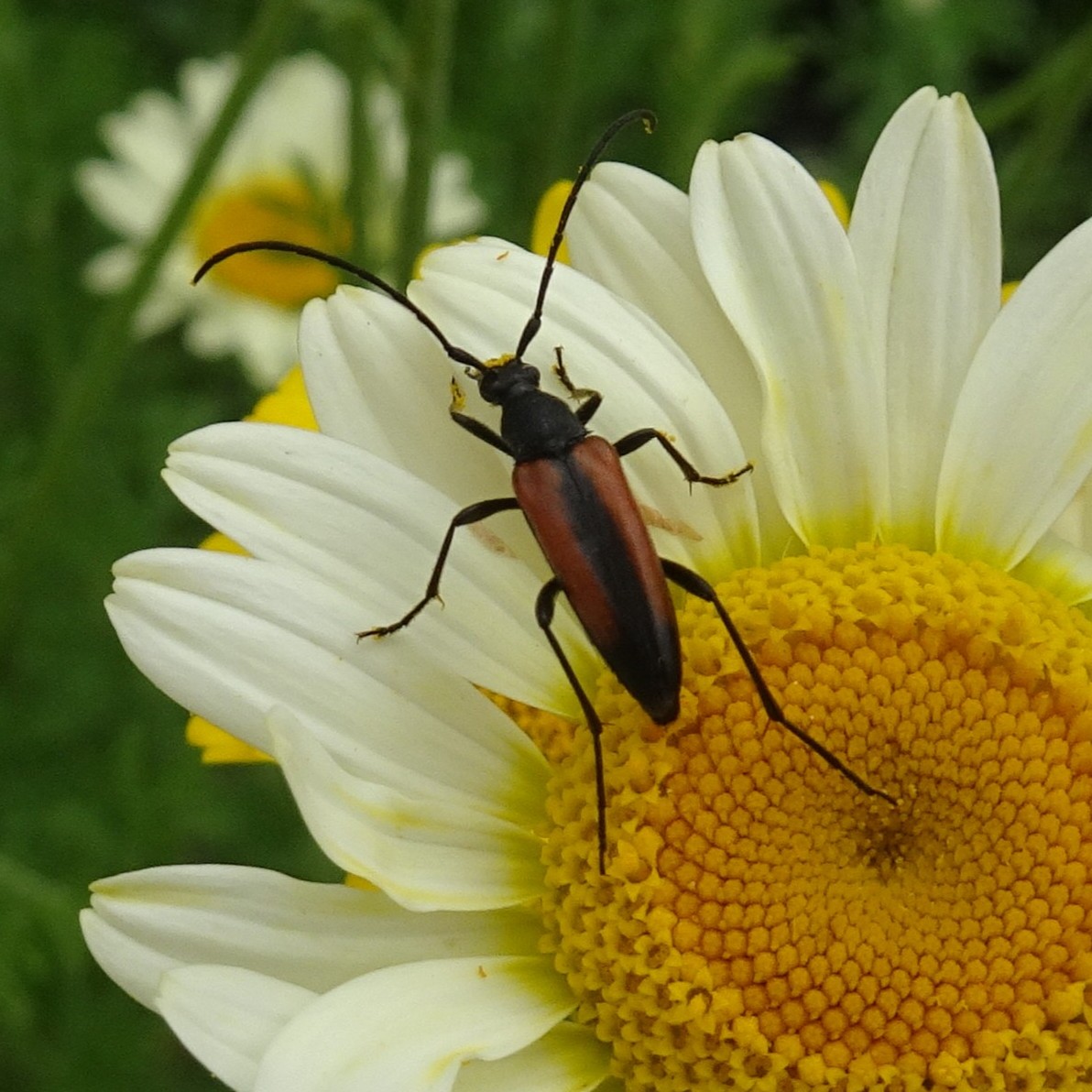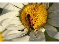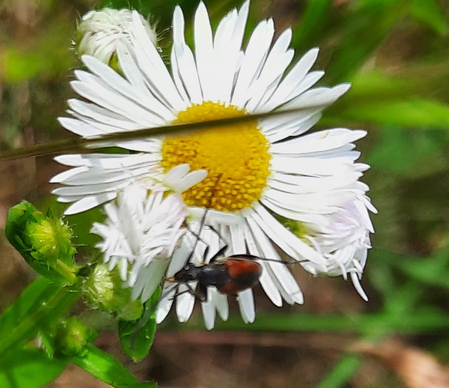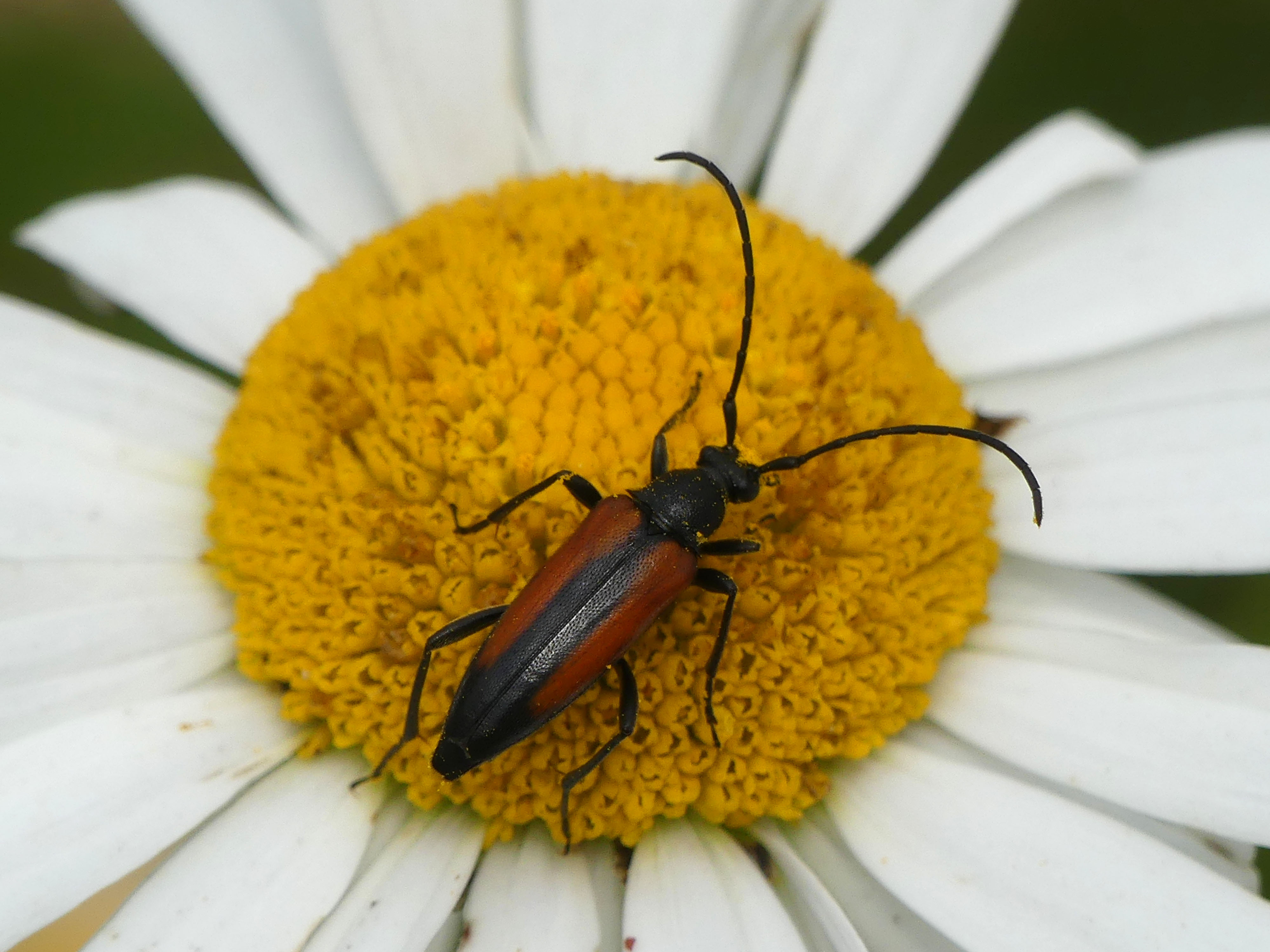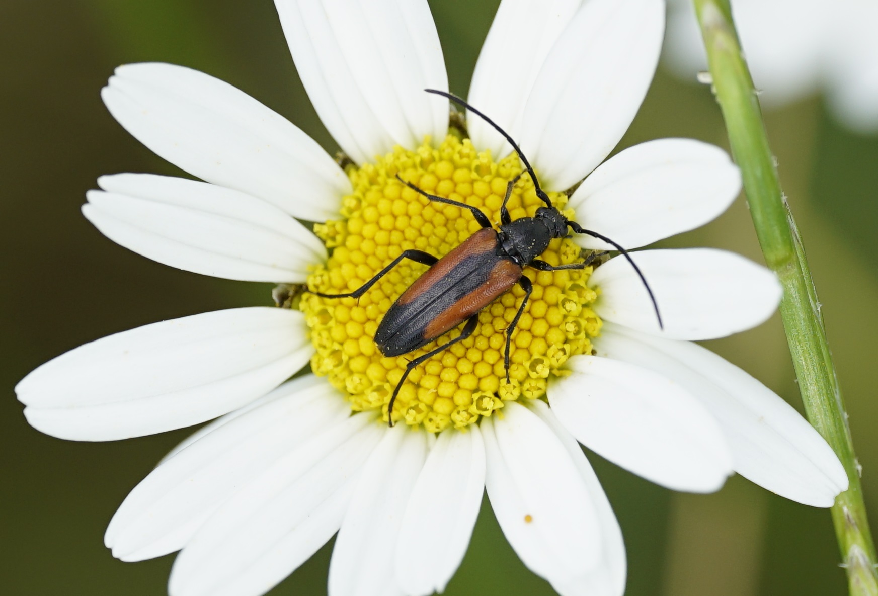 Kleiner Schmalbock (Stenurella melanura (Linnaeus, 1758)) am 14.06.2018 im Tharandter Wald am Triebischsee. auf einer kleinen mit Margeriten und Einjährigem Feinstrahl bewachsenen Fläche von nur 1 qm zählten wir 15 Exemplare