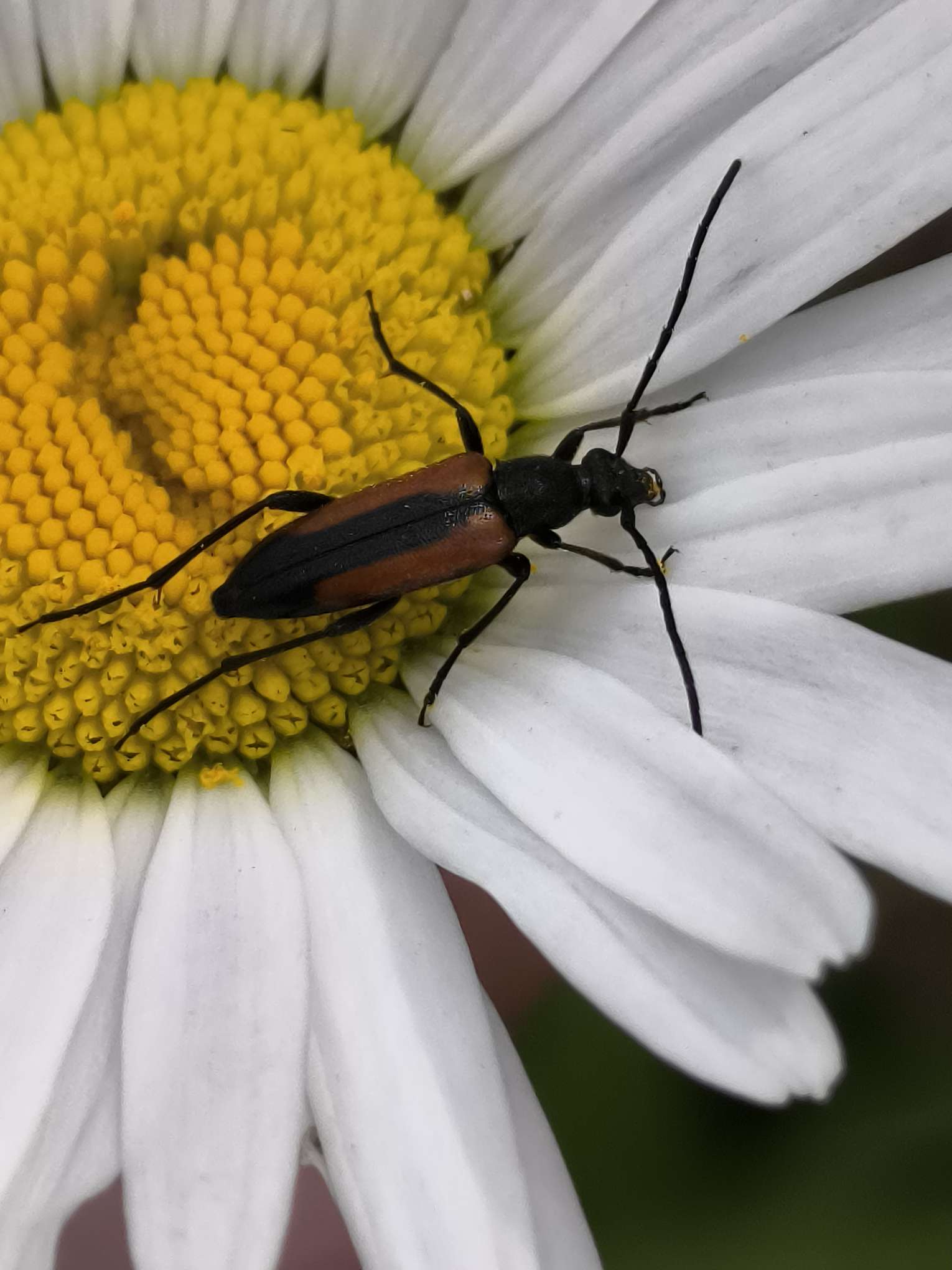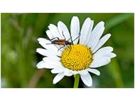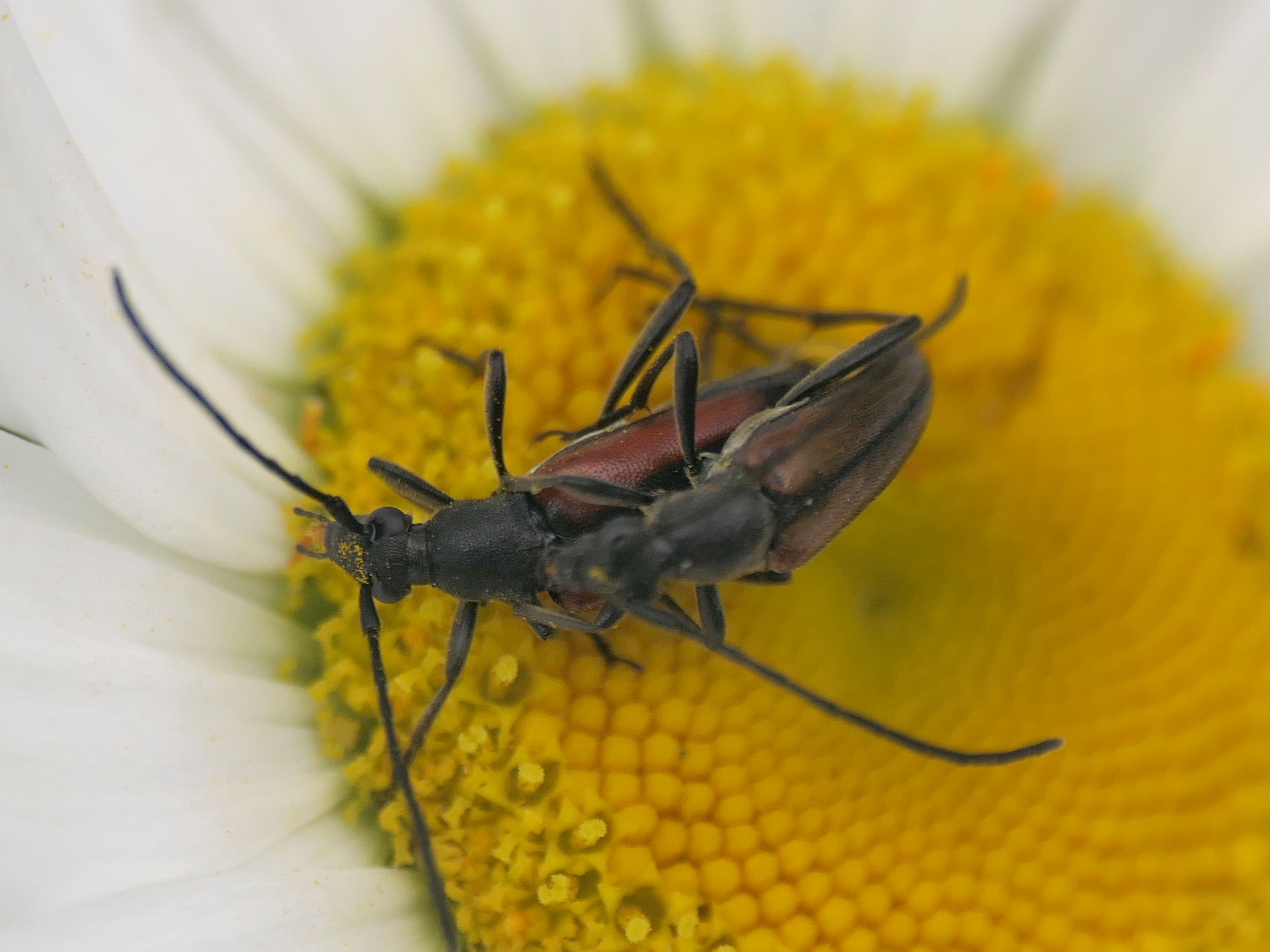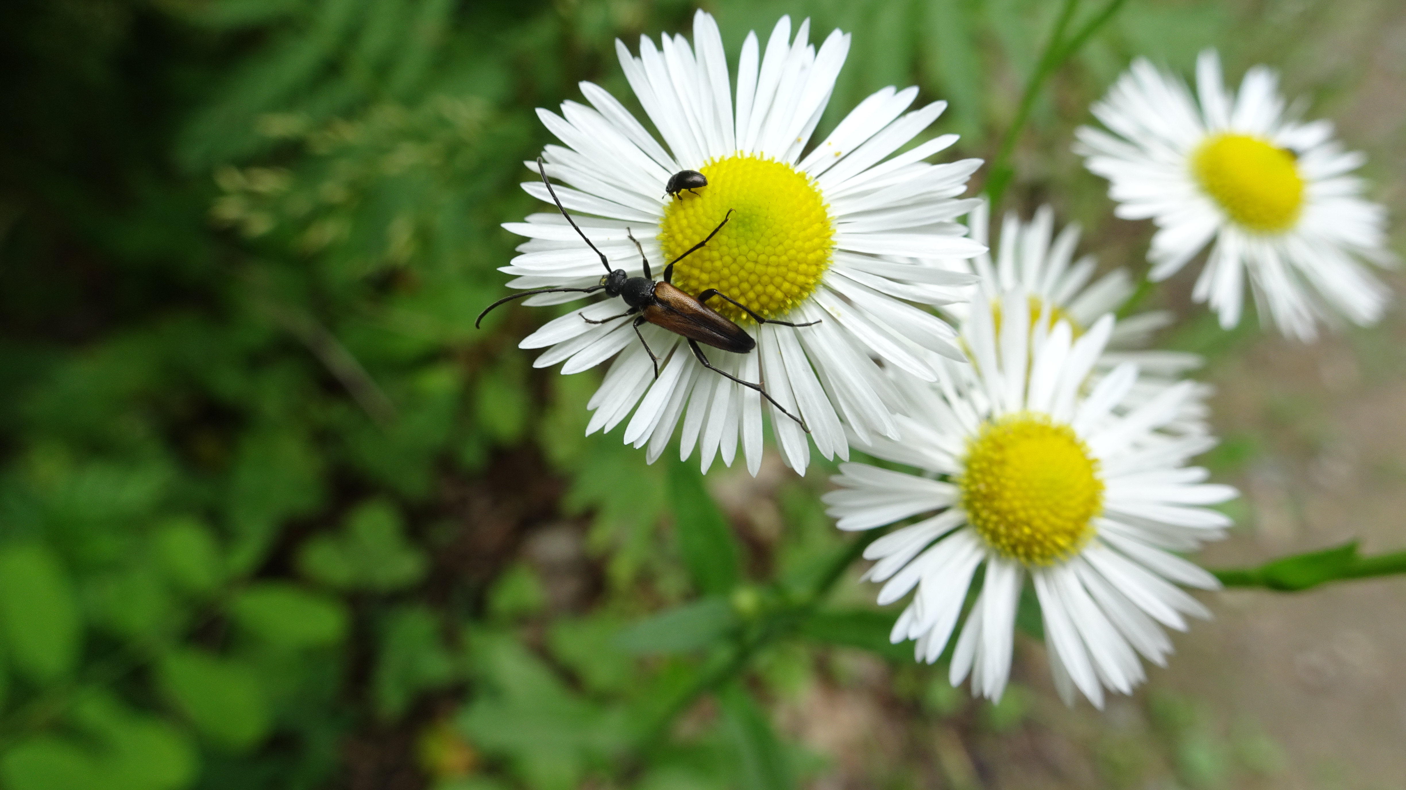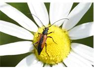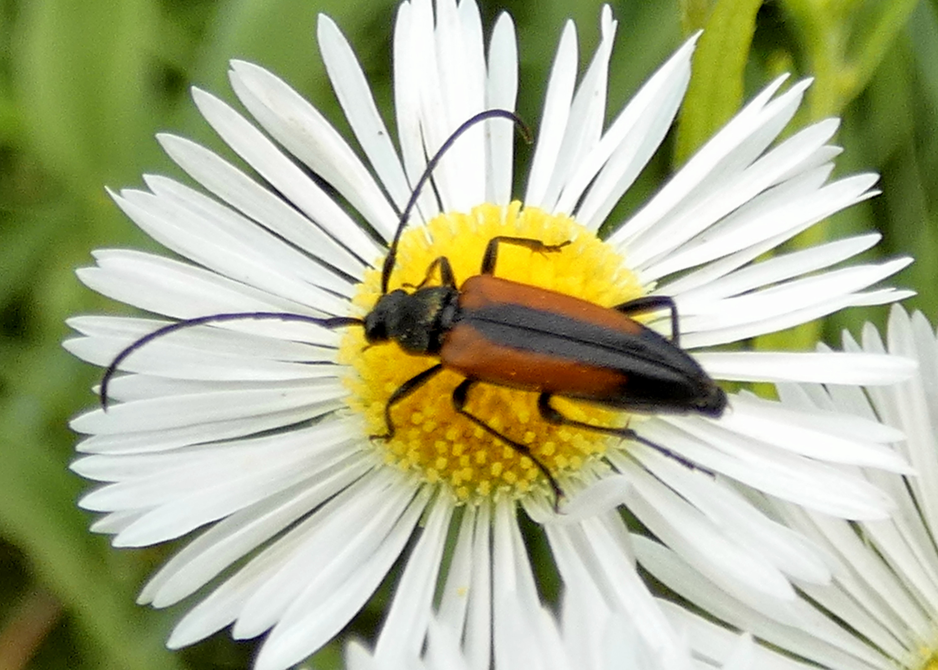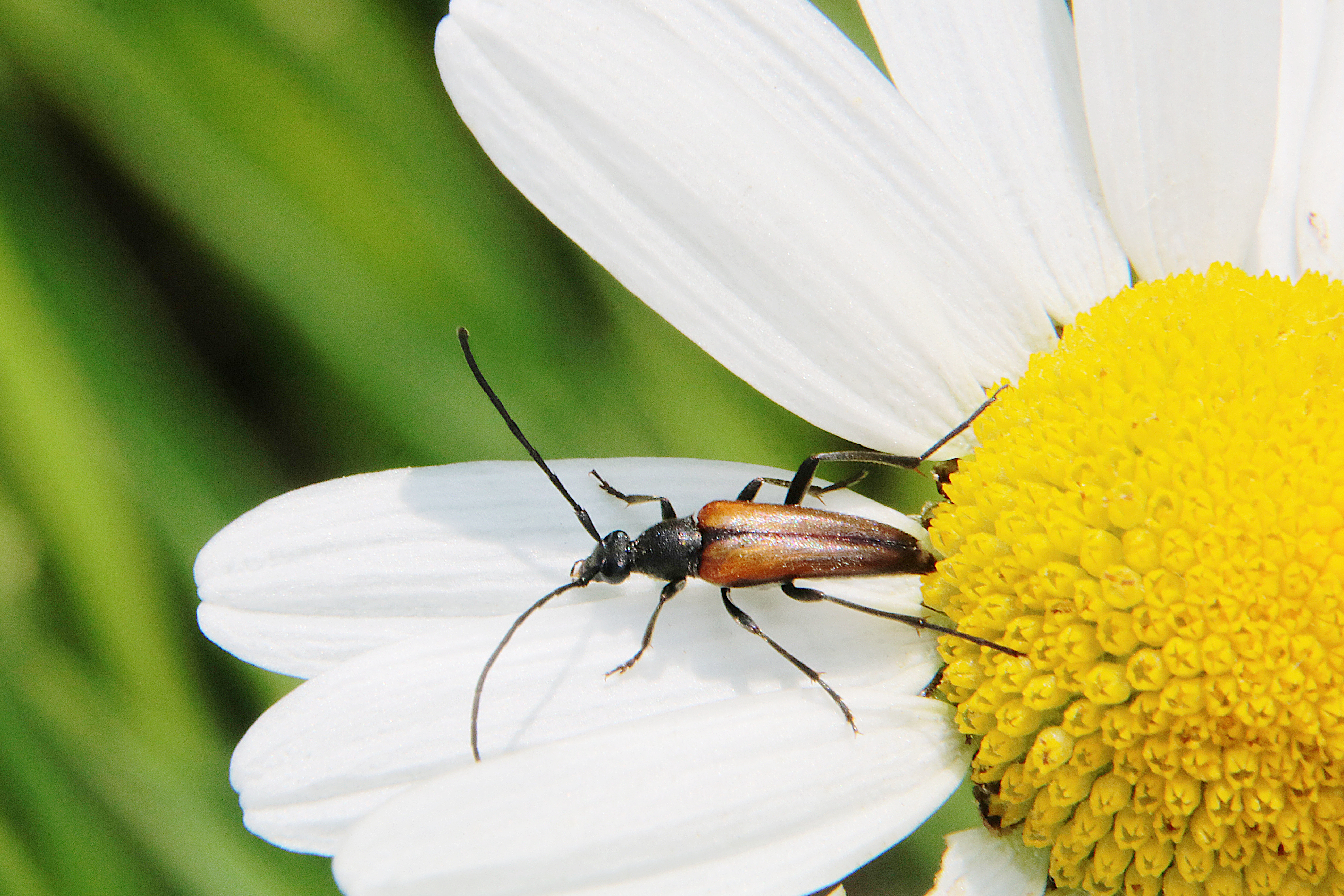 Kleiner Schmalbock (Stenurella melanura (Linnaeus, 1758)) am 14.06.2018 im Tharandter Wald am Triebischsee. auf einer kleinen mit Margeriten und Einjährigem Feinstrahl bewachsenen Fläche von nur 1 qm zählten wir 15 Exemplare