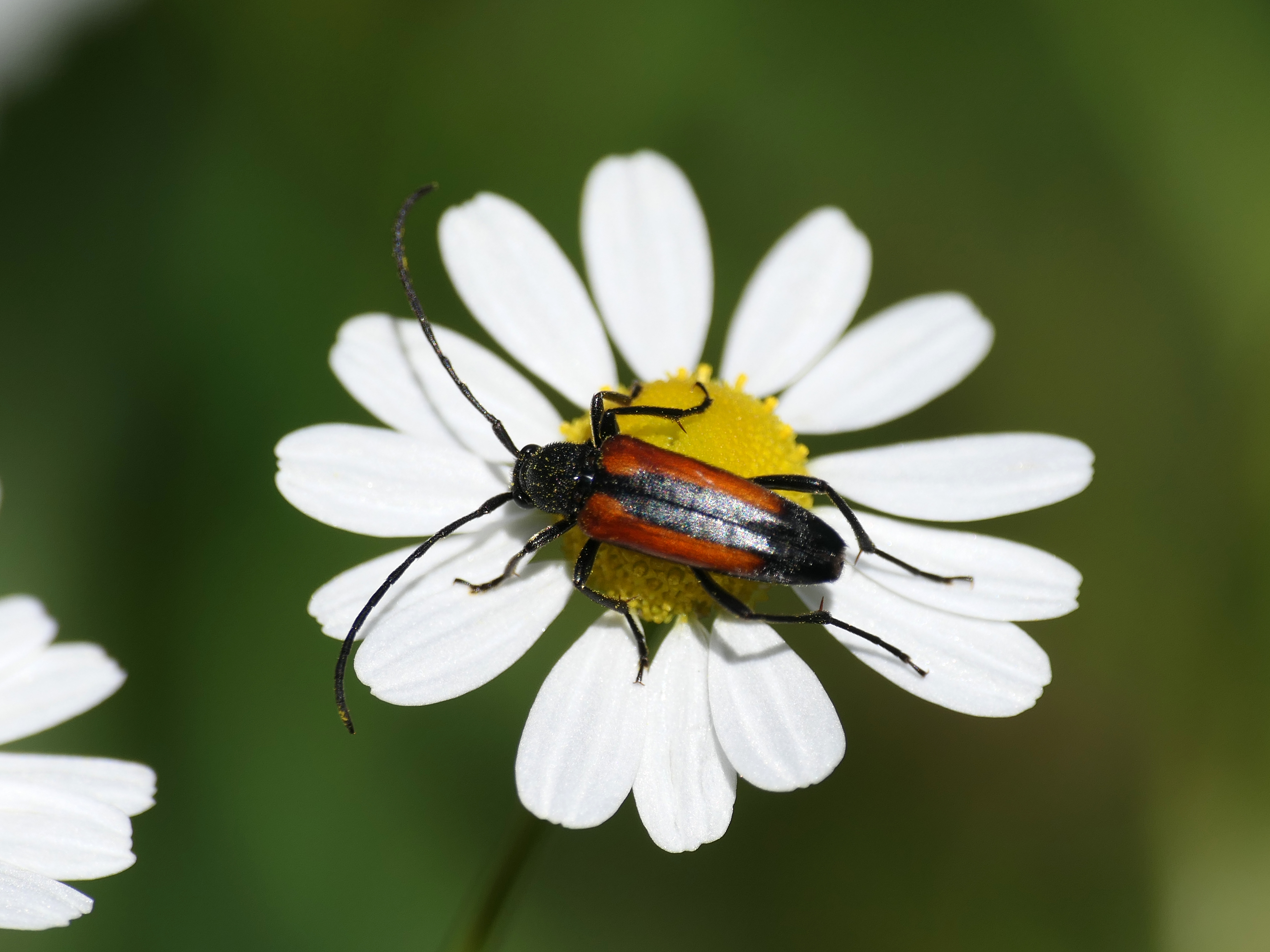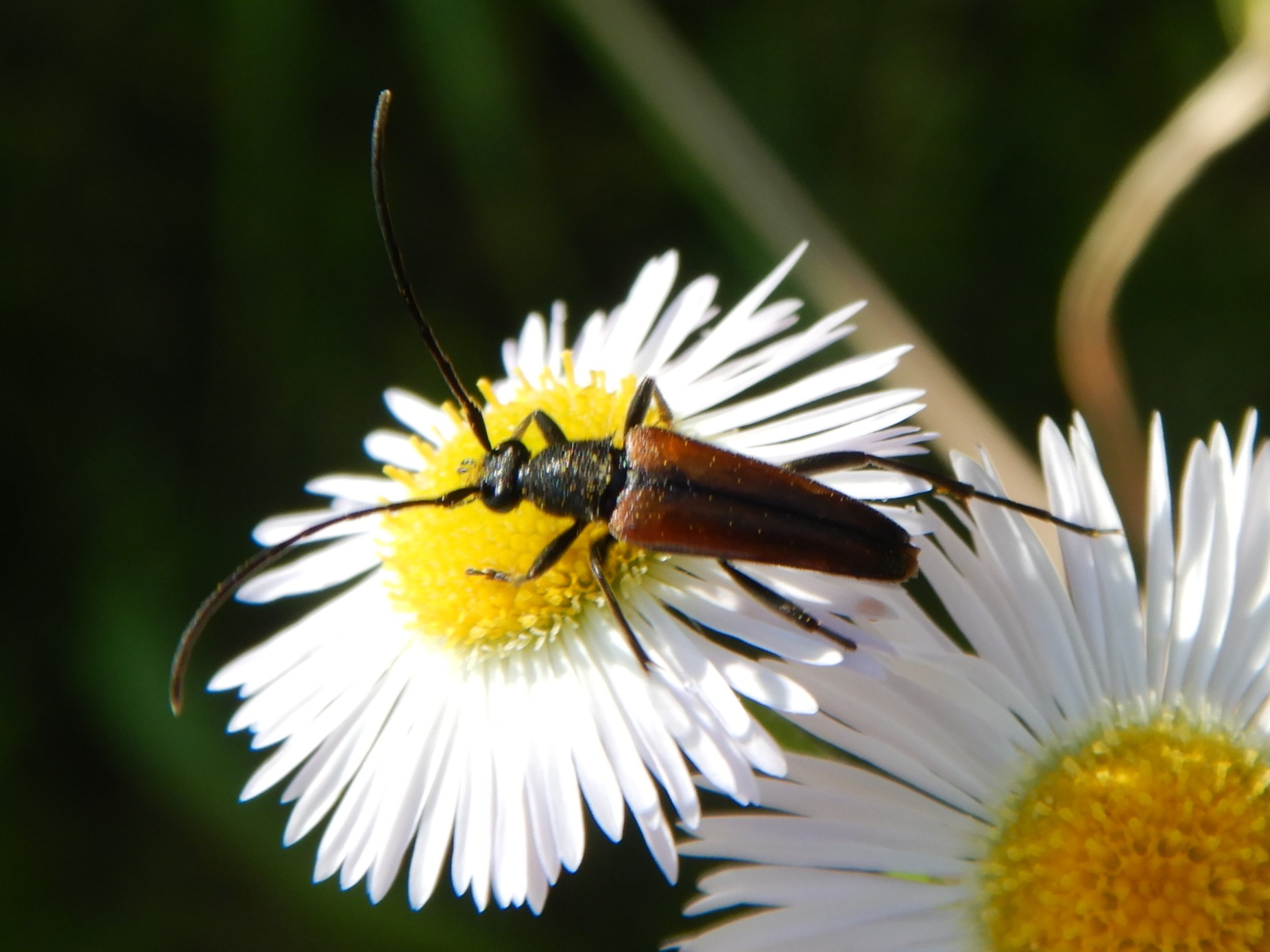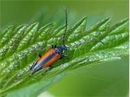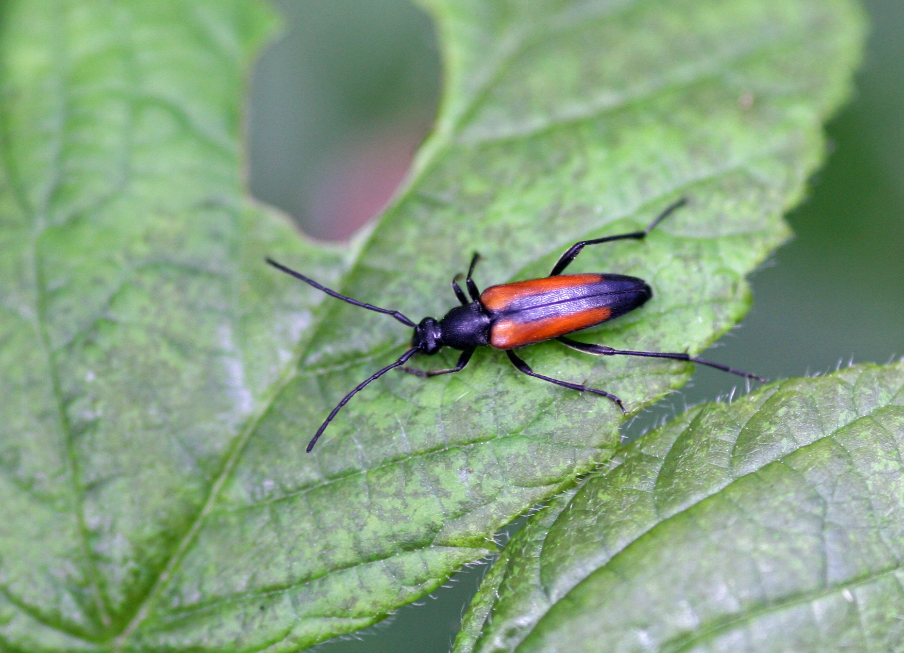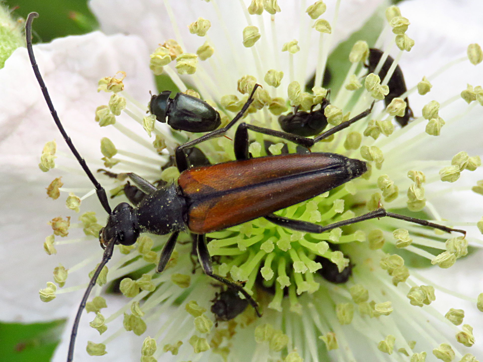 Männchen von Stenurella melanura in Radeberg im Mai 2008. Der zweite Käfer im Hintergrund ist Pseudovadonia livida.