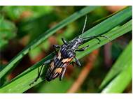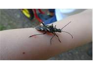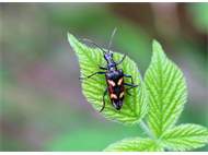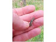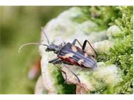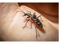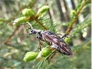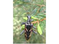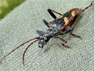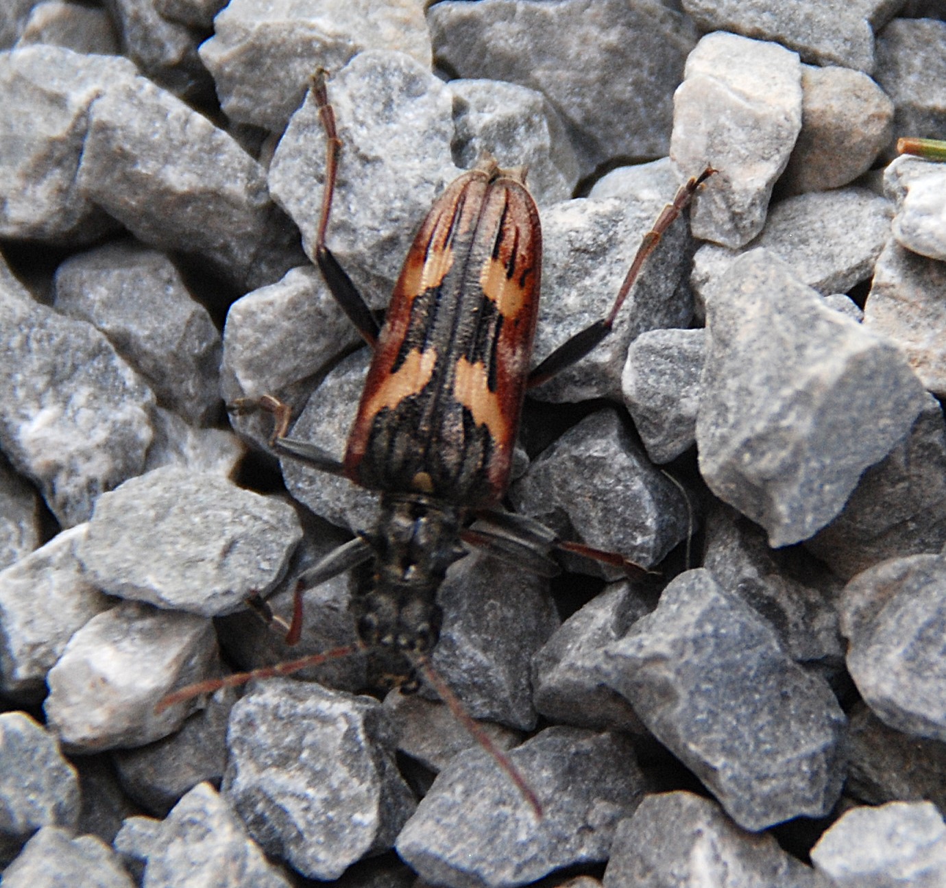 Rhagium bifasciatum, in einem Fichtenstangenholz mit starken Kiefernüberhältern setzte er sich auf die Hose meiner Frau, Mai 2015