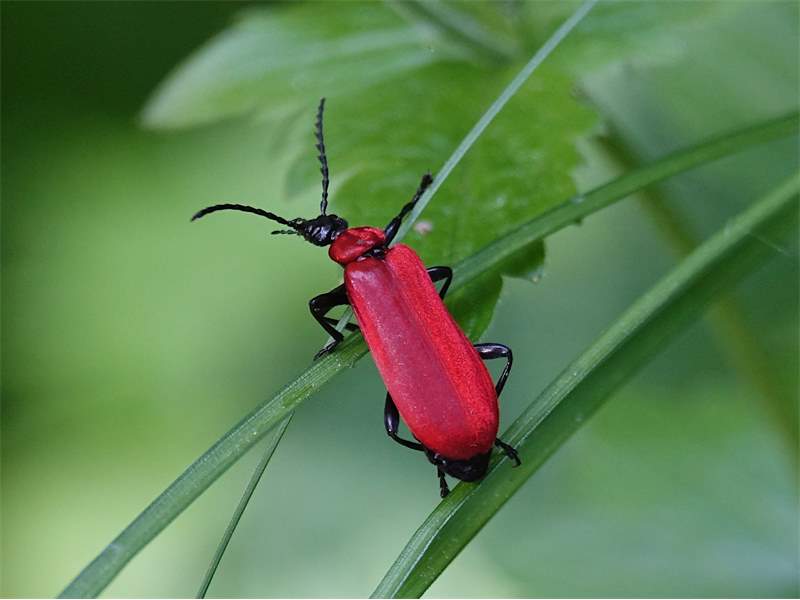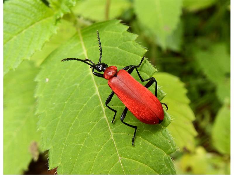 Thorax: Halsschild breiter als Kopf, aber schmaler als die Flügeldecken, feuerrot mit anliegender roter Behaarung; Beine schwarz; Flügeldecken nach hinten deutlich erweitert, ebenfalls feuerrot mit anliegender roter Behaarung.