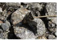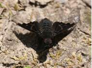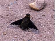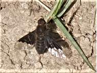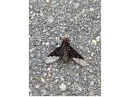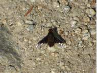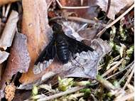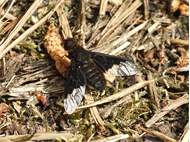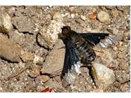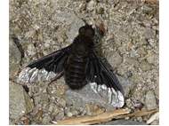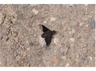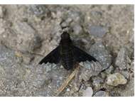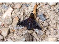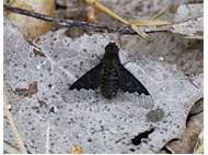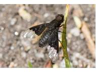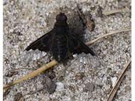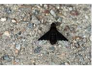Trauerschweber (Hemipenthes morio) an einem Waldweg, Hochhalde Trages bei Espenhain. Juni 2015