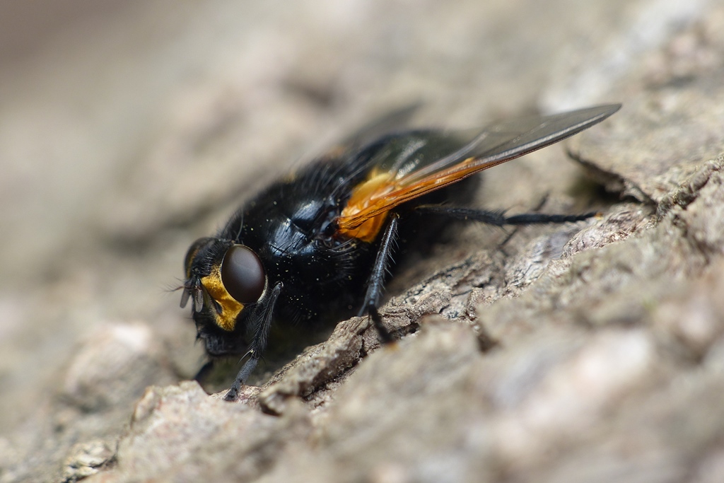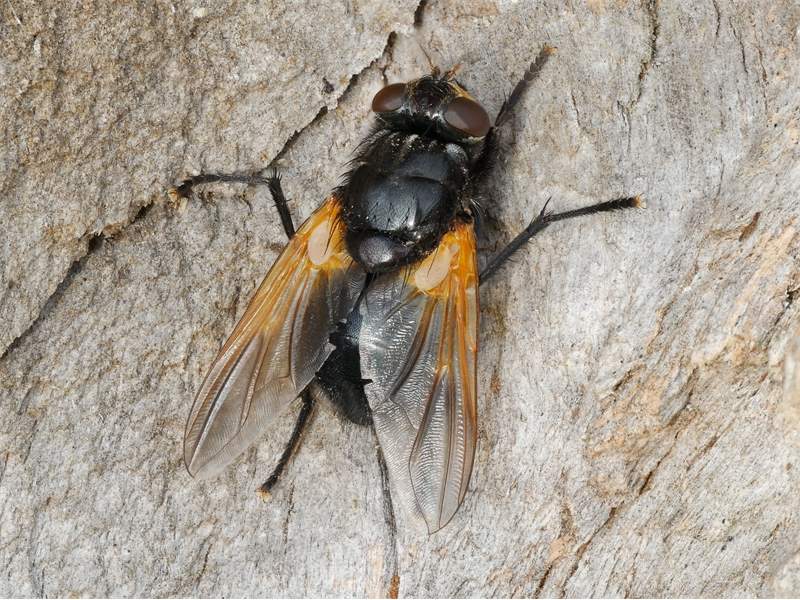 Thorax: glänzend schwarz mit schwarzen Borsten, Flügelbasis orange, Scutellum dunkel rotbraun oder schwarz.