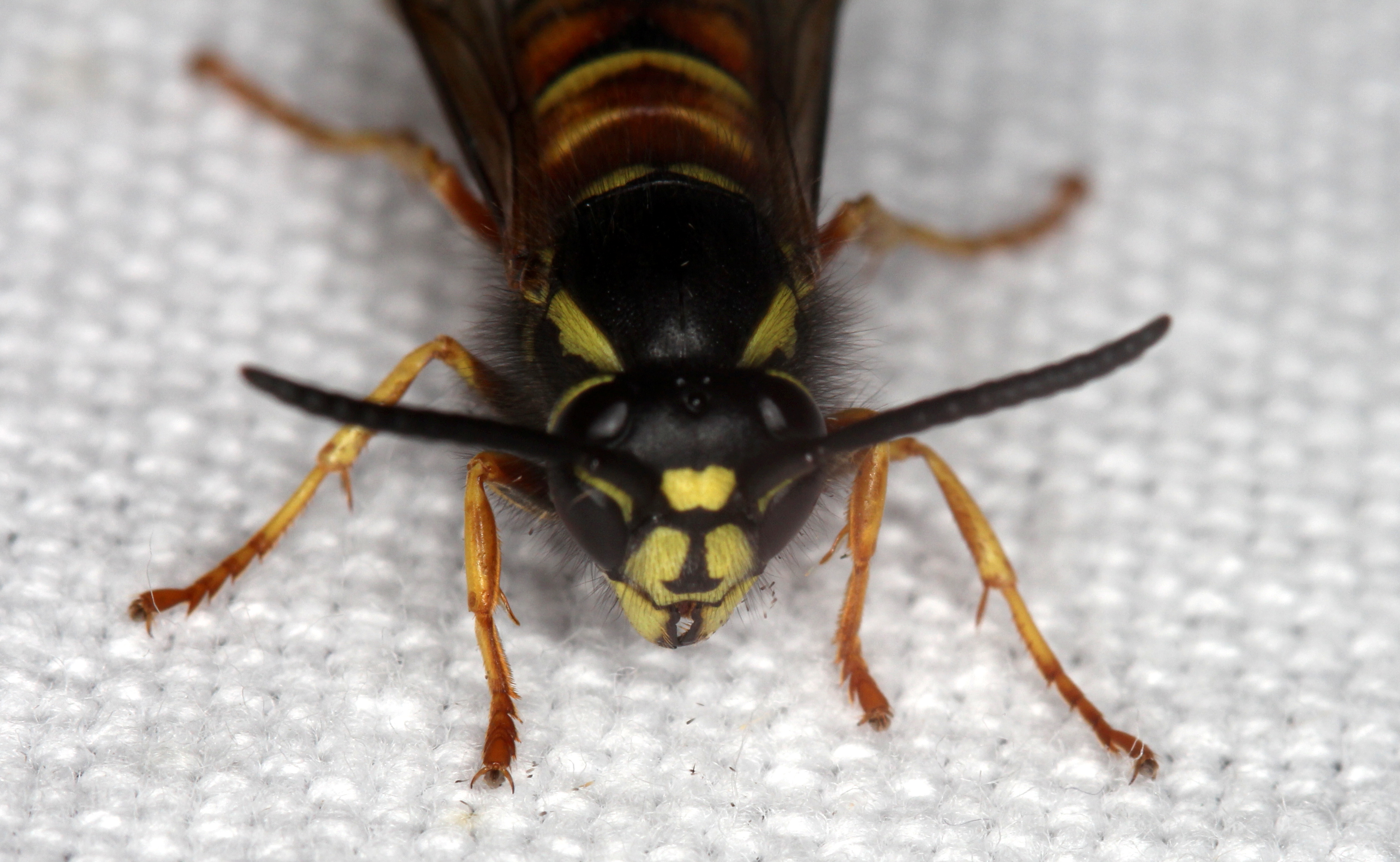 Kopf: Kurzkopfwespe. Clypeus gelb, mit schwarzem, ankerförmigen Fleck; Augenbucht unten gelb, oben schwarz; Augenhinterrand gelb, bei der Königin nur oben gelb; Fühler schwarz, fein gelb behaart, Basalglied (Scapus) der Männchen vorn gelb.