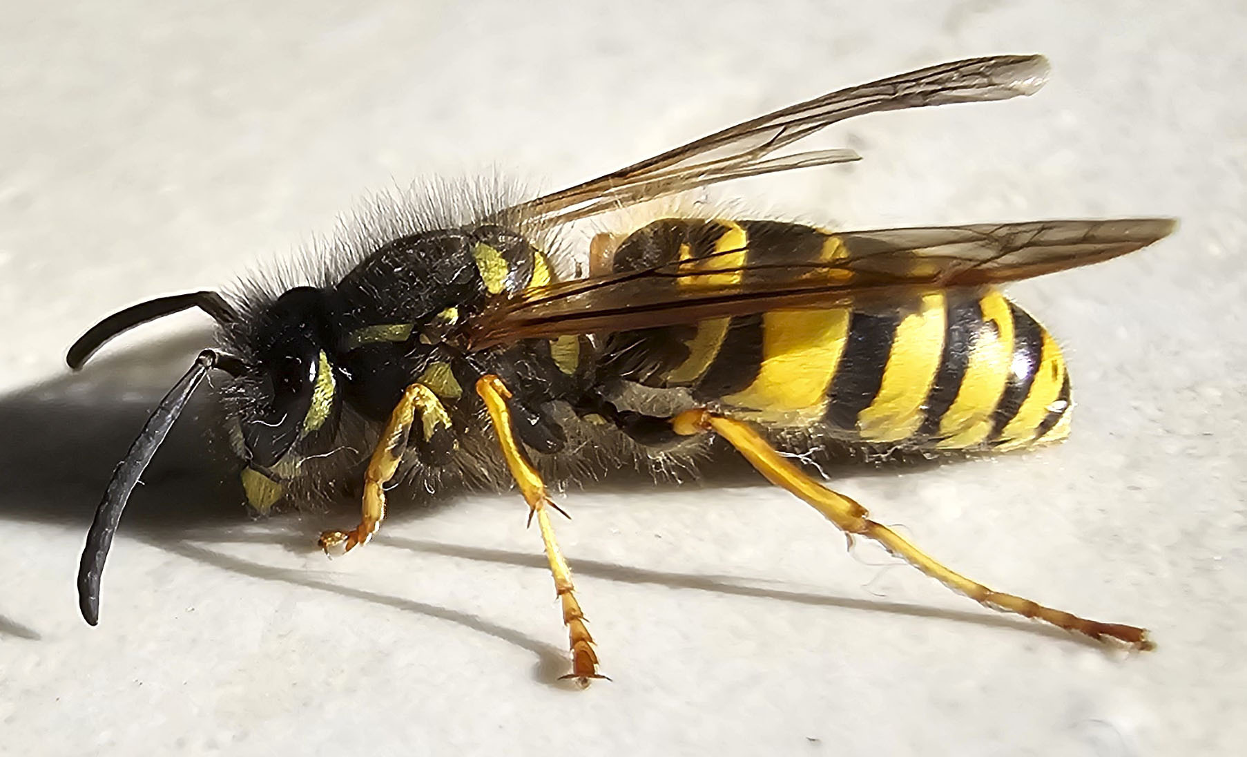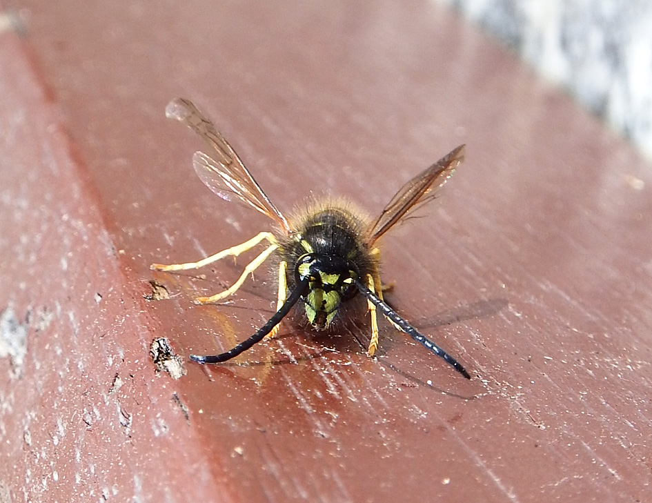 Gemeine Wespe auf einem Rastplatz an der Triebisch. An ihrem "Gesicht" ist sie eindeutig von der Deutschen Wespe zu unterscheiden. (13.09.2016) Für ein Stückchen von unserem Frühstück ließ sie sich gern fotografieren.