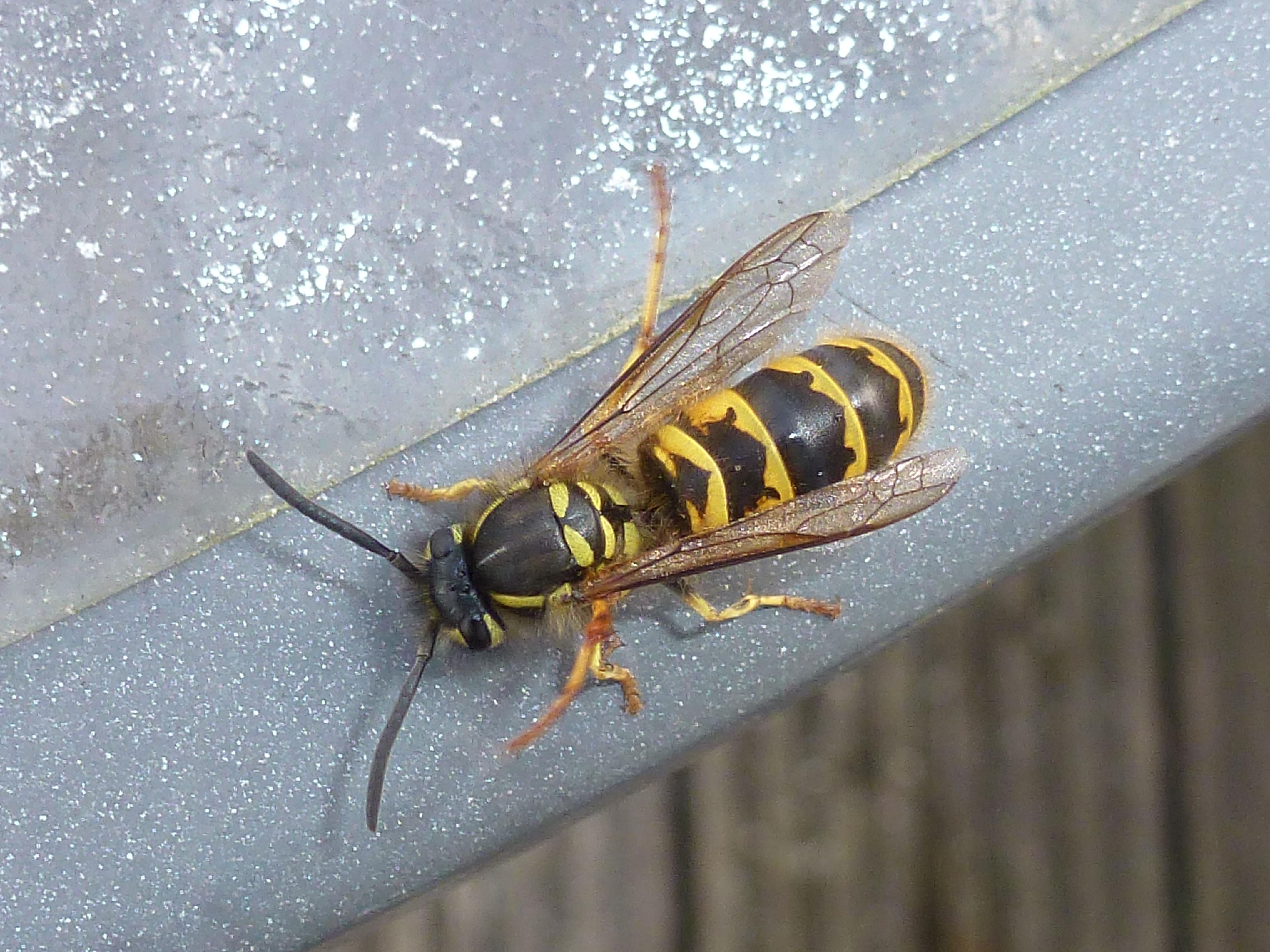 Gemeine Wespe (Vespula vulgaris) auf Freisitz am Untermarkt in Görlitz, Oktober 2014