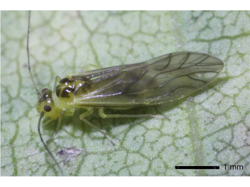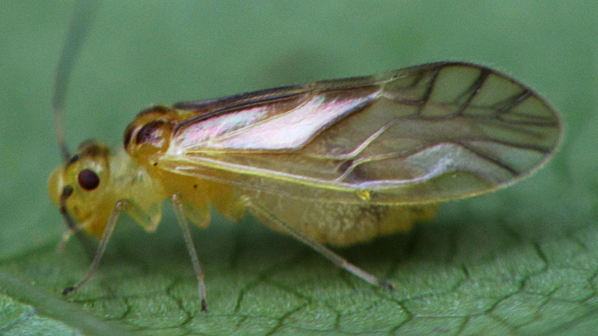 Kopf: Oben mit einem keilförmigen, braunen Fleck, der zum Clypeus hin dünner wird; Maxillarpalpen an der Spitze dunkler; Augen schwarz mit Sexualdimorphismus, Männchen haben deutlich größere Augen als Weibchen (Männchen sehr selten); Antennen kürzer als Vorderflügel und dunkel; 3. und 4. Antennenglied oft gelblich.