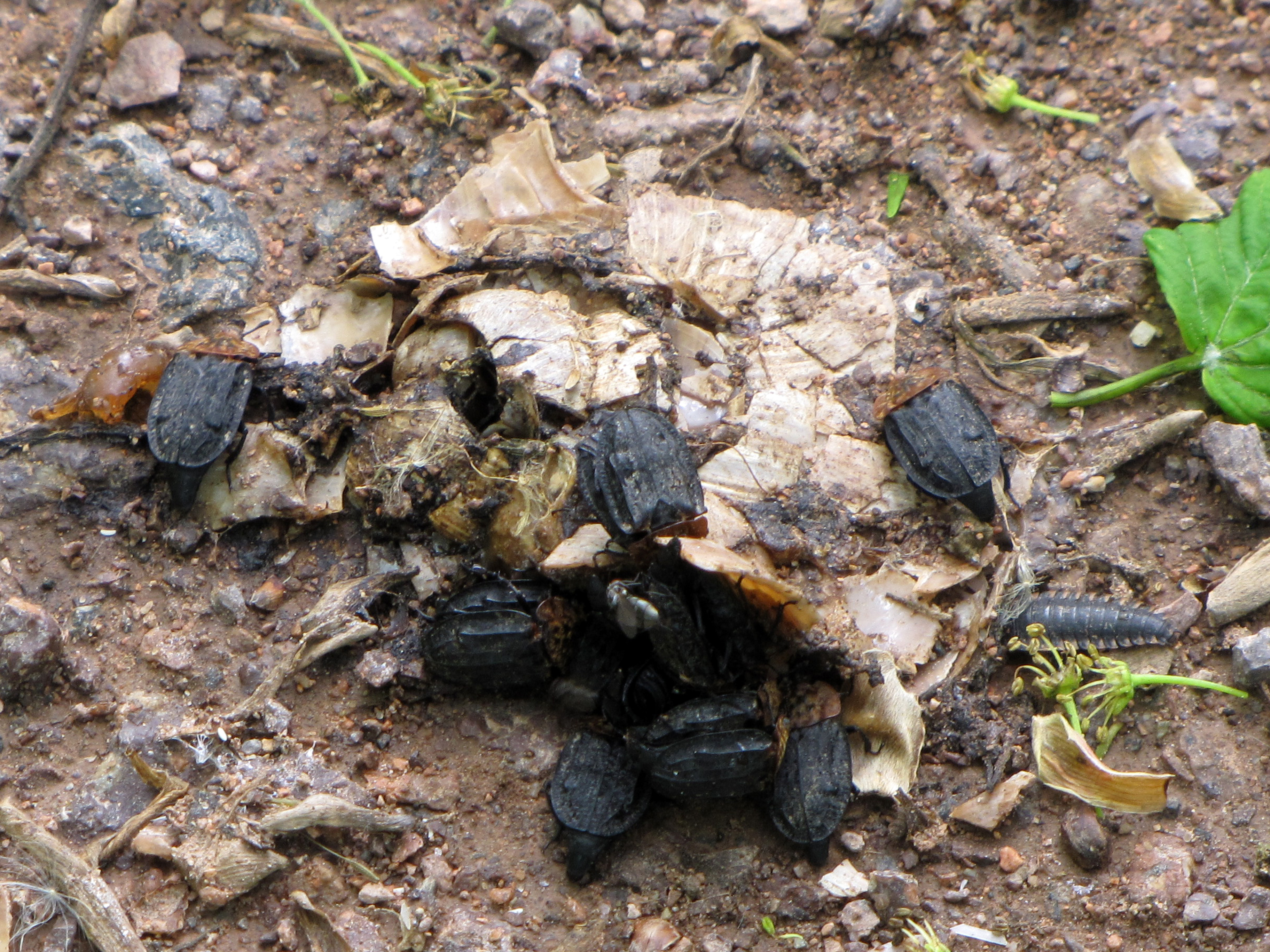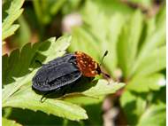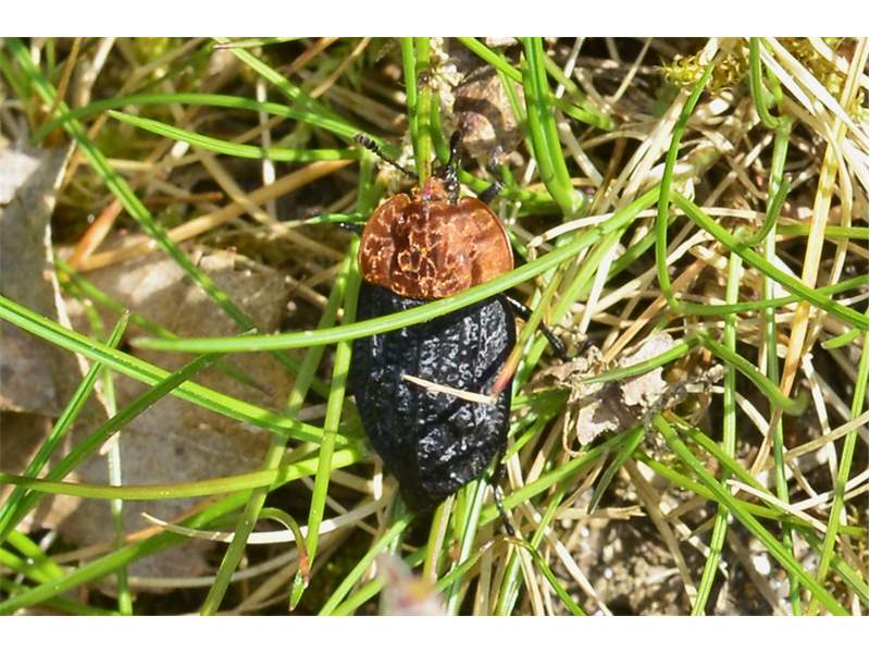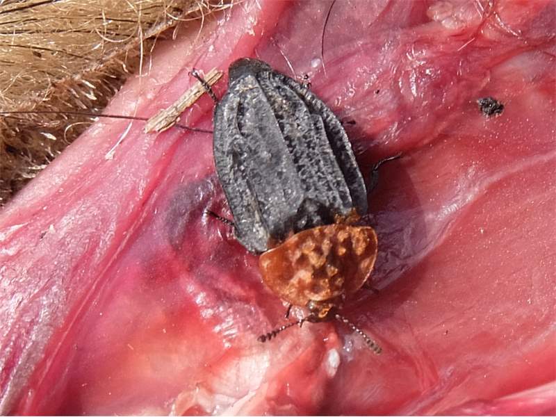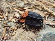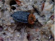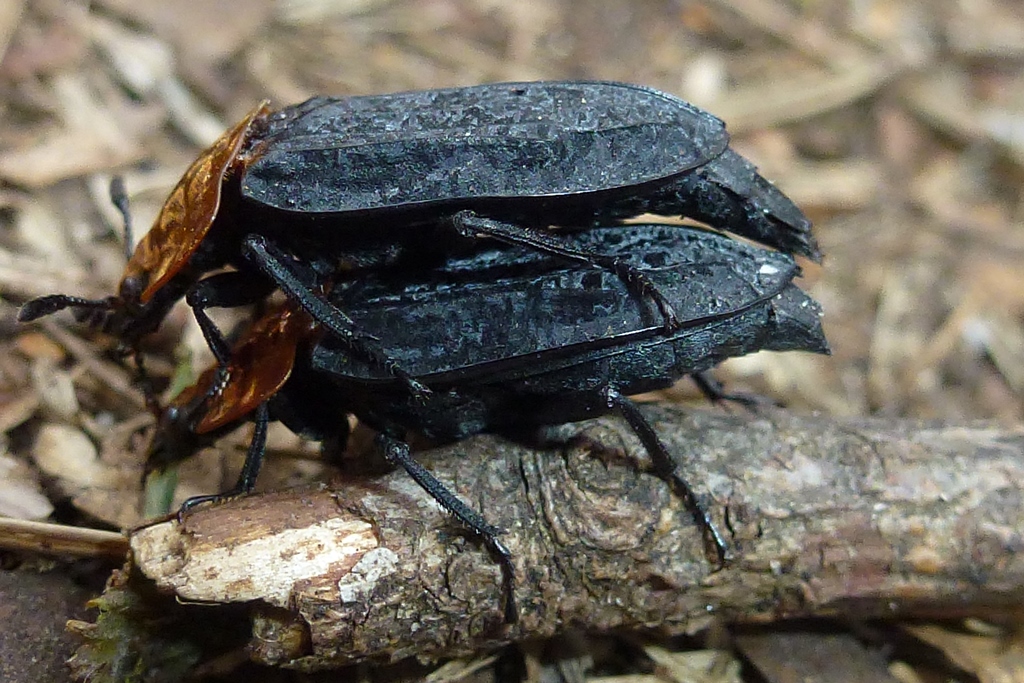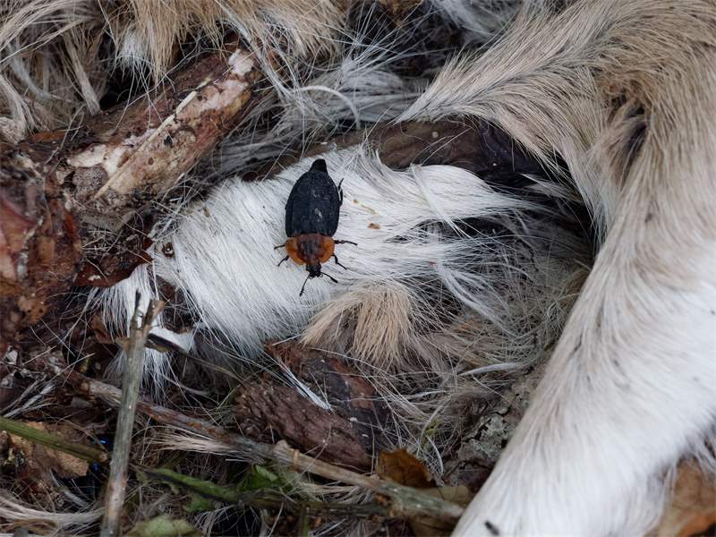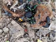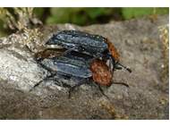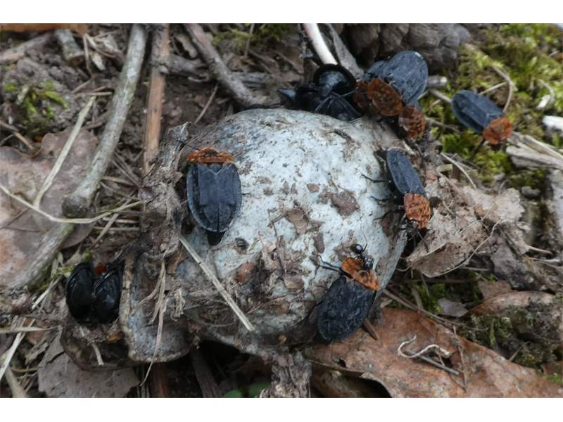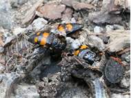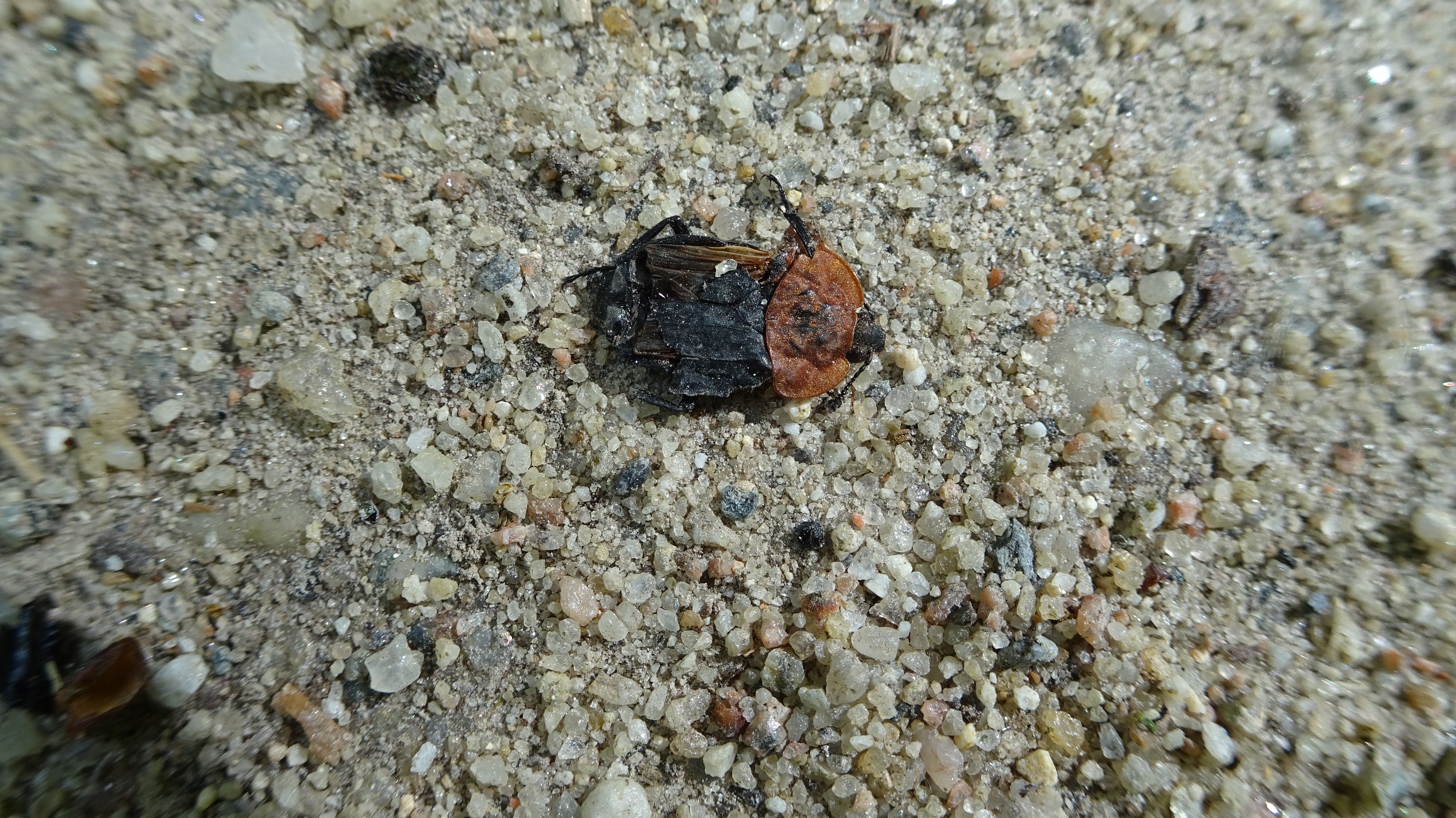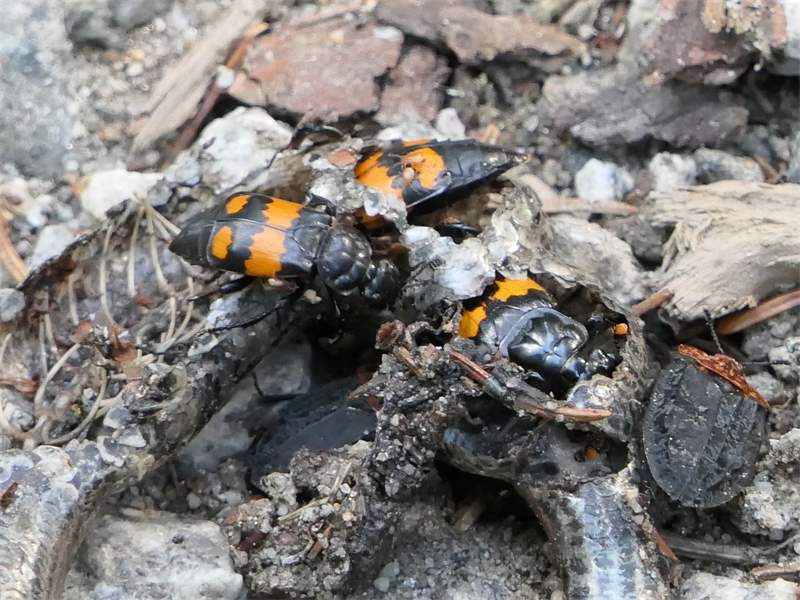 beide Käfer unten, rechts und links, zusammen mit Nicrophorus vespilloides und evtl. Nicrophorus vespillo, Sohland, 05.08.2020 (© Konrad Thomas)( Bild vergrößern)