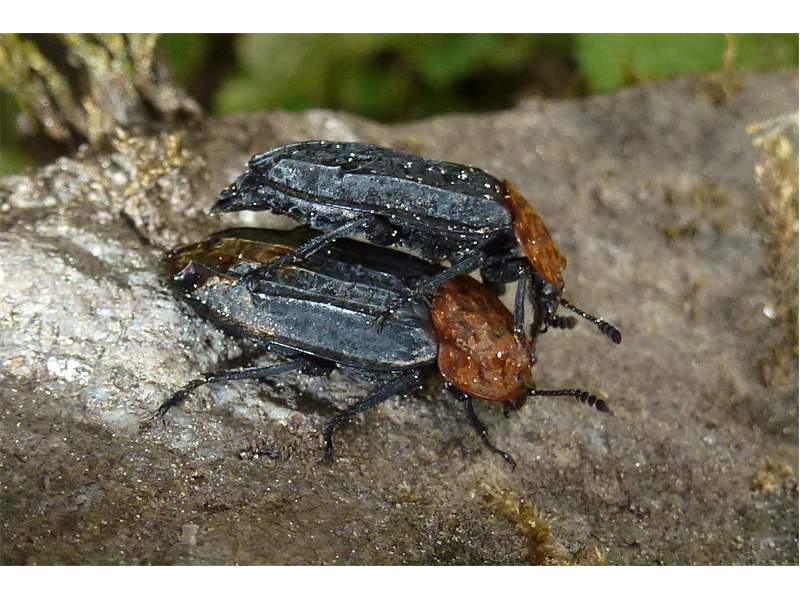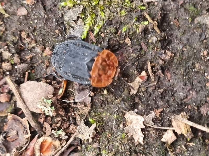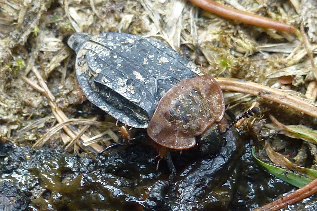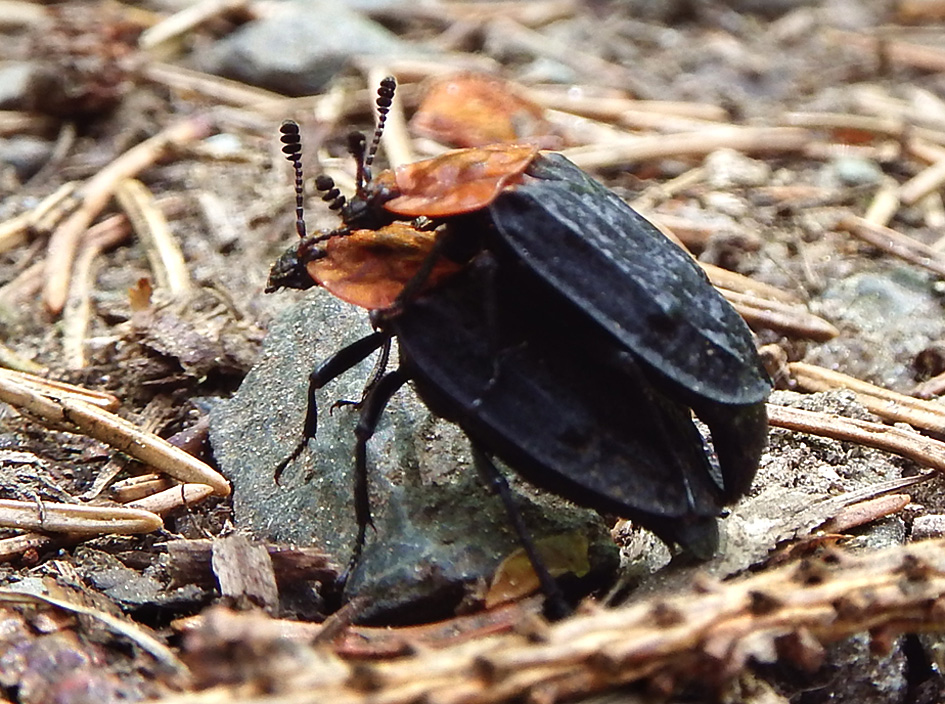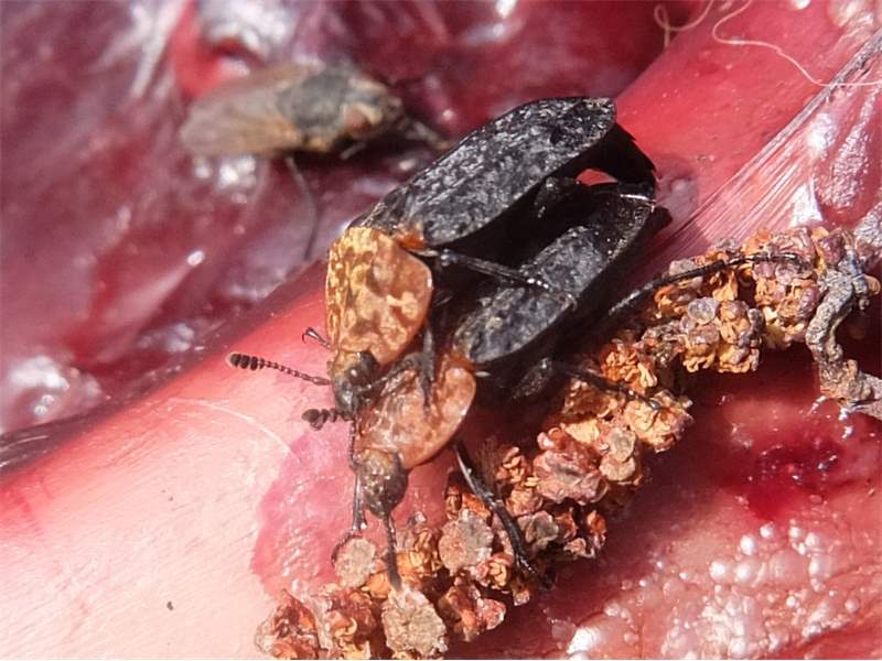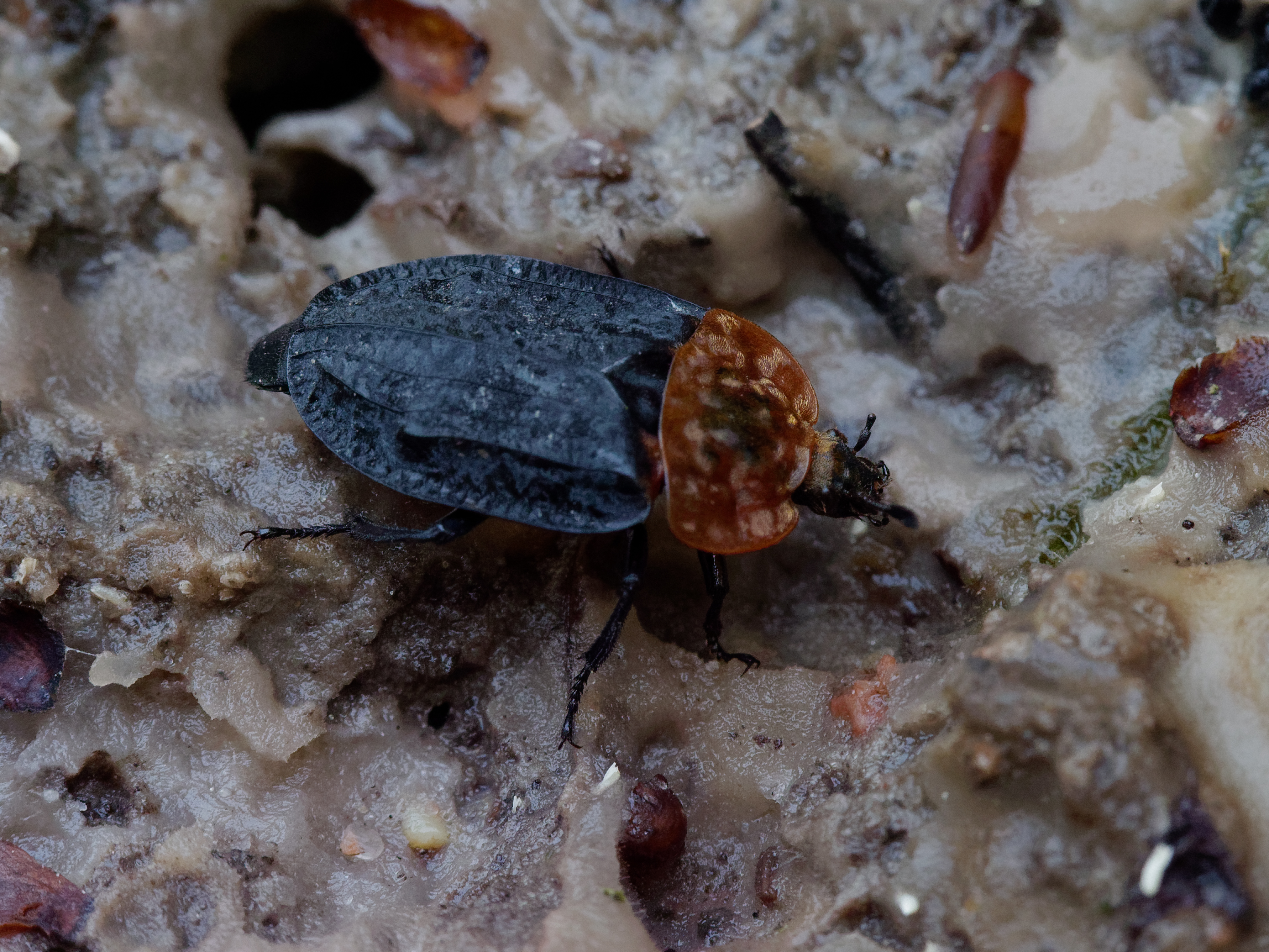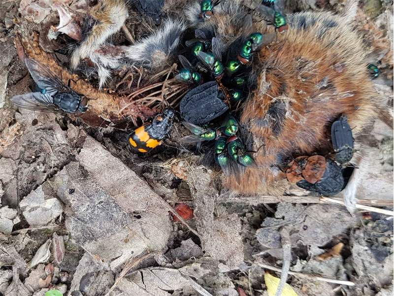 beide Käfer unten, rechts und links, zusammen mit Nicrophorus vespilloides und evtl. Nicrophorus vespillo, Sohland, 05.08.2020 (© Konrad Thomas)( Bild vergrößern)