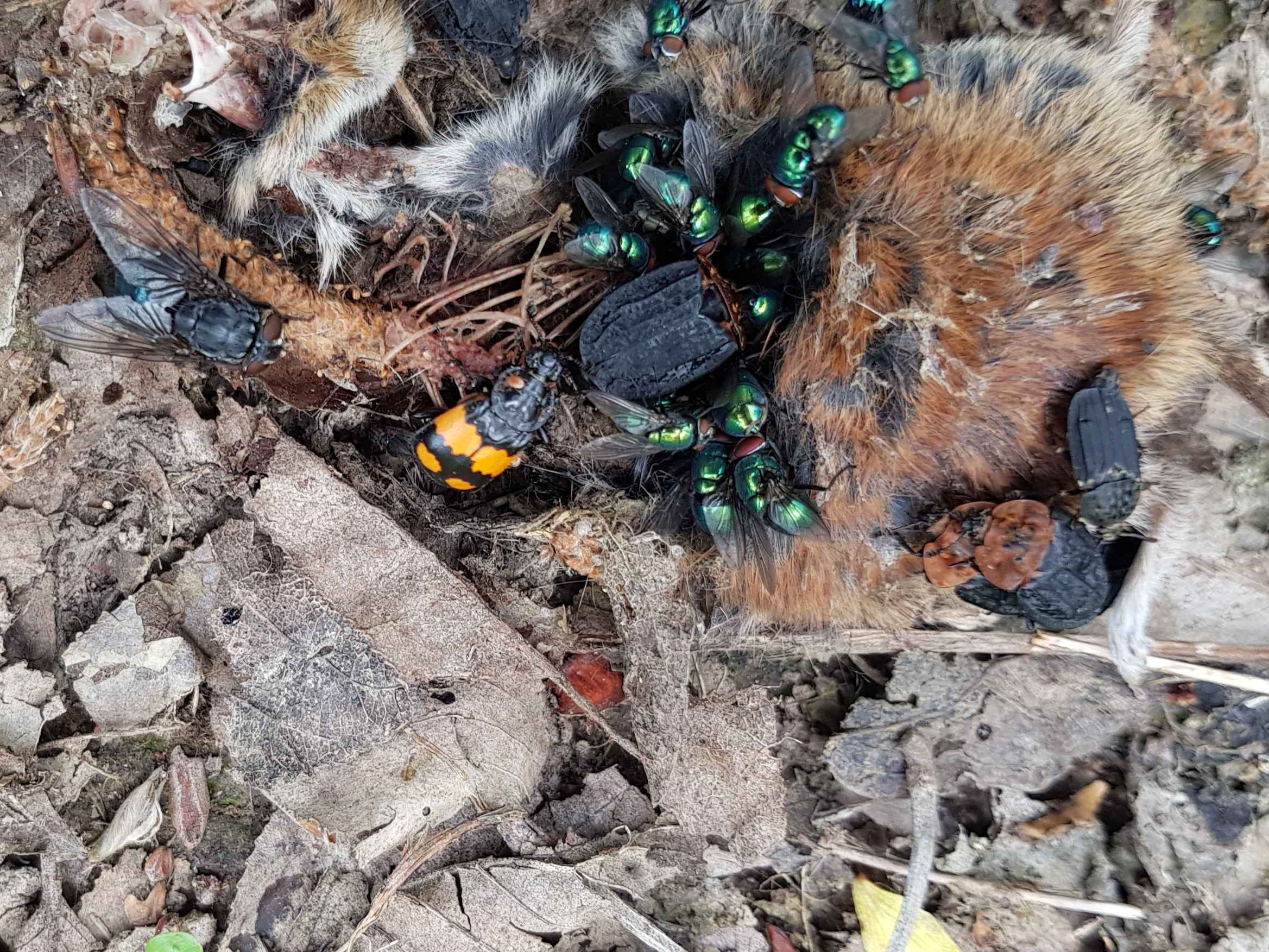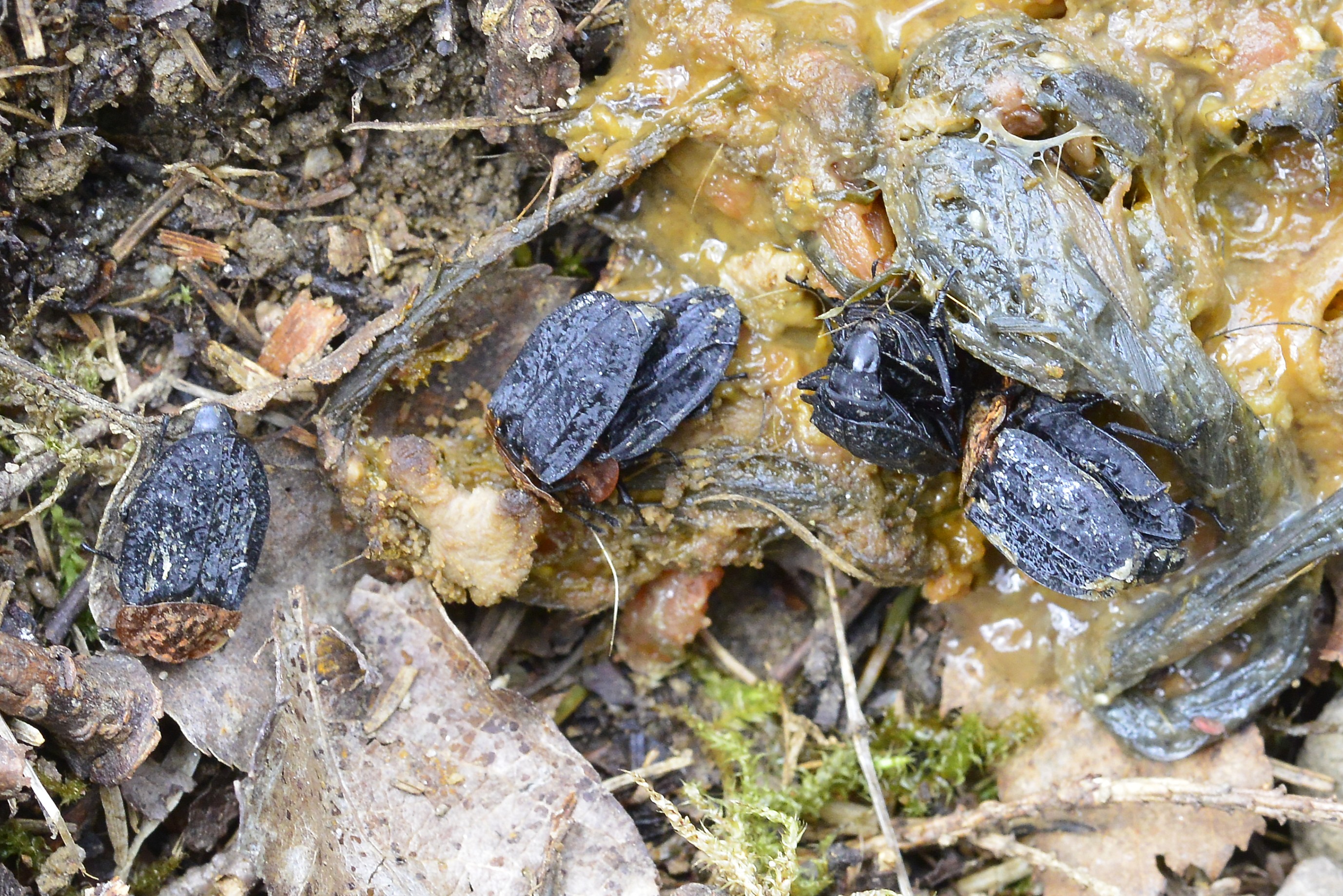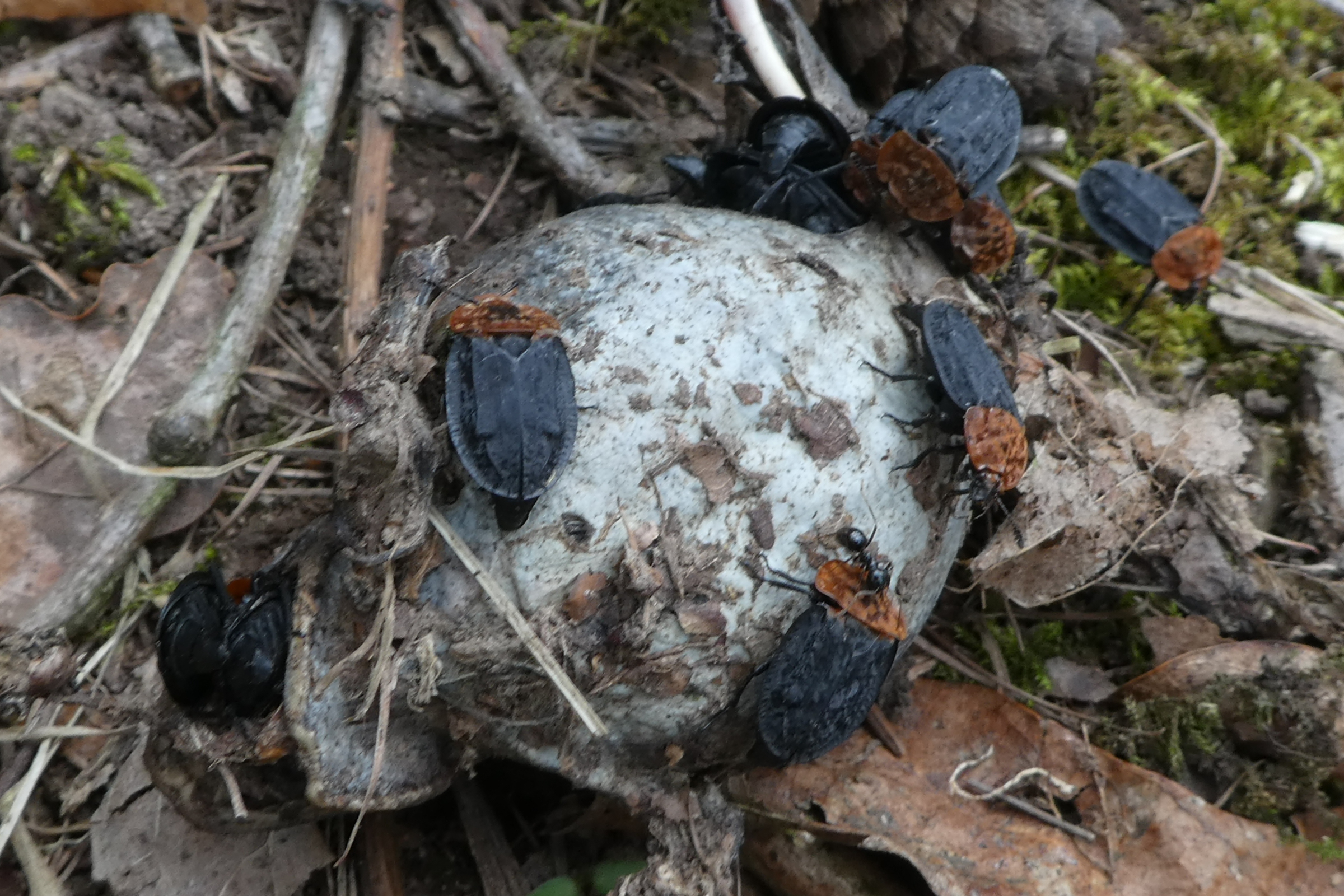 beide Käfer unten, rechts und links, zusammen mit Nicrophorus vespilloides und evtl. Nicrophorus vespillo, Sohland, 05.08.2020