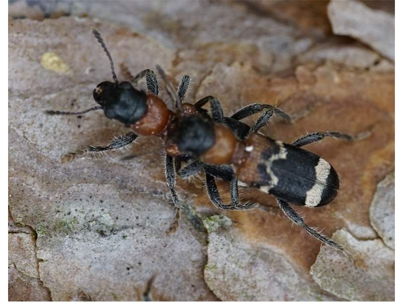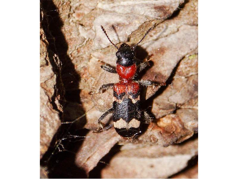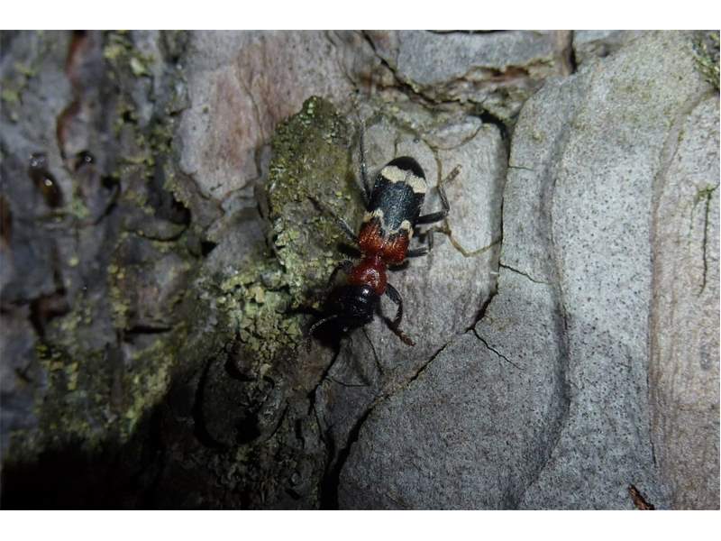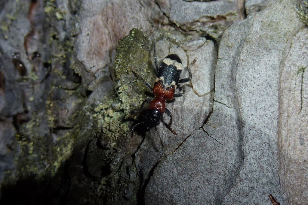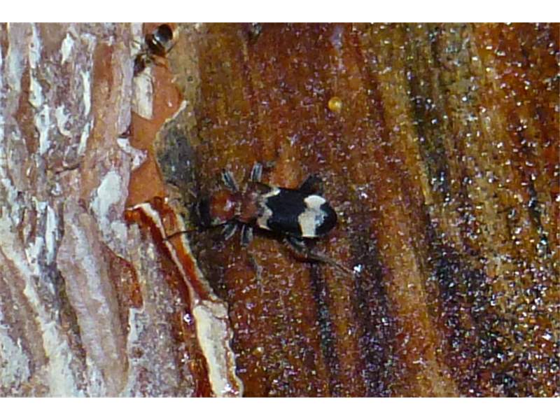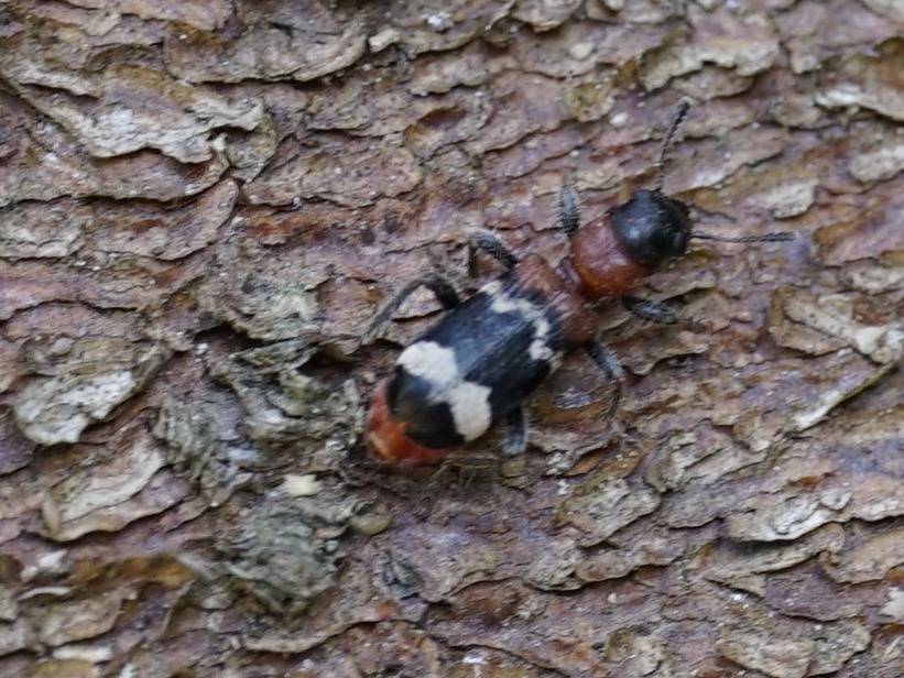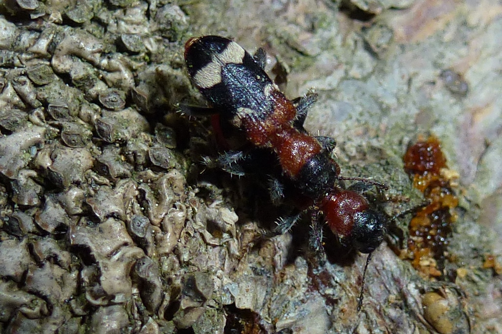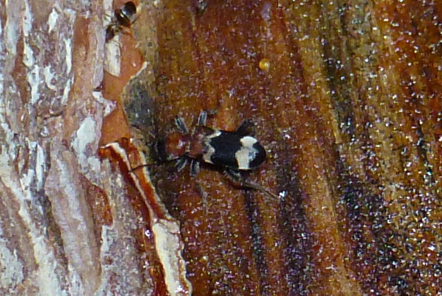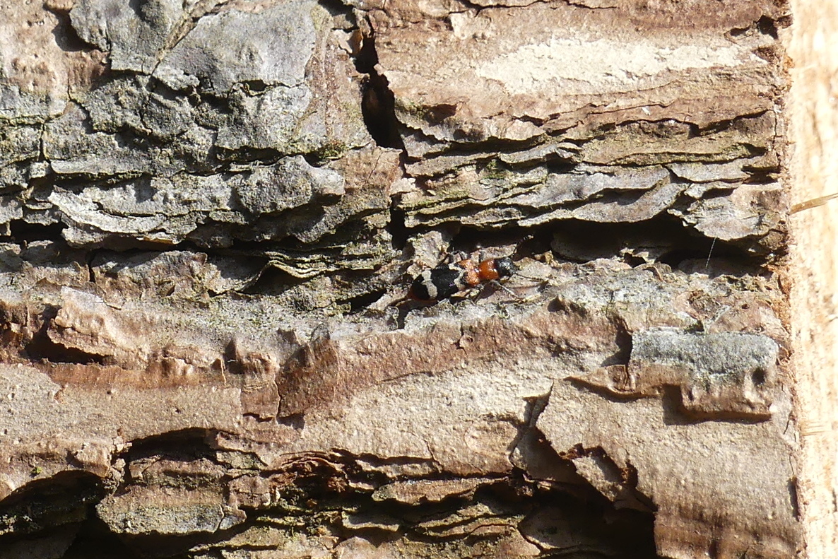 Gemeiner Ameisenbuntkäfer auf Kiefernrinde bei Brischko, Juli 2015