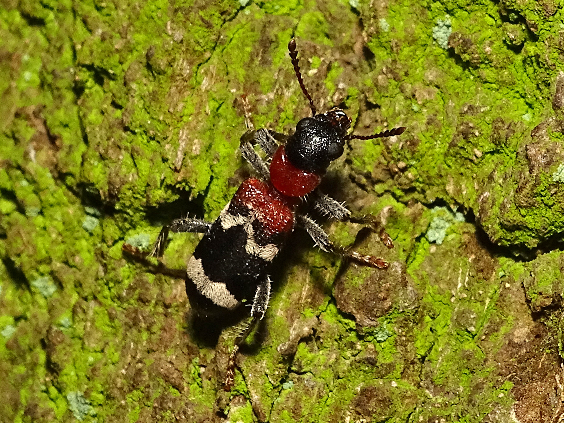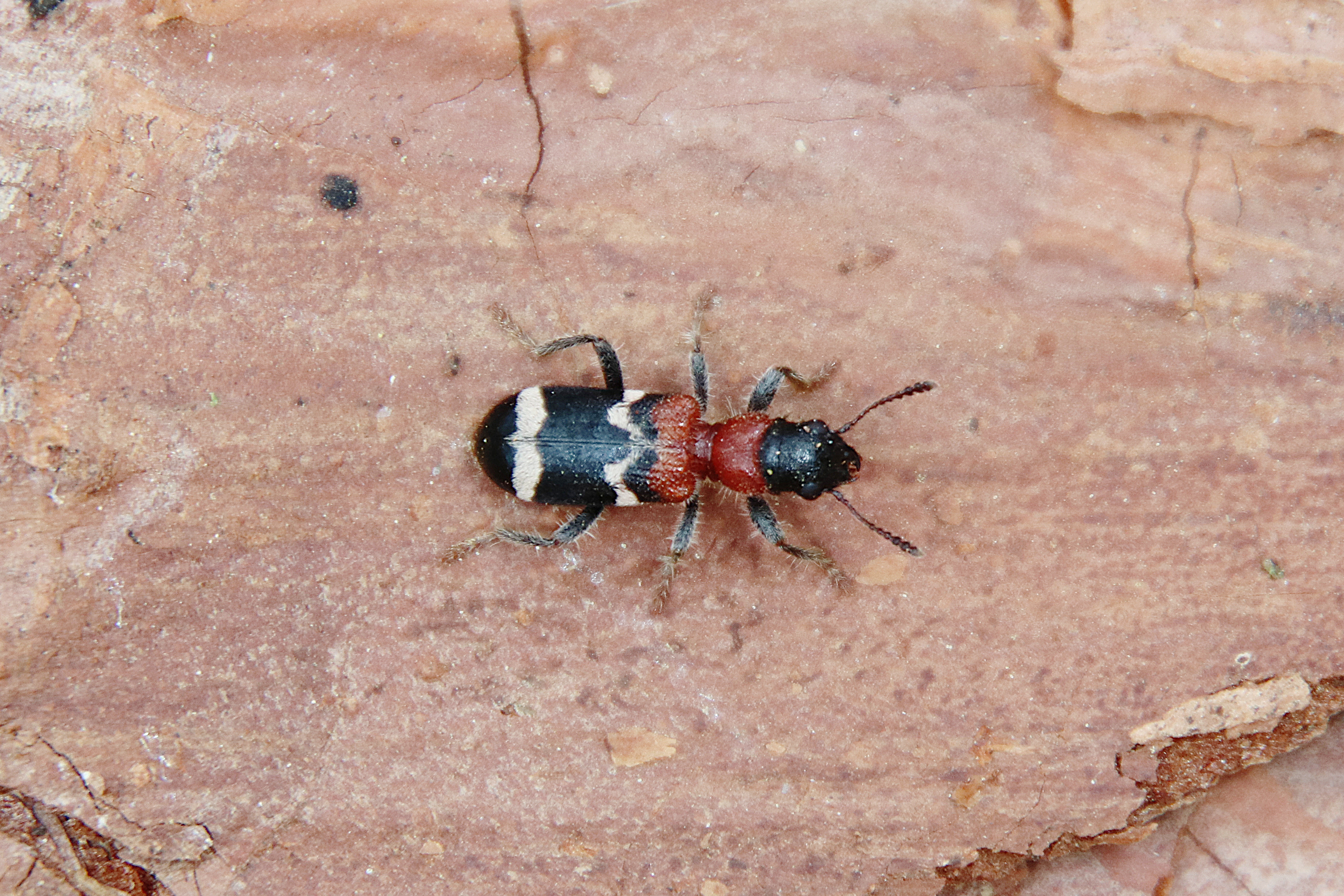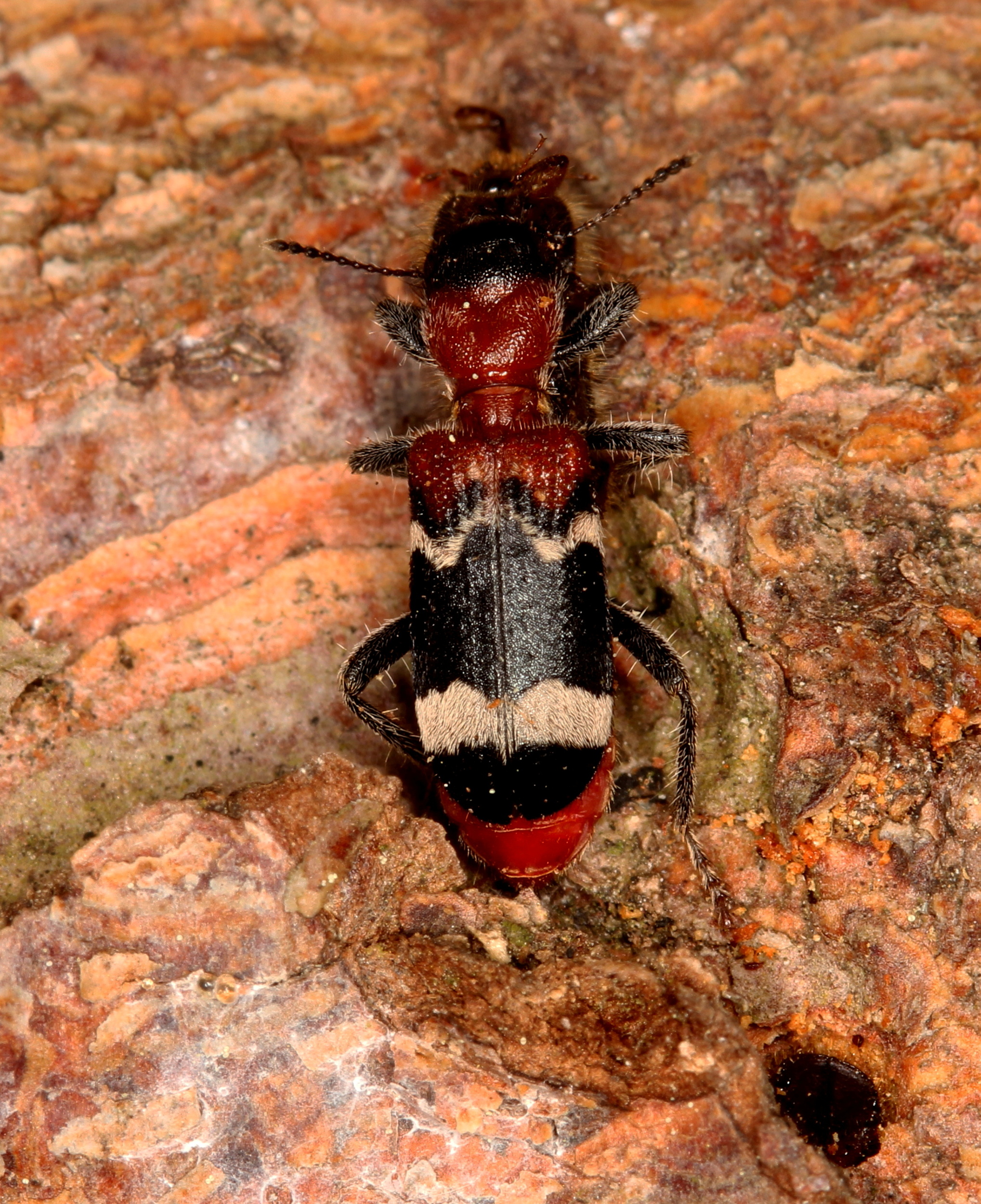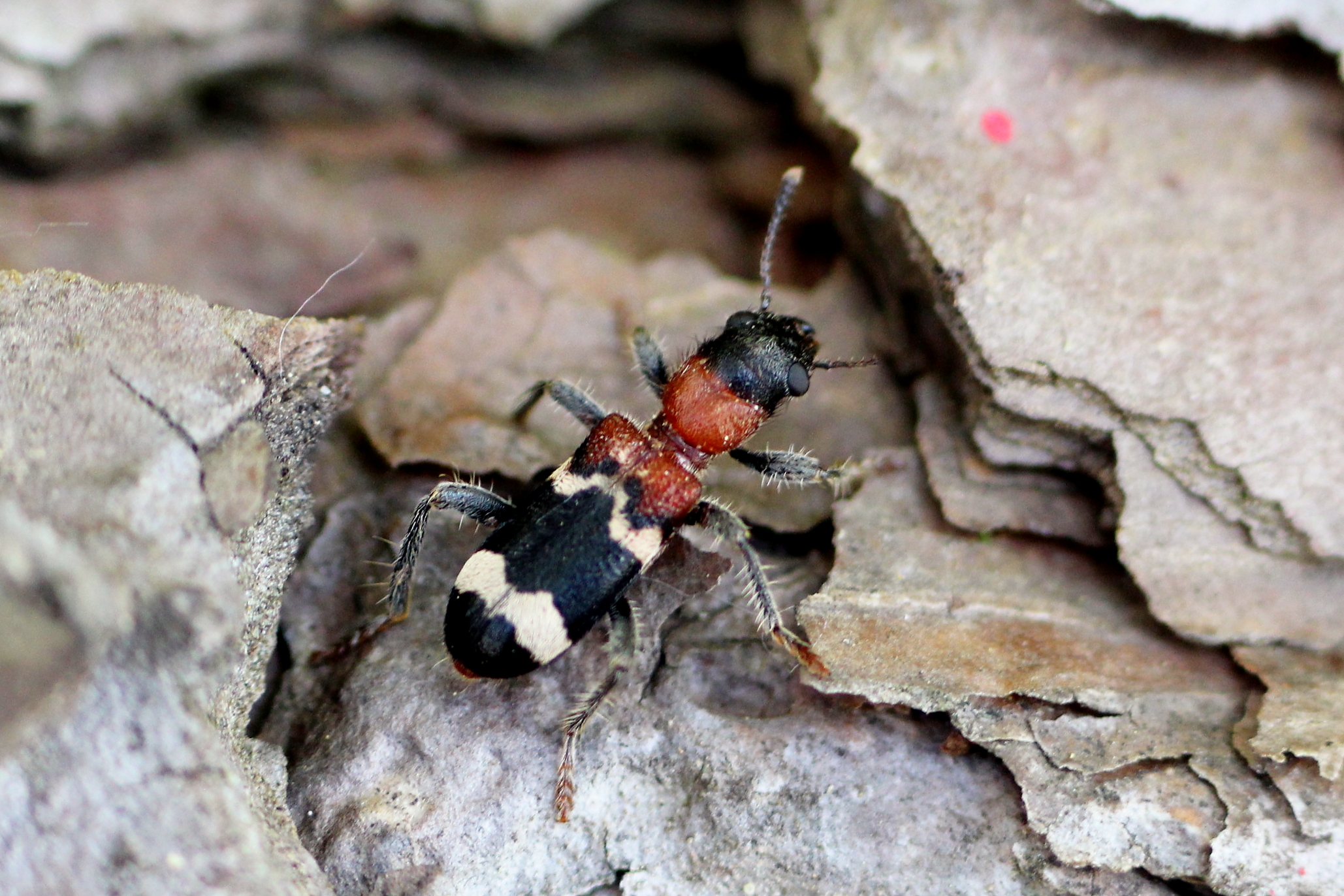 Gemeiner Ameisenbuntkäfer auf Kiefernrinde bei Brischko, Juli 2015