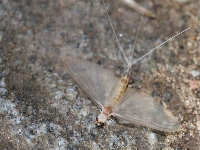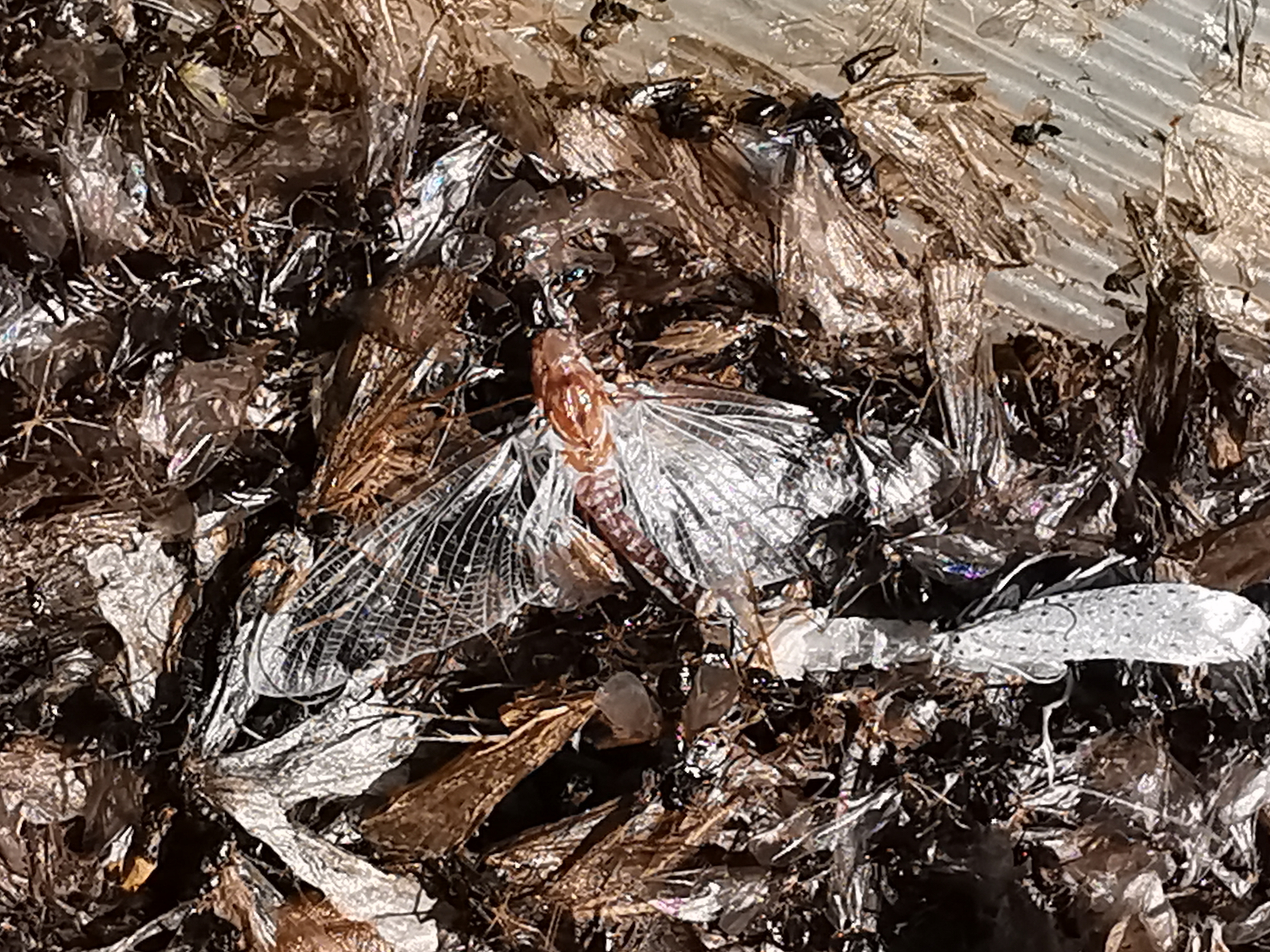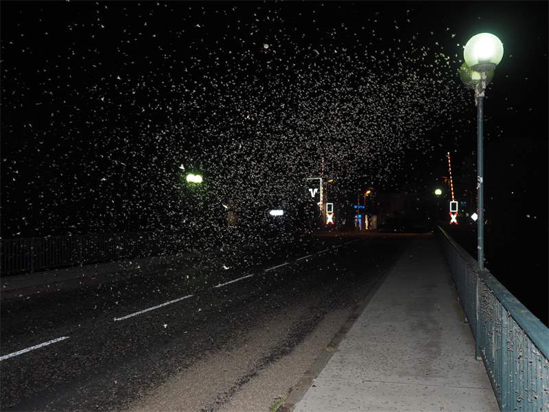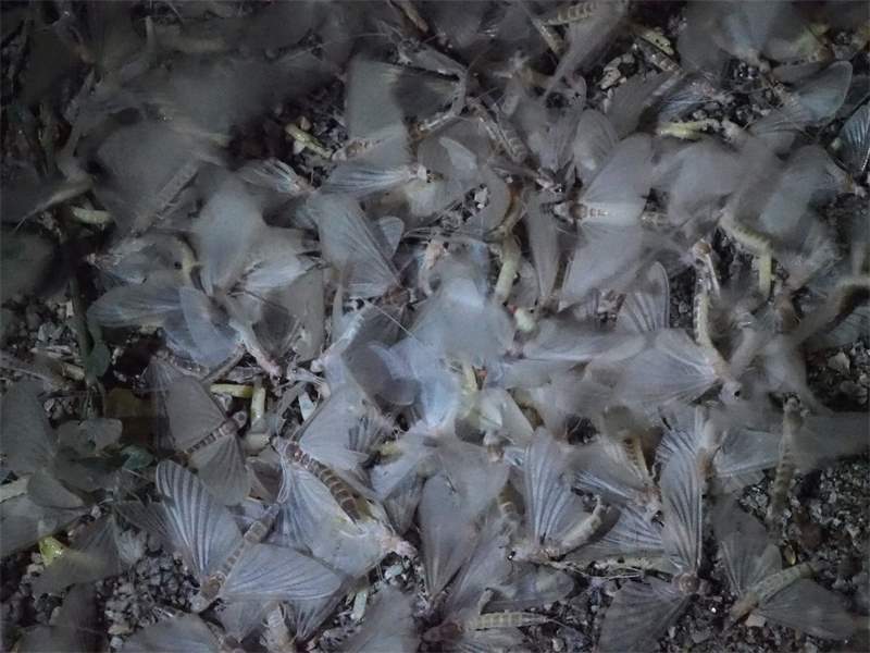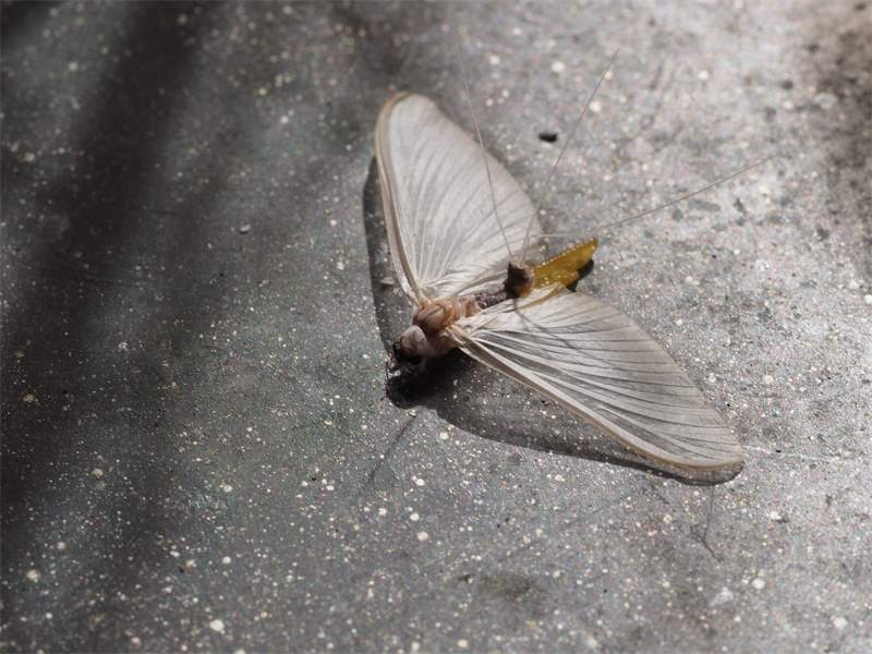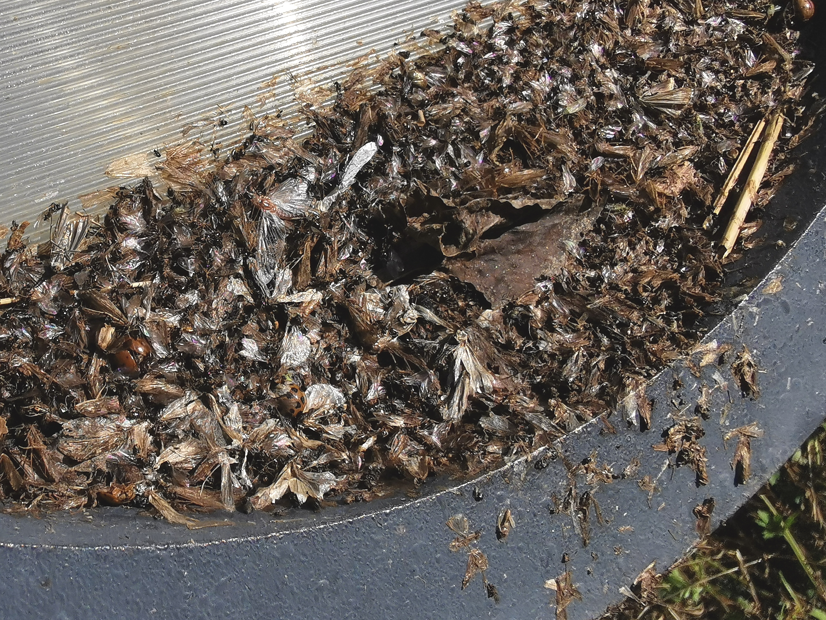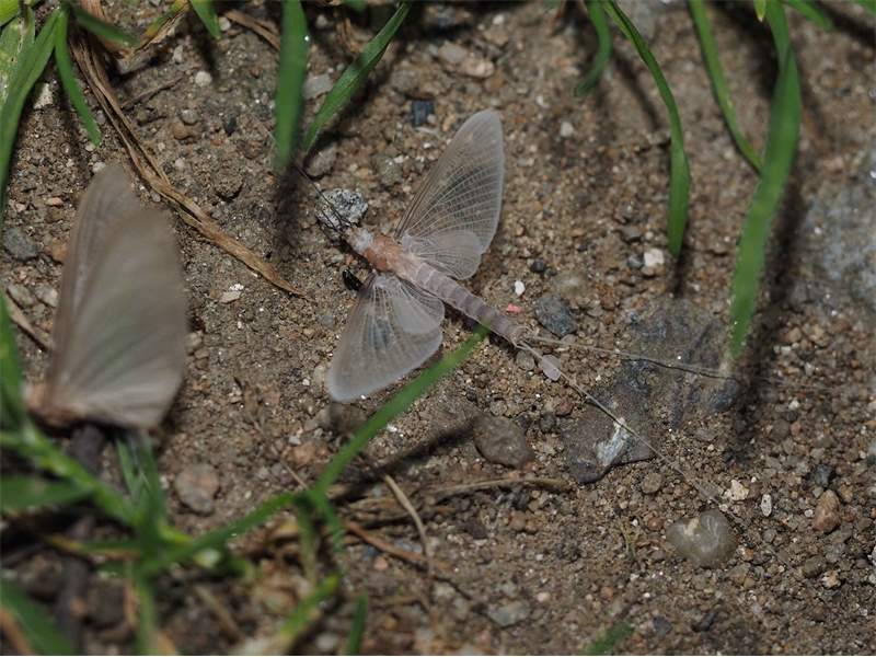 Am Morgen nach dem Massenflug. Die Weibchen sind verendet. Nach der Paarung ist ihr Hinterleib aufgeplatzt, um die vielen Eier freizugeben, doch gelangen sie bei den vielen Tieren, die vom Kunstlicht an Land gelockt wurden, nicht ins Wasser, wo sich die Larven entwickeln. Schwandorf, Juli 2019