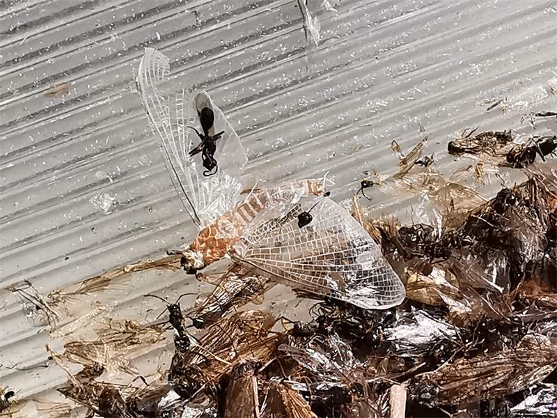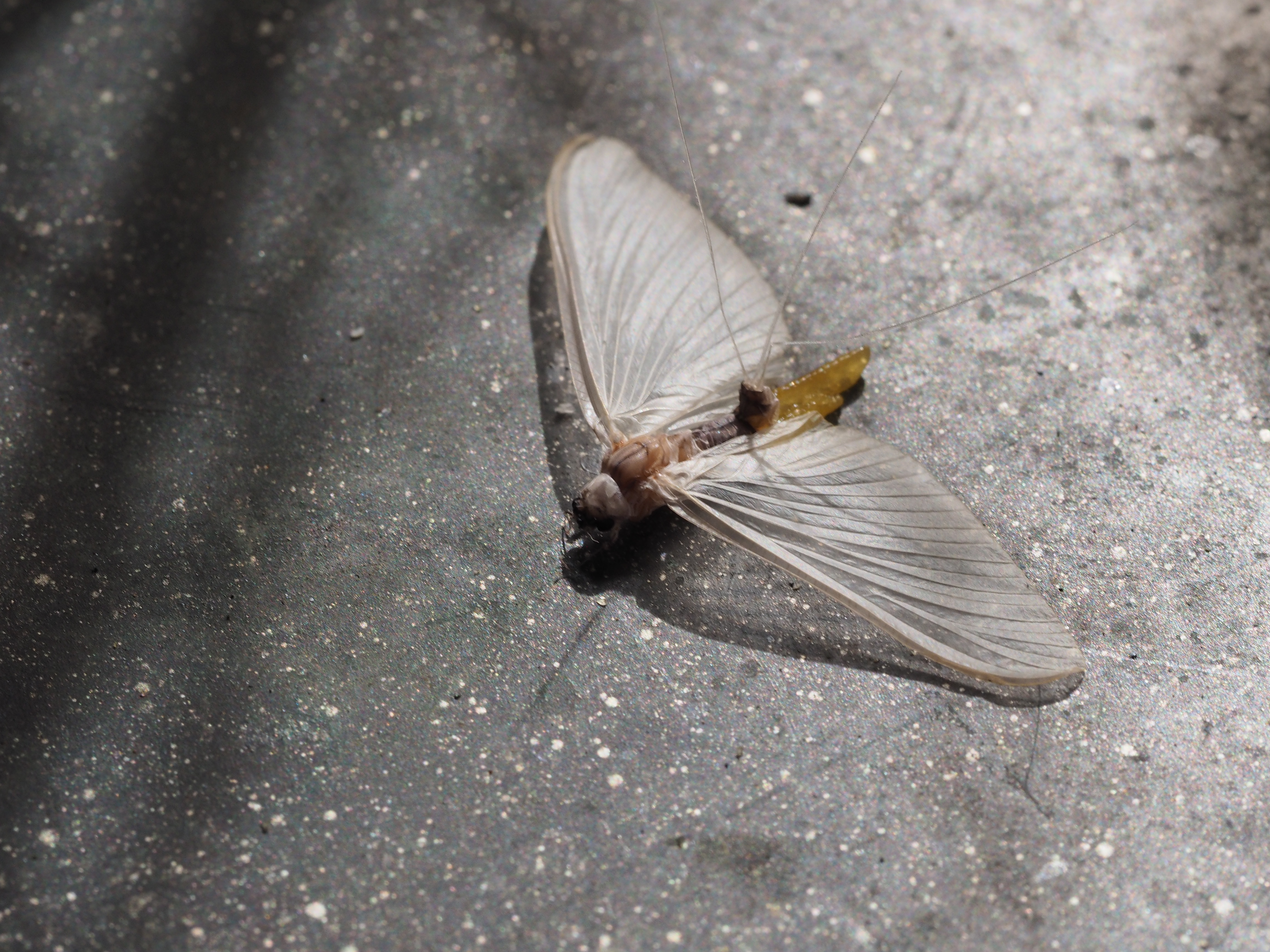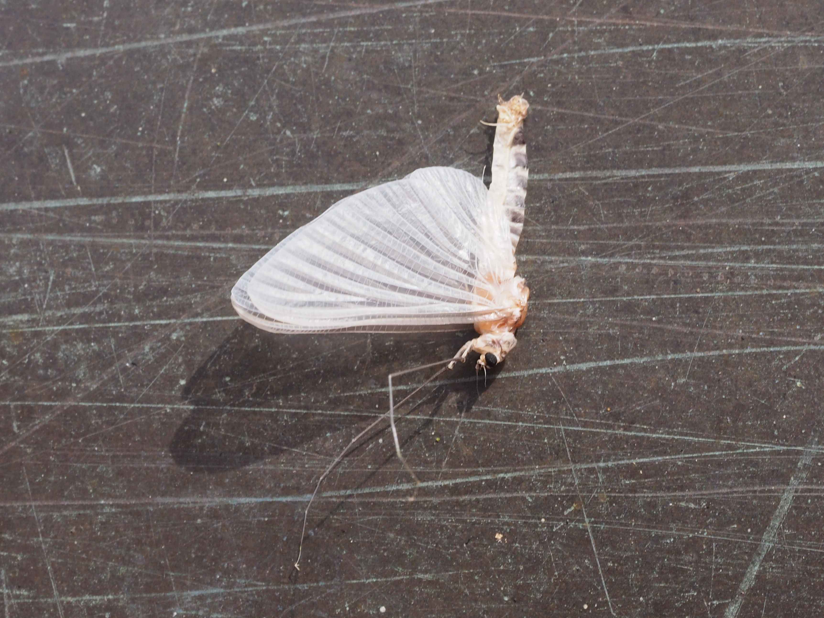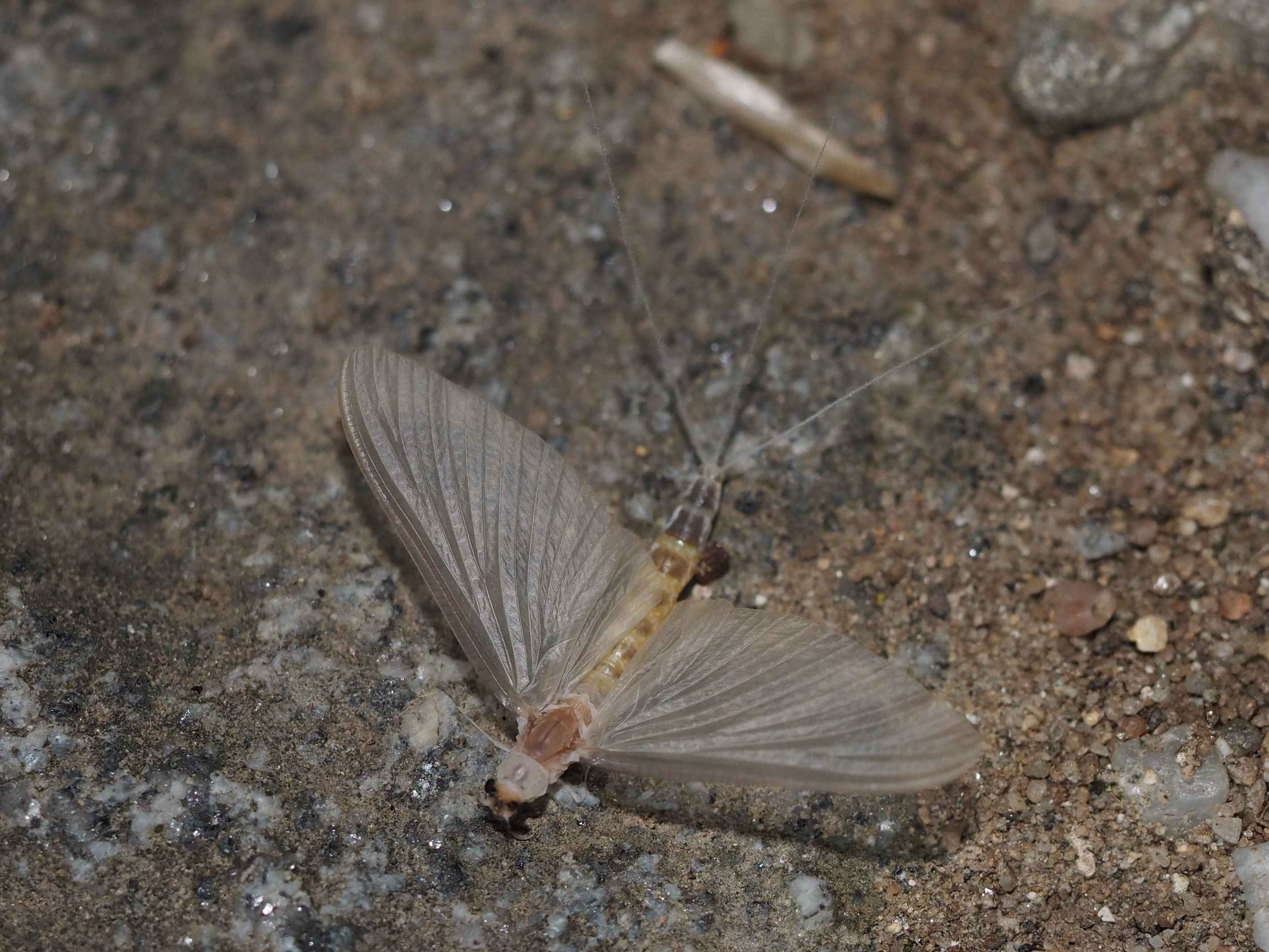 Am Morgen nach dem Massenflug. Die Weibchen sind verendet. Nach der Paarung ist ihr Hinterleib aufgeplatzt, um die vielen Eier freizugeben, doch gelangen sie bei den vielen Tieren, die vom Kunstlicht an Land gelockt wurden, nicht ins Wasser, wo sich die Larven entwickeln. Schwandorf, Juli 2019